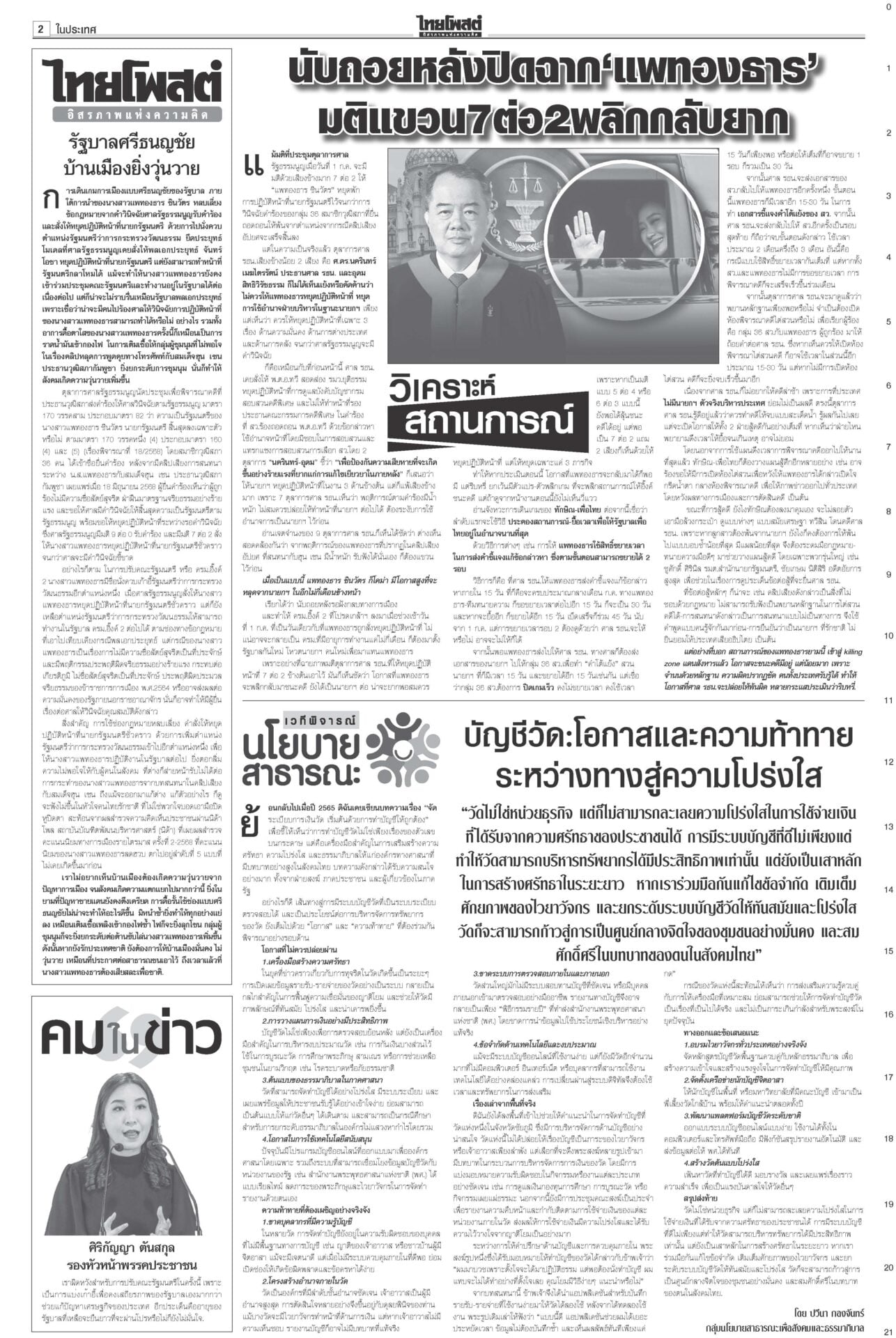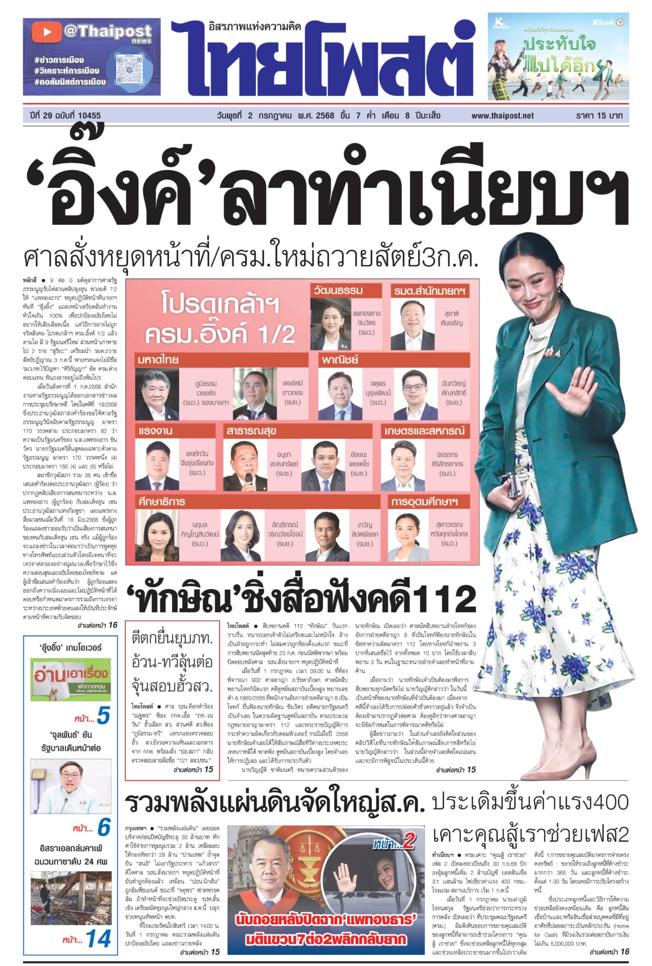 หนังสือพิมพ์ ฉบับวันที่ 2 กรกฎาคม 2568ข่าวหน้าหนึ่ง‘อิ๊งค์’ลาทำเนียบฯ ศาลสั่งหยุดหน้าที่/ครม.ใหม่ถวายสัตย์3ก.ค.9 ต่อ 0 มติตุลาการศาลรัฐธรรมนูญรับไต่สวนคลิปลุงฮุน พ่วงมติ 7:2 ให้ “แพทองธาร” หยุดปฏิบัติหน้าที่นายกฯ ทันที ‘ทักษิณ’ชิ่งสื่อฟังคดี112สืบพยานคดี 112 “ทักษิณ” วันแรกราบรื่น ทนายบอกเจ้าตัวไม่เครียดและไม่หนักใจ รวมพลังแผ่นดินจัดใหญ่ส.ค.“รวมพลังแผ่นดิน” เผยยอดบริจาคก่อนปิดบัญชีทะลุ 30 ล้านบาท หักค่าใช้จ่ายการชุมนุมรวม 2 ล้าน ประเดิมขึ้นค่าแรง400 เคาะคุณสู้เราช่วยเฟส2ครม.เคาะ “คุณสู้ เราช่วย” เฟส 2 เปิดลงทะเบียนถึง 30 ก.ย.68 ปักธงอุ้มลูกหนี้เพิ่ม 2 ล้านบัญชี ตีตกยื่นยุบภท. อ้วน-ทวีลุ้นต่อ จุ้นสอบฮั้วสว.ศาล รธน.ตีตกคำร้อง “ณฐพร” ฟ้อง กกต.เอื้อ “ภท.-เนวิน” ฮั้วเลือก สว. ส่วนคดี สว.ฟ้อง “ภูมิธรรม-ทวี”