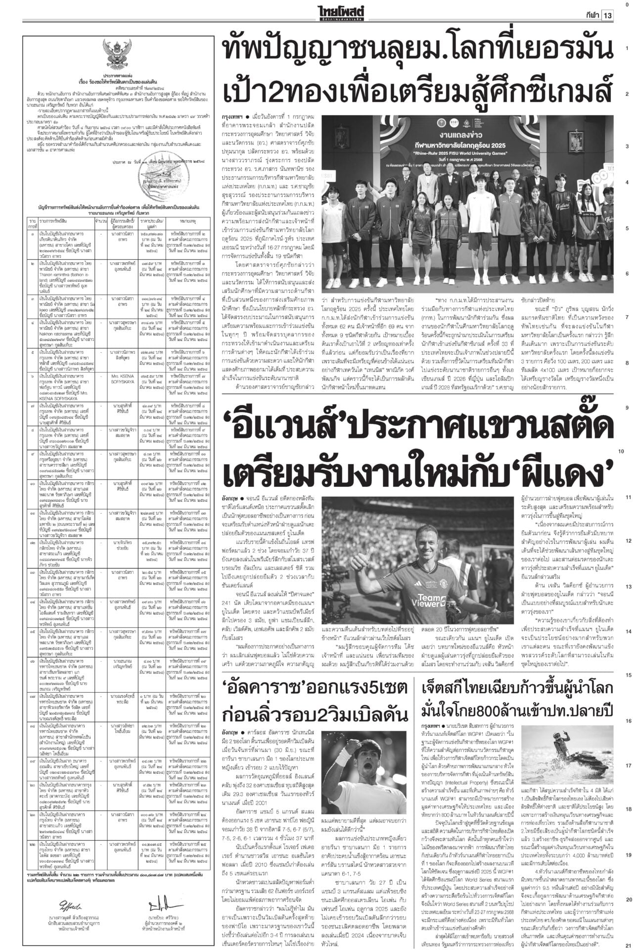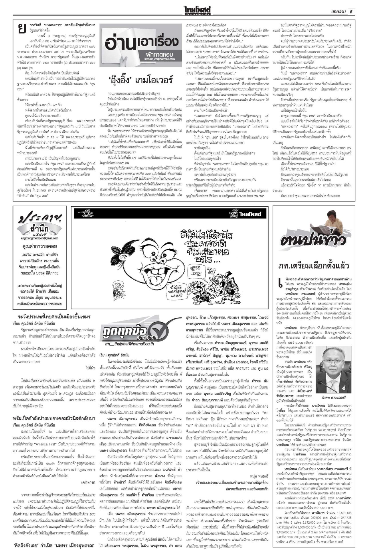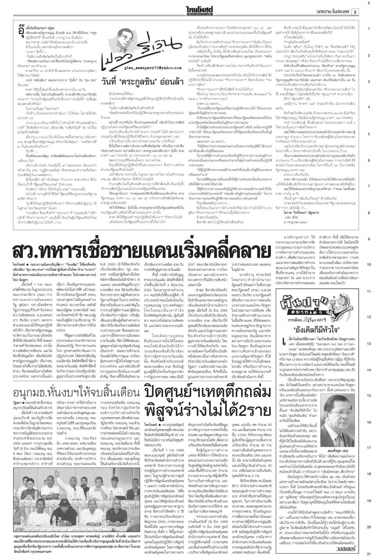 ฉบับวันที่ 2 กรกฎาคม 2568 2 กรกฎาคม 2568 เวลา 0:01 น. หนังสือพิมพ์ ฉบับวันที่ 2 กรกฎาคม 2568ข่าวหน้าหนึ่ง‘อิ๊งค์’ลาทำเนียบฯ ศาลสั่งหยุดหน้าที่/ครม.ใหม่ถวายสัตย์3ก.ค.9 ต่อ 0 มติตุลาการศาลรัฐธรรมนูญรับไต่สวนคลิปลุงฮุน พ่วงมติ 7:2 ให้ “แพทองธาร” หยุดปฏิบัติหน้าที่นายกฯ ทันที ‘ทักษิณ’ชิ่งสื่อฟังคดี112สืบพยานคดี 112 “ทักษิณ” วันแรกราบรื่น ทนายบอกเจ้าตัวไม่เครียดและไม่หนักใจ รวมพลังแผ่นดินจัดใหญ่ส.ค.“รวมพลังแผ่นดิน” เผยยอดบริจาคก่อนปิดบัญชีทะลุ 30 ล้านบาท หักค่าใช้จ่ายการชุมนุมรวม 2 ล้าน ประเดิมขึ้นค่าแรง400 เคาะคุณสู้เราช่วยเฟส2ครม.เคาะ “คุณสู้ เราช่วย” เฟส 2 เปิดลงทะเบียนถึง 30 ก.ย.68 ปักธงอุ้มลูกหนี้เพิ่ม 2 ล้านบัญชี ตีตกยื่นยุบภท. อ้วน-ทวีลุ้นต่อ จุ้นสอบฮั้วสว.ศาล รธน.ตีตกคำร้อง “ณฐพร” ฟ้อง กกต.เอื้อ “ภท.-เนวิน” ฮั้วเลือก สว. ส่วนคดี สว.ฟ้อง “ภูมิธรรม-ทวี” Tagsรายวันหนังสือพิมพ์ ข่าวที่เกี่ยวข้อง ฉบับวันที่ 6 ธันวาคม 2568 ฉบับวันที่ 5 ธันวาคม 2568 ฉบับวันที่ 4 ธันวาคม 2568 ฉบับวันที่ 3 ธันวาคม 2568 ฉบับวันที่ 2 ธันวาคม 2568 ฉบับวันที่ 1 ธันวาคม 2568 NEWS UPDATE 0:42 น. 'DUMB.RONG' ค่าย 'tiny' ส่งซิงเกิล 'SUNRISE' พร้อม MV สุดปั่น 0:37 น. 'เบนท์ กิตติธัช' จาก 'Kicks Records' ปล่อย 'กาฬสินธุ์ บลูส์' แนวดนตรีใหม่ที่โตขึ้น 18:43 น. ในหลวง พระราชินี ทรงบำเพ็ญพระราชกุศลทักษิณานุปทาน เนื่องในวันคล้ายวันพระบรมราชสมภพ รัชกาลที่ 9 18:12 น. เริ่มแล้ว Cat Expo Thailand 2025 วันแรก 'ทาสแมว' แห่ร่วมงานคึกคักคาดเม็ดเงินสะพัด 120 ล้านบาท 18:06 น. กรมอุตุฯ เผยพายุลูกใหม่กำลังก่อตัวบริเวณทะเลจีนใต้ตอนกลาง