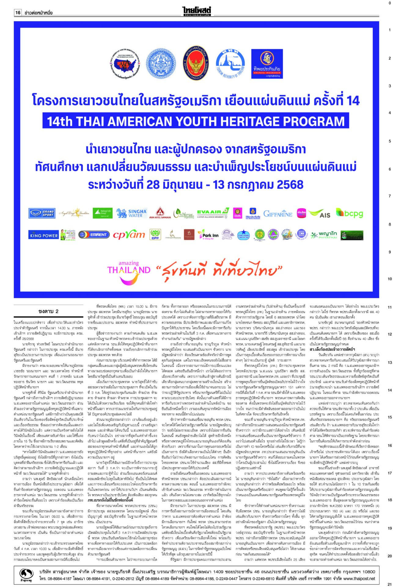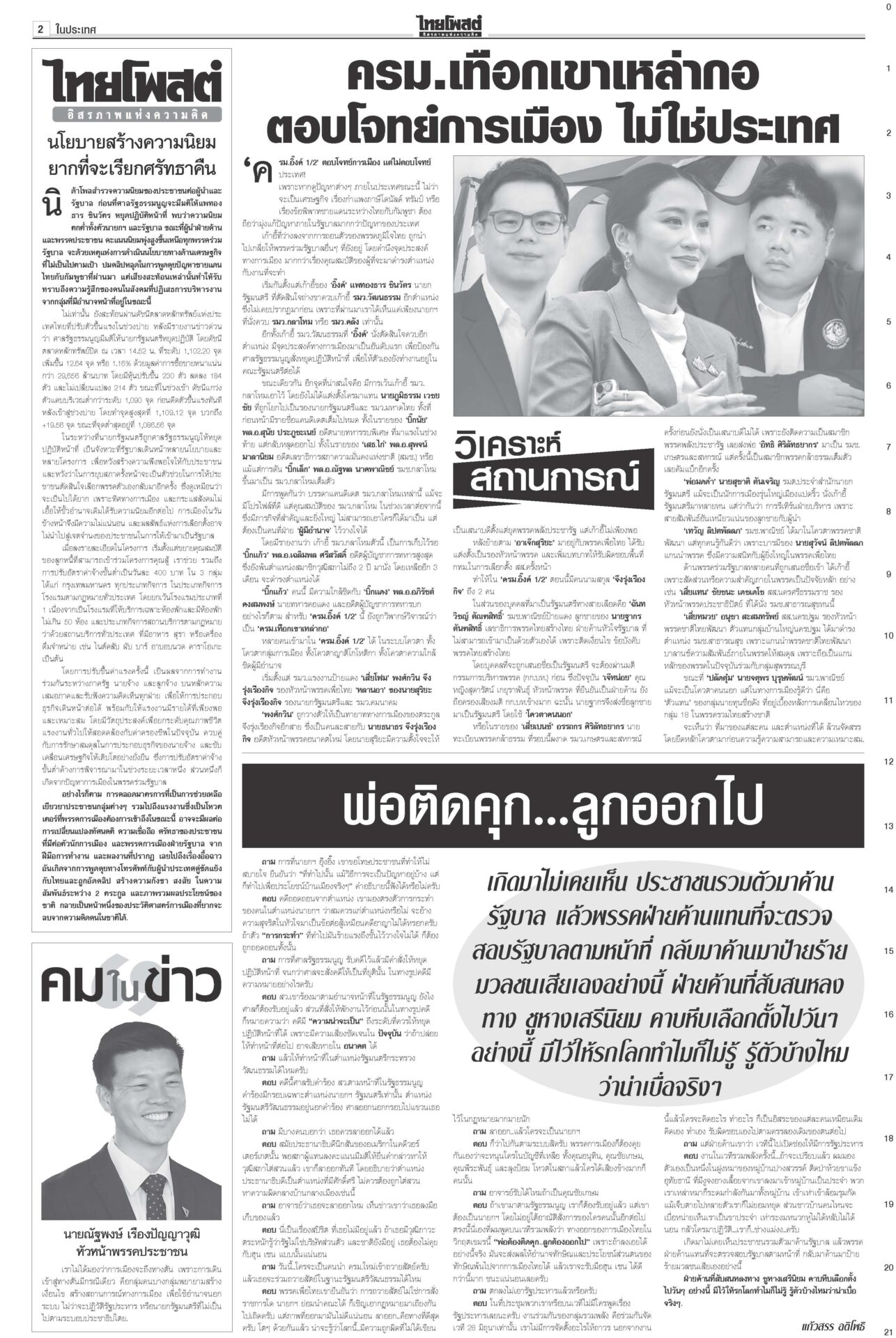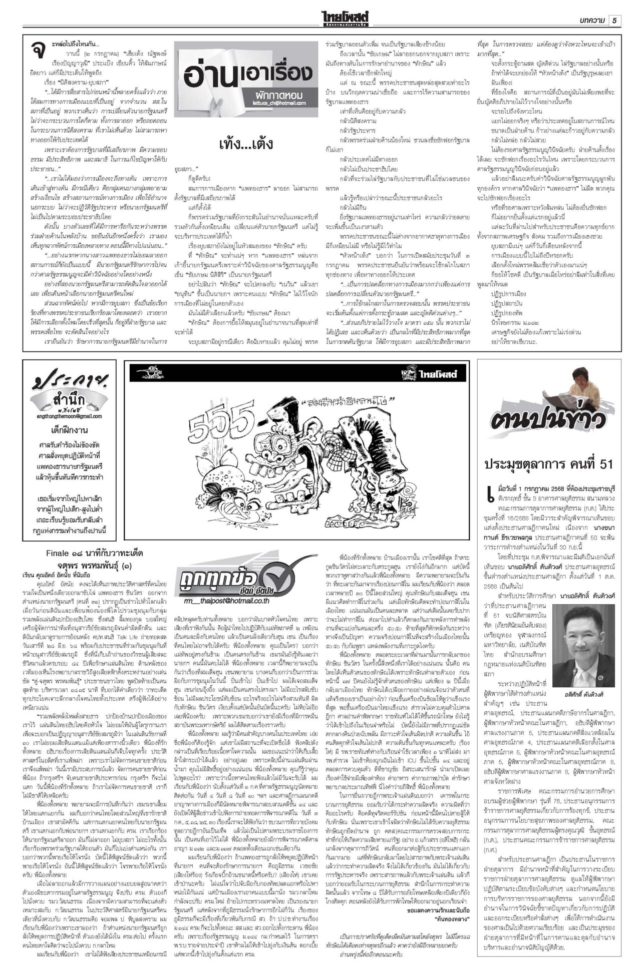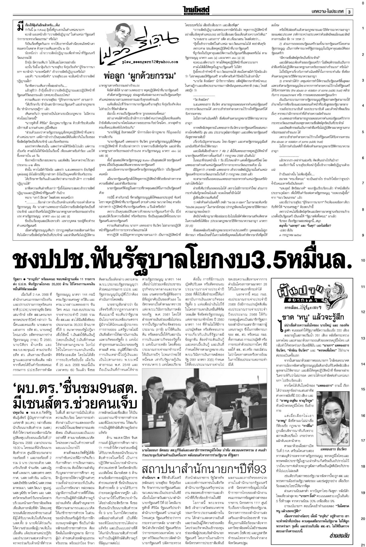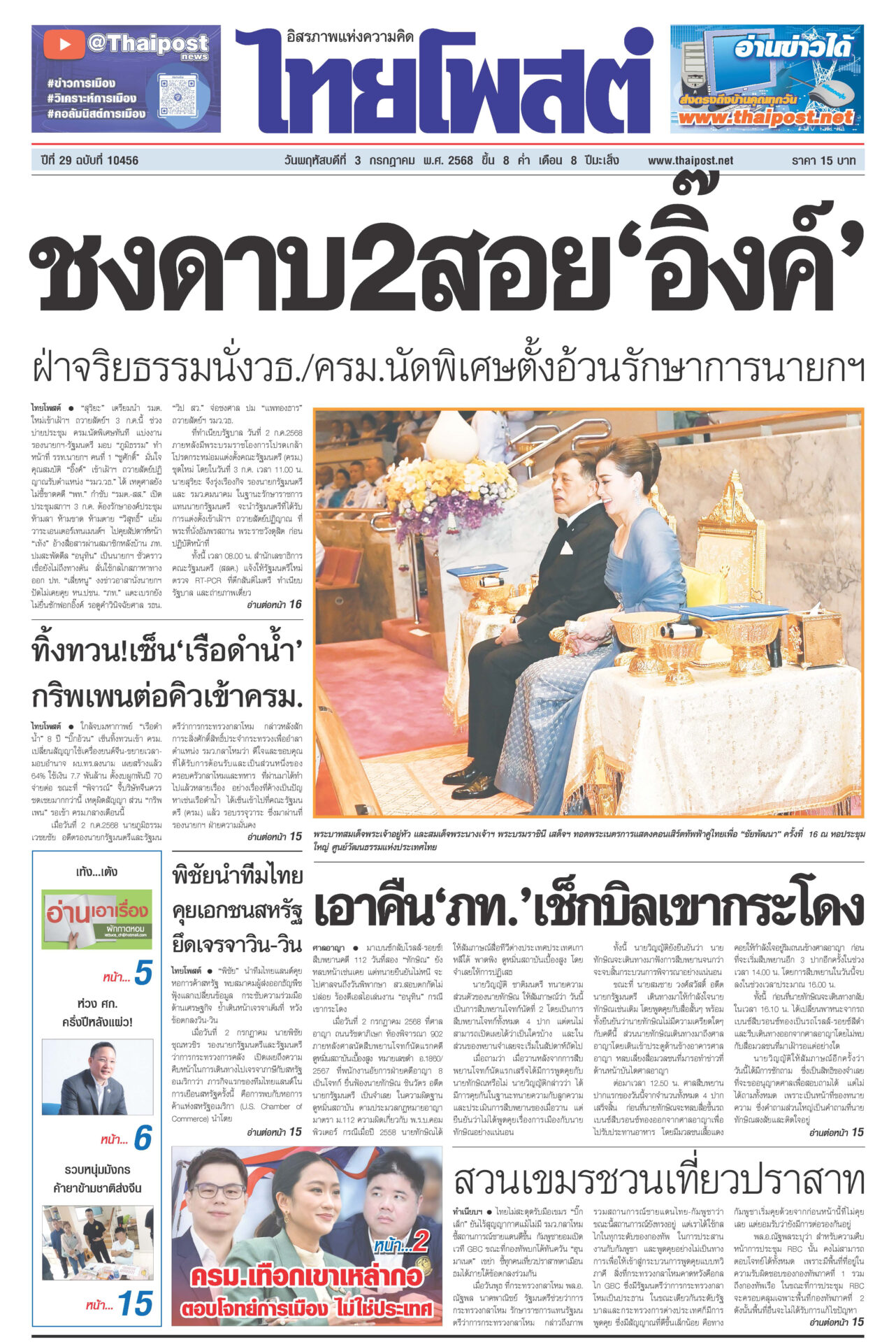 หนังสือพิมพ์ ฉบับวันที่ 3 กรกฎาคม 2568ข่าวหน้าหนึ่งชงดาบ2สอย‘อิ๊งค์’ ฝ่าจริยธรรมนั่งวธ./ครม.นัดพิเศษตั้งอ้วนรักษาการนายกฯ“สุริยะ” เตรียมนำ รมต.ใหม่เข้าเฝ้าฯ ถวายสัตย์ฯ 3 ก.ค.นี้ ช่วงบ่ายประชุม ครม.นัดพิเศษทันที แบ่งงานรองนายกฯ-รัฐมนตรี เอาคืน‘ภท.’เช็กบิลเขากระโดงมาเบนซ์กลับโรลส์-รอยซ์! สืบพยานคดี 112 วันที่สอง “ทักษิณ” ยังหลบหน้าเช่นเคย แต่ทนายยืนยันไม่หนี ทิ้งทวน!เซ็น‘เรือดำนํ้า’ กริพเพนต่อคิวเข้าครม.ใกล้จบมหากาพย์ “เรือดำน้ำ” 8 ปี “บิ๊กอ้วน” เซ็นทิ้งทวนเข้า ครม. เปลี่ยนสัญญาใช้เครื่องยนต์จีน-ขยายเวลา-มอบอำนาจ สวนเขมรชวนเที่ยวปราสาทไทยไม่สะดุดรับมือเขมร “บิ๊กเล็ก” ยันไร้สุญญากาศแม้ไม่มี รมว.กลาโหม พิชัยนำทีมไทย คุยเอกชนสหรัฐ ยึดเจรจาวิน-วิน“พิชัย” นำทีมไทยแลนด์คุยหอการค้าสหรัฐ พบสมาคมผู้ส่งออกธัญพืช ฟุ้งแลกเปลี่ยนข้อมูล กระชับความร่วมมือด้านเศรษฐกิจ ย้ำเดินหน้าเจรจาเต็มที่ หวังข้อตกลงวิน-วิน
