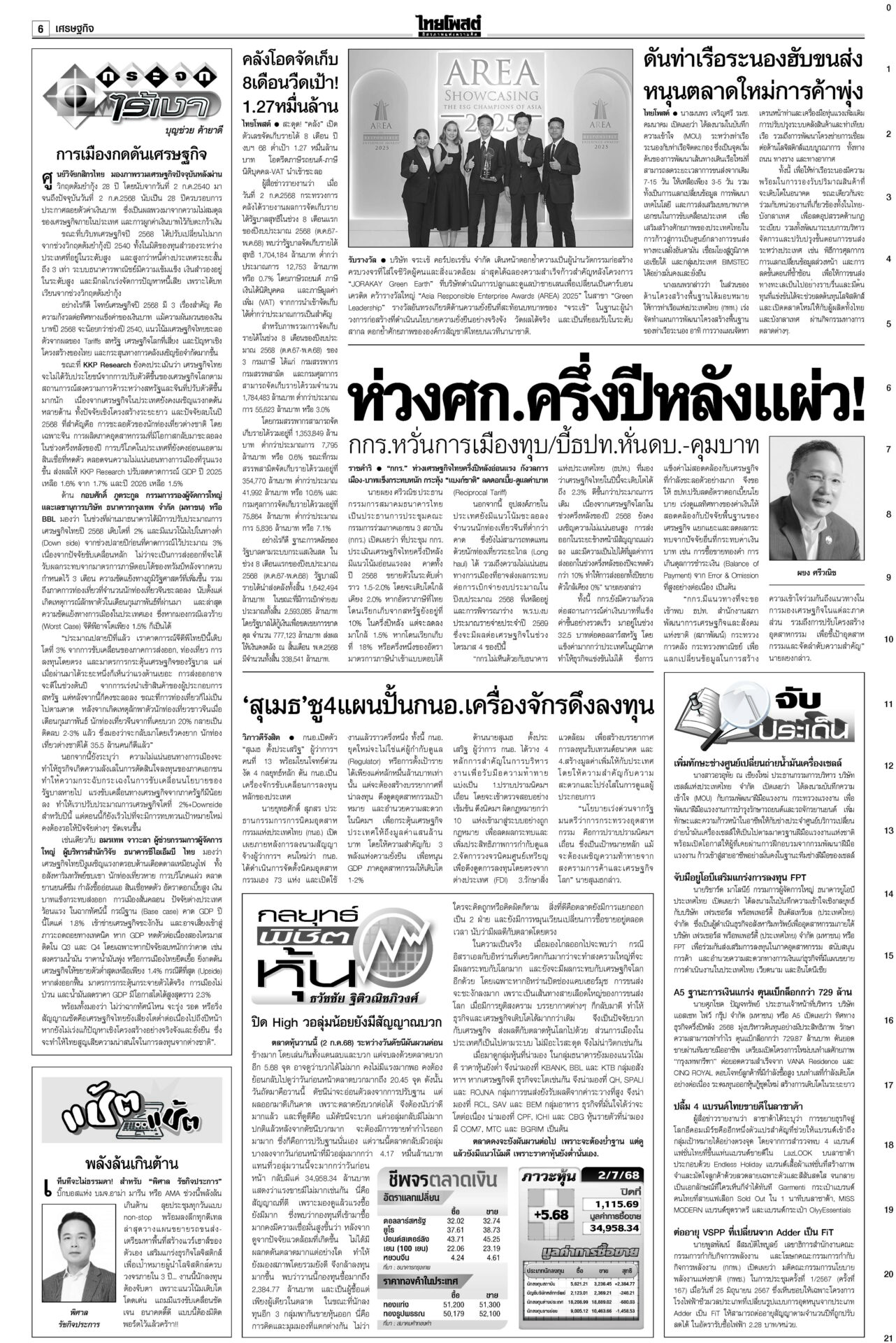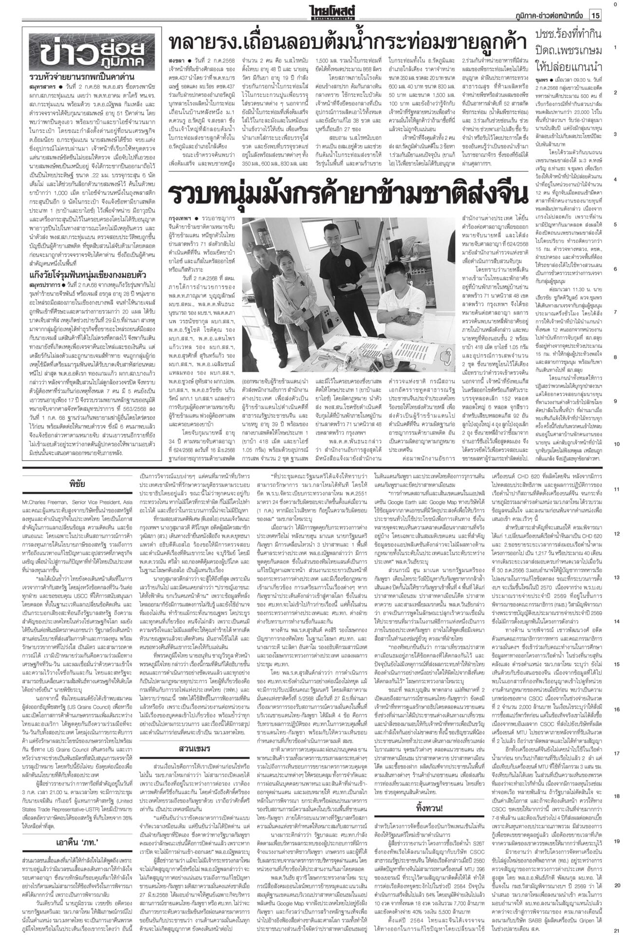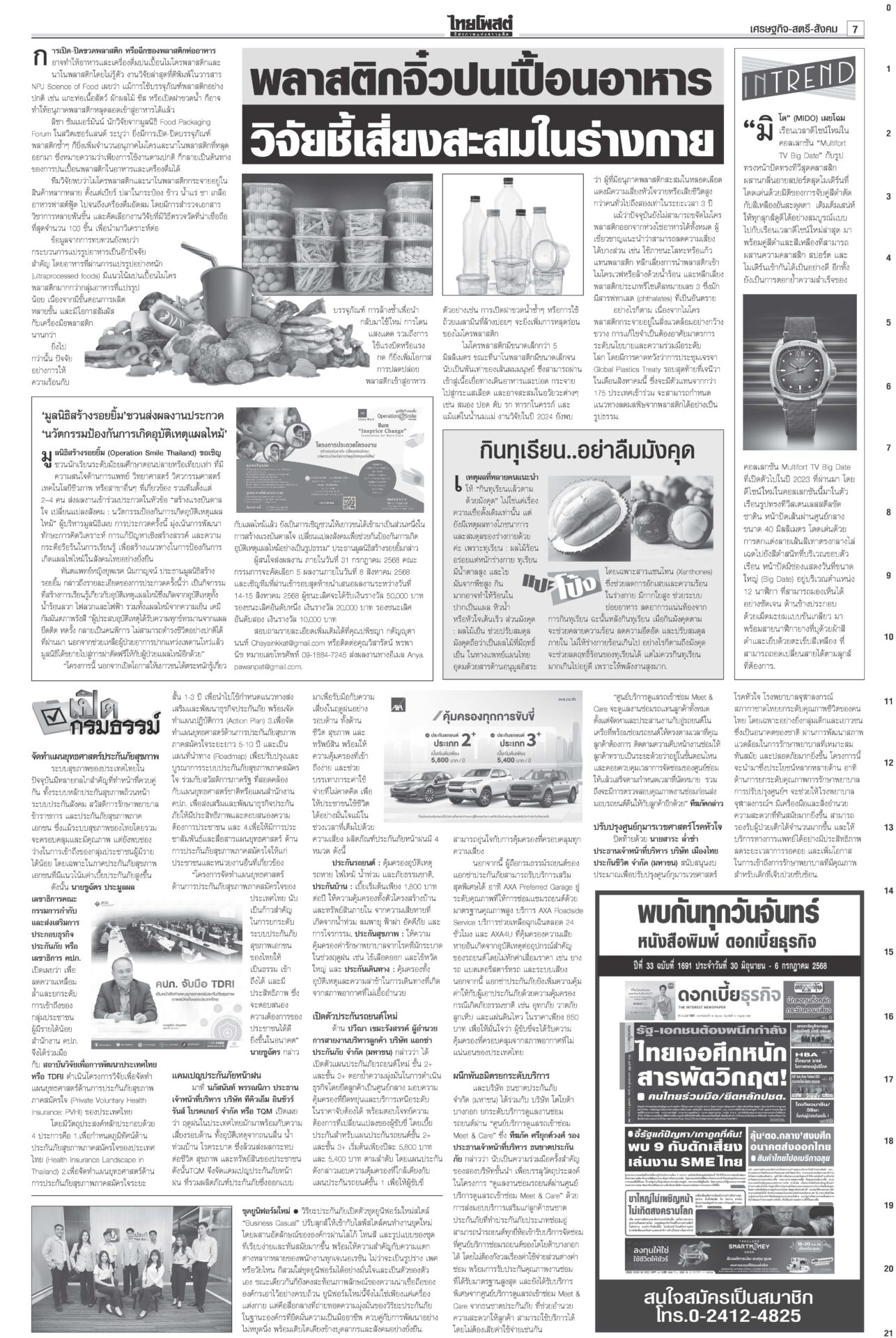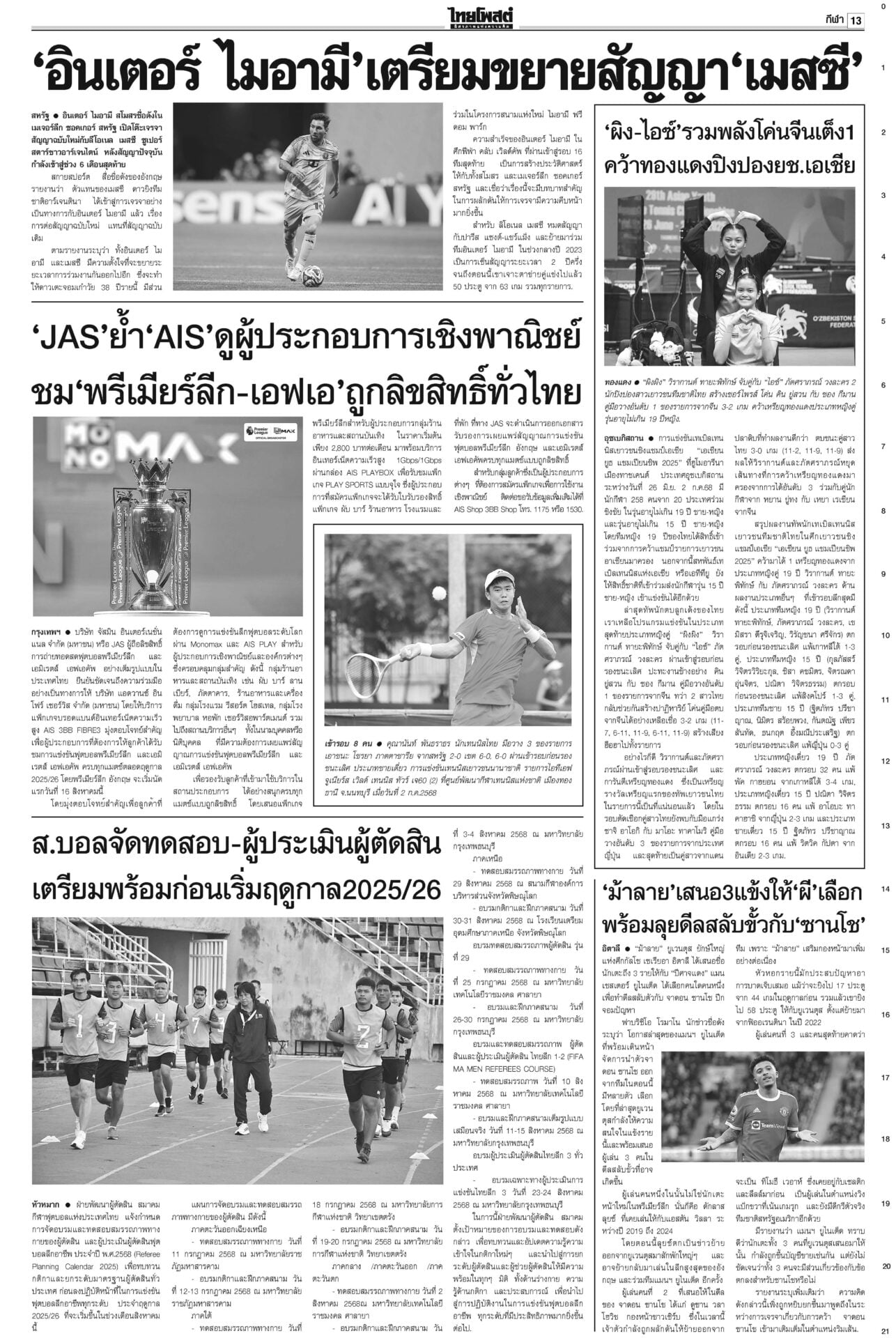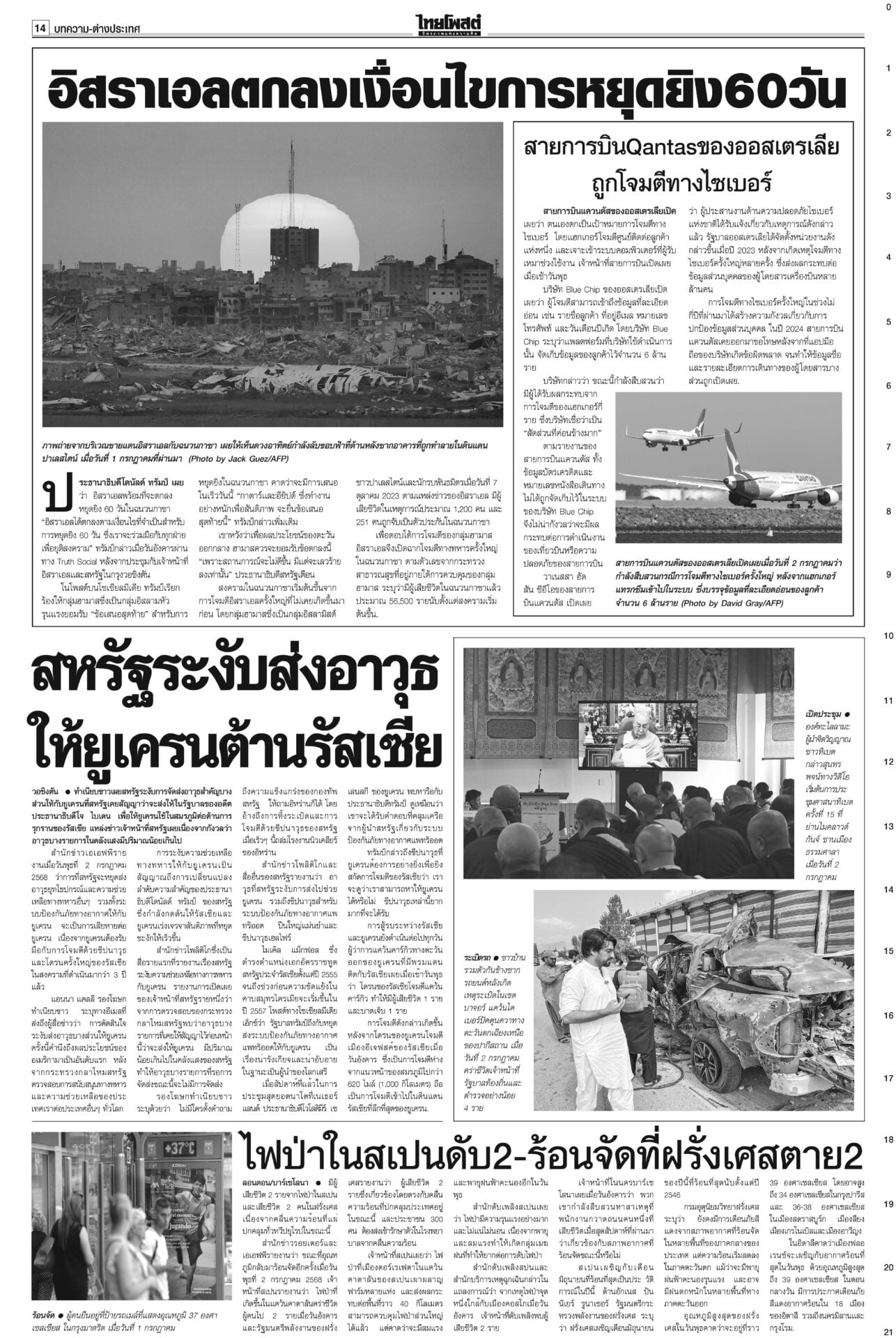หนังสือพิมพ์ ฉบับวันที่ 3 กรกฎาคม 2568ข่าวหน้าหนึ่งชงดาบ2สอย‘อิ๊งค์’ ฝ่าจริยธรรมนั่งวธ./ครม.นัดพิเศษตั้งอ้วนรักษาการนายกฯ“สุริยะ” เตรียมนำ รมต.ใหม่เข้าเฝ้าฯ ถวายสัตย์ฯ 3 ก.ค.นี้ ช่วงบ่ายประชุม ครม.นัดพิเศษทันที แบ่งงานรองนายกฯ-รัฐมนตรี เอาคืน‘ภท.’เช็กบิลเขากระโดงมาเบนซ์กลับโรลส์-รอยซ์! สืบพยานคดี 112 วันที่สอง “ทักษิณ” ยังหลบหน้าเช่นเคย แต่ทนายยืนยันไม่หนี ทิ้งทวน!เซ็น‘เรือดำนํ้า’ กริพเพนต่อคิวเข้าครม.ใกล้จบมหากาพย์ “เรือดำน้ำ” 8 ปี “บิ๊กอ้วน” เซ็นทิ้งทวนเข้า ครม. เปลี่ยนสัญญาใช้เครื่องยนต์จีน-ขยายเวลา-มอบอำนาจ สวนเขมรชวนเที่ยวปราสาทไทยไม่สะดุดรับมือเขมร “บิ๊กเล็ก” ยันไร้สุญญากาศแม้ไม่มี รมว.กลาโหม พิชัยนำทีมไทย คุยเอกชนสหรัฐ ยึดเจรจาวิน-วิน“พิชัย” นำทีมไทยแลนด์คุยหอการค้าสหรัฐ พบสมาคมผู้ส่งออกธัญพืช ฟุ้งแลกเปลี่ยนข้อมูล กระชับความร่วมมือด้านเศรษฐกิจ ย้ำเดินหน้าเจรจาเต็มที่ หวังข้อตกลงวิน-วิน