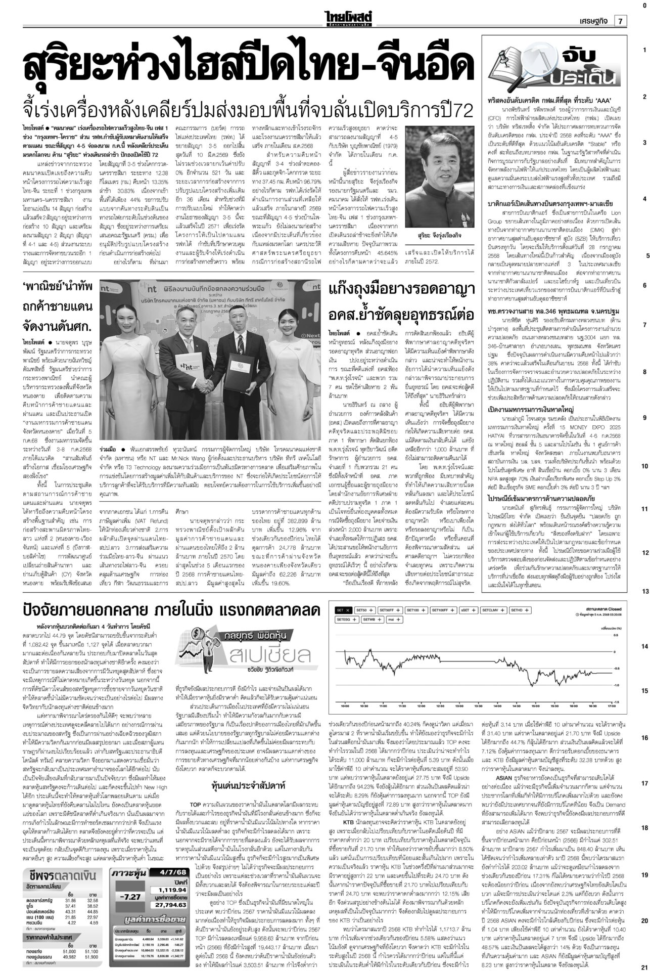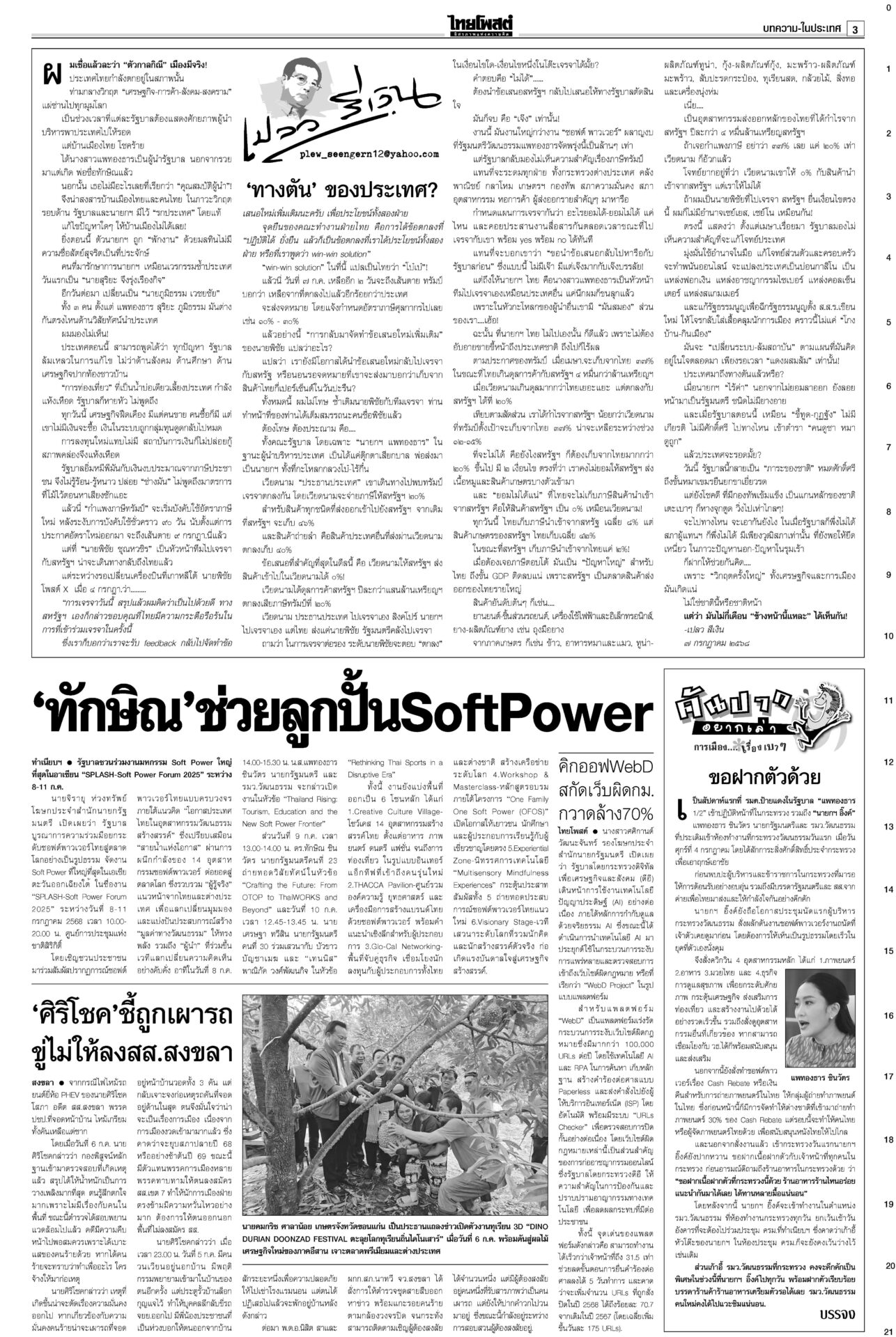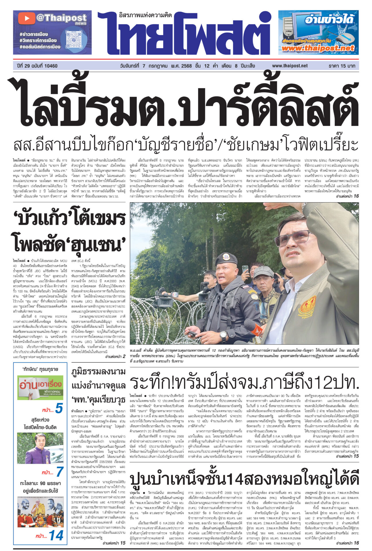 หนังสือพิมพ์ ฉบับวันที่ 7 กรกฎาคม 2568ข่าวหน้าหนึ่งไล่บี้รมต.ปาร์ตี้ลิสต์ สส.อีสานบีบไขก๊อก‘บัญชีรายชื่อ’/‘ชัยเกษม’โวฟิตเปรี๊ยะ“มือกฎหมาย รบ.” ลั่น การเมืองยังไม่ถึงทางตัน มั่นใจ “นายกฯ อิ๊งค์” แจงศาล รธน.ได้ ไม่เชื่อดีล “ปชน-ภท.” หนุน “อนุทิน” เป็นนายกฯ ‘บัวแก้ว’โต้เขมร โพลซัด‘ฮุนเซน’บัวแก้วโต้เขมรละเมิด MOU 43 ลั่นไทยยึดมั่นพันธกรณีอย่างเคร่งครัด ภูมิธรรมลงนาม แบ่งอำนาจดูแล ‘พท.’คุมเรียบวุธ“ภูมิธรรม” แบ่งงาน “รองนายกฯ-รมต.ประจำสำนักฯ” ค่ายเพื่อไทยยึดเรียบทั้งความมั่นคง-เศรษฐกิจ-สังคม ระทึก!ทรัมป์ส่งจม.ภาษีถึง12ปท.ระทึก! ประธานาธิบดีทรัมป์ลงนามในจดหมายถึง 12 ประเทศเรื่องภาษีแล้ว ปูนบำเหน็จชั้น14สองหมอใหญ่ได้ดีวิจารณ์สนั่น! สองหมอใหญ่คดีป่วยทิพย์ได้ดี ติดบัญชีเลื่อนตำแหน่งสูงขึ้น