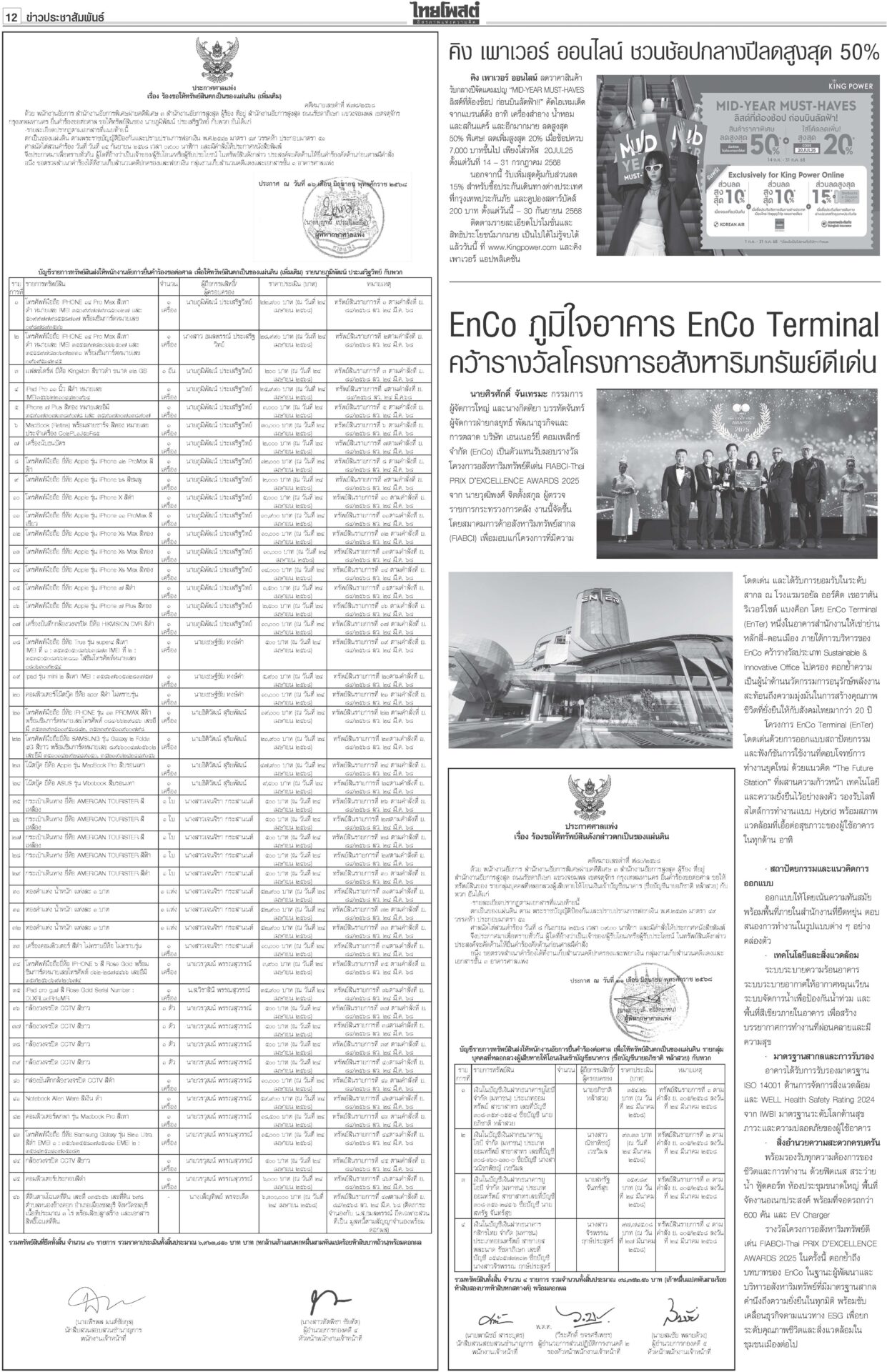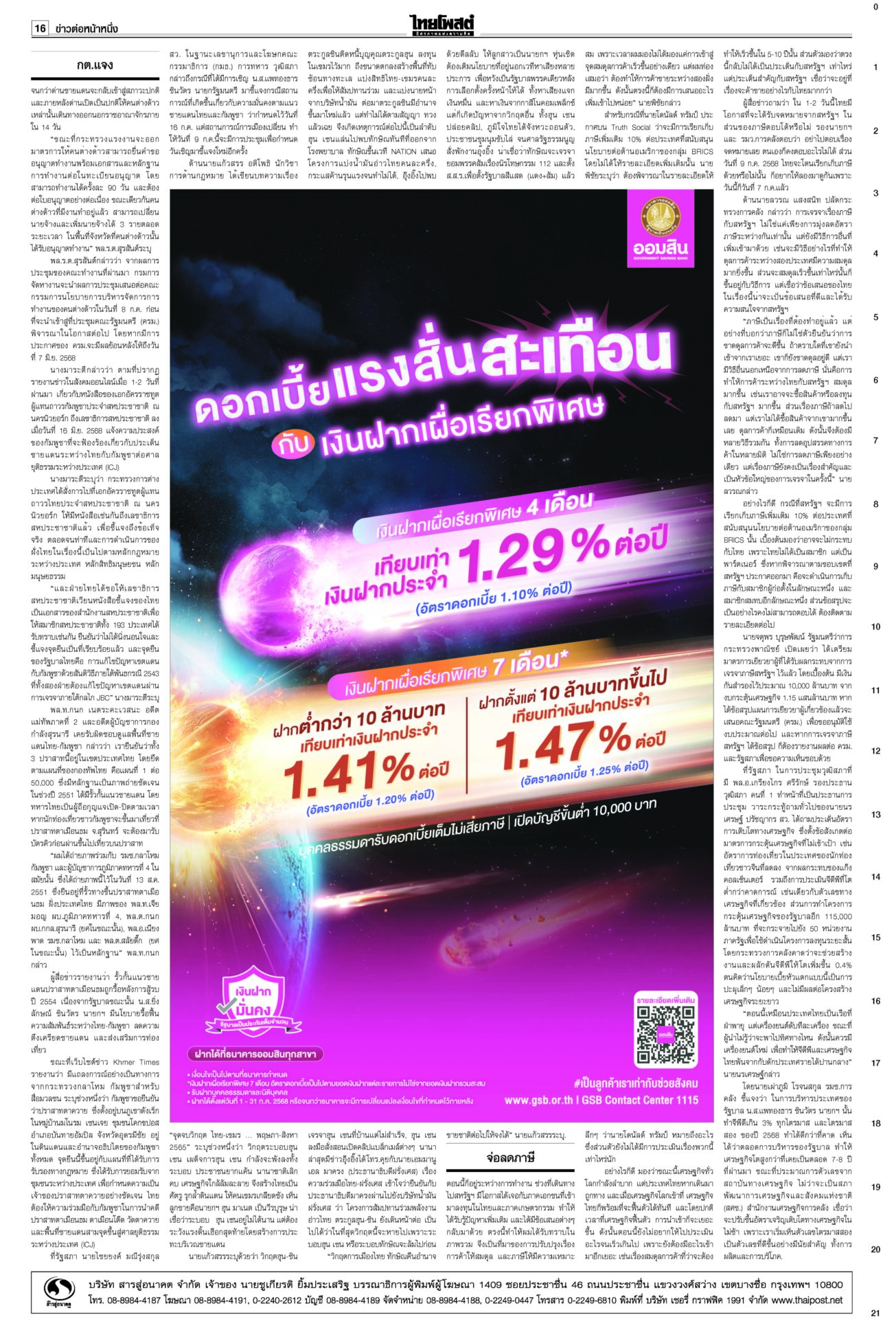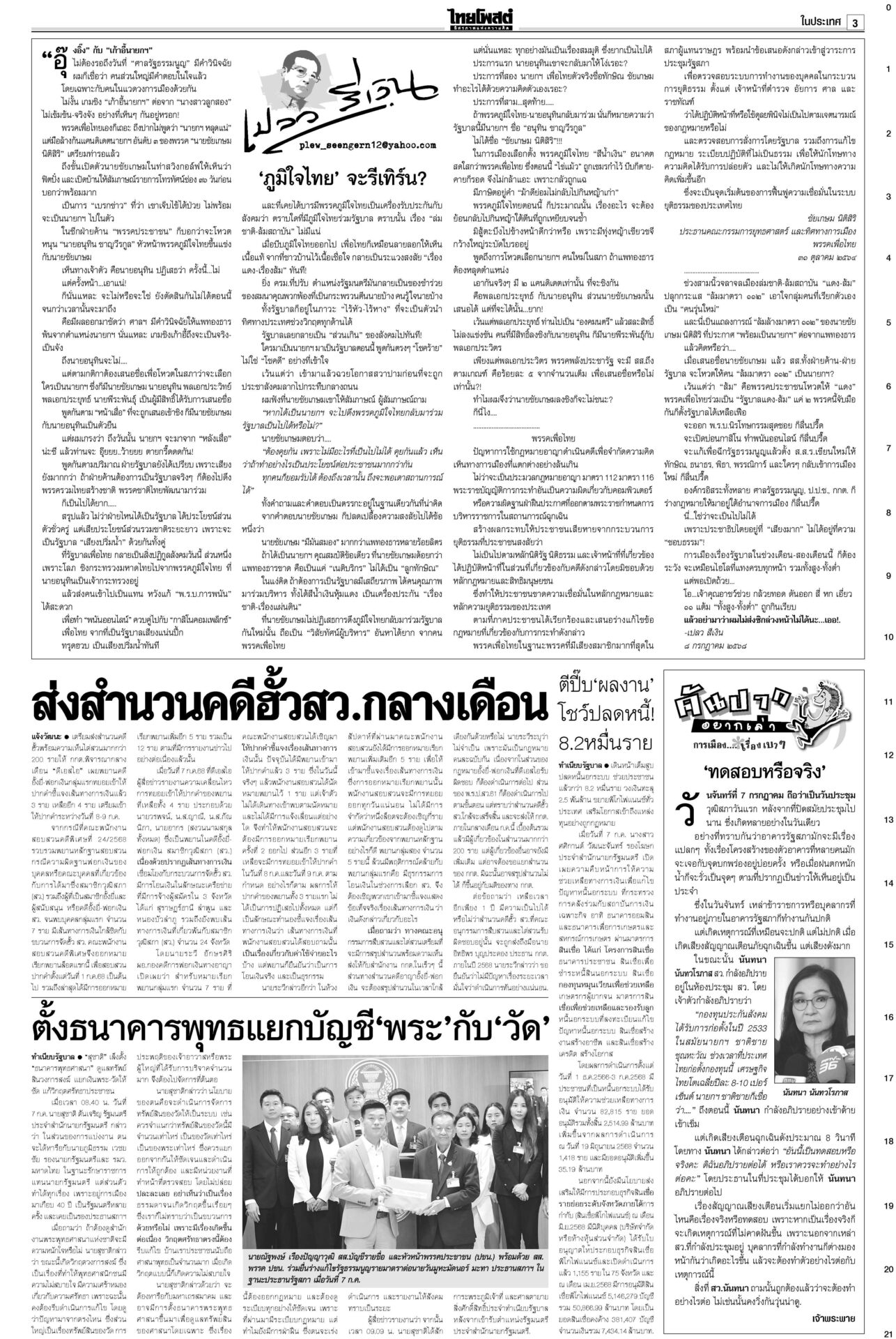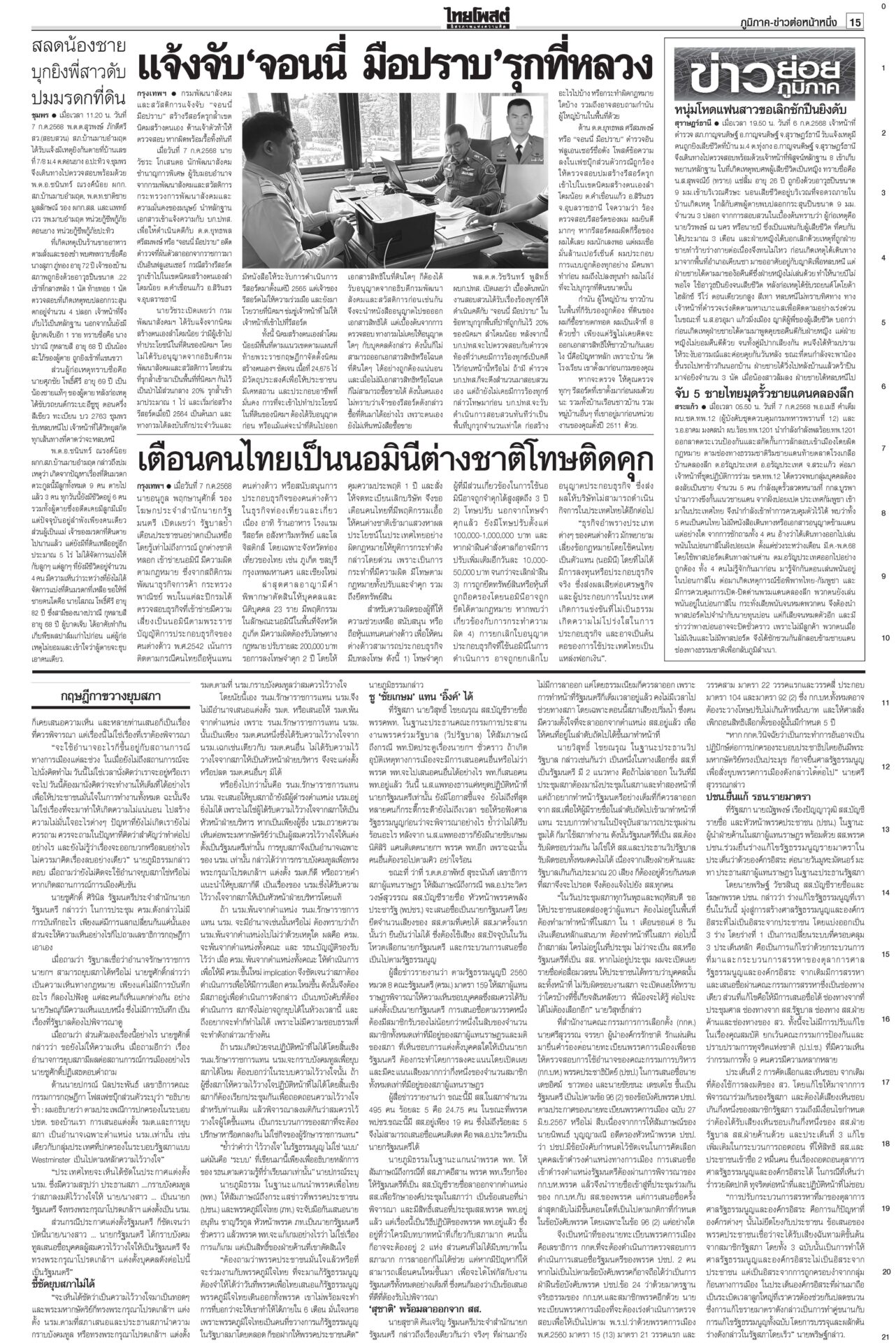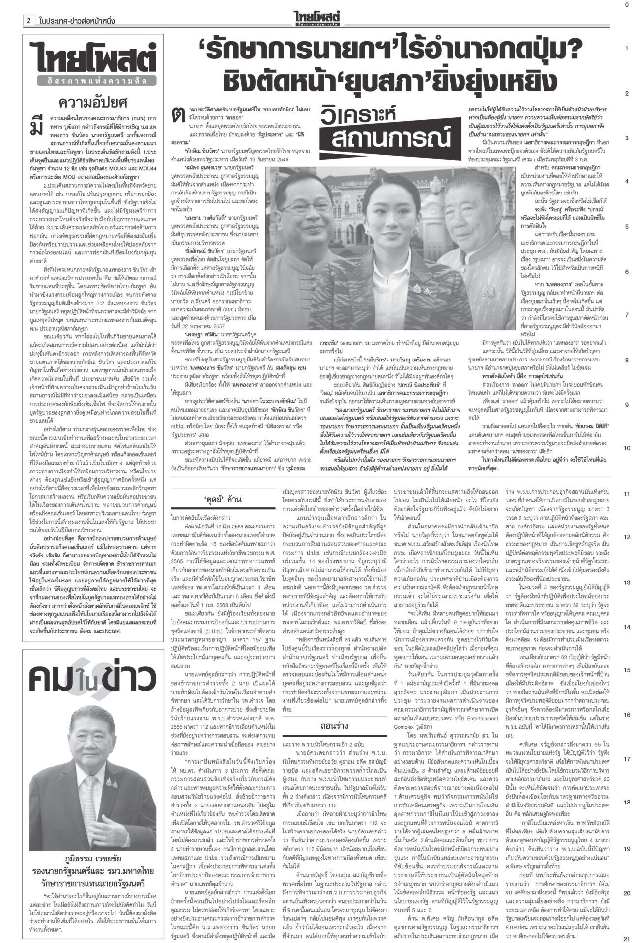 หนังสือพิมพ์ ฉบับวันที่ 8 กรกฎาคม 2568ข่าวหน้าหนึ่งกฤษฎีกาขวางยุบสภา รักษาการนายกฯไร้อำนาจ พท.โวมี‘ชัยเกษม’ขึ้นแทน“ภูมิธรรม” ยอมรับ “เลขาฯ กฤษฎีกา” แจงครม. “รักษาการนายกฯ” จ่อลดภาษีนำเข้า0%ให้สหรัฐ“พิชัย” รับเตรียมลดภาษีนำเข้าให้สหรัฐฯ เหลือ 0% หลายรายการ แต่ยันไม่ได้ให้ทั้งหมด ถอนร่างพ.ร.บ.กาสิโน ไฟเขียวถก‘กม.นิรโทษ’วิปรัฐบาลไฟเขียวร่าง พ.ร.บ.สร้างเสริมสังคมสันติสุข จ่อเข้าสภาคิวแรกพุธนี้ กต.แจงสมาชิกUNสู้เขมร ปลดล็อกแรงงานอยู่ยาว“ศบ.ทก.” ปลดล็อกปัญหาแรงงานต่างด้าวใบอนุญาตหมดอายุ ‘ตุลย์’ค้านผบ.ตร. ปูนบำเหน็จ2นพ. จี้ตั้งกก.ฟันวินัย“หมอตุลย์” บุก ตร.ยื่นหนังสือ ผบ.ตร. ค้านเลื่อนตำแหน่ง 2 นายแพทย์ตำรวจ