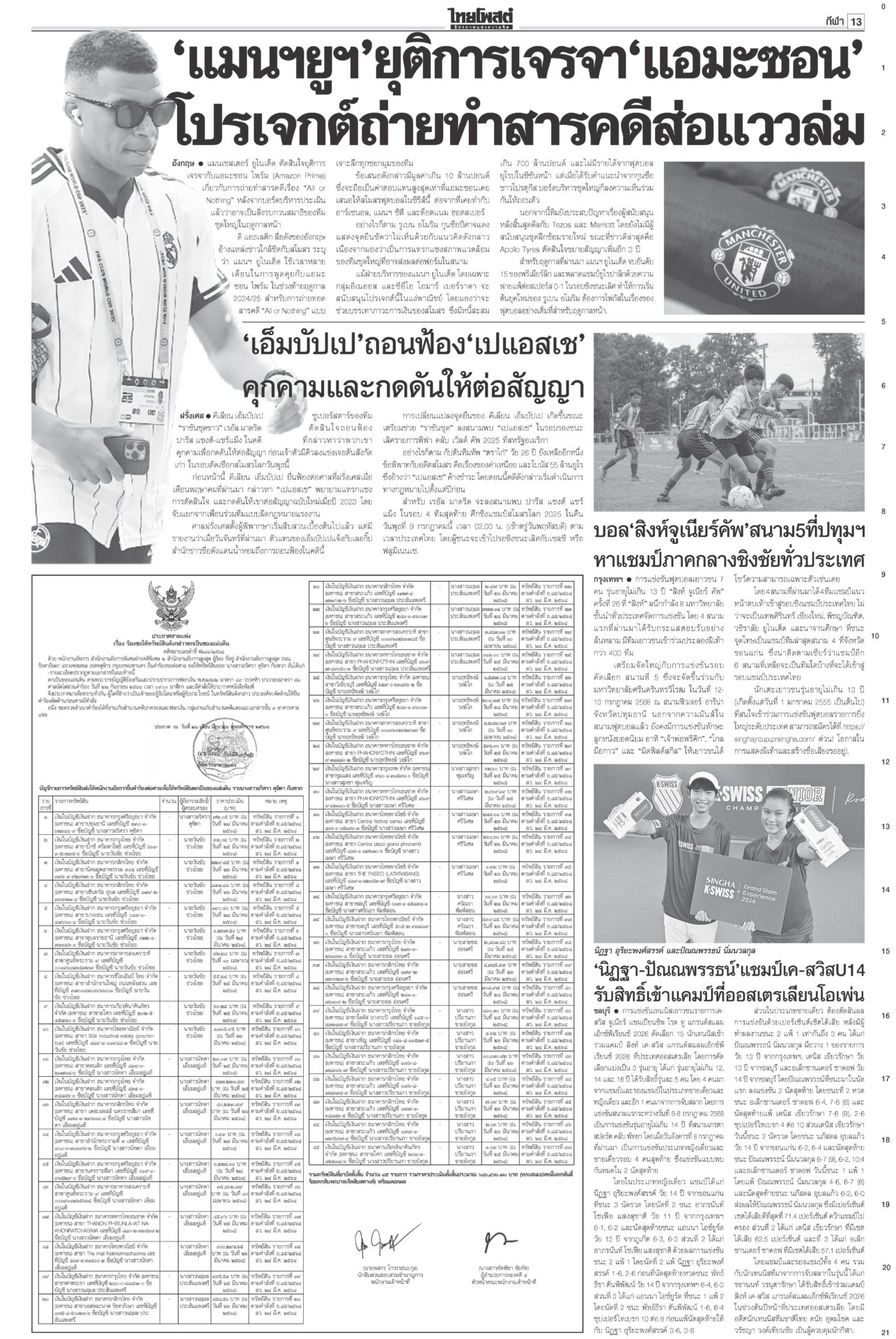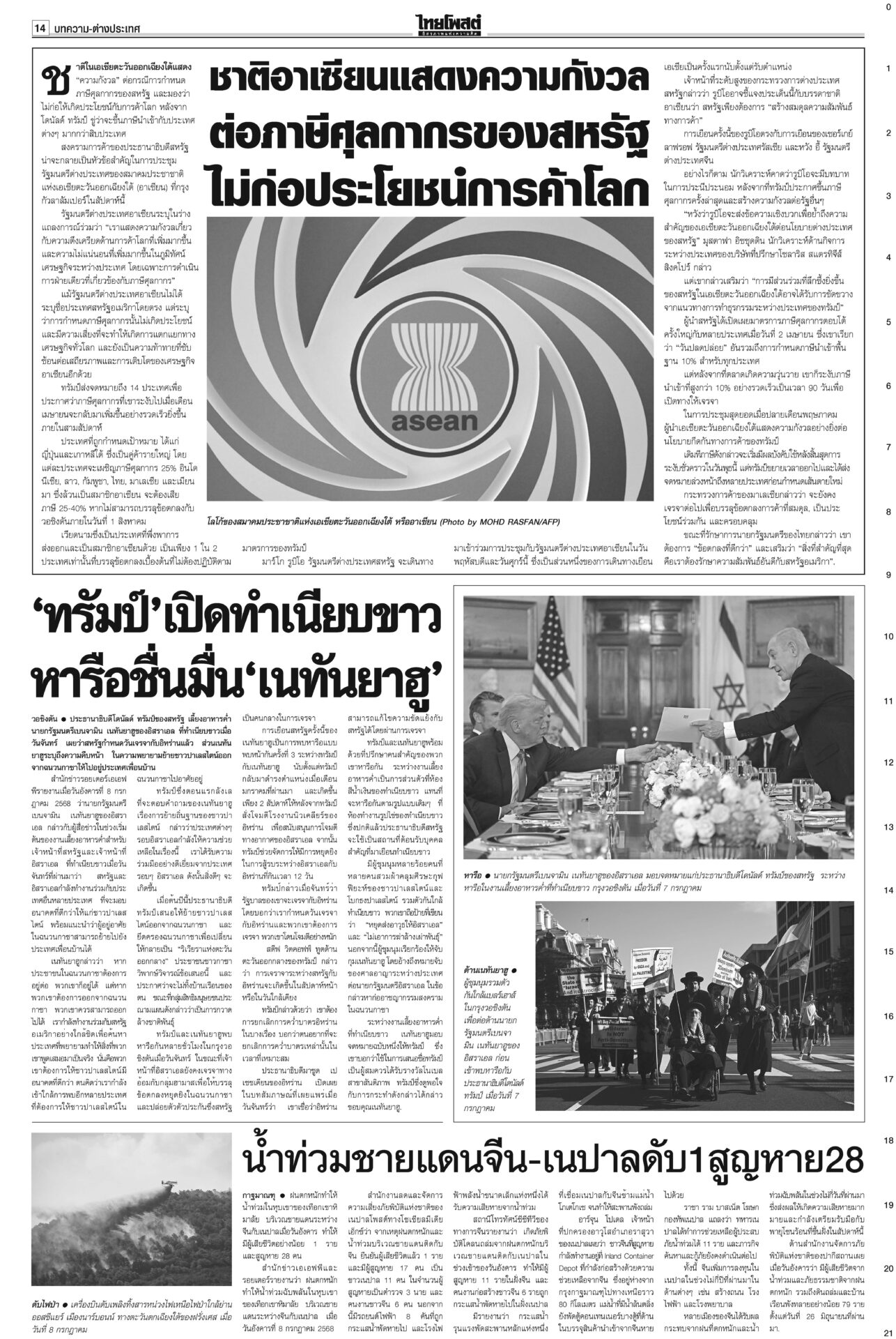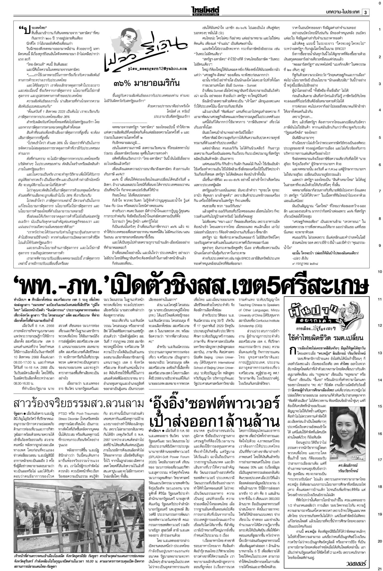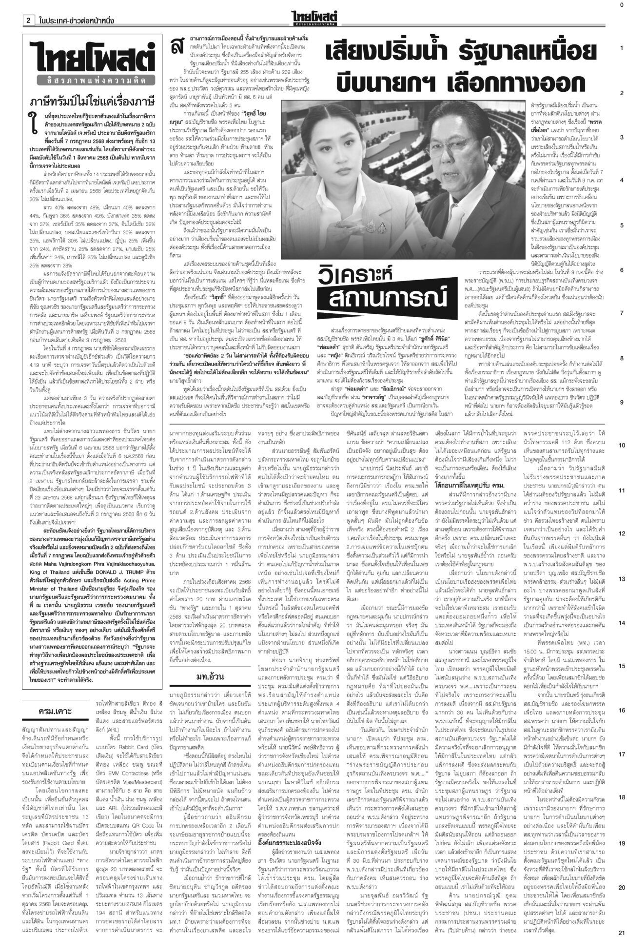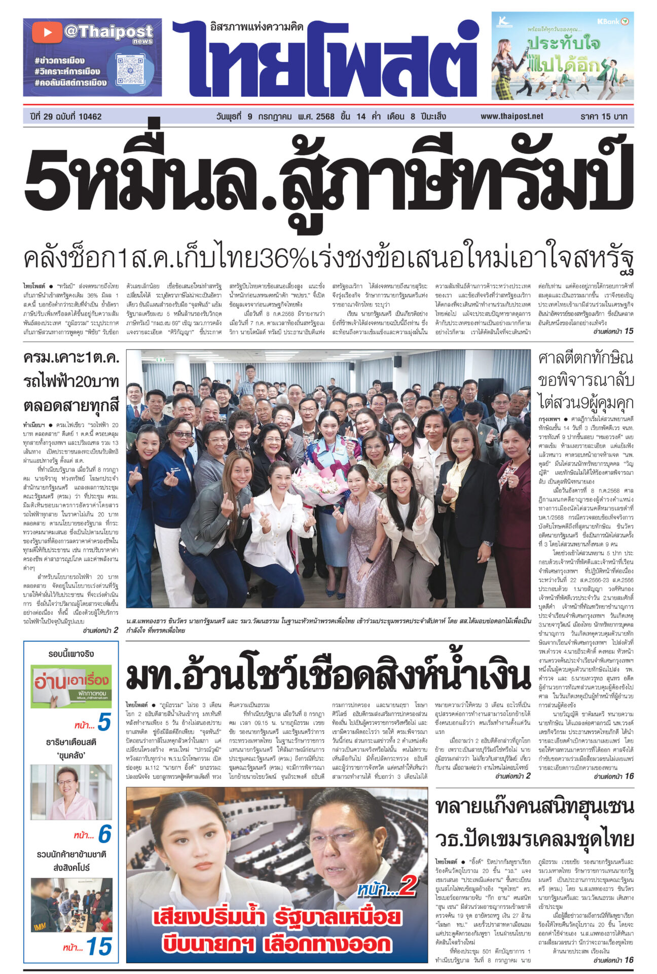 หนังสือพิมพ์ ฉบับวันที่ 9 กรกฎาคม 2568ข่าวหน้าหนึ่ง5หมื่นล.สู้ภาษีทรัมป์ คลังช็อก1ส.ค.เก็บไทย36%เร่งชงข้อเสนอใหม่เอาใจสหรัฐ“ทรัมป์” ส่งจดหมายถึงไทย เก็บภาษีนำเข้าสหรัฐคงเดิม 36% มีผล 1 ส.ค.นี้ มท.อ้วนโชว์เชือดสิงห์นํ้าเงิน“ภูมิธรรม” ไม่รอ 3 เดือน โยก 2 อธิบดีสายสีน้ำเงินเข้ากรุ มท.ทันที หลังทำงานเพียง 5 วัน ทลายแก๊งคนสนิทฮุนเซน วธ.ปัดเขมรเคลมชุดไทย“อิ๊งค์” ปิดปากกัมพูชาเรียกร้องคืนวัตถุโบราณ 20 ชิ้น “วธ.” แจงเขมรเสนอ “ประเพณีแต่งงาน” ขึ้นทะเบียนยูเนสโกไม่พบข้อมูลอ้างอิง “ชุดไทย” ครม.เคาะ1ต.ค. รถไฟฟ้า20บาท ตลอดสายทุกสีครม.ไฟเขียว “รถไฟฟ้า 20 บาท ตลอดสาย” ดีเดย์ 1 ต.ค.นี้ ครอบคลุมทุกสายทั้งกรุงเทพฯ และปริมณฑล ศาลตีตกทักษิณ ขอพิจารณาลับ ไต่สวน9ผู้คุมคุกศาลฎีกาเริ่มไต่สวนพยานคดีทักษิณชั้น 14 วันที่ 3 เรียกพัศดีเวร จนท.ราชทัณฑ์ 9 ปากขึ้นสอบ “หมอวรงค์”