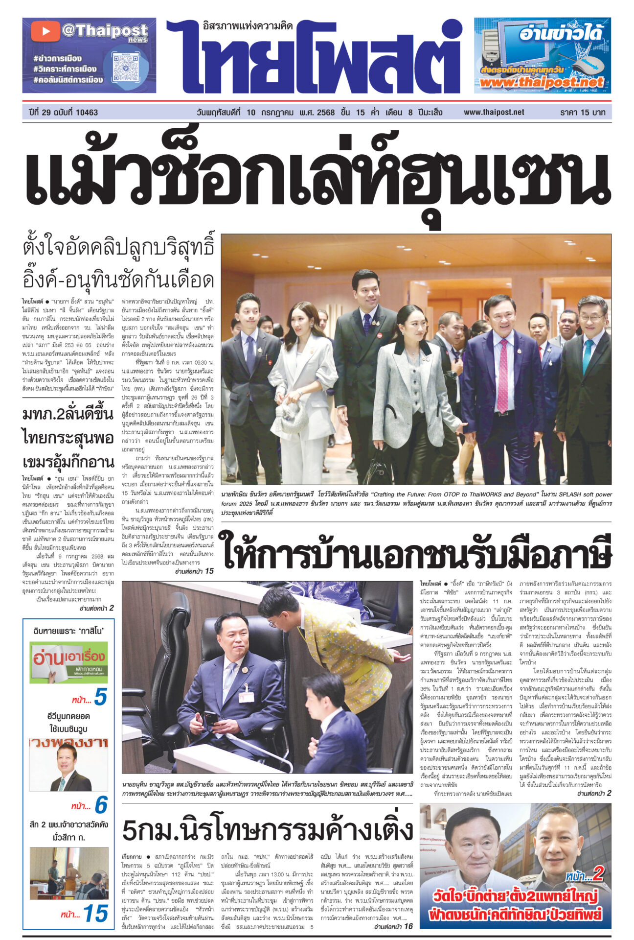 หนังสือพิมพ์ ฉบับวันที่ 10 กรกฎาคม 2568ข่าวหน้าหนึ่งแม้วช็อกเล่ห์ฮุนเซน ตั้งใจอัดคลิปลูกบริสุทธิ์ อิ๊งค์-อนุทินซัดกันเดือด“นายกฯ อิ๊งค์” สวน “อนุทิน” ใส่สีตีไข่ ปมหา “สี จิ้นผิง” เตือนรัฐบาลดัน กม.กาสิโน กระทบนักท่องเที่ยวจีนไม่มาไทย ให้การบ้านเอกชนรับมือภาษี“อิ๊งค์” เชื่อ “ภาษีทรัมป์” ยังมีโอกาส “พิชัย” แจกการบ้านภาคธุรกิจประเมินผลกระทบ 5กม.นิรโทษกรรมค้างเติ่งสภาเปิดฉากถกร่าง กม.นิรโทษกรรม 5 ฉบับรวด “ภูมิใจไทย” ปิดประตูไม่หนุนนิรโทษฯ 112 มทภ.2ลั่นดีขึ้น ไทยกระสุนพอ เขมรอุ้มก๊กอาน“ฮุน เซน” โพสต์ถี่ยิบ ยกนิด้าโพล เพ้อหนักอ้างสิ่งที่กลัวที่สุดคือคนไทย “รักฮุน เซน” แต่จะทำให้ตัวเองเป็นคนทรยศต่อเขมร