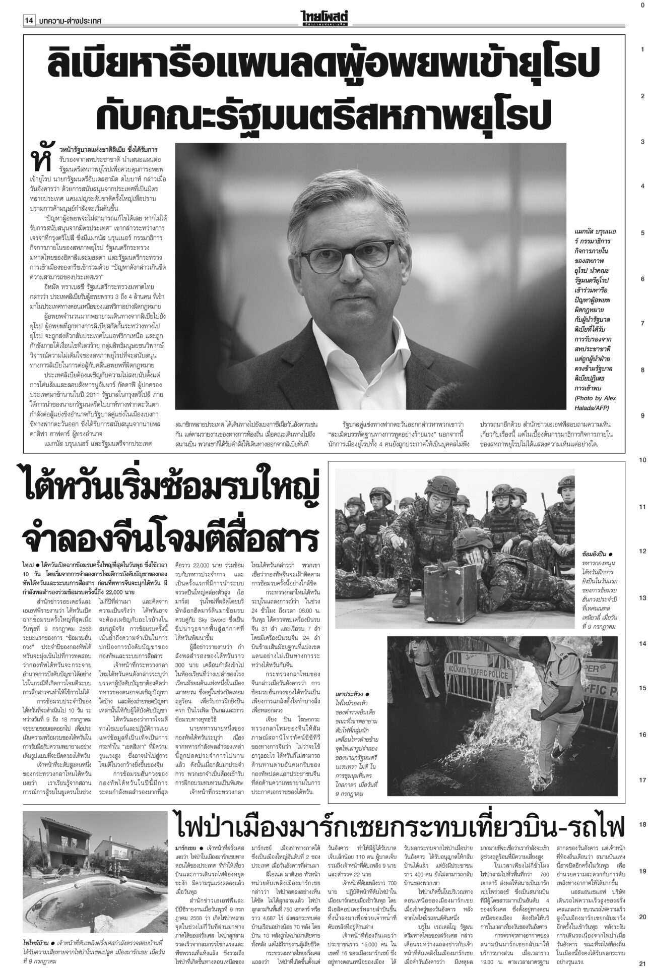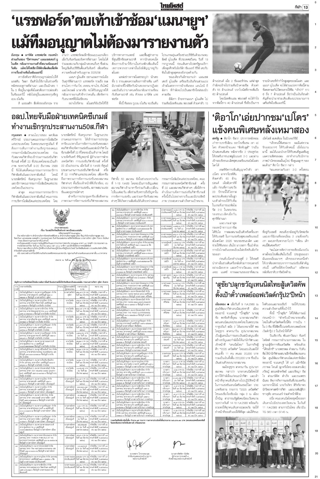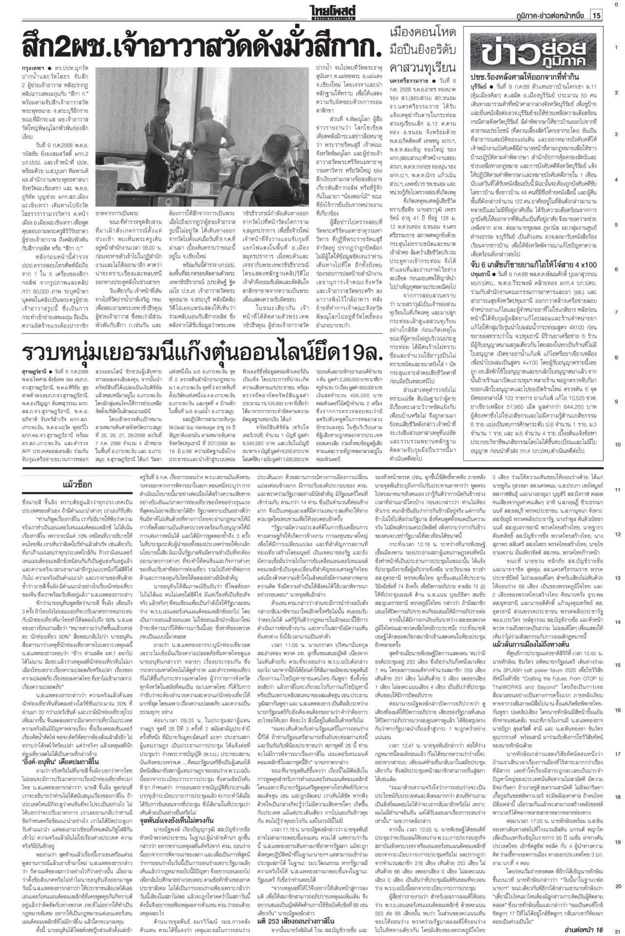 ฉบับวันที่ 10 กรกฎาคม 2568 10 กรกฎาคม 2568 เวลา 0:01 น. หนังสือพิมพ์ ฉบับวันที่ 10 กรกฎาคม 2568ข่าวหน้าหนึ่งแม้วช็อกเล่ห์ฮุนเซน ตั้งใจอัดคลิปลูกบริสุทธิ์ อิ๊งค์-อนุทินซัดกันเดือด“นายกฯ อิ๊งค์” สวน “อนุทิน” ใส่สีตีไข่ ปมหา “สี จิ้นผิง” เตือนรัฐบาลดัน กม.กาสิโน กระทบนักท่องเที่ยวจีนไม่มาไทย ให้การบ้านเอกชนรับมือภาษี“อิ๊งค์” เชื่อ “ภาษีทรัมป์” ยังมีโอกาส “พิชัย” แจกการบ้านภาคธุรกิจประเมินผลกระทบ 5กม.นิรโทษกรรมค้างเติ่งสภาเปิดฉากถกร่าง กม.นิรโทษกรรม 5 ฉบับรวด “ภูมิใจไทย” ปิดประตูไม่หนุนนิรโทษฯ 112 มทภ.2ลั่นดีขึ้น ไทยกระสุนพอ เขมรอุ้มก๊กอาน“ฮุน เซน” โพสต์ถี่ยิบ ยกนิด้าโพล เพ้อหนักอ้างสิ่งที่กลัวที่สุดคือคนไทย “รักฮุน เซน” แต่จะทำให้ตัวเองเป็นคนทรยศต่อเขมร Tagsรายวันหนังสือพิมพ์ ข่าวที่เกี่ยวข้อง ฉบับวันที่ 6 ธันวาคม 2568 ฉบับวันที่ 5 ธันวาคม 2568 ฉบับวันที่ 4 ธันวาคม 2568 ฉบับวันที่ 3 ธันวาคม 2568 ฉบับวันที่ 2 ธันวาคม 2568 ฉบับวันที่ 1 ธันวาคม 2568 NEWS UPDATE 0:42 น. 'DUMB.RONG' ค่าย 'tiny' ส่งซิงเกิล 'SUNRISE' พร้อม MV สุดปั่น 0:37 น. 'เบนท์ กิตติธัช' จาก 'Kicks Records' ปล่อย 'กาฬสินธุ์ บลูส์' แนวดนตรีใหม่ที่โตขึ้น 18:43 น. ในหลวง พระราชินี ทรงบำเพ็ญพระราชกุศลทักษิณานุปทาน เนื่องในวันคล้ายวันพระบรมราชสมภพ รัชกาลที่ 9 18:12 น. เริ่มแล้ว Cat Expo Thailand 2025 วันแรก 'ทาสแมว' แห่ร่วมงานคึกคักคาดเม็ดเงินสะพัด 120 ล้านบาท 18:06 น. กรมอุตุฯ เผยพายุลูกใหม่กำลังก่อตัวบริเวณทะเลจีนใต้ตอนกลาง