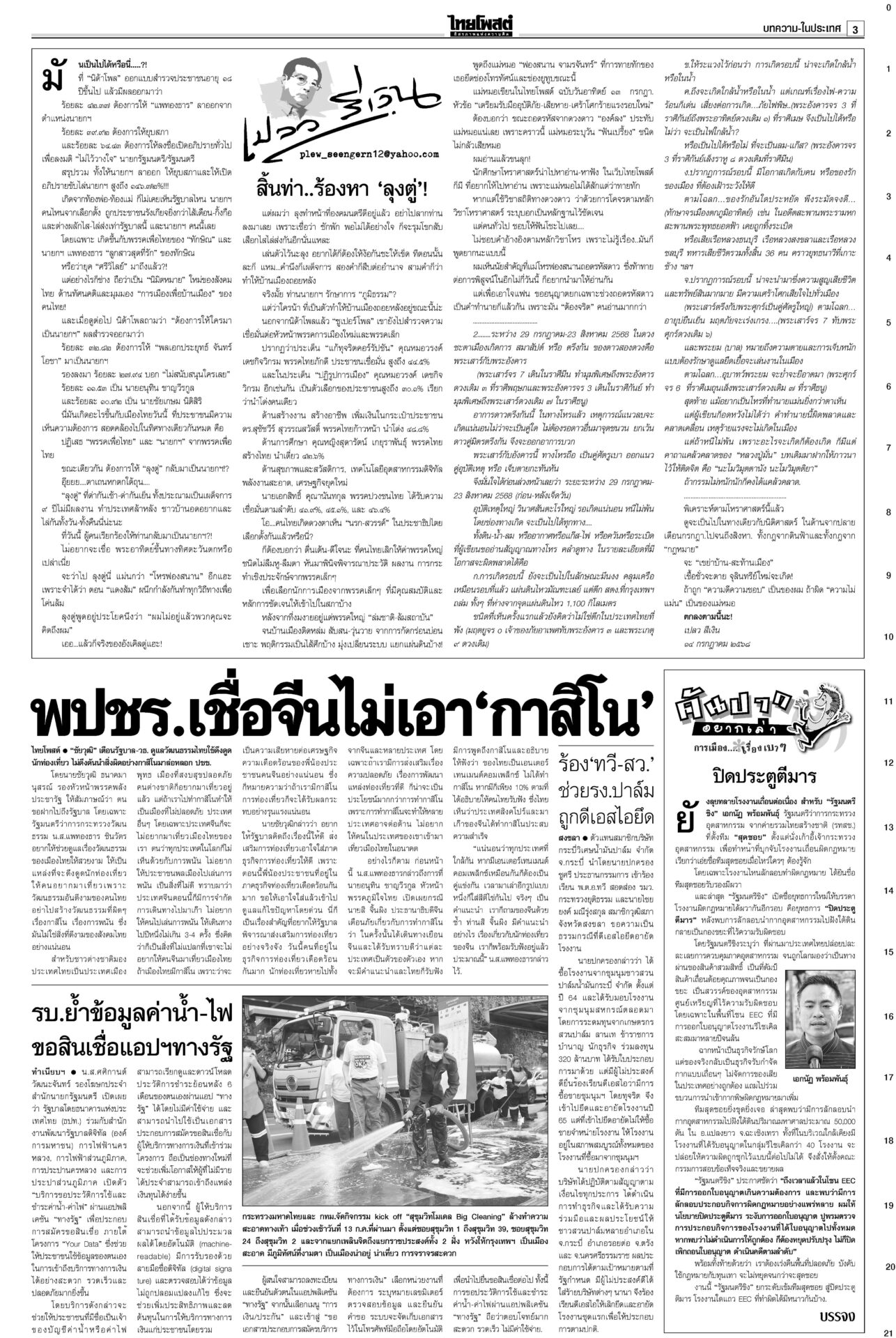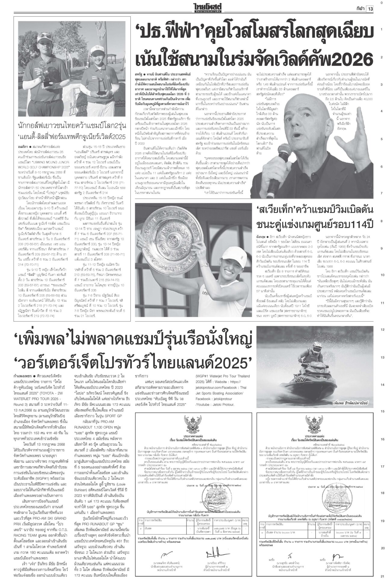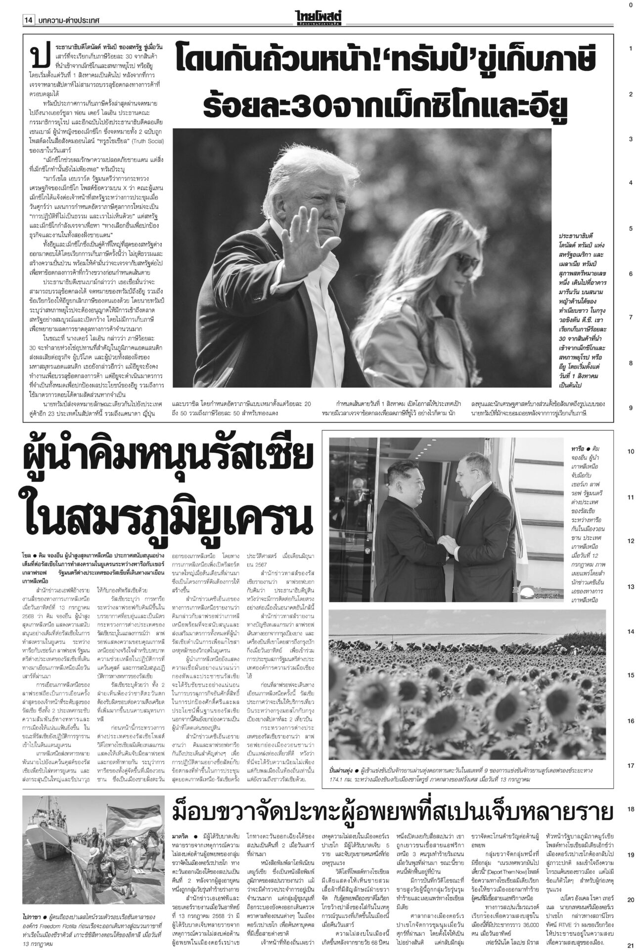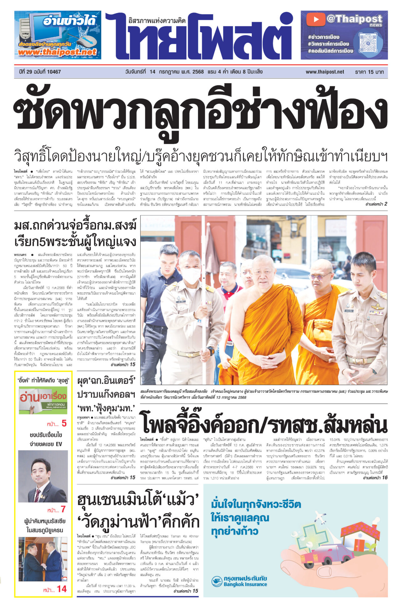หนังสือพิมพ์ ฉบับวันที่ 14 กรกฎาคม 2568ข่าวหน้าหนึ่งซัดพวกลูกอีช่างฟ้อง วิสุทธิ์โดดป้องนายใหญ่/บรู๊คอ้างยุคชวนก็เคยให้ทักษิณเข้าทำเนียบฯ“เพื่อไทย” ดาหน้าโต้แทน “สทร.” ไม่ได้ครอบงำพรรค แจงร่วมประชุมทีมไทยแลนด์เป็นเรื่องปกติ ฮุนเซนเมินโต้‘แม้ว’ ‘วัดภูม่านฟ้า’คึกคัก“ฮุน เซน” ยังเงียบ! ไม่ตอบโต้ “ทักษิณ” แค่โพสต์เพลงปราสาทตาเมือนธม “ปานเทพ” จี้บัวแก้วเลิกปิดบังผลประชุม JBC โพลจี้อิ๊งค์ออก/รทสช.ส้มหล่น“อิ๊งค์” อยู่ยาก นิด้าโพลเผยคนอยากให้ลาออก ตามด้วยยุบสภา ผุด‘ฉก.อินเตอร์’ ปราบแก๊งคอลฯ ‘พท.’ฟุ้งคุม‘มท.’ผบ.ทสส.เตรียมจัดตั้ง “ฉก.นานาชาติ” ล้างบางแก๊งคอลเซ็นเตอร์ “ดนุพร” ขย่มเชื่อ 3 เดือนข้างหน้าอาชญากรรมจะลดลงอย่างมีนัยสำคัญ หลังเพื่อไทยกุมบังเหียนมหาดไทย