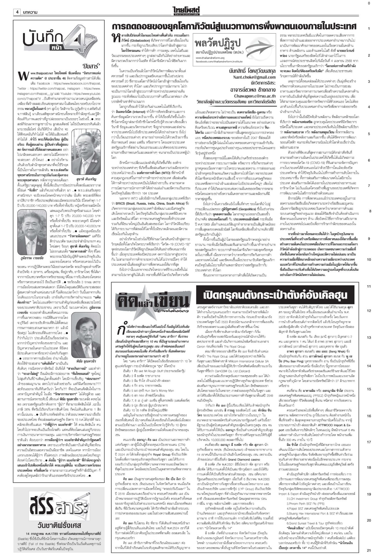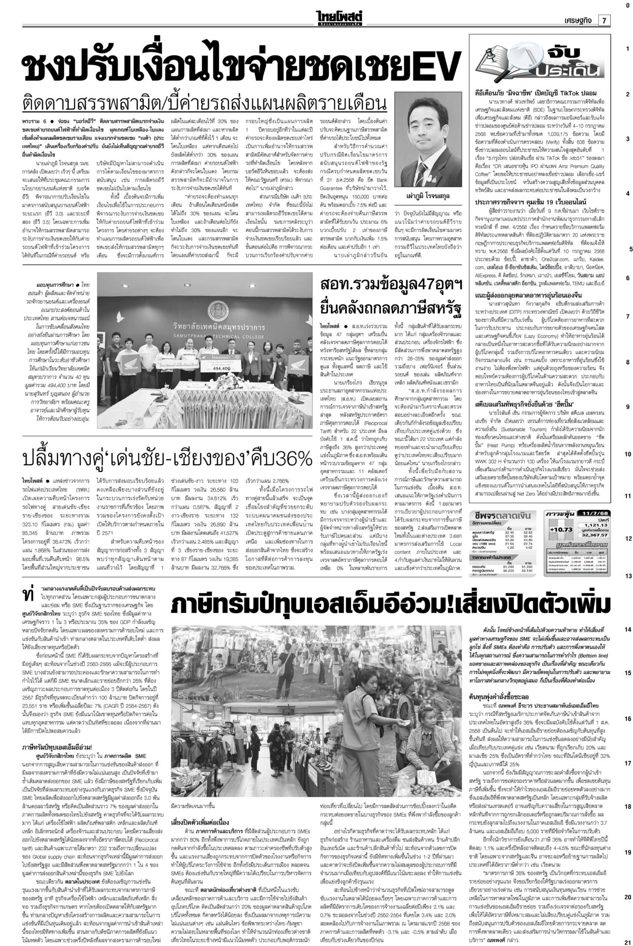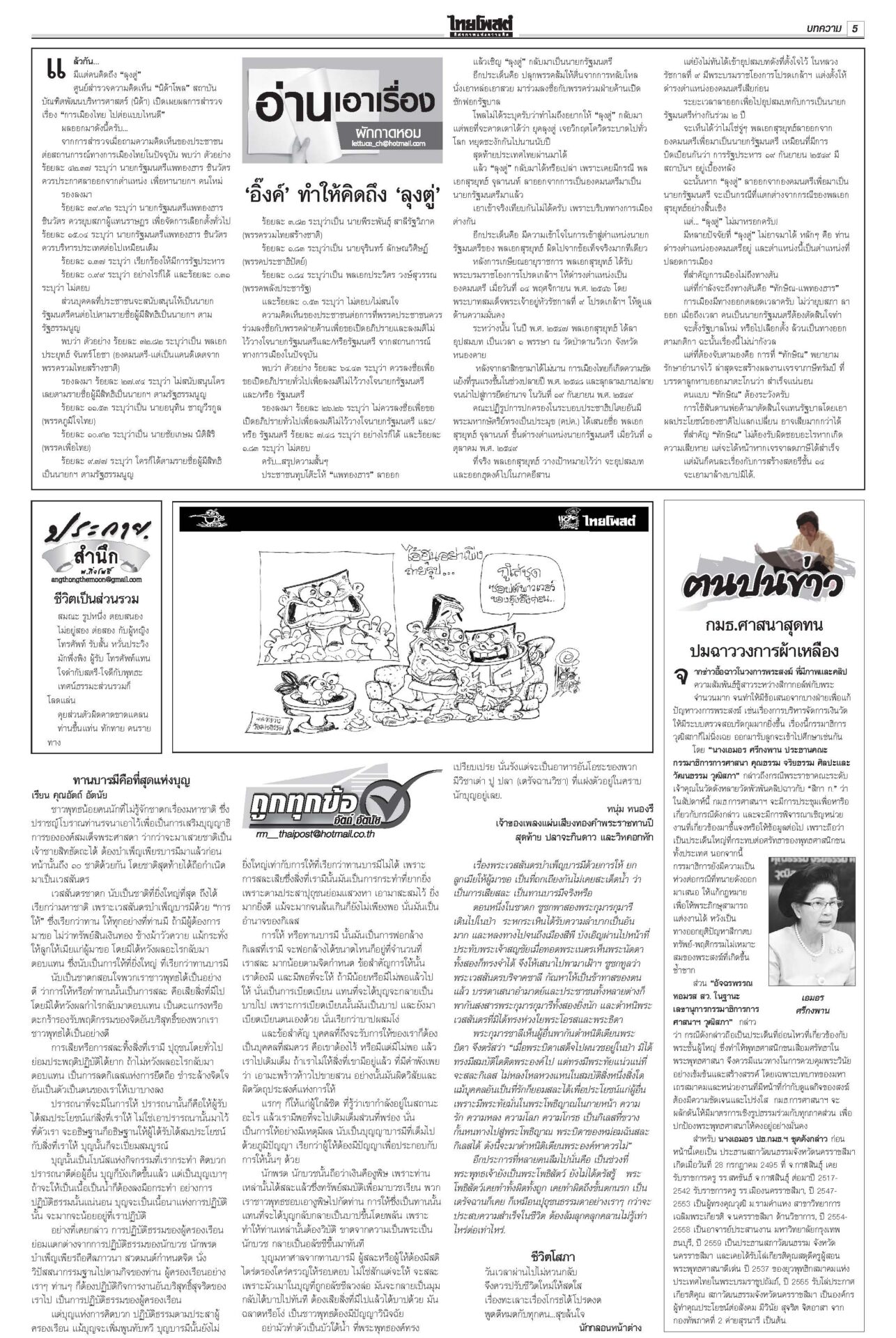 ฉบับวันที่ 14 กรกฎาคม 2568 14 กรกฎาคม 2568 เวลา 0:01 น. หนังสือพิมพ์ ฉบับวันที่ 14 กรกฎาคม 2568ข่าวหน้าหนึ่งซัดพวกลูกอีช่างฟ้อง วิสุทธิ์โดดป้องนายใหญ่/บรู๊คอ้างยุคชวนก็เคยให้ทักษิณเข้าทำเนียบฯ“เพื่อไทย” ดาหน้าโต้แทน “สทร.” ไม่ได้ครอบงำพรรค แจงร่วมประชุมทีมไทยแลนด์เป็นเรื่องปกติ ฮุนเซนเมินโต้‘แม้ว’ ‘วัดภูม่านฟ้า’คึกคัก“ฮุน เซน” ยังเงียบ! ไม่ตอบโต้ “ทักษิณ” แค่โพสต์เพลงปราสาทตาเมือนธม “ปานเทพ” จี้บัวแก้วเลิกปิดบังผลประชุม JBC โพลจี้อิ๊งค์ออก/รทสช.ส้มหล่น“อิ๊งค์” อยู่ยาก นิด้าโพลเผยคนอยากให้ลาออก ตามด้วยยุบสภา ผุด‘ฉก.อินเตอร์’ ปราบแก๊งคอลฯ ‘พท.’ฟุ้งคุม‘มท.’ผบ.ทสส.เตรียมจัดตั้ง “ฉก.นานาชาติ” ล้างบางแก๊งคอลเซ็นเตอร์ “ดนุพร” ขย่มเชื่อ 3 เดือนข้างหน้าอาชญากรรมจะลดลงอย่างมีนัยสำคัญ หลังเพื่อไทยกุมบังเหียนมหาดไทย Tagsรายวันหนังสือพิมพ์ ข่าวที่เกี่ยวข้อง ฉบับวันที่ 6 ธันวาคม 2568 ฉบับวันที่ 5 ธันวาคม 2568 ฉบับวันที่ 4 ธันวาคม 2568 ฉบับวันที่ 3 ธันวาคม 2568 ฉบับวันที่ 2 ธันวาคม 2568 ฉบับวันที่ 1 ธันวาคม 2568 NEWS UPDATE 0:42 น. 'DUMB.RONG' ค่าย 'tiny' ส่งซิงเกิล 'SUNRISE' พร้อม MV สุดปั่น 0:37 น. 'เบนท์ กิตติธัช' จาก 'Kicks Records' ปล่อย 'กาฬสินธุ์ บลูส์' แนวดนตรีใหม่ที่โตขึ้น 18:43 น. ในหลวง พระราชินี ทรงบำเพ็ญพระราชกุศลทักษิณานุปทาน เนื่องในวันคล้ายวันพระบรมราชสมภพ รัชกาลที่ 9 18:12 น. เริ่มแล้ว Cat Expo Thailand 2025 วันแรก 'ทาสแมว' แห่ร่วมงานคึกคักคาดเม็ดเงินสะพัด 120 ล้านบาท 18:06 น. กรมอุตุฯ เผยพายุลูกใหม่กำลังก่อตัวบริเวณทะเลจีนใต้ตอนกลาง