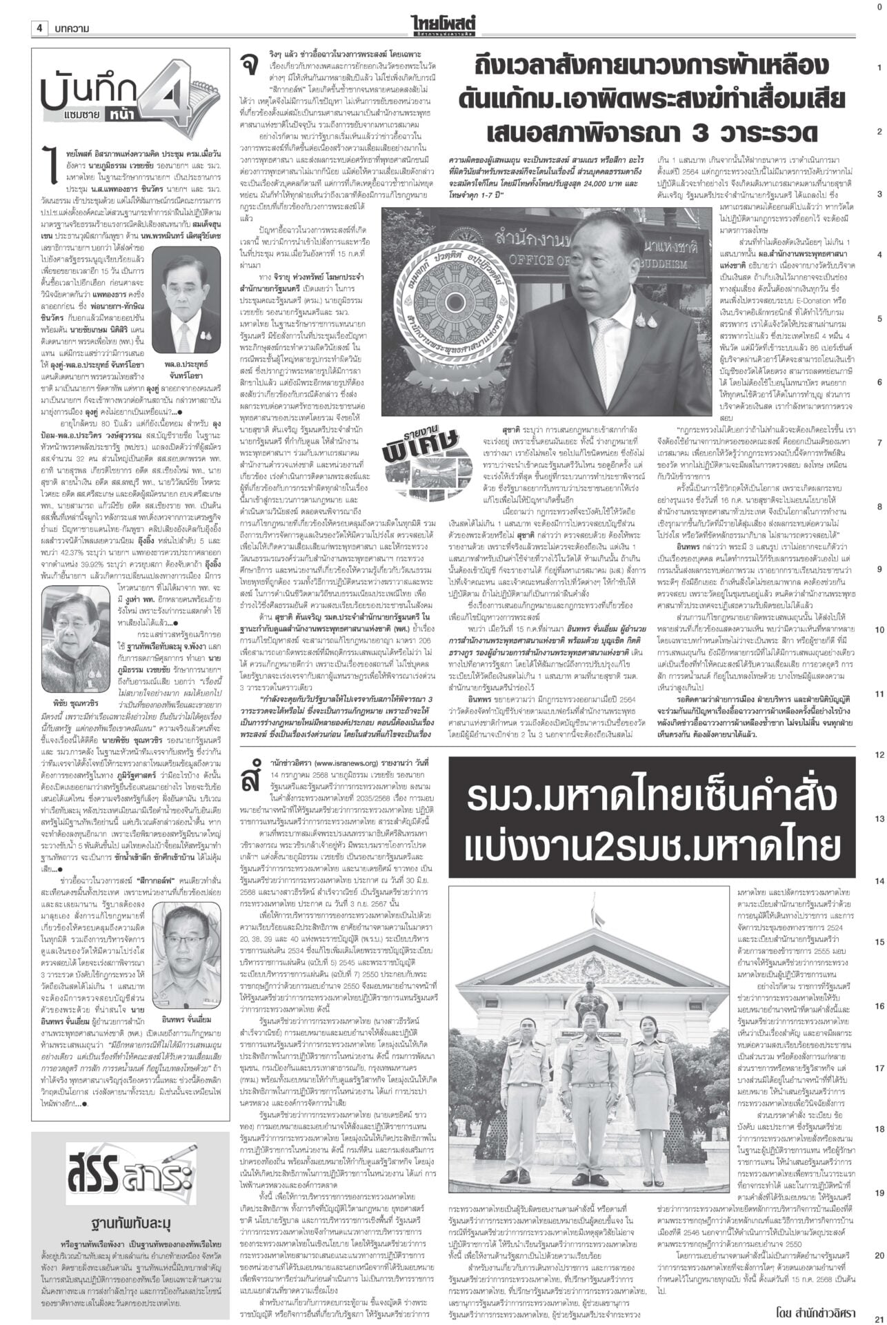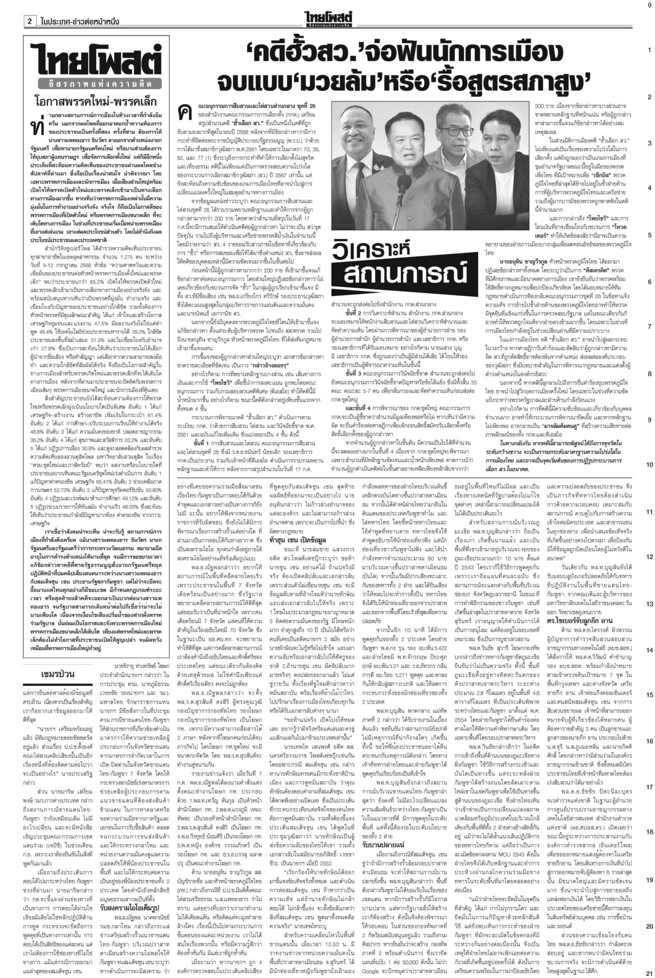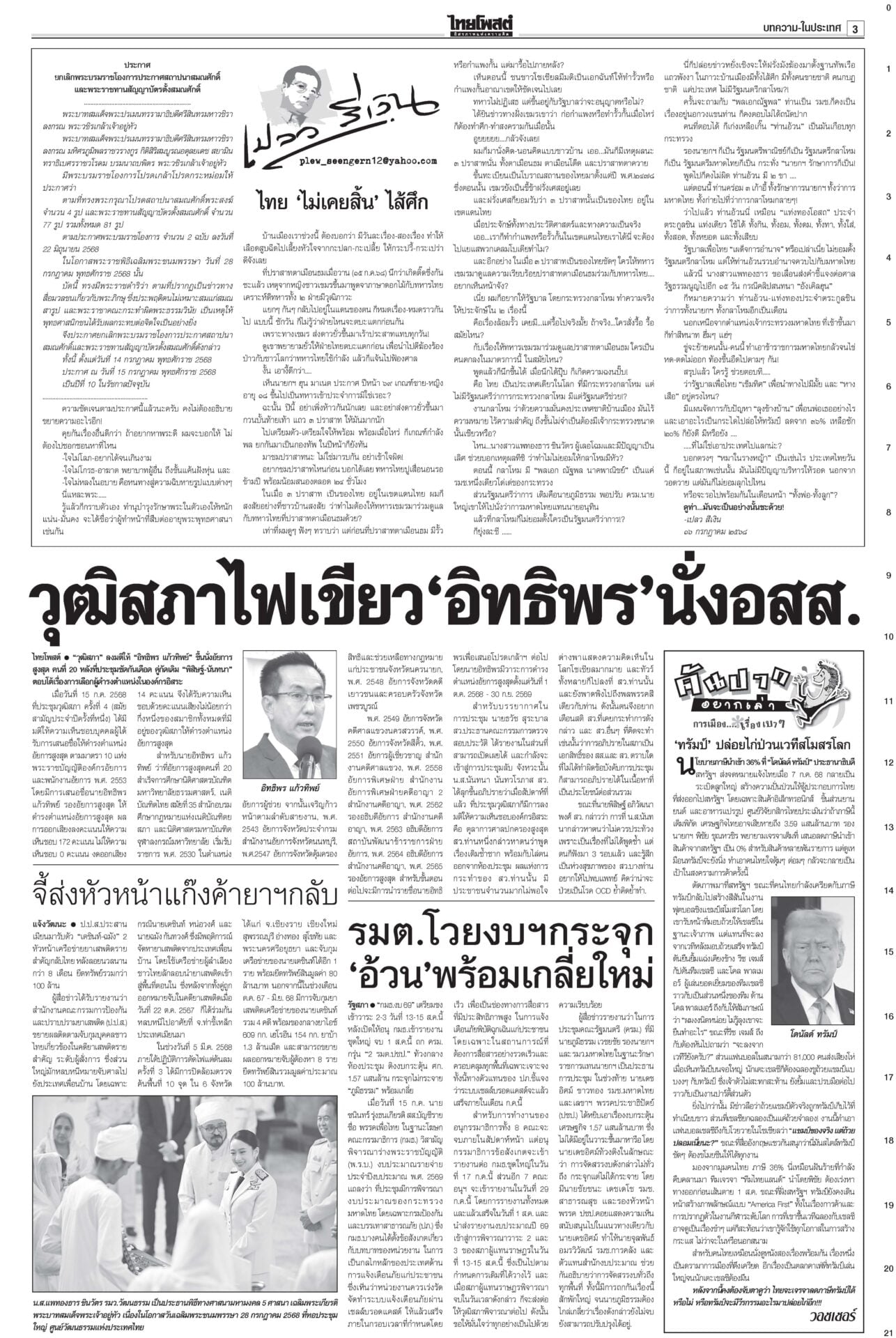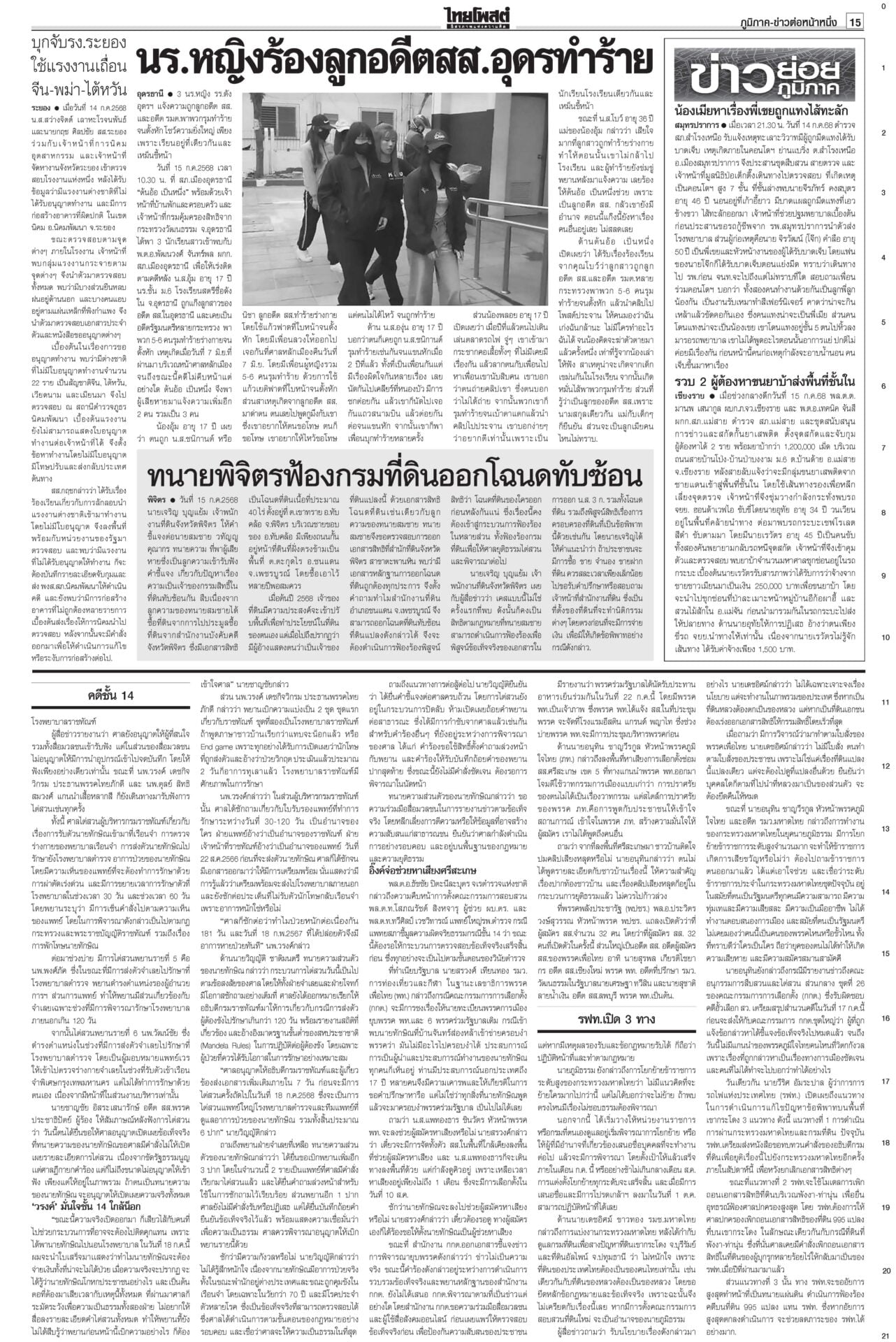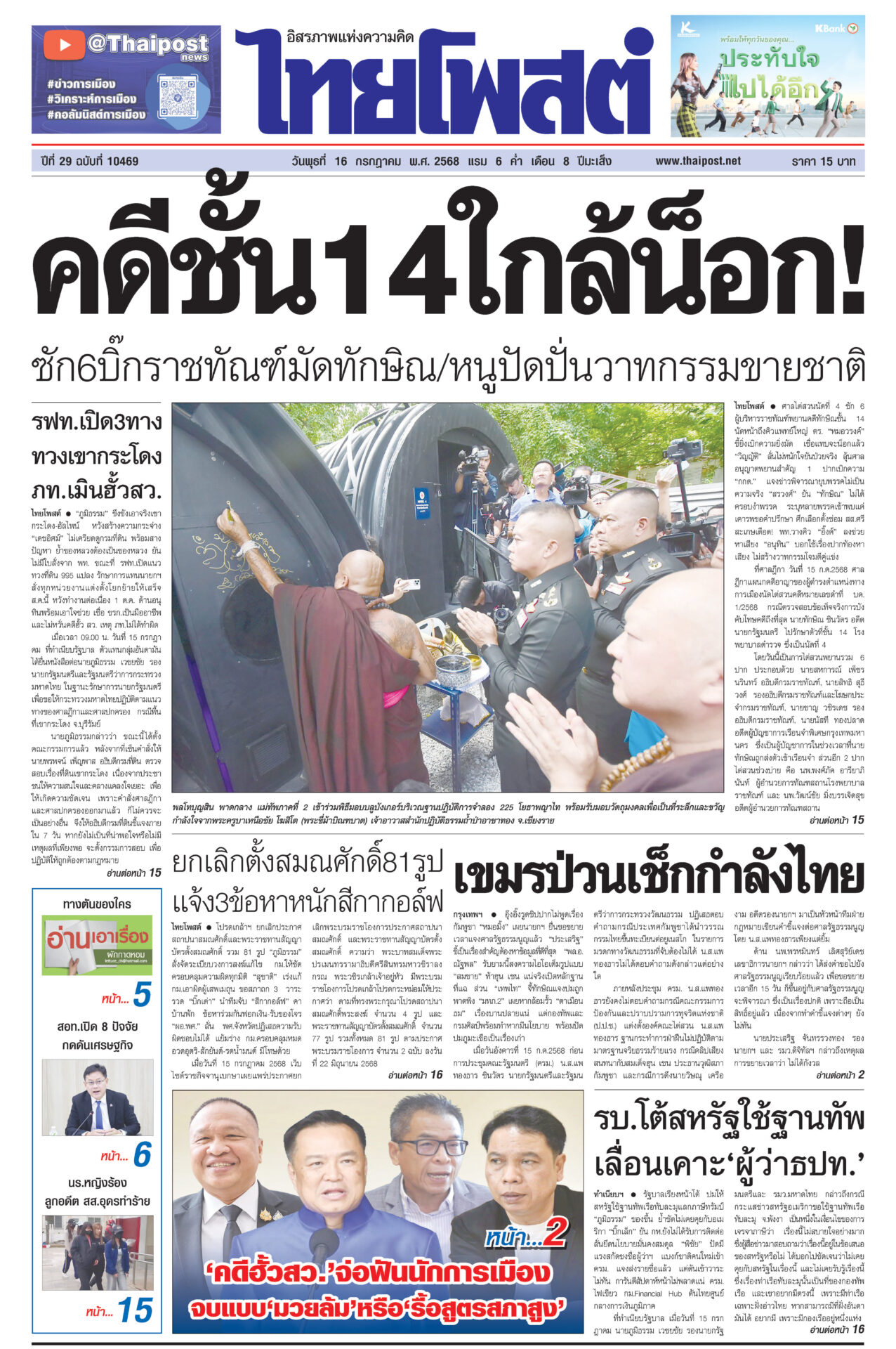 หนังสือพิมพ์ ฉบับวันที่ 16 กรกฎาคม 2568ข่าวหน้าหนึ่งคดีชั้น14ใกล้น็อก! ซัก6บิ๊กราชทัณฑ์มัดทักษิณ/หนูปัดปั่นวาทกรรมขายชาติศาลไต่สวนนัดที่ 4 ซัก 6 ผู้บริหารราชทัณฑ์พยานคดีทักษิณชั้น 14 นัดหน้าถึงคิวแพทย์ใหญ่ ตร. “หมอวรงค์” ชี้ยิ่งเบิกความยิ่งมัด เชื่อแทบจะน็อกแล้ว เขมรป่วนเช็กกำลังไทยอุ๊งอิ๊งรูดซิปปากไม่พูดเรื่องกัมพูชา “หมอมิ้ง” เผยนายกฯ ยื่นขอขยายเวลาแจงศาลรัฐธรรมนูญแล้ว รบ.โต้สหรัฐใช้ฐานทัพ เลื่อนเคาะ‘ผู้ว่าธปท.’รัฐบาลเรียงหน้าโต้ ปมให้สหรัฐใช้ฐานทัพเรือละมุแลกภาษีทรัมป์ “ภูมิธรรม” ของขึ้น ยกเลิกตั้งสมณศักดิ์81รูป แจ้ง3ข้อหาหนักสีกากอล์ฟโปรดเกล้าฯ ยกเลิกประกาศสถาปนาสมณศักดิ์และพระราชทานสัญญาบัตรตั้งสมณศักดิ์ รวม 81 รูป รฟท.เปิด3ทาง ทวงเขากระโดง ภท.เมินฮั้วสว.“ภูมิธรรม” ขึงขังเอาจริงเขากระโดง-อัลไพน์ หวังสร้างความกระจ่าง “เดชอิศม์”