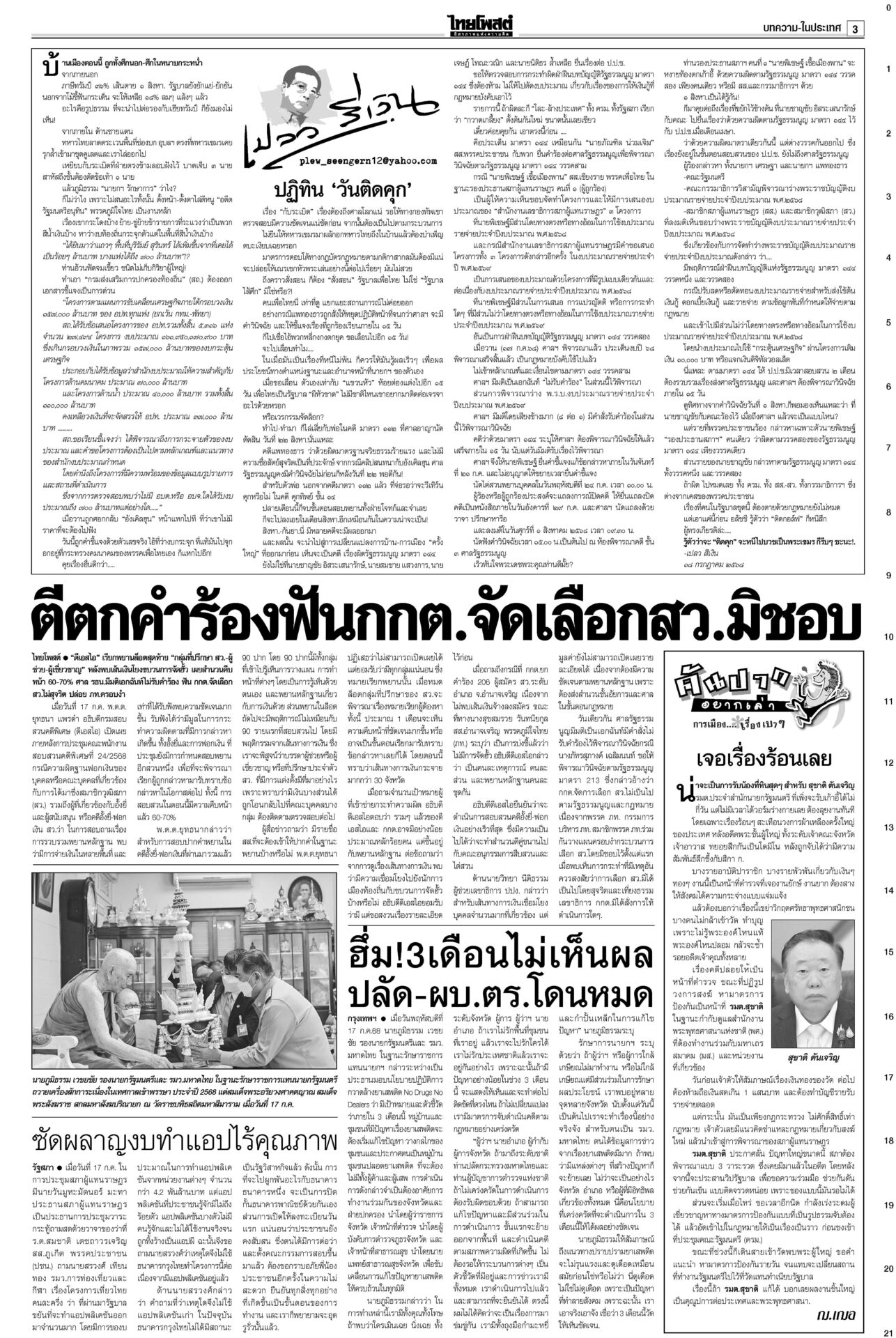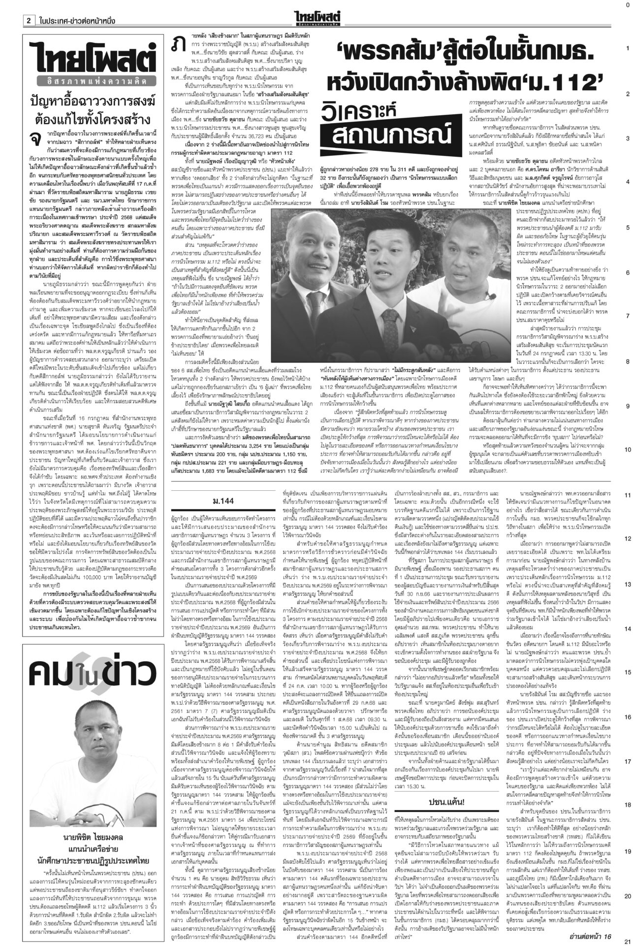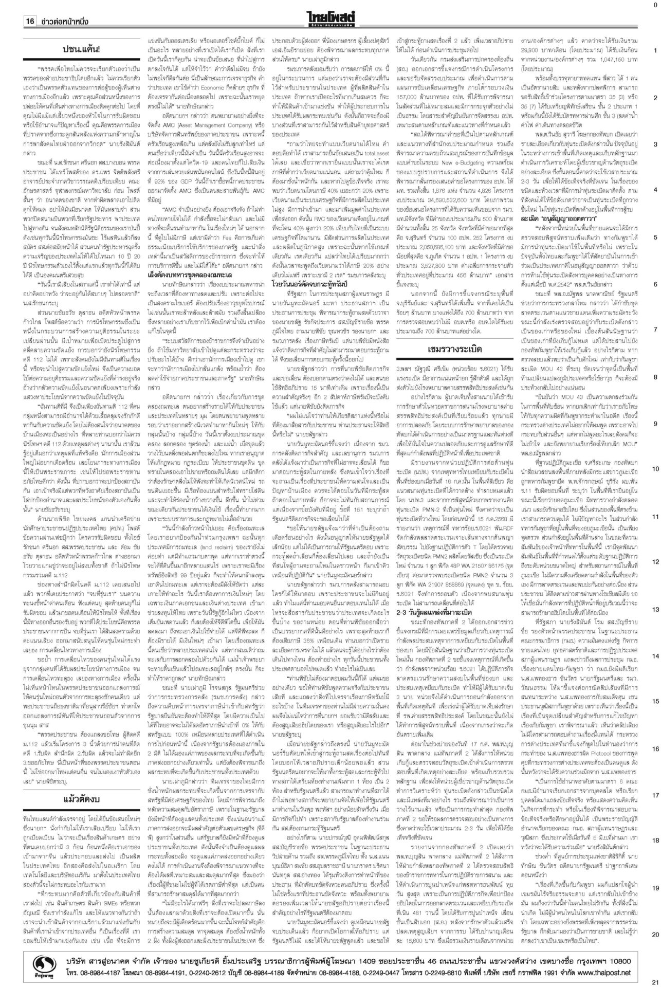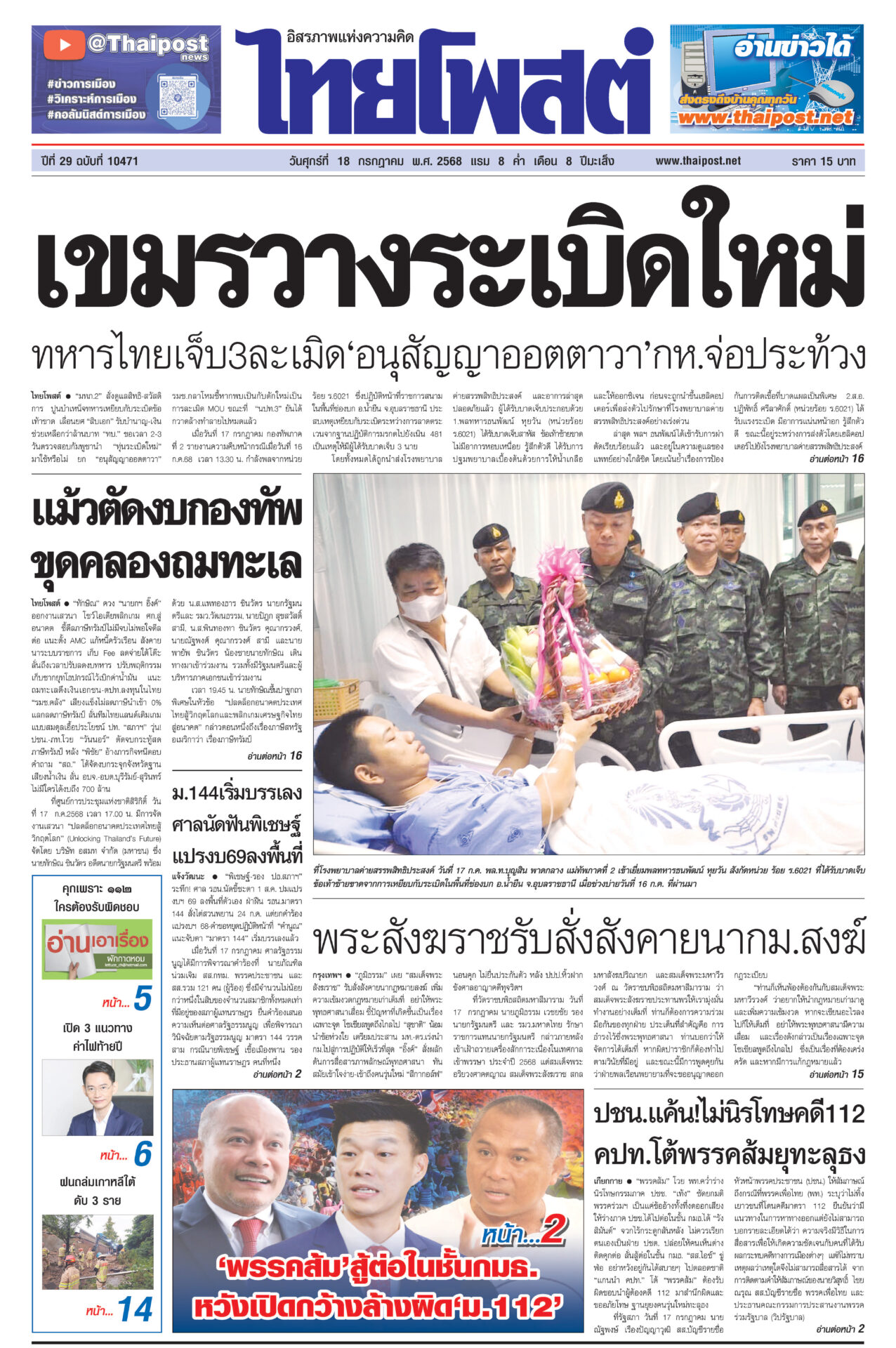 หนังสือพิมพ์ ฉบับวันที่ 18 กรกฎาคม 2568ข่าวหน้าหนึ่งเขมรวางระเบิดใหม่ ทหารไทยเจ็บ3ละเมิด‘อนุสัญญาออตตาวา’กห.จ่อประท้วง“มทภ.2” สั่งดูแลสิทธิ-สวัสดิการ ปูนบำเหน็จทหารเหยียบกับระเบิดข้อเท้าขาด เลื่อนยศ “สิบเอก” รับบำนาญ-เงินช่วยเหลือกว่าล้านบาท แม้วตัดงบกองทัพ ขุดคลองถมทะเล“ทักษิณ” ควง “นายกฯ อิ๊งค์” ออกงานเสวนา โชว์ไอเดียพลิกเกม ศก.สู่อนาคต พระสังฆราชรับสั่งสังคายนากม.สงฆ์“ภูมิธรรม” เผย “สมเด็จพระสังฆราช” รับสั่งสังคายนากฎหมายสงฆ์ ม.144เริ่มบรรเลง ศาลนัดฟันพิเชษฐ์ แปรงบ69ลงพื้นที่“พิเชษฐ์-รอง ปธ.สภาฯ” ระทึก! ศาล รธน.นัดชี้ชะตา 1 ส.ค. ปมแปรงบฯ 69 ปชน.แค้น!ไม่นิรโทษคดี112 คปท.โต้พรรคส้มยุทะลุธง“พรรคส้ม” โวย พท.คว่ำร่างนิรโทษกรรมภาค ปชช. “เท้ง” ซัดยกมติพรรคร่วมฯ