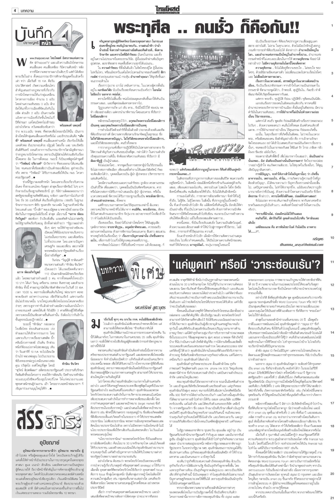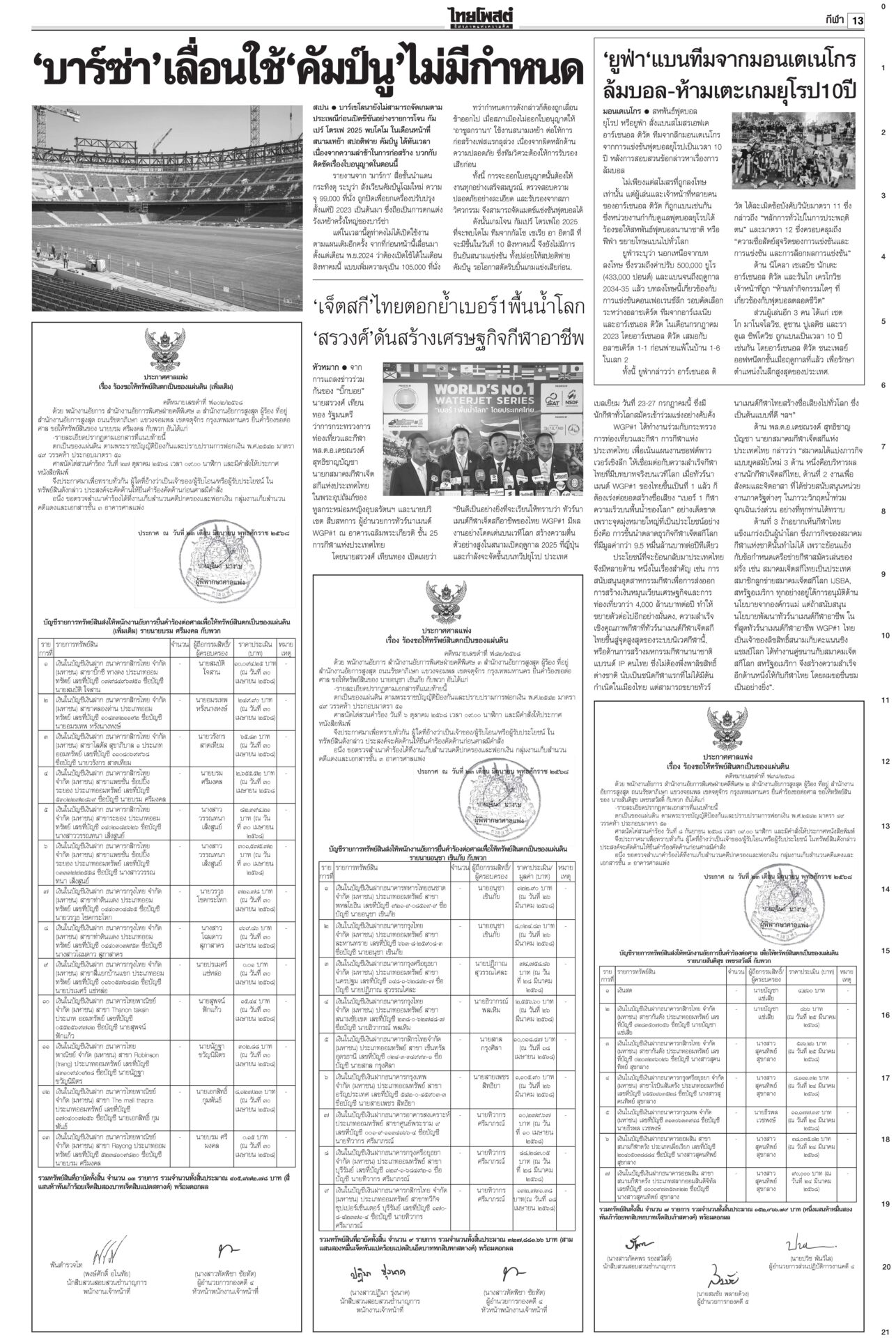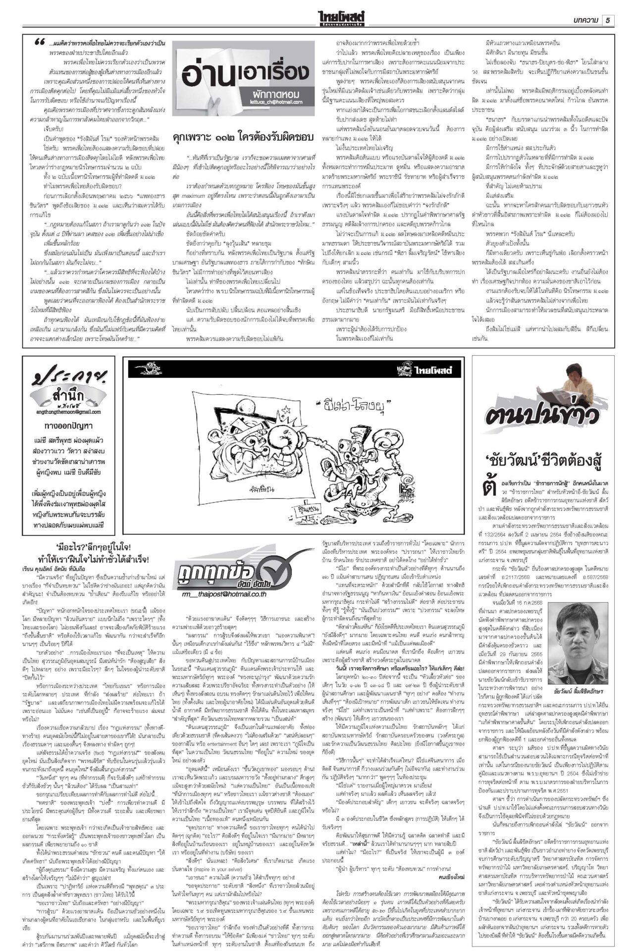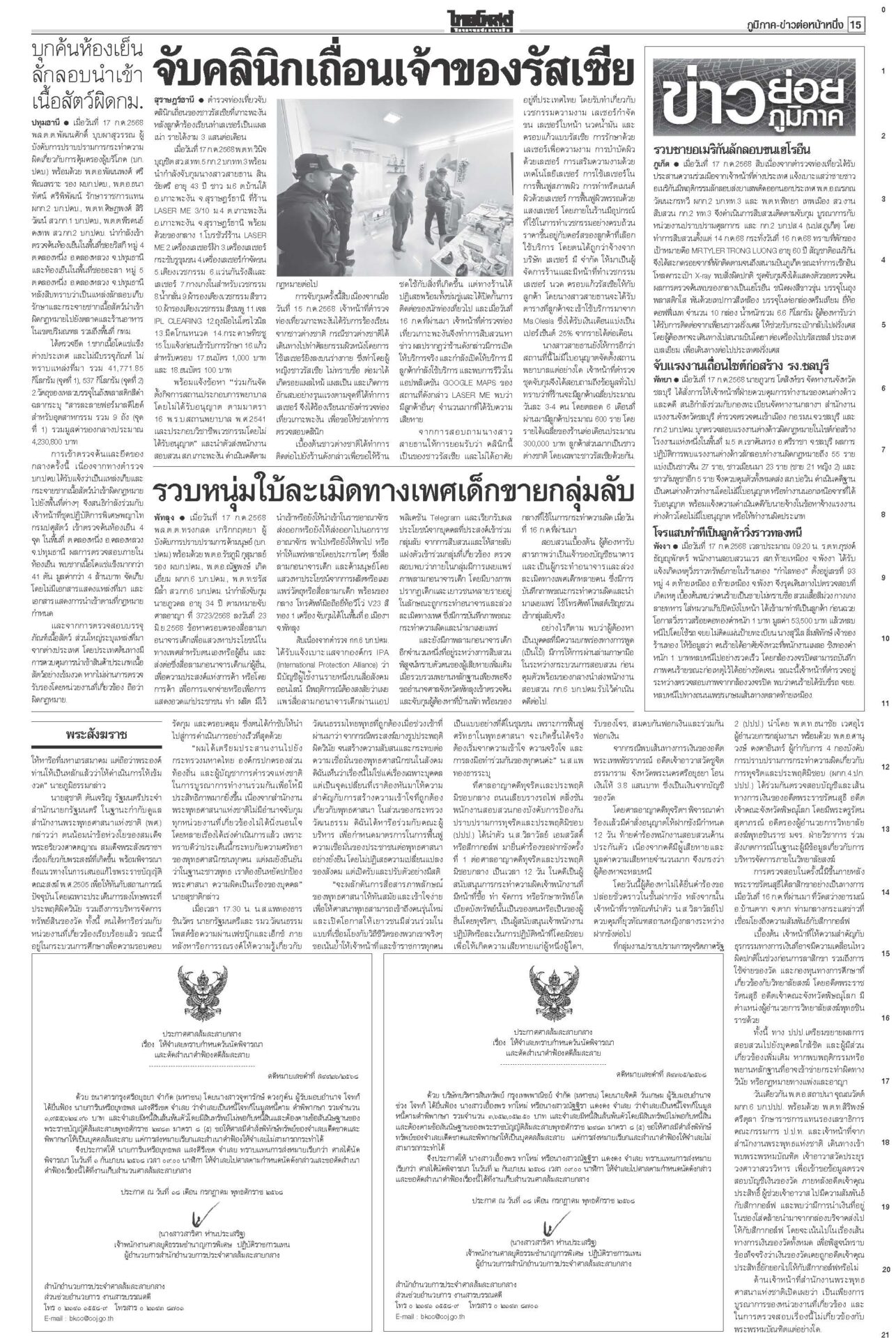 หนังสือพิมพ์ ฉบับวันที่ 18 กรกฎาคม 2568ข่าวหน้าหนึ่งเขมรวางระเบิดใหม่ ทหารไทยเจ็บ3ละเมิด‘อนุสัญญาออตตาวา’กห.จ่อประท้วง“มทภ.2” สั่งดูแลสิทธิ-สวัสดิการ ปูนบำเหน็จทหารเหยียบกับระเบิดข้อเท้าขาด เลื่อนยศ “สิบเอก” รับบำนาญ-เงินช่วยเหลือกว่าล้านบาท แม้วตัดงบกองทัพ ขุดคลองถมทะเล“ทักษิณ” ควง “นายกฯ อิ๊งค์” ออกงานเสวนา โชว์ไอเดียพลิกเกม ศก.สู่อนาคต พระสังฆราชรับสั่งสังคายนากม.สงฆ์“ภูมิธรรม” เผย “สมเด็จพระสังฆราช” รับสั่งสังคายนากฎหมายสงฆ์ ม.144เริ่มบรรเลง ศาลนัดฟันพิเชษฐ์ แปรงบ69ลงพื้นที่“พิเชษฐ์-รอง ปธ.สภาฯ” ระทึก! ศาล รธน.นัดชี้ชะตา 1 ส.ค. ปมแปรงบฯ 69 ปชน.แค้น!ไม่นิรโทษคดี112 คปท.โต้พรรคส้มยุทะลุธง“พรรคส้ม” โวย พท.คว่ำร่างนิรโทษกรรมภาค ปชช. “เท้ง” ซัดยกมติพรรคร่วมฯ