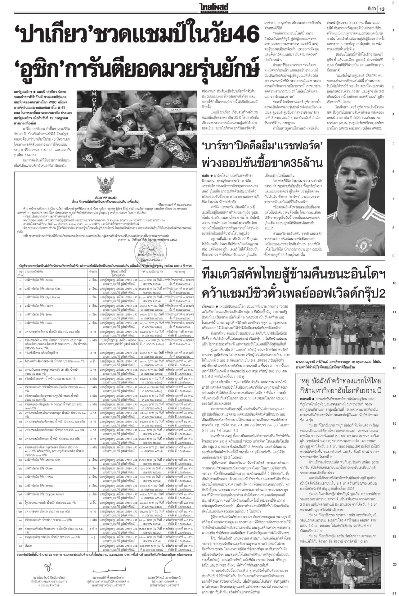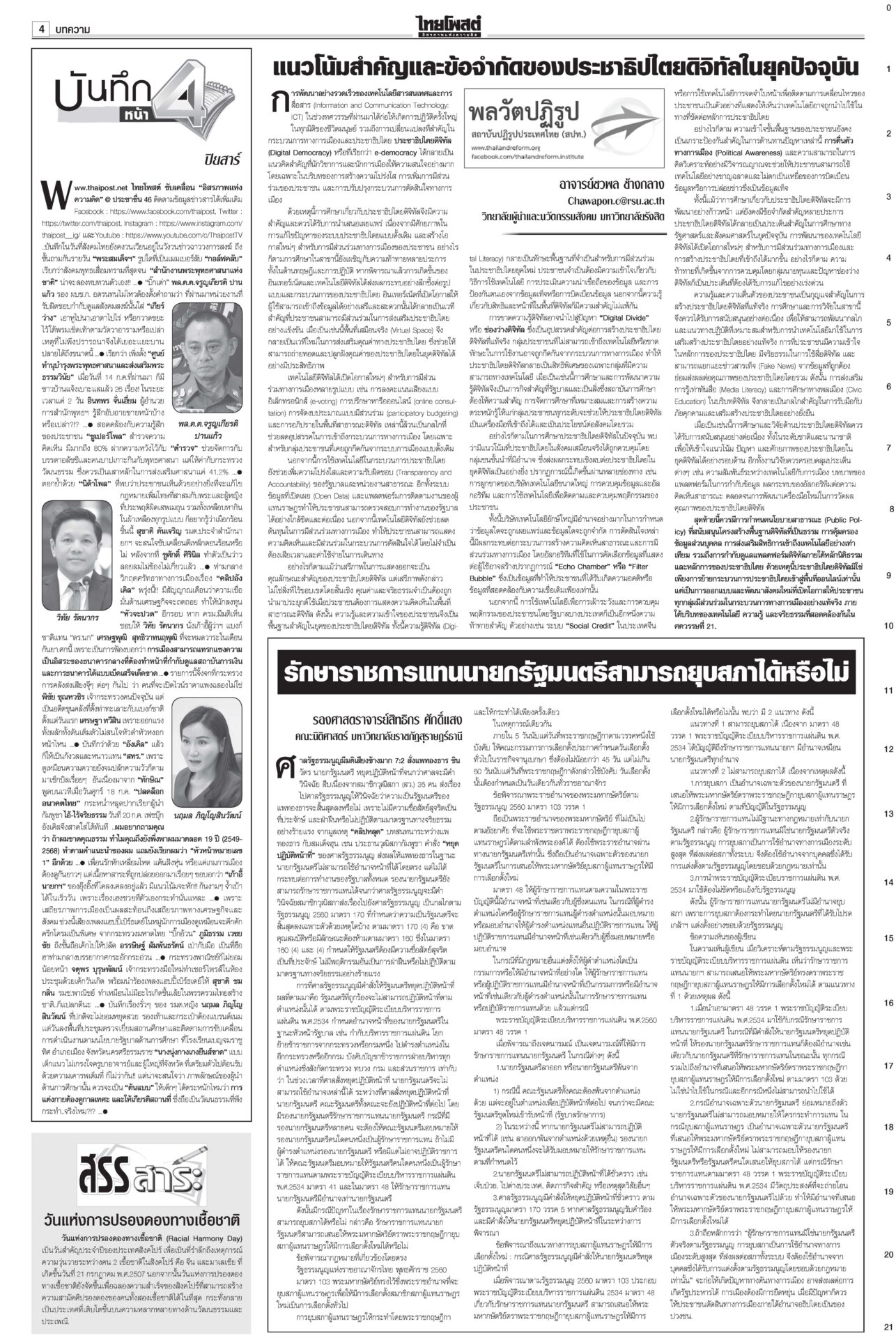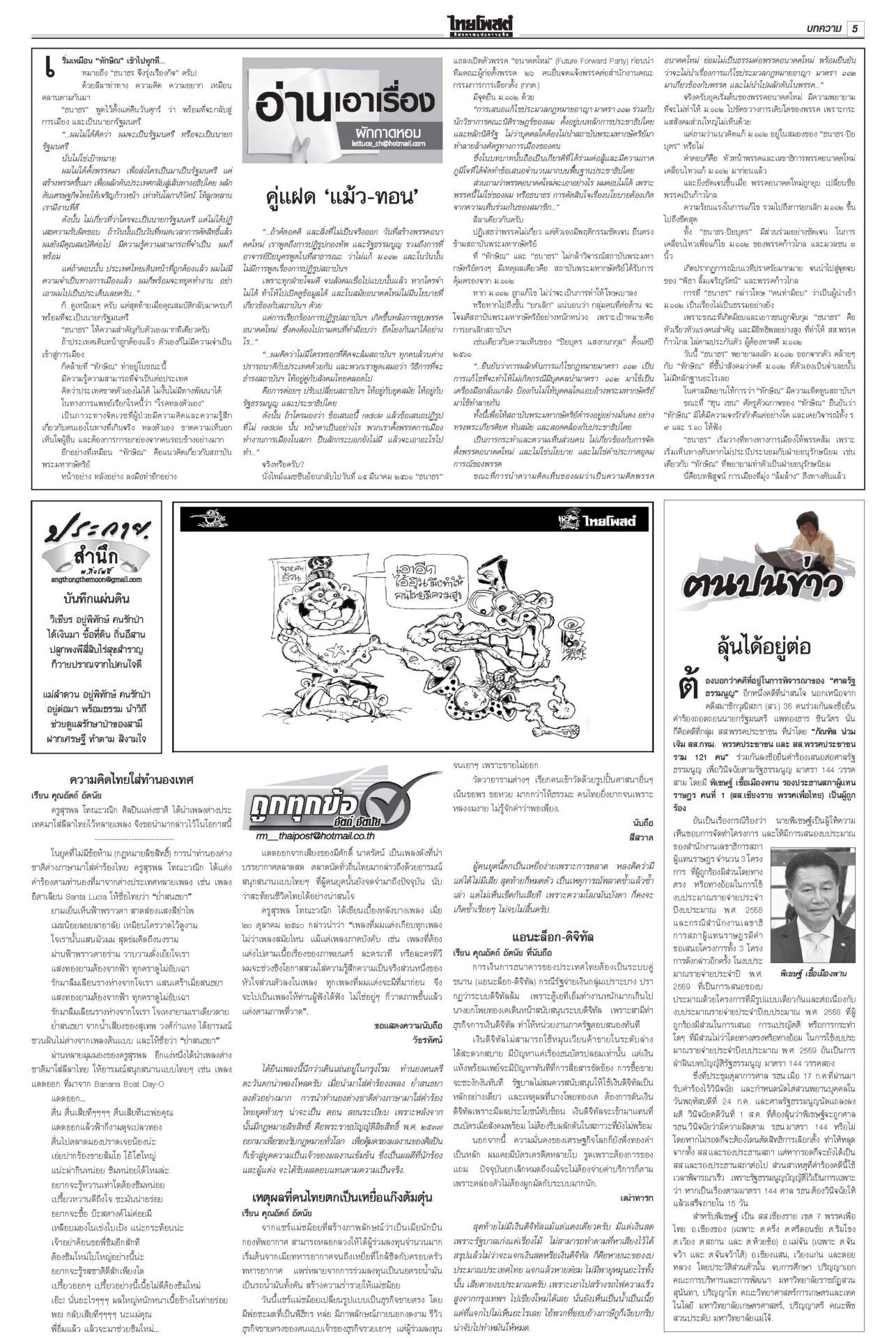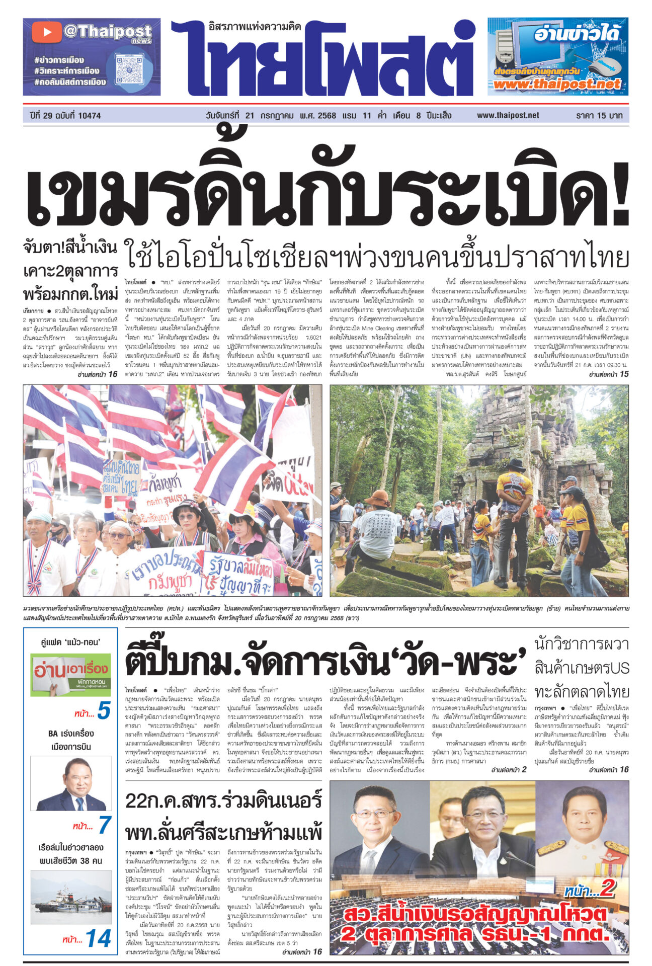 หนังสือพิมพ์ ฉบับวันที่ 21 กรกฎาคม 2568ข่าวหน้าหนึ่งเขมรดิ้นกับระเบิด! ใช้ไอโอปั่นโซเชียลฯพ่วงขนคนขึ้นปราสาทไทย“ทบ.” ส่งทหารช่างเคลียร์ทุ่นระเบิดบริเวณช่องบก เก็บหลักฐานเพิ่มส่ง กต.ทำหนังสือถึงยูเอ็น พร้อมตอบโต้ทางทหารอย่างเหมาะสม ตีปี๊บกม.จัดการเงิน‘วัด-พระ’“เพื่อไทย” เดินหน้าร่างกฎหมายจัดการเงินวัดและพระ พร้อมเปิดประชาชนร่วมแสดงความเห็น “กมธ.ศาสนา” 22ก.ค.สทร.ร่วมดินเนอร์ พท.ลั่นศรีสะเกษห้ามแพ้“วิสุทธิ์” ปูด “ทักษิณ” จะมาร่วมดินเนอร์กับพรรคร่วมรัฐบาล 22 ก.ค. จับตา!สีนํ้าเงิน เคาะ2ตุลาการ พร้อมกกต.ใหม่สว.สีน้ำเงินรอสัญญาณโหวต 2 ตุลาการศาล รธน.อังคารนี้ “อาจารย์มหิดล” ลุ้นผ่านหรือโดนตีตก หลังกรอกประวัติเป็นคณะที่ปรึกษาฯ นักวิชาการผวา สินค้าเกษตรUS ทะลักตลาดไทย“เพื่อไทย” ตีปี๊บไทยได้เรตภาษีสหรัฐต่ำกว่าเกณฑ์เฉลี่ยภูมิภาคแน่