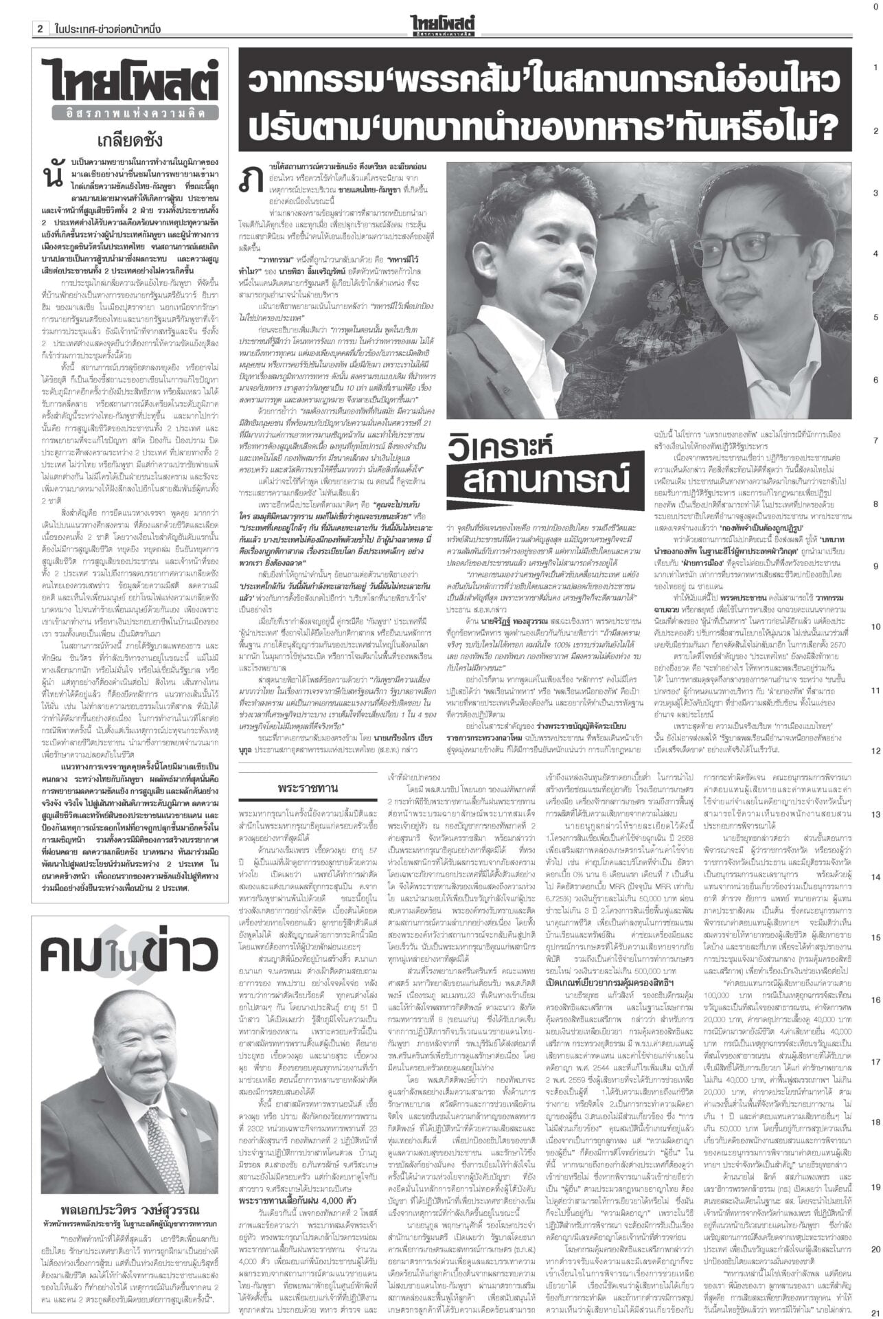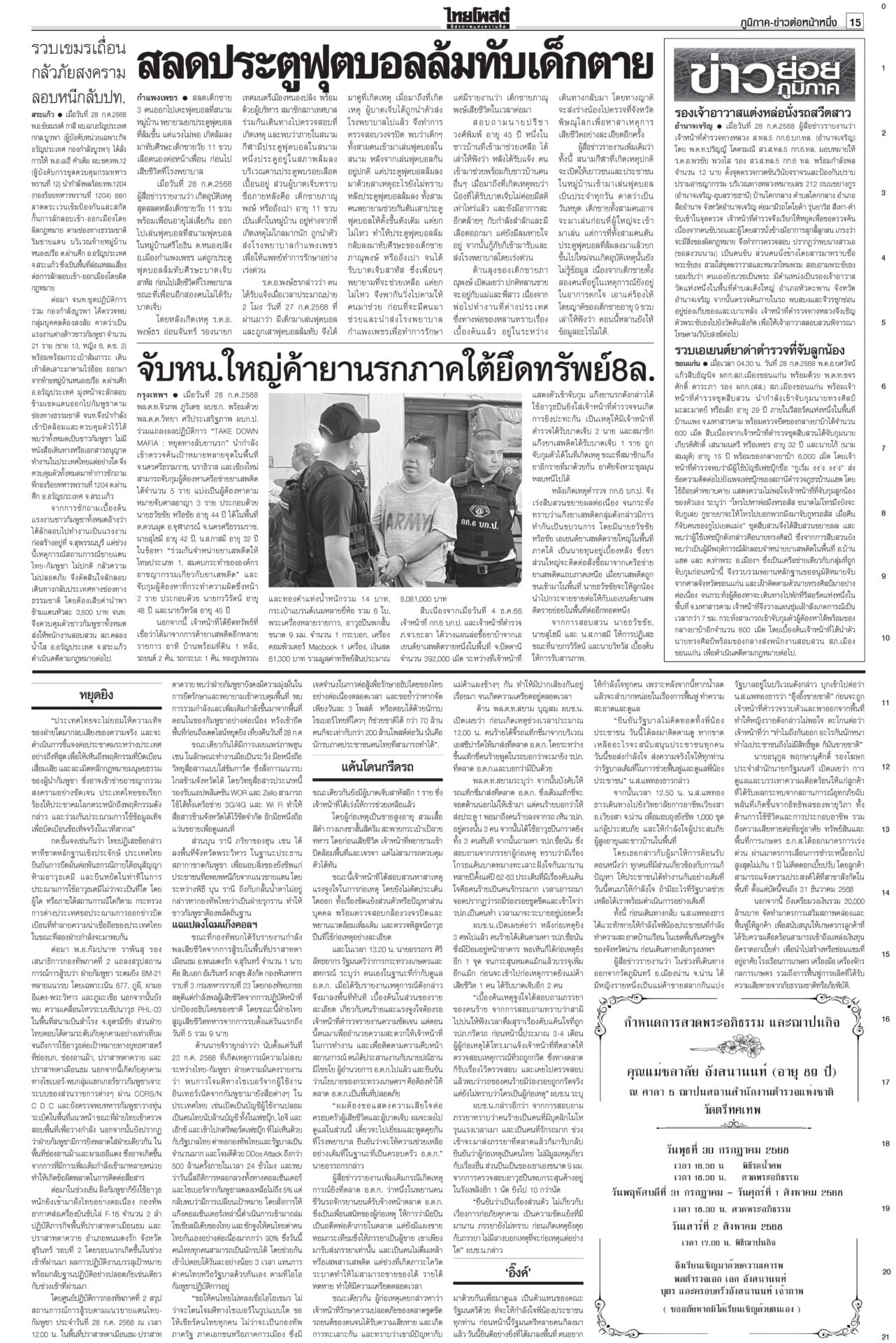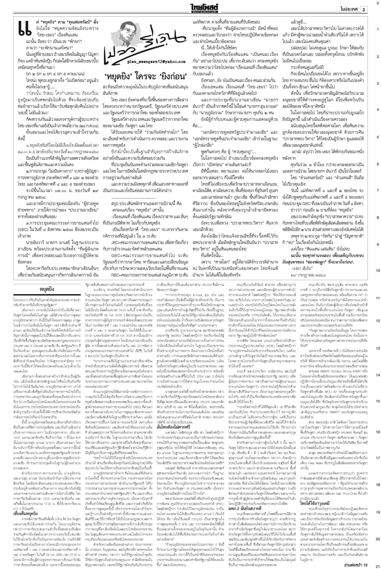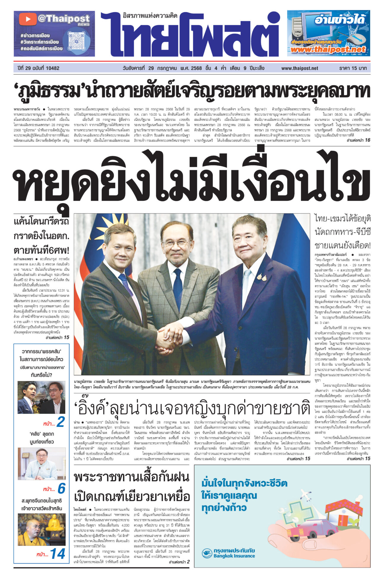 หนังสือพิมพ์ ฉบับวันที่ 29 กรกฎาคม 2568ข่าวหน้าหนึ่งหยุดยิงไม่มีเงื่อนไข ไทย-เขมรได้ข้อยุติ นัดถกทหาร-จีบีซี ชายแดนยังเดือด!ผลเจรจา “ไทย-กัมพูชา” ที่มาเลเซีย ตกลง 3 ข้อ “หยุดยิงเที่ยงคืน 28 ก.ค. – 29 ก.ค.ทหารสองฝ่ายหารือ – 4 ส.ค.ประชุมจีบีซี” เ ‘ภูมิธรรม’นำถวายสัตย์เจริญรอยตามพระยุคลบาท ในหลวงพระราชทานพระบรมราชานุญาต รัฐบาลงดจัดงานสโมสรสันนิบาตเฉลิมพระเกียรติ ‘อิ๊งค์’ลุยน่านเจอหญิงบุกด่าขายชาติ“แพทองธาร” บินไปน่าน ติดตามผลกระทบผู้ประสบภัยพายุวิภา พระราชทานเสื้อกันฝน เปิดเกณฑ์เยียวยาเหยื่อในหลวงพระราชทานแจกันดอกไม้และกระเช้าของเยี่ยมแก่ “ทหารพรานปราบ” แค้นโดนกรีดรถ กราดยิงในอตก. ตายทันที6ศพ!สะเทือนกรุง! กราดยิงกลางตลาด อ.ต.ก.ดับ 6 ศพรวด ก่อนยิงตัวตาย “ผบช.น.”