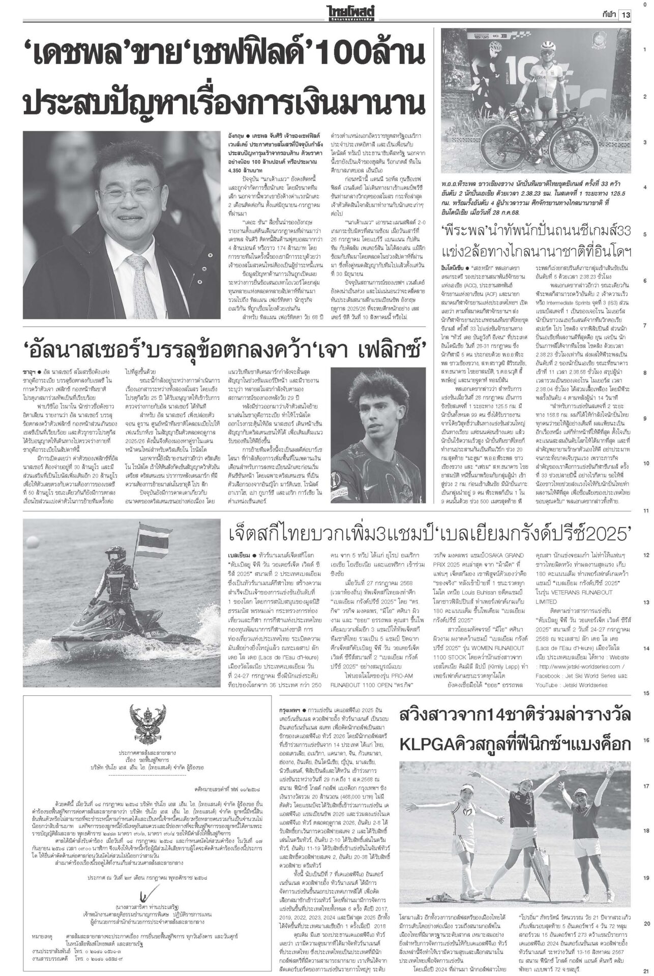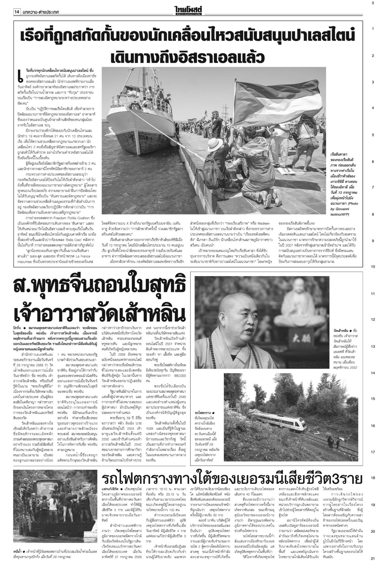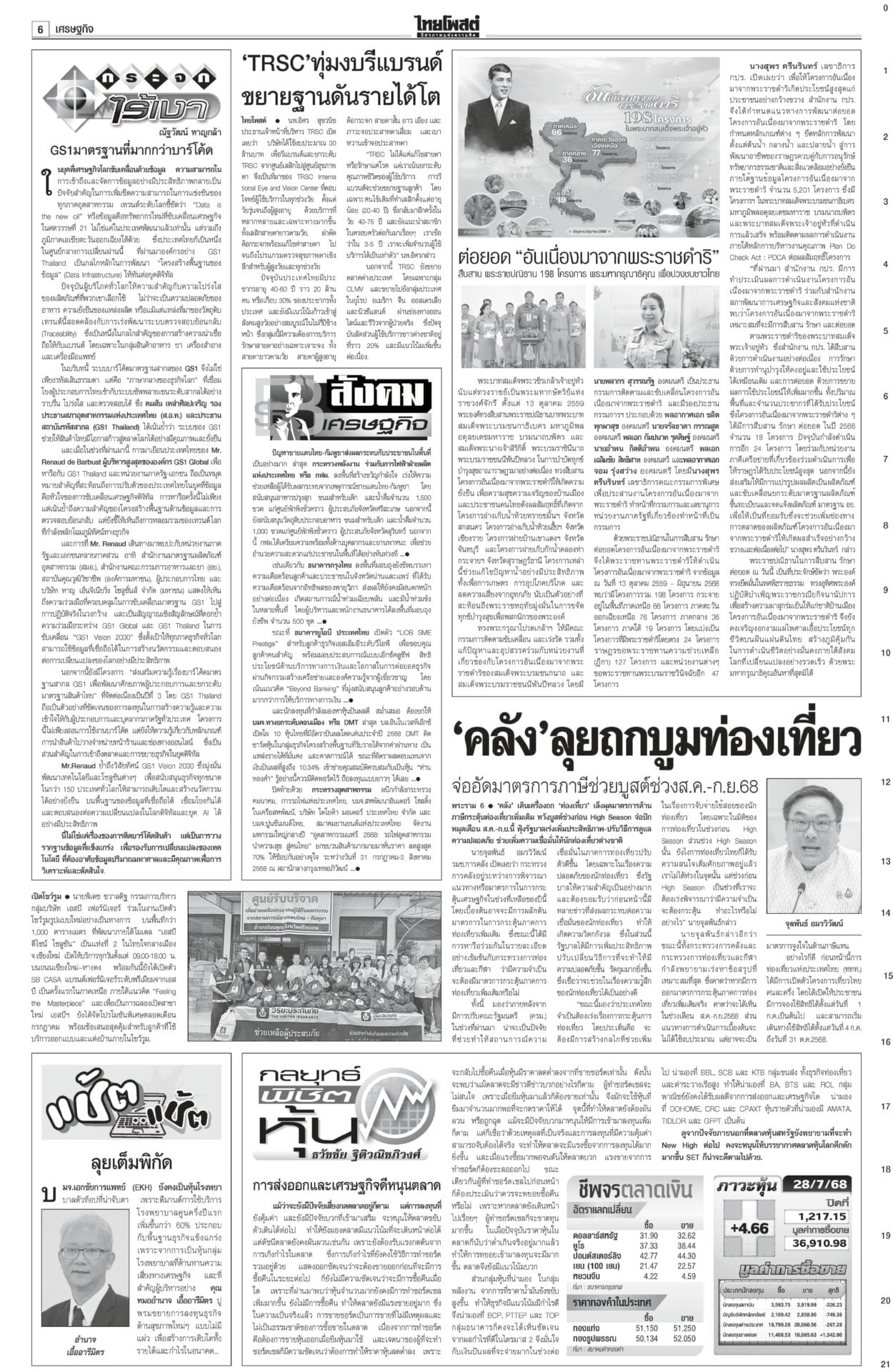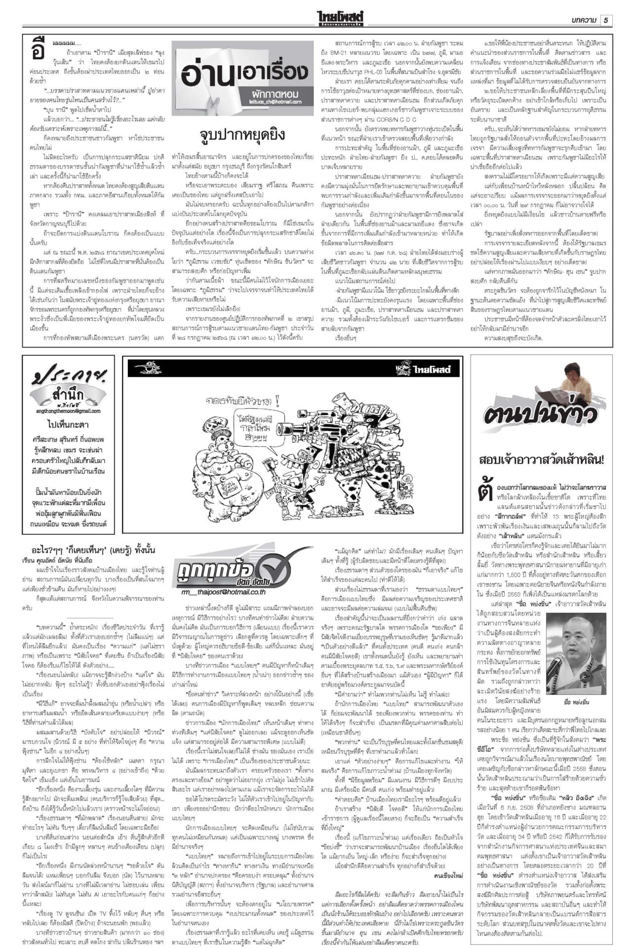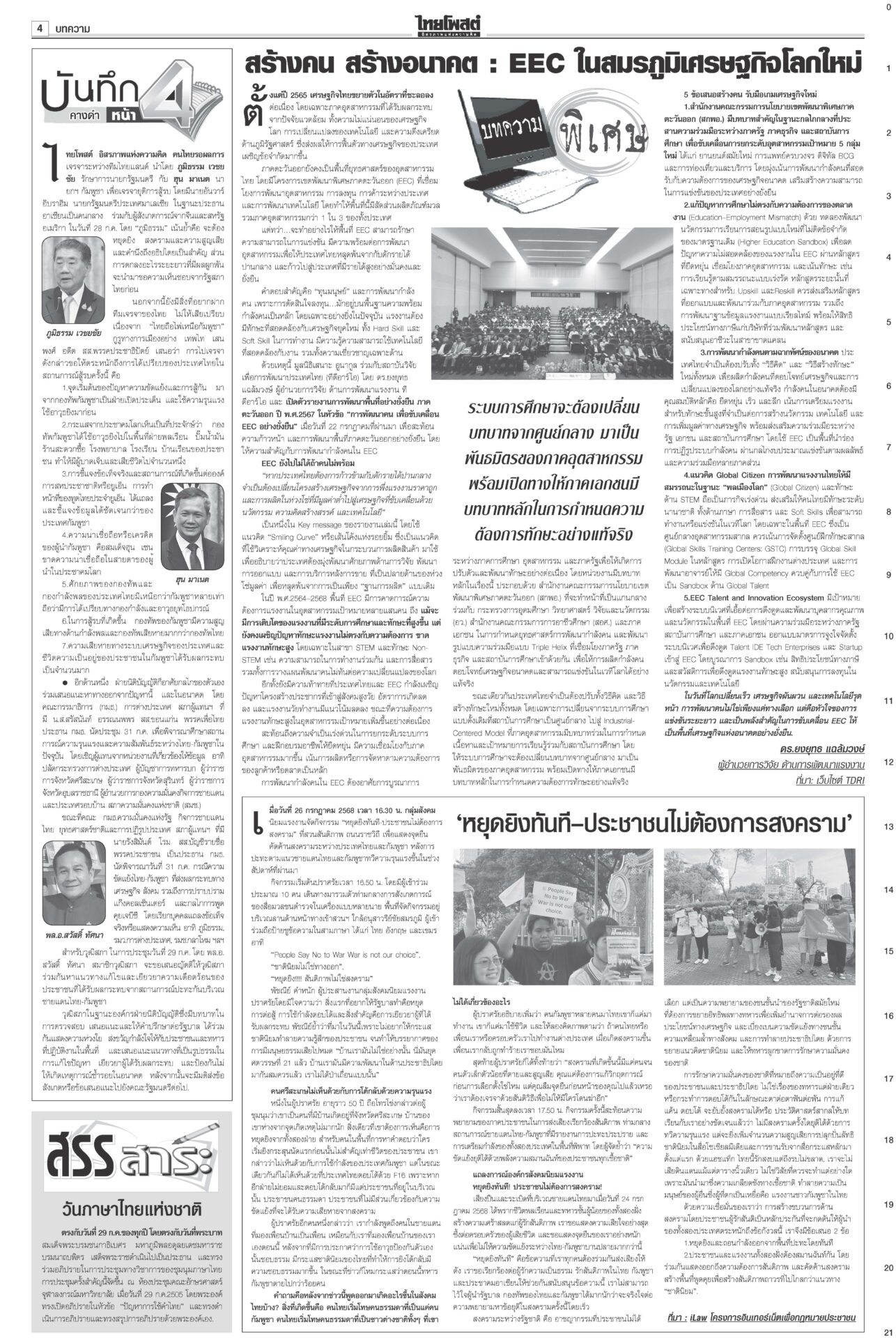 หนังสือพิมพ์ ฉบับวันที่ 29 กรกฎาคม 2568ข่าวหน้าหนึ่งหยุดยิงไม่มีเงื่อนไข ไทย-เขมรได้ข้อยุติ นัดถกทหาร-จีบีซี ชายแดนยังเดือด!ผลเจรจา “ไทย-กัมพูชา” ที่มาเลเซีย ตกลง 3 ข้อ “หยุดยิงเที่ยงคืน 28 ก.ค. – 29 ก.ค.ทหารสองฝ่ายหารือ – 4 ส.ค.ประชุมจีบีซี” เ ‘ภูมิธรรม’นำถวายสัตย์เจริญรอยตามพระยุคลบาท ในหลวงพระราชทานพระบรมราชานุญาต รัฐบาลงดจัดงานสโมสรสันนิบาตเฉลิมพระเกียรติ ‘อิ๊งค์’ลุยน่านเจอหญิงบุกด่าขายชาติ“แพทองธาร” บินไปน่าน ติดตามผลกระทบผู้ประสบภัยพายุวิภา พระราชทานเสื้อกันฝน เปิดเกณฑ์เยียวยาเหยื่อในหลวงพระราชทานแจกันดอกไม้และกระเช้าของเยี่ยมแก่ “ทหารพรานปราบ” แค้นโดนกรีดรถ กราดยิงในอตก. ตายทันที6ศพ!สะเทือนกรุง! กราดยิงกลางตลาด อ.ต.ก.ดับ 6 ศพรวด ก่อนยิงตัวตาย “ผบช.น.”