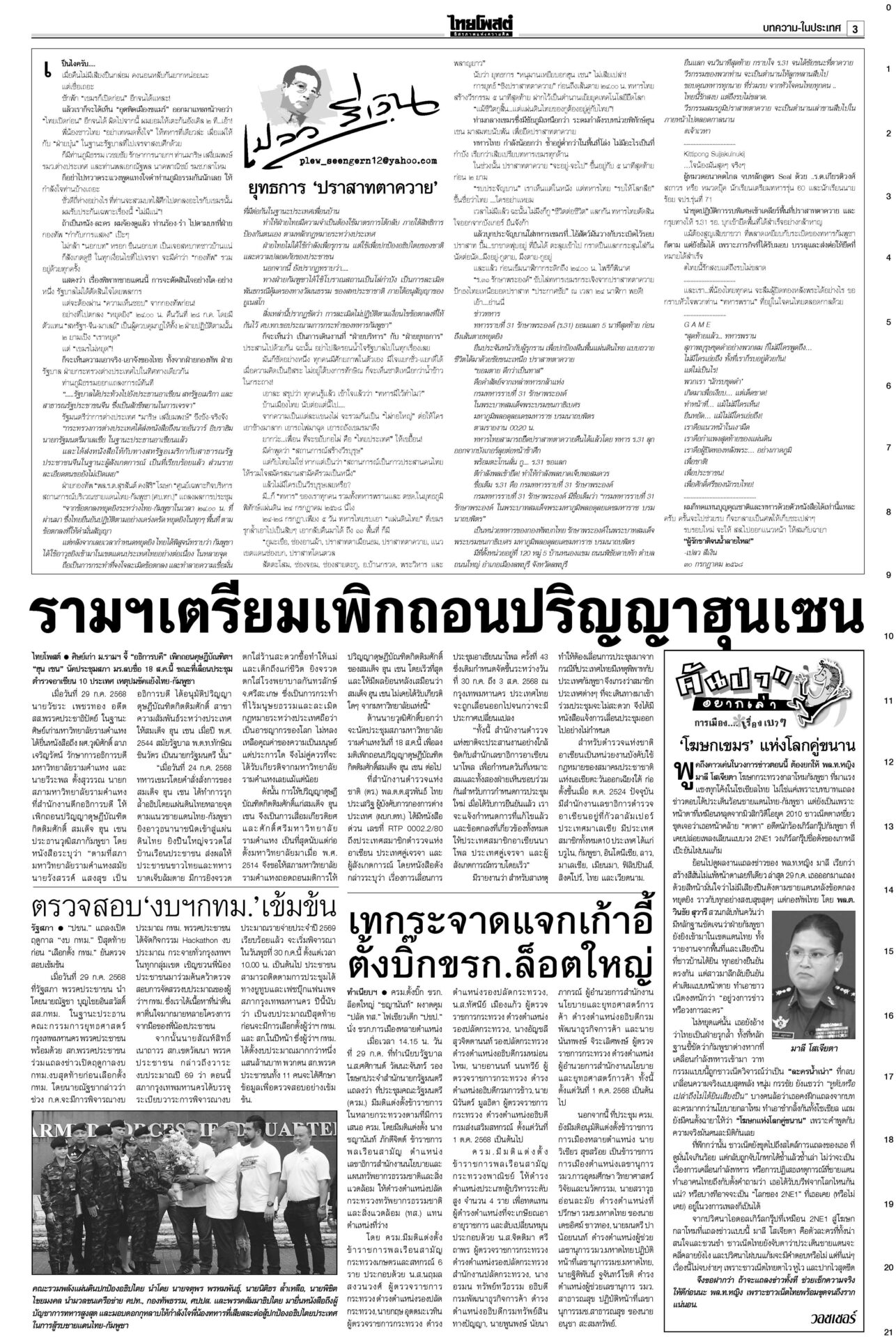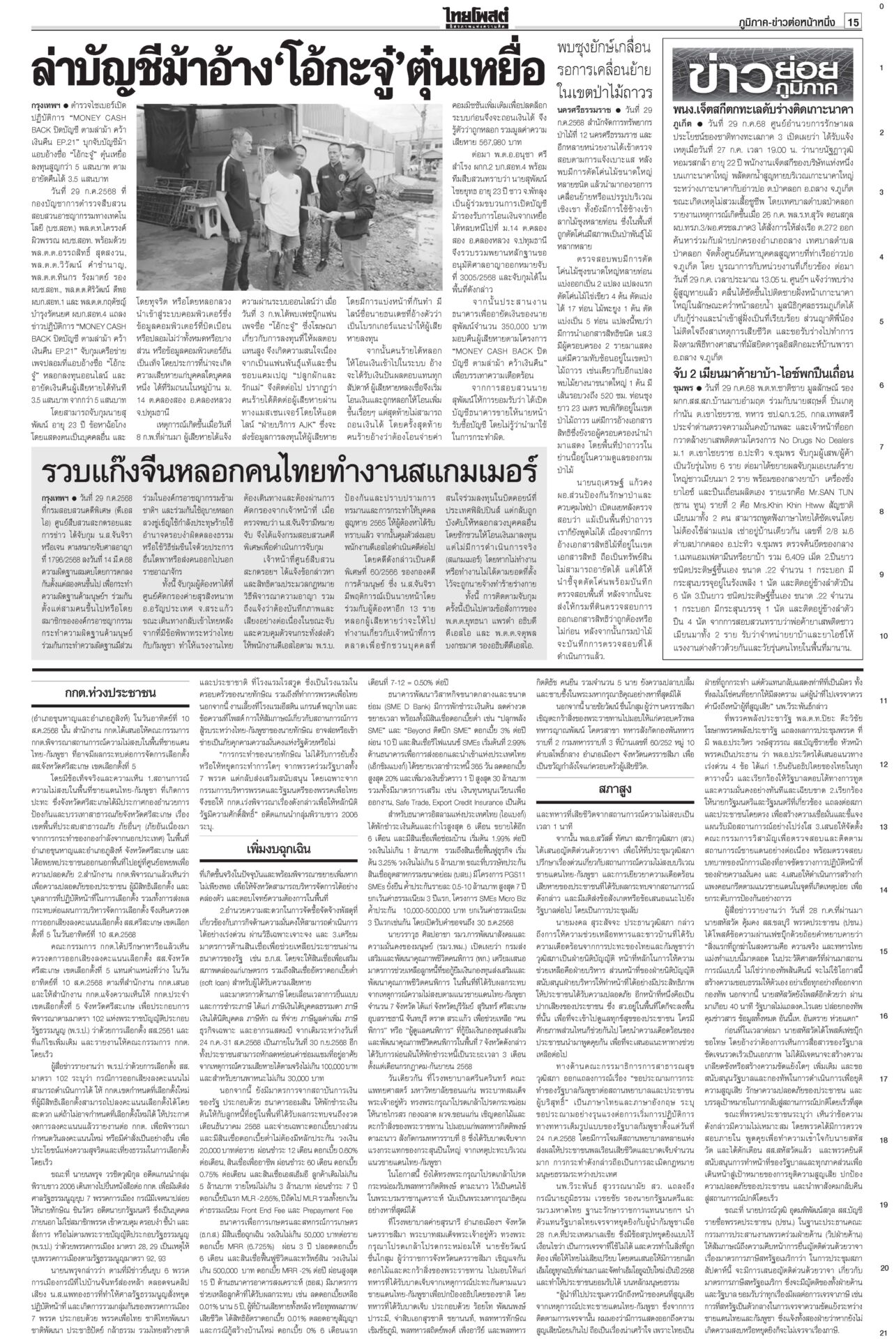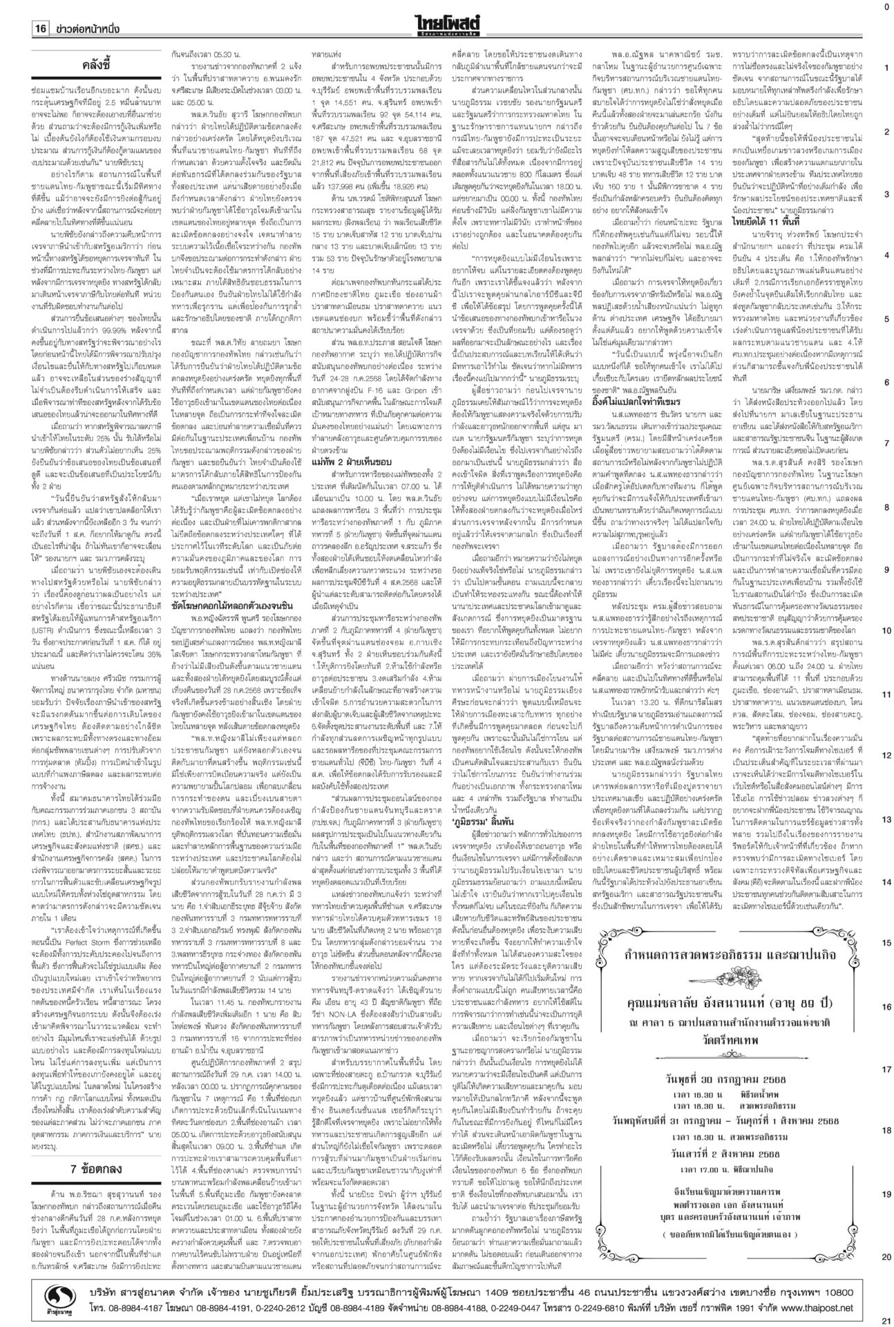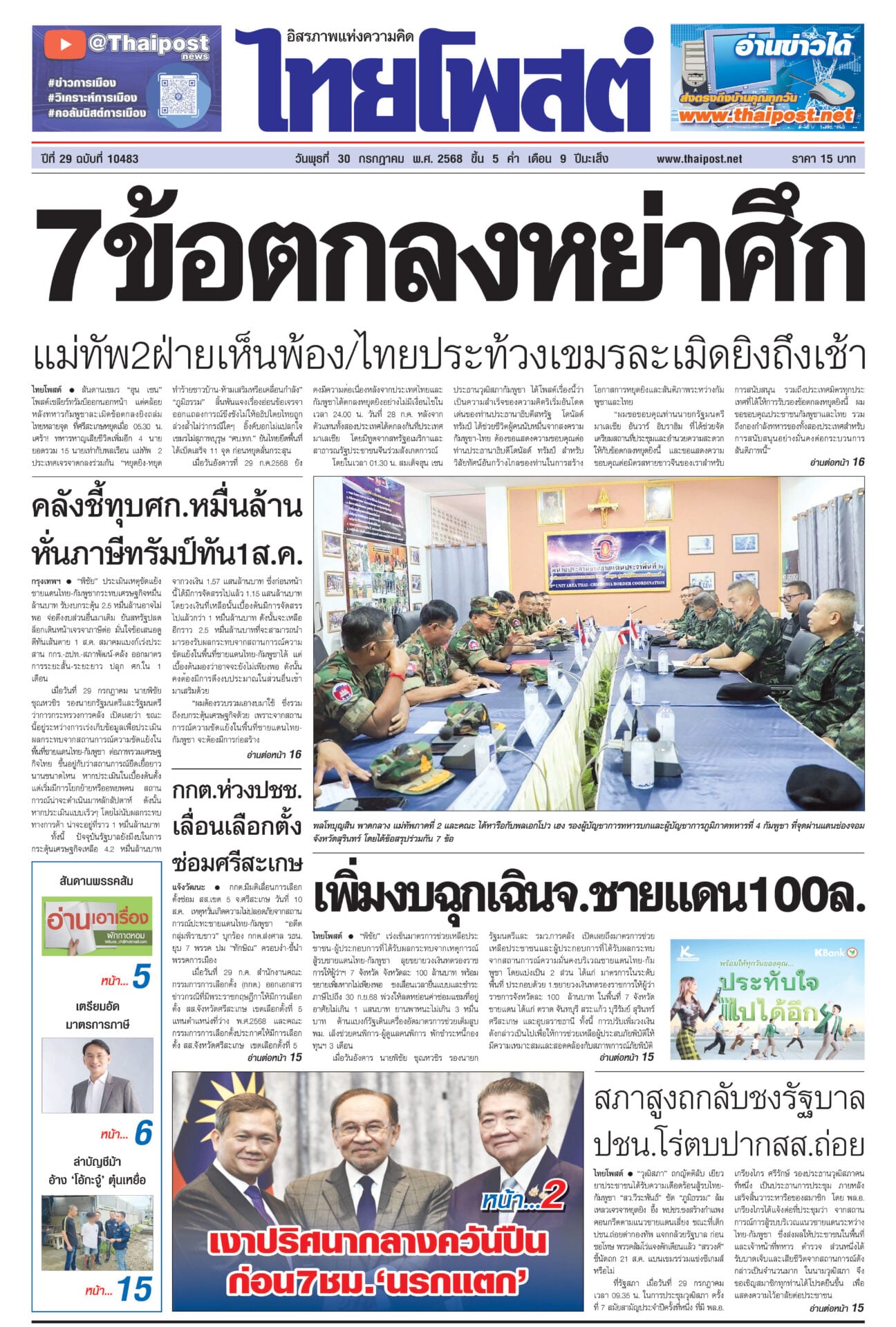 หนังสือพิมพ์ ฉบับวันที่ 30 กรกฎาคม 2568ข่าวหน้าหนึ่ง7ข้อตกลงหย่าศึก แม่ทัพ2ฝ่ายเห็นพ้อง/ไทยประท้วงเขมรละเมิดยิงถึงเช้าสันดานเขมร “ฮุน เซน” โพสต์เชลียร์ทรัมป์ออกนอกหน้า แต่คล้อยหลังทหารกัมพูชาละเมิดข้อตกลงยิงถล่มไทยหลายจุด เพิ่มงบฉุกเฉินจ.ชายแดน100ล.“พิชัย” เร่งเข็นมาตรการช่วยเหลือประชาชน-ผู้ประกอบการที่ได้รับผลกระทบจากเหตุการณ์สู้รบชายแดนไทย-กัมพูชา สภาสูงถกลับชงรัฐบาล ปชน.โร่ตบปากสส.ถ่อย“วุฒิสภา” ถกญัตติลับ เยียวยาประชาชนได้รับความเดือดร้อนสู้รบไทย-กัมพูชา กกต.ห่วงปชช. เลื่อนเลือกตั้ง ซ่อมศรีสะเกษกกต.มีมติเลื่อนการเลือกตั้งซ่อม สส.เขต 5 จ.ศรีสะเกษ วันที่ 10 ส.ค. คลังชี้ทุบศก.หมื่นล้าน หั่นภาษีทรัมป์ทัน1ส.ค.“พิชัย” ประเมินเหตุขัดแย้งชายแดนไทย-กัมพูชากระทบเศรษฐกิจหมื่นล้านบาท