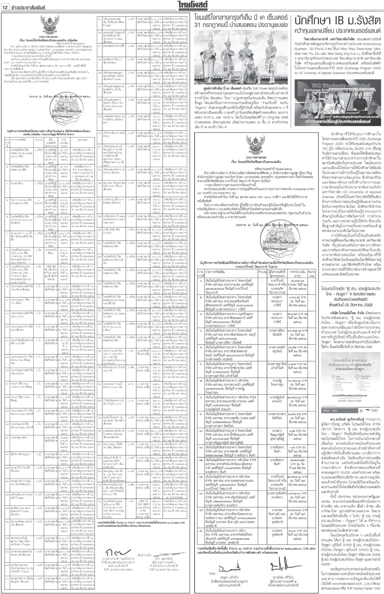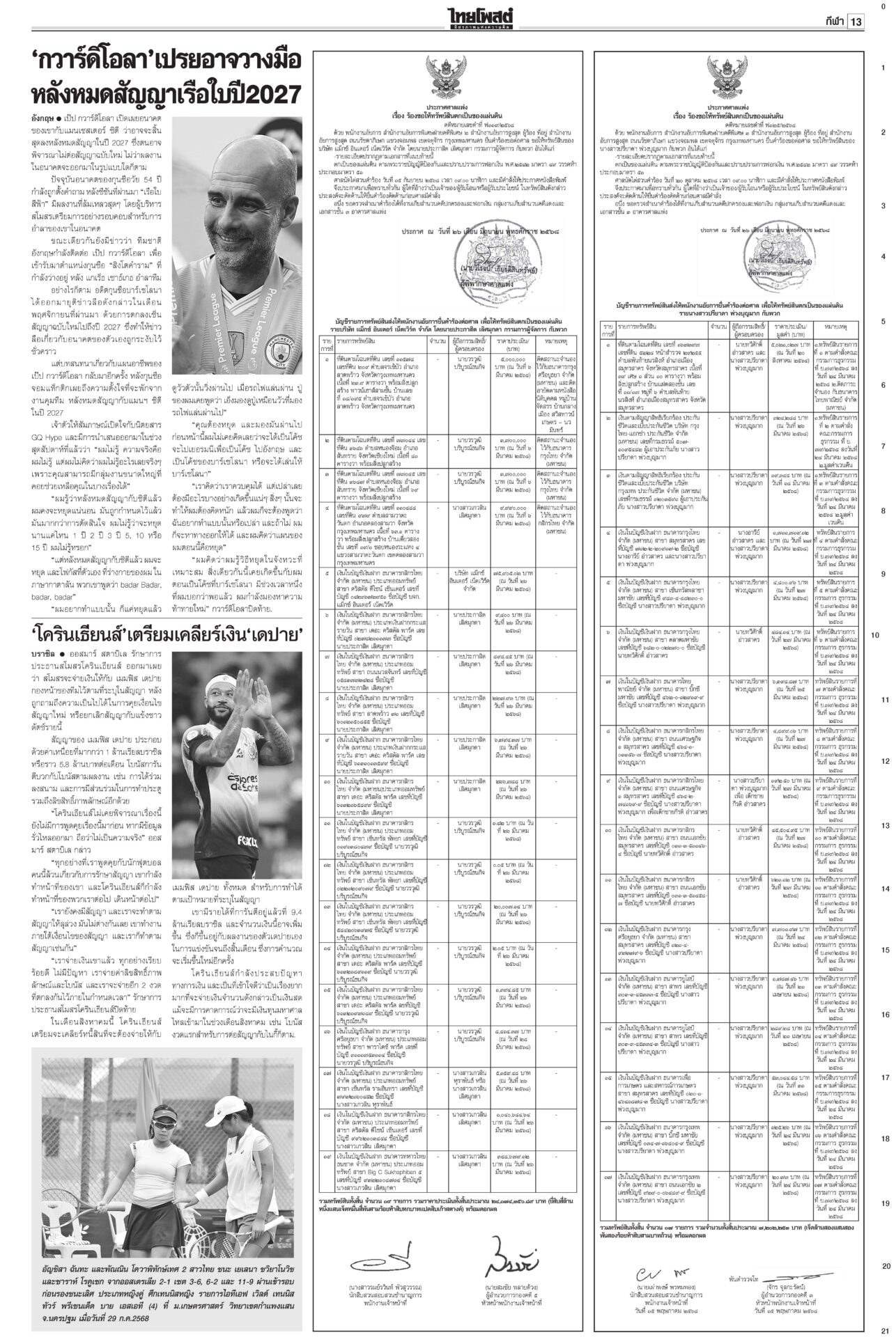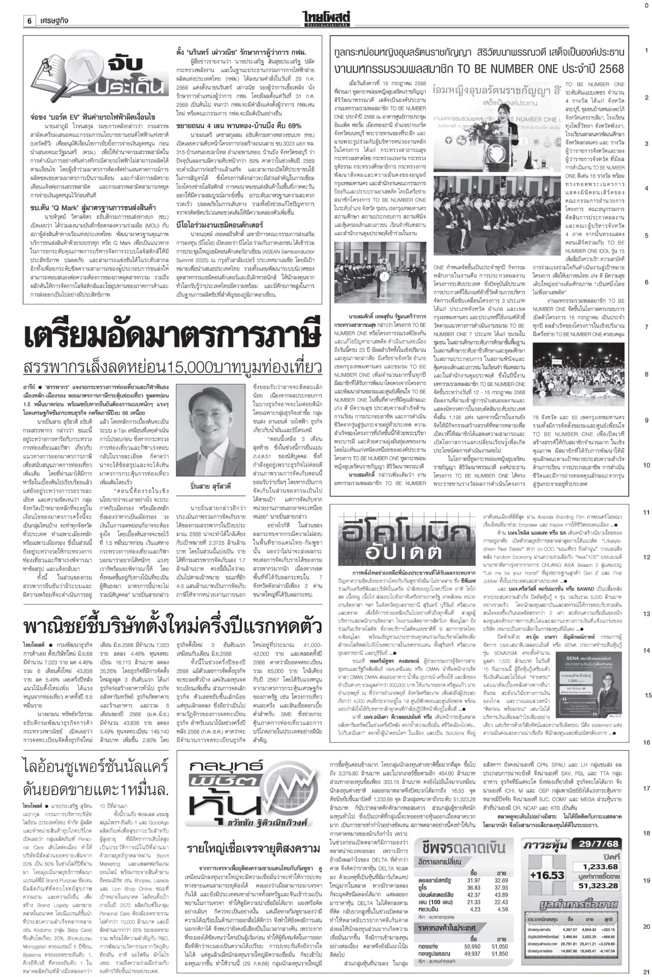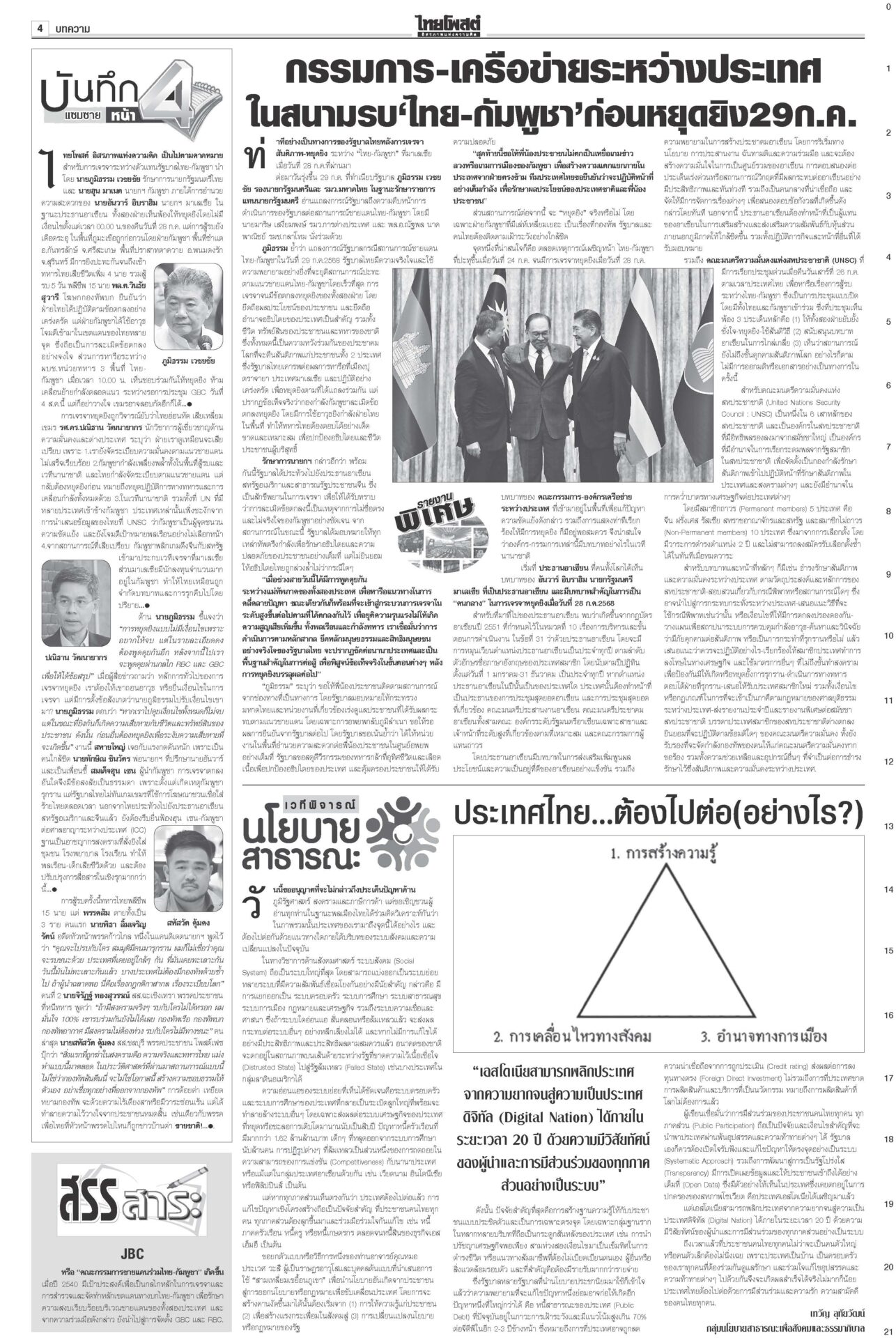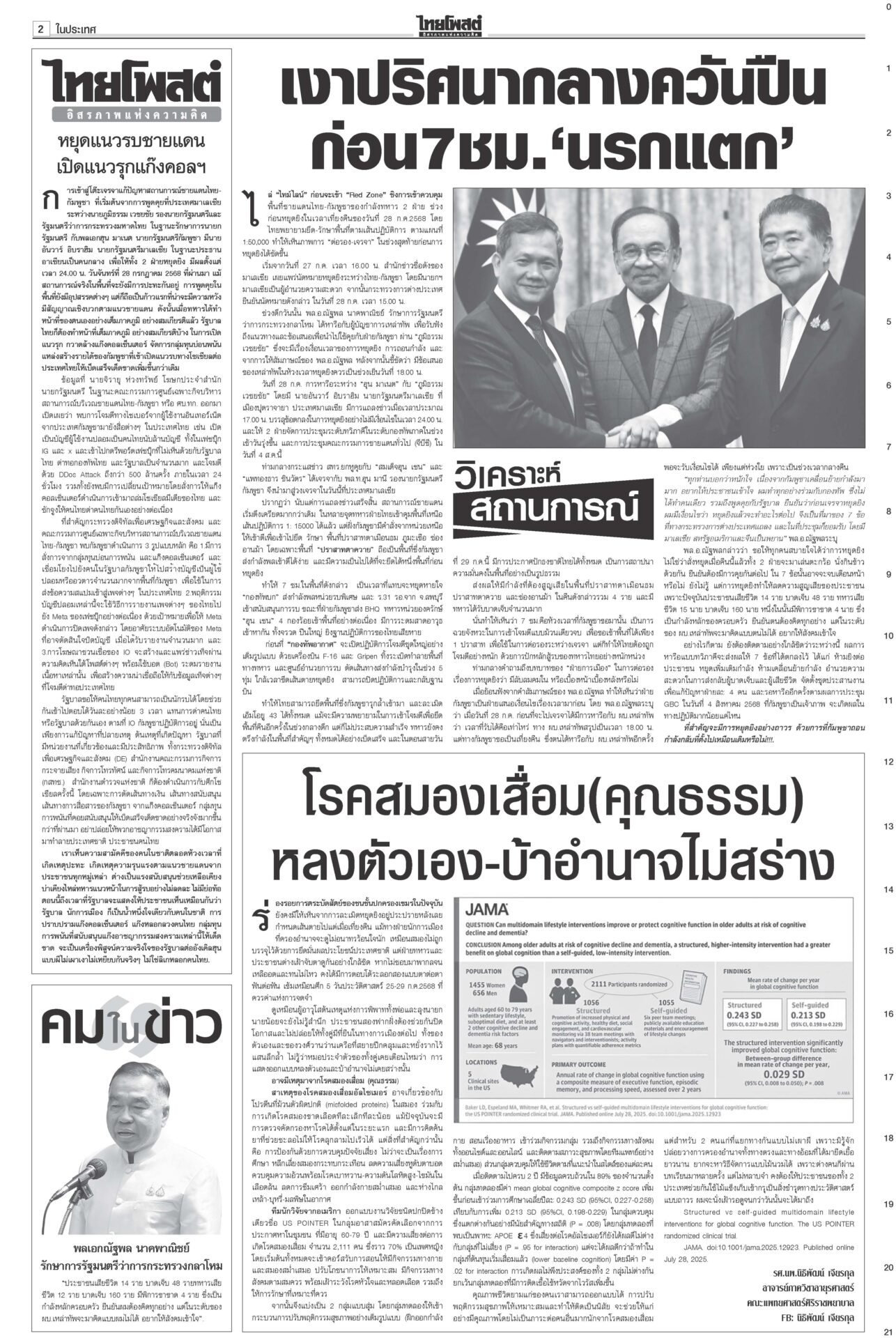 หนังสือพิมพ์ ฉบับวันที่ 30 กรกฎาคม 2568ข่าวหน้าหนึ่ง7ข้อตกลงหย่าศึก แม่ทัพ2ฝ่ายเห็นพ้อง/ไทยประท้วงเขมรละเมิดยิงถึงเช้าสันดานเขมร “ฮุน เซน” โพสต์เชลียร์ทรัมป์ออกนอกหน้า แต่คล้อยหลังทหารกัมพูชาละเมิดข้อตกลงยิงถล่มไทยหลายจุด เพิ่มงบฉุกเฉินจ.ชายแดน100ล.“พิชัย” เร่งเข็นมาตรการช่วยเหลือประชาชน-ผู้ประกอบการที่ได้รับผลกระทบจากเหตุการณ์สู้รบชายแดนไทย-กัมพูชา สภาสูงถกลับชงรัฐบาล ปชน.โร่ตบปากสส.ถ่อย“วุฒิสภา” ถกญัตติลับ เยียวยาประชาชนได้รับความเดือดร้อนสู้รบไทย-กัมพูชา กกต.ห่วงปชช. เลื่อนเลือกตั้ง ซ่อมศรีสะเกษกกต.มีมติเลื่อนการเลือกตั้งซ่อม สส.เขต 5 จ.ศรีสะเกษ วันที่ 10 ส.ค. คลังชี้ทุบศก.หมื่นล้าน หั่นภาษีทรัมป์ทัน1ส.ค.“พิชัย” ประเมินเหตุขัดแย้งชายแดนไทย-กัมพูชากระทบเศรษฐกิจหมื่นล้านบาท