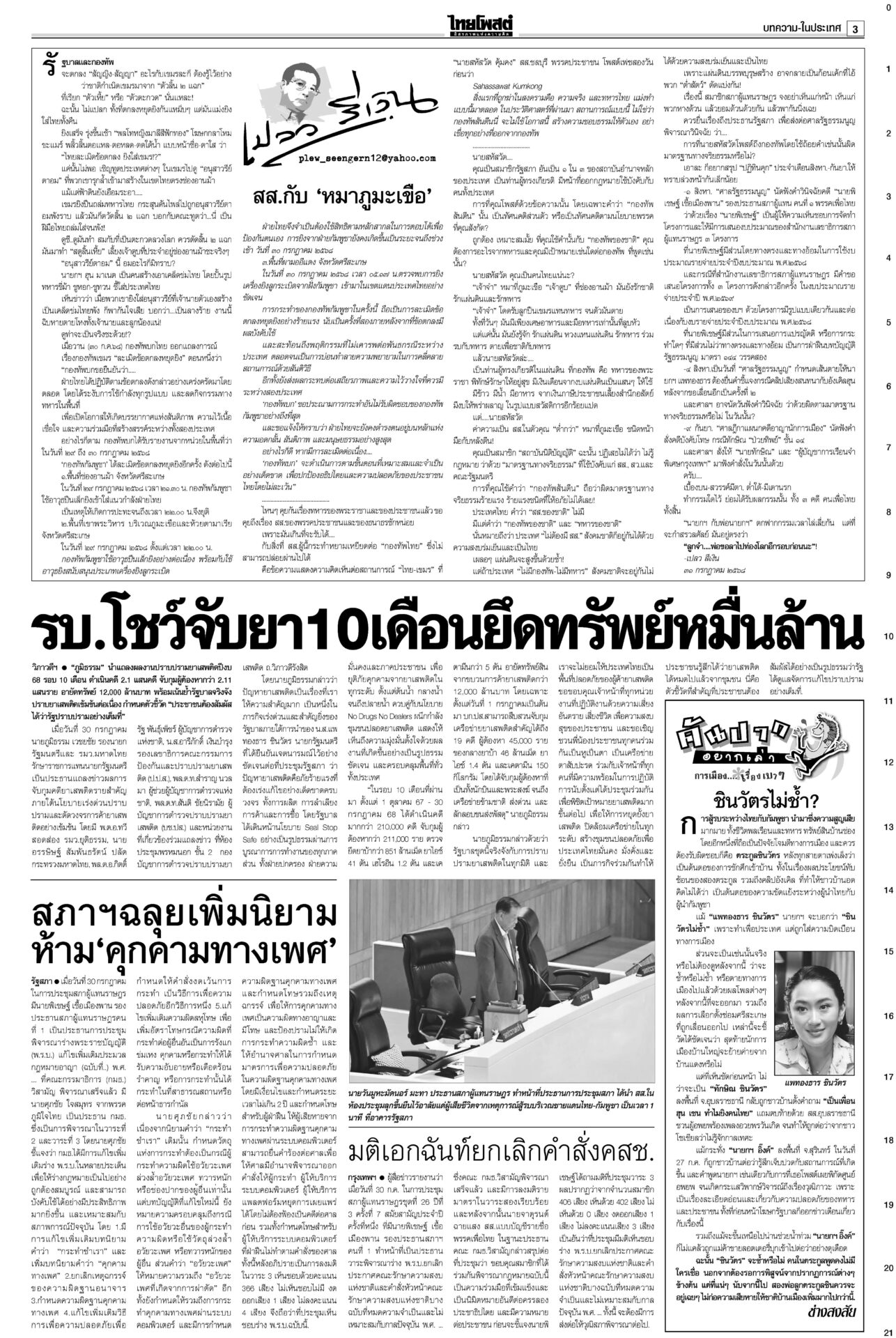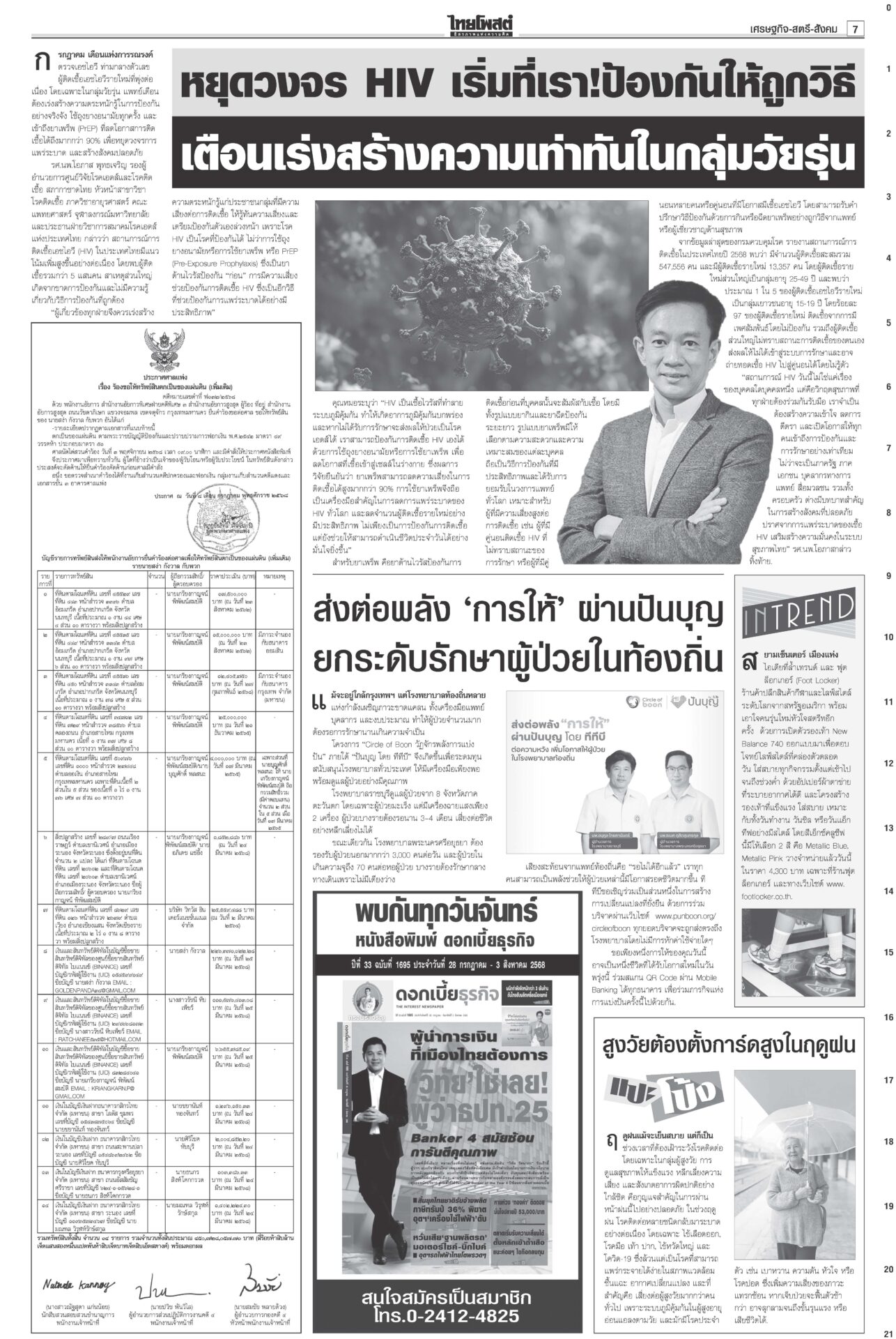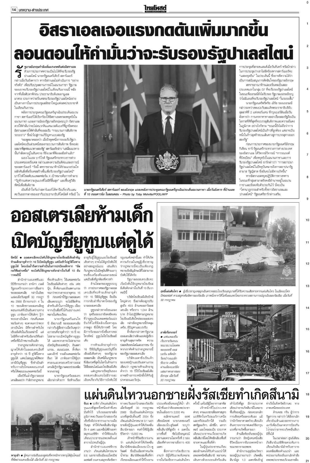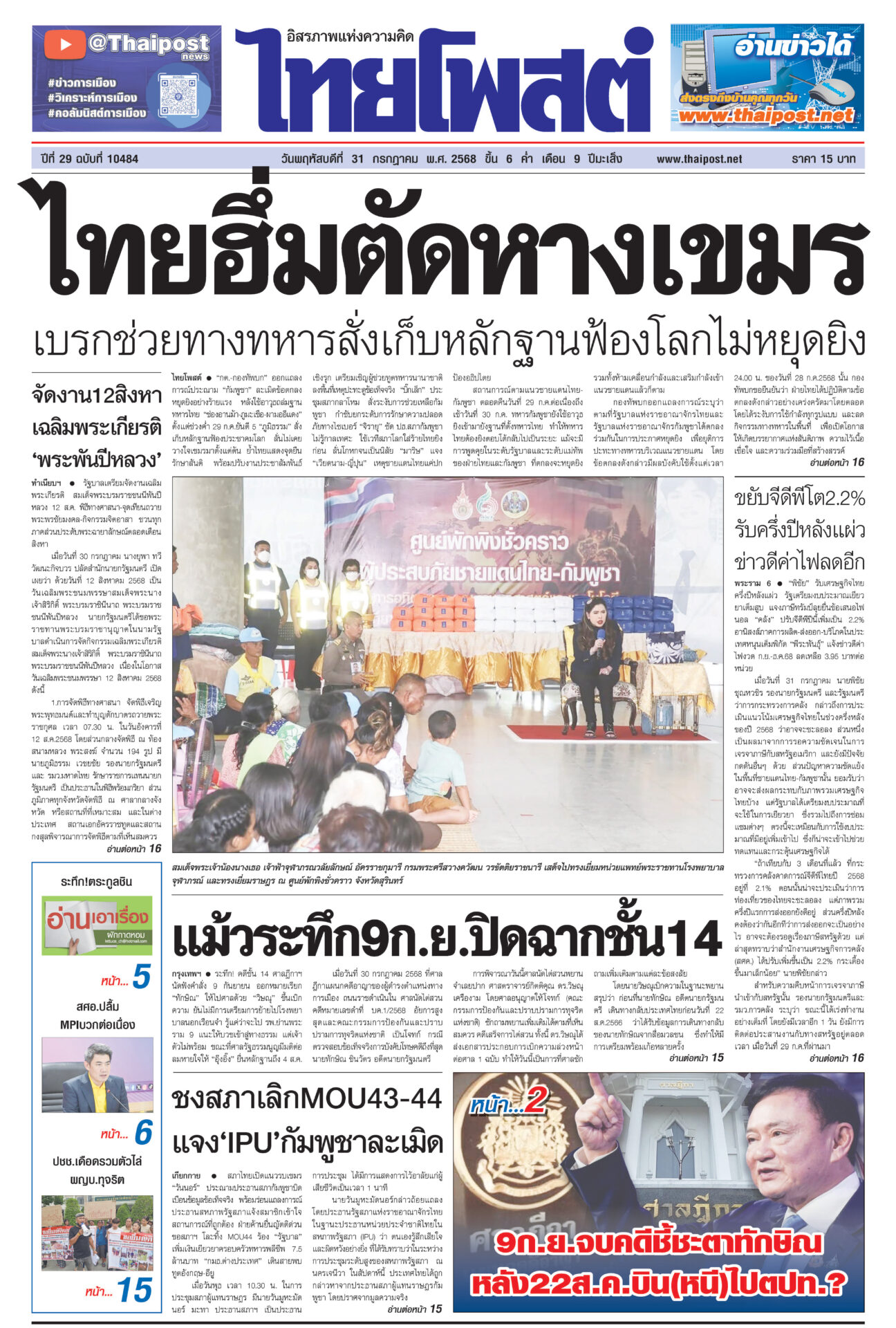 หนังสือพิมพ์ ฉบับวันที่ 31 กรกฎาคม 2568ข่าวหน้าหนึ่งไทยฮึ่มตัดหางเขมร เบรกช่วยทางทหารสั่งเก็บหลักฐานฟ้องโลกไม่หยุดยิง“กต.-กองทัพบก” ออกแถลงการณ์ประณาม “กัมพูชา” แม้วระทึก9ก.ย.ปิดฉากชั้น14ระทึก! คดีชั้น 14 ศาลฎีกาฯ นัดฟังคำสั่ง 9 กันยายน ออกหมายเรียก “ทักษิณ” ให้ไปศาลด้วย “วิษณุ” ขึ้นเบิกความ ชงสภาเลิกMOU43-44 แจง‘IPU’กัมพูชาละเมิดสภาไทยเปิดแนวรบเขมร “วันนอร์” ประณามประธานสภากัมพูชาบิดเบือนข้อมูลข้อเท็จจริง จัดงาน12สิงหา เฉลิมพระเกียรติ ‘พระพันปีหลวง’รัฐบาลเตรียมจัดงานเฉลิมพระเกียรติ สมเด็จพระบรมราชชนนีพันปีหลวง 12 ส.ค. ขยับจีดีพีโต2.2% รับครึ่งปีหลังแผ่ว ข่าวดีค่าไฟลดอีก“พิชัย” รับเศรษฐกิจไทยครึ่งปีหลังแผ่ว รัฐเตรียมงบประมาณเยียวยาเต็มสูบ