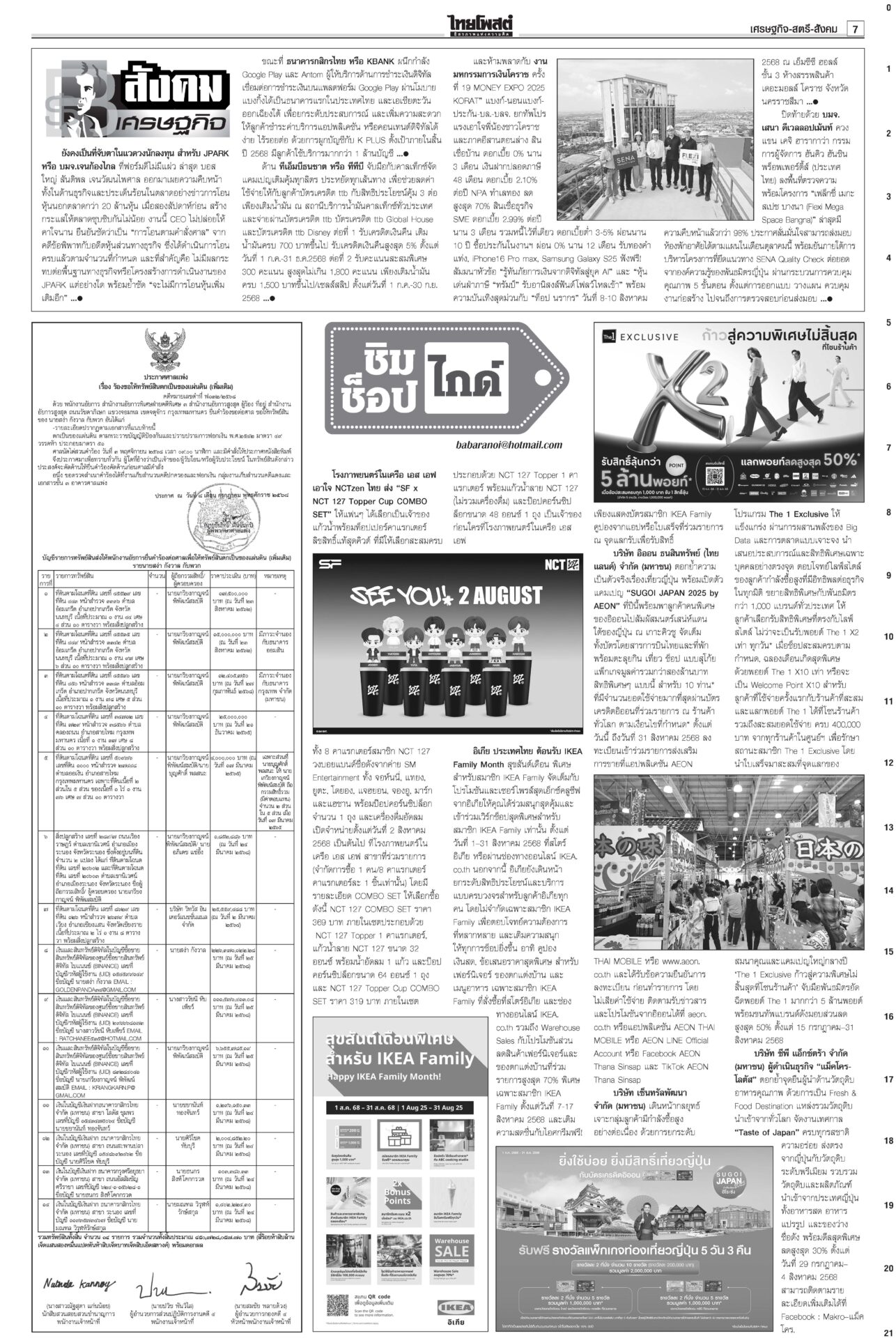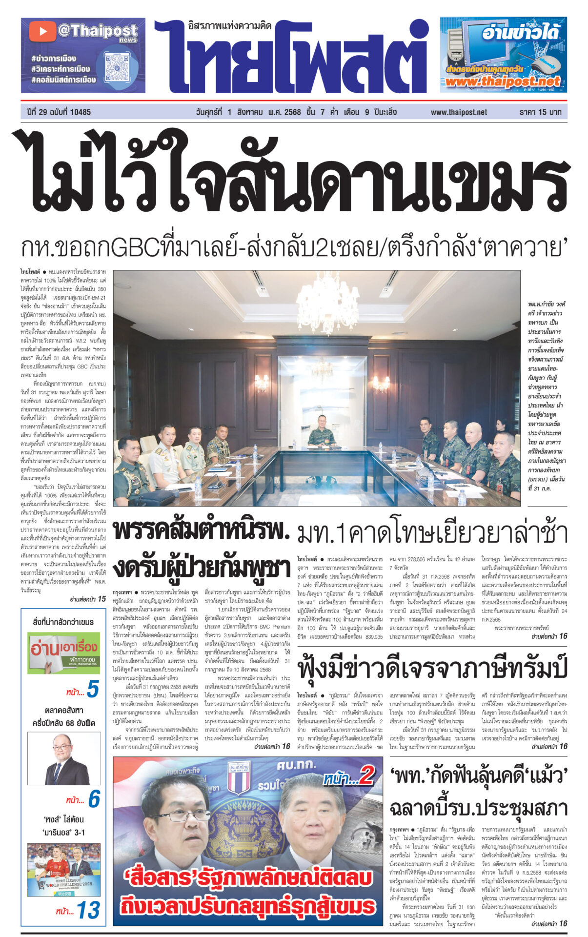 หนังสือพิมพ์ ฉบับวันที่ 1 สิงหาคม 2568ข่าวหน้าหนึ่งไม่ไว้ใจสันดานเขมร กห.ขอถกGBCที่มาเลย์-ส่งกลับ2เชลย/ตรึงกำลัง‘ตาควาย’ทบ.แจงทหารไทยยึดปราสาทตาควายไม่ 100% ไม่ใช่ตัวชี้วัดแพ้ชนะ พรรคส้มตำหนิรพ. งดรับผู้ป่วยกัมพูชาพรรคประชาชนโชว์หล่อ พูดหรูอีกแล้ว! ยกอนุสัญญาเจนีวาว่าด้วยหลักสิทธิมนุษยชนในยามสงคราม มท.1คาดโทษเยียวยาล่าช้ากรมสมเด็จพระเทพรัตนราชสุดาฯ พระราชทานพระราชทรัพย์ส่วนพระองค์ ฟุ้งมีข่าวดีเจรจาภาษีทรัมป์“ภูมิธรรม” มั่นใจผลเจรจาภาษีสหรัฐออกมาดี หลัง “ทรัมป์” พอใจชื่นชมไทย ‘พท.’กัดฟันลุ้นคดี‘แม้ว’ ฉลาดบี้รบ.ประชุมสภา“ภูมิธรรม” ลั่น “รัฐบาล-เพื่อไทย” ไม่เสียขวัญหลังศาลฎีกาฯ จ่อตัดสินคดีชั้น 14