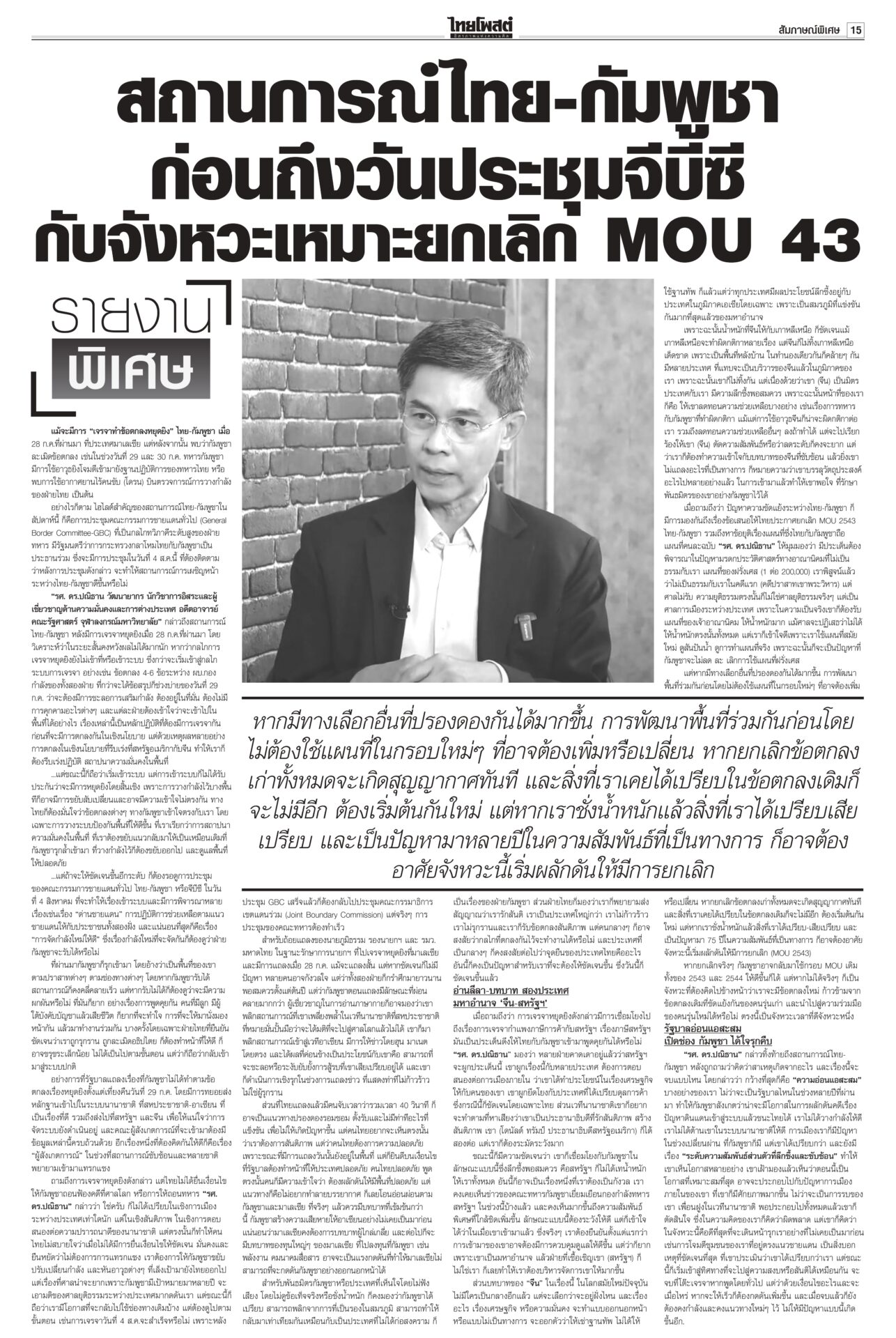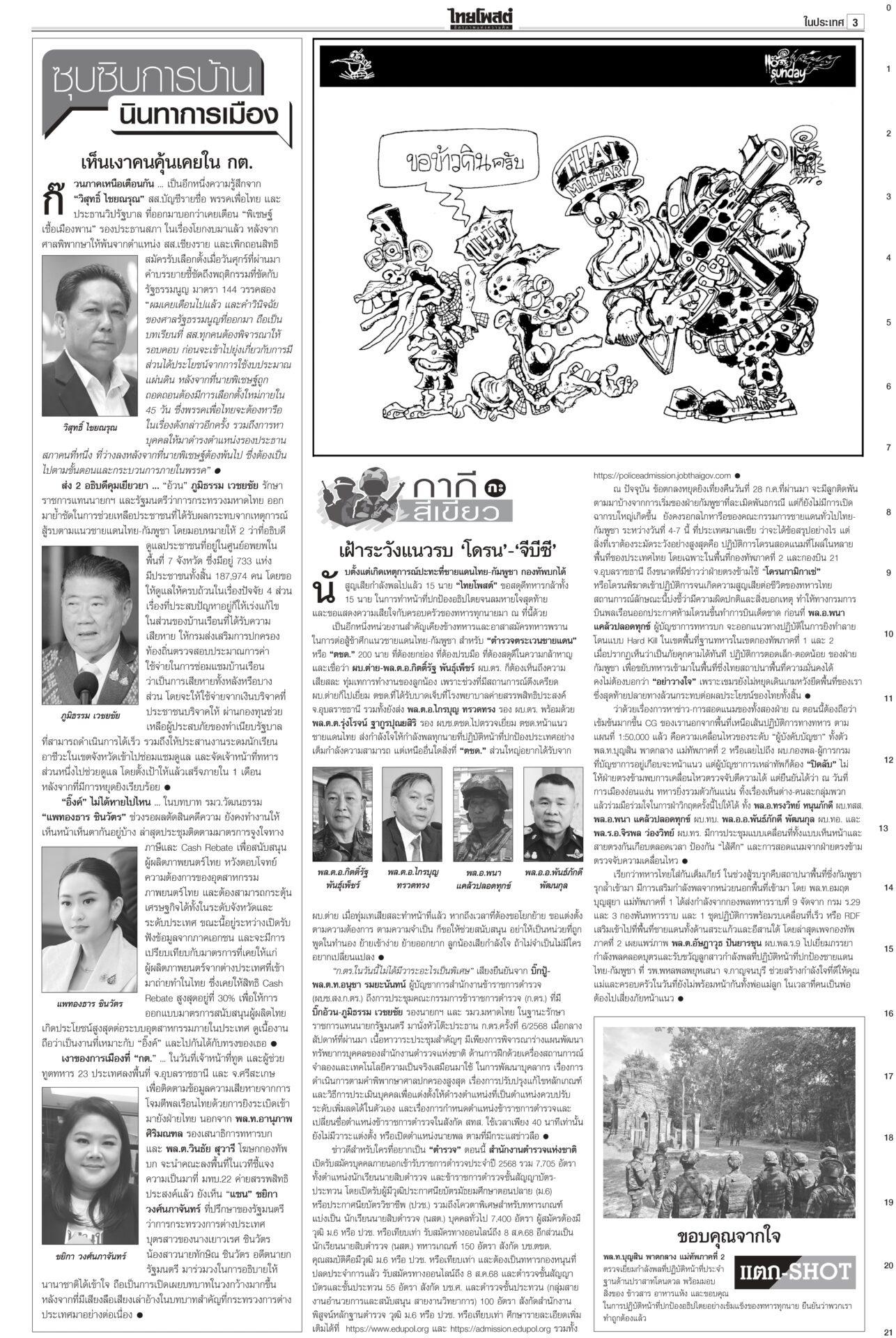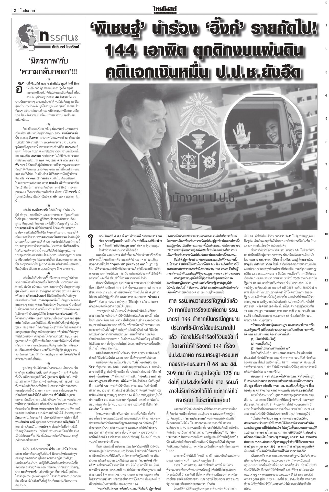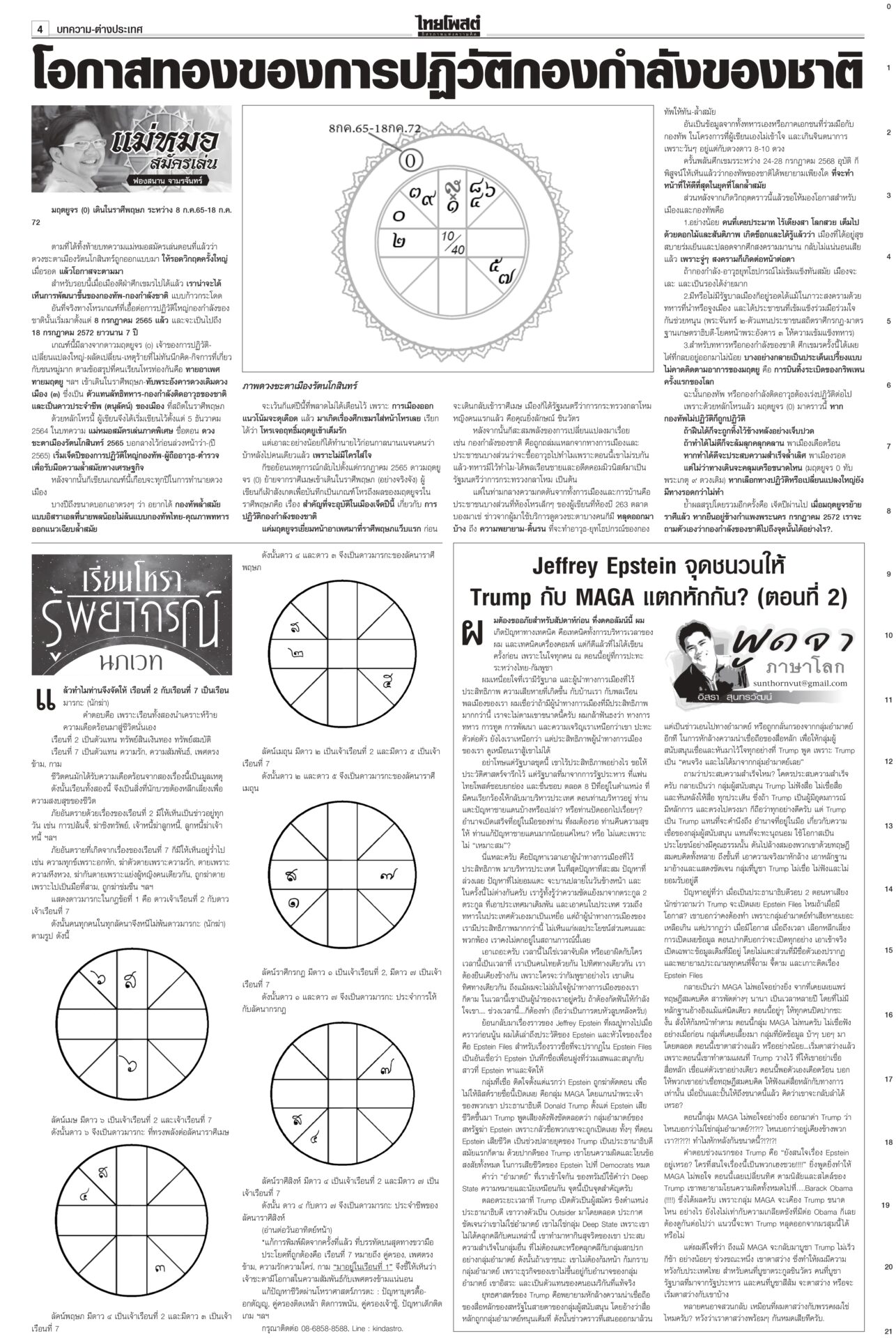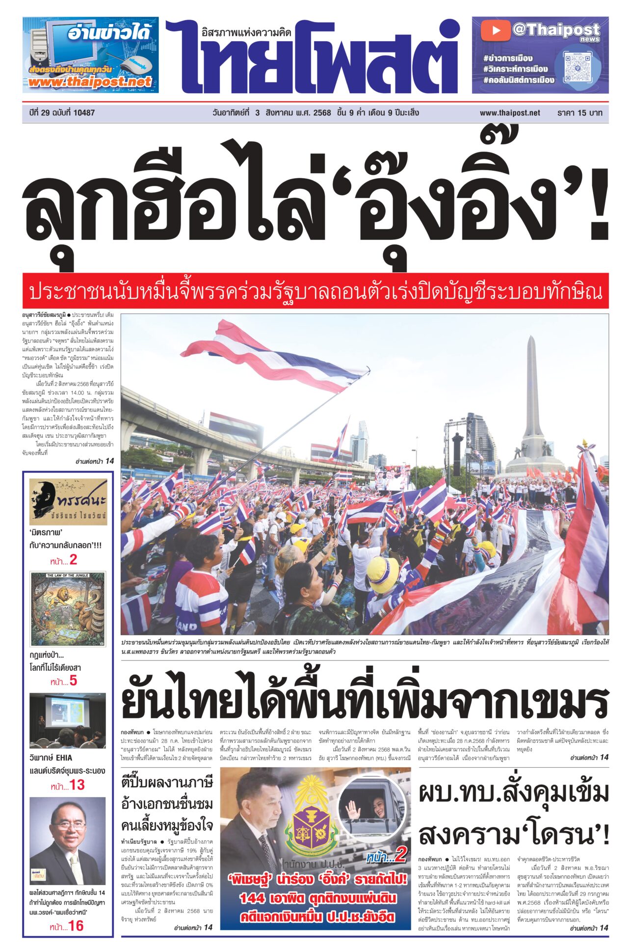 หนังสือพิมพ์ฉบับวันที่ 3 สิงหาคม 2568 ข่าวหน้าหนึ่งลุกฮือไล่ ‘อุ๊งอิ๊ง’! ประชาชนนับหมื่นจี้พรรคร่วมรัฐบาลถอนตัวเร่งปิดบัญชีระบอบทักษิณประชาชนพรึ่บ! เต็มอนุสาวรีย์ชัยฯ ฮือไล่ “อุ๊งอิ๊ง” พ้นตำแหน่งนายกฯ กลุ่มรวมพลังแผ่นดินจี้พรรคร่วมรัฐบาลถอนตัว “จตุพร” ลั่นไทยไม่แพ้สงคราม แต่แพ้เพราะตัวแทนรัฐบาลได้แสดงความโง่ ผบ.ทบ.สั่งคุมเข้ม สงคราม‘โดรน’!ไม่ไว้ใจเขมร! ผบ.ทบ.ออก 3 แนวทางปฏิบัติ ต่อต้าน ทำลายโดรนไม่ทราบฝ่าย หลังพบบินตรวจการณ์ที่ตั้งทางทหาร เข้มพื้นที่ทัพภาค 1-2 หากพบเป็นภัยคุกคามร้ายแรง ใช้อาวุธประจำกายประจำหน่วยยิงทำลายได้ทันที พ ตีปี๊บผลงานภาษี อ้างเอกชนชื่นชม คนเลี้ยงหมูข้องใจรัฐบาลตีปี๊บอ้างภาคเอกชน ขอบคุณรัฐเจรจาภาษี 19% สู้กับคู่แข่งได้ แต่สมาคมผู้เลี้ยงสุกรแห่งชาติจี้ขอให้ยืนยันว่าจะไม่มีการเปิดตลาดสินค้าสุกรจากสหรัฐ และไม่มีแผนที่จะเจรจาในครั้งต่อไป ยันไทยได้พื้นที่เพิ่มจากเขมรโฆษกกองทัพบกแจงปมก่อนปะทะช่องอานม้า 28 ก.ค. ไทยเข้าไปตรง “อนุสาวรีย์ตาอม” ไม่ได้ หลังหยุดยิงฝ่ายไทยเข้าพื้นที่ได้ตามเงื่อนไข 2 ฝ่ายจัดชุดลาดตระเวนยันยังเป็นพื้นที่อ้างสิทธิ์ 2 ฝ่าย