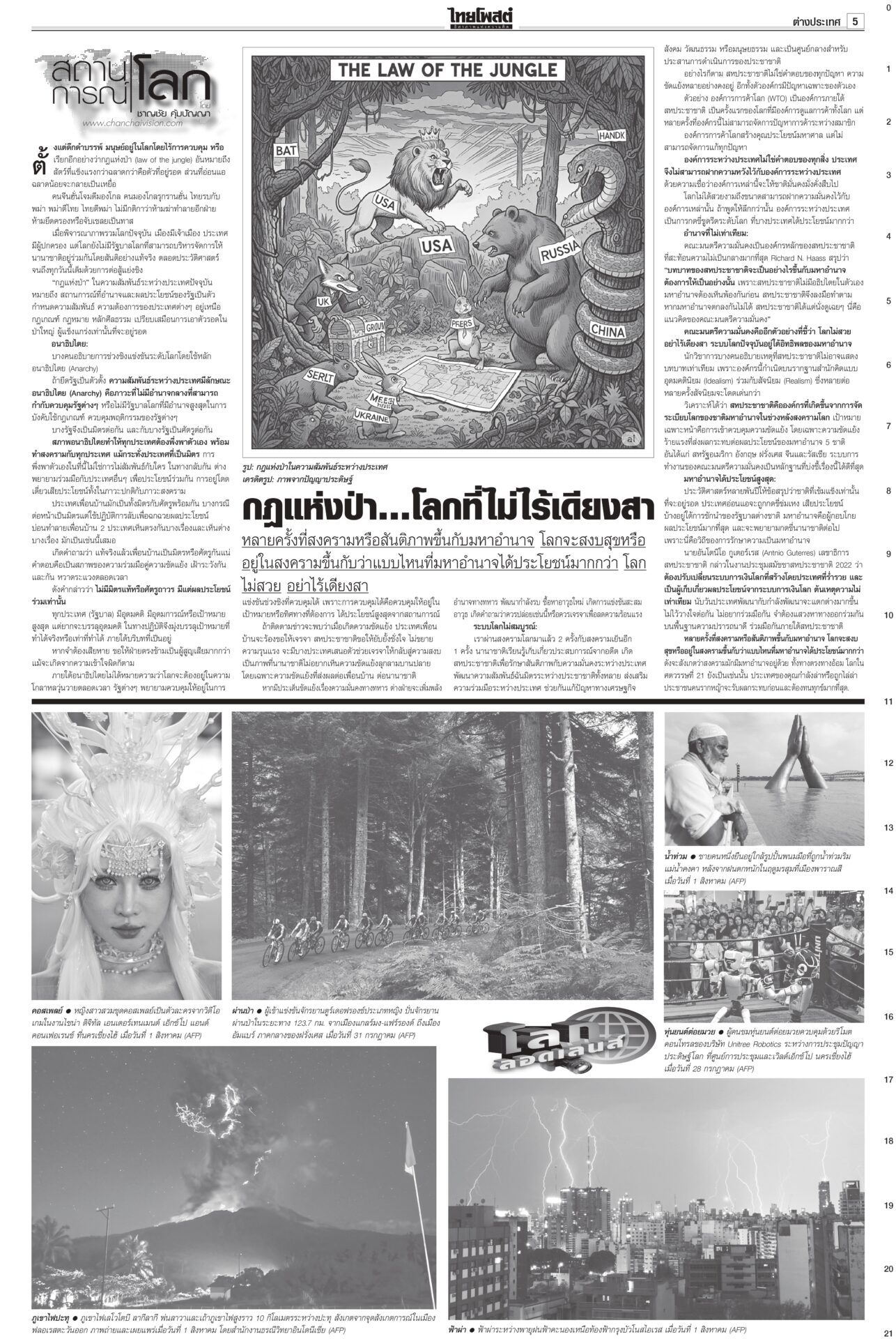 ฉบับวันที่ 3 สิงหาคม 2568 3 สิงหาคม 2568 เวลา 0:01 น. หนังสือพิมพ์ฉบับวันที่ 3 สิงหาคม 2568 ข่าวหน้าหนึ่งลุกฮือไล่ ‘อุ๊งอิ๊ง’! ประชาชนนับหมื่นจี้พรรคร่วมรัฐบาลถอนตัวเร่งปิดบัญชีระบอบทักษิณประชาชนพรึ่บ! เต็มอนุสาวรีย์ชัยฯ ฮือไล่ “อุ๊งอิ๊ง” พ้นตำแหน่งนายกฯ กลุ่มรวมพลังแผ่นดินจี้พรรคร่วมรัฐบาลถอนตัว “จตุพร” ลั่นไทยไม่แพ้สงคราม แต่แพ้เพราะตัวแทนรัฐบาลได้แสดงความโง่ ผบ.ทบ.สั่งคุมเข้ม สงคราม‘โดรน’!ไม่ไว้ใจเขมร! ผบ.ทบ.ออก 3 แนวทางปฏิบัติ ต่อต้าน ทำลายโดรนไม่ทราบฝ่าย หลังพบบินตรวจการณ์ที่ตั้งทางทหาร เข้มพื้นที่ทัพภาค 1-2 หากพบเป็นภัยคุกคามร้ายแรง ใช้อาวุธประจำกายประจำหน่วยยิงทำลายได้ทันที พ ตีปี๊บผลงานภาษี อ้างเอกชนชื่นชม คนเลี้ยงหมูข้องใจรัฐบาลตีปี๊บอ้างภาคเอกชน ขอบคุณรัฐเจรจาภาษี 19% สู้กับคู่แข่งได้ แต่สมาคมผู้เลี้ยงสุกรแห่งชาติจี้ขอให้ยืนยันว่าจะไม่มีการเปิดตลาดสินค้าสุกรจากสหรัฐ และไม่มีแผนที่จะเจรจาในครั้งต่อไป ยันไทยได้พื้นที่เพิ่มจากเขมรโฆษกกองทัพบกแจงปมก่อนปะทะช่องอานม้า 28 ก.ค. ไทยเข้าไปตรง “อนุสาวรีย์ตาอม” ไม่ได้ หลังหยุดยิงฝ่ายไทยเข้าพื้นที่ได้ตามเงื่อนไข 2 ฝ่ายจัดชุดลาดตระเวนยันยังเป็นพื้นที่อ้างสิทธิ์ 2 ฝ่าย Tagsรายวันหนังสือพิมพ์ ข่าวที่เกี่ยวข้อง ฉบับวันที่ 6 ธันวาคม 2568 ฉบับวันที่ 5 ธันวาคม 2568 ฉบับวันที่ 4 ธันวาคม 2568 ฉบับวันที่ 3 ธันวาคม 2568 ฉบับวันที่ 2 ธันวาคม 2568 ฉบับวันที่ 1 ธันวาคม 2568 NEWS UPDATE 18:49 น. 'GULF-AIS'บอลไทยเพื่อคนไทย ร่วมหนุน'เกษตรศาสตร์ FC' สู้ศึกT2ยกกีฬาคู่การศึกษา 18:34 น. 'LPGA'จัดโปรแอมฉลอง75ปี ระดมทุน2.5 ล้านเหรียญสหรัฐ ขับเคลื่อนพลังเด็กหญิง-สตรี 18:22 น. ดีเอสไอ เรียกสอบปากคำ ทนายดังเมืองปากน้ำ ตัวกลางประสานคดีผู้ต้องหาชาวจีนเพียบ 18:13 น. 'แสตมป์'เข้าวินโฮมเรซ 'ตี-ไอเดีย-อุ้ม'พาเหรดขึ้นโพเดียม บิด'Asia Road Racing' 17:33 น. 'สุดารัตน์' แจงภาพร่วมงานแต่ง 'ยิม เลียก' ย้ำจุดยืนต้องลงโทษคนเหล่านี้ให้เด็ดขาด
