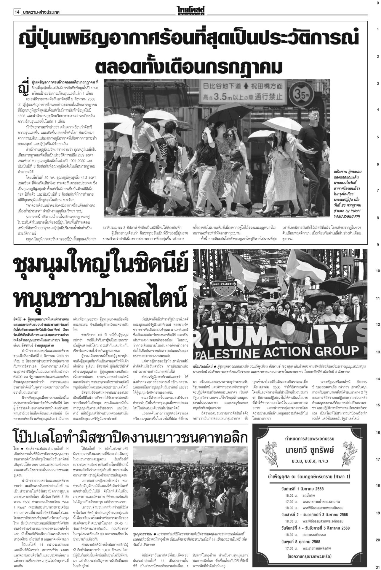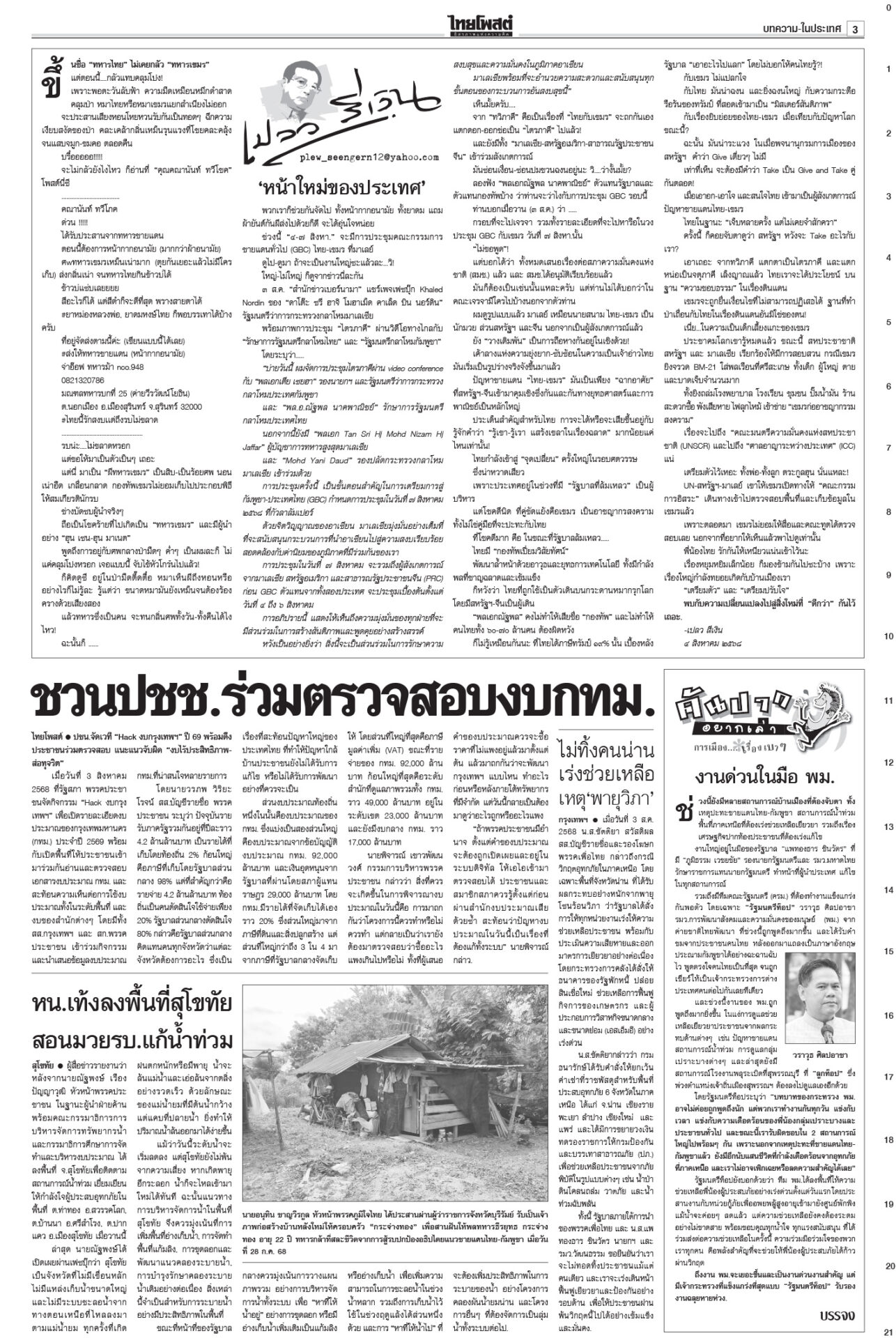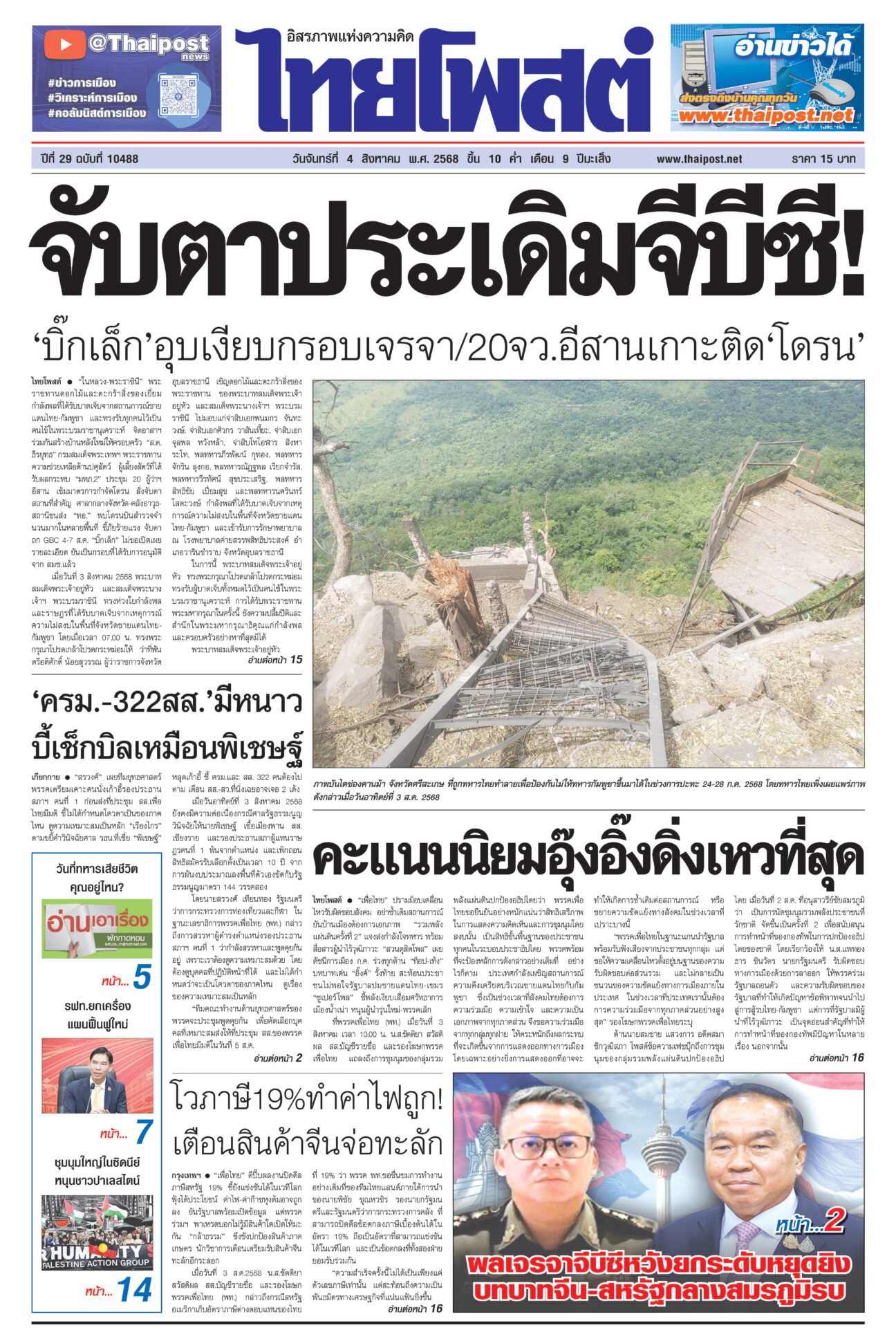 หนังสือพิมพ์ ฉบับวันที่ 4 สิงหาคม 2568ข่าวหน้าหนึ่งจับตาประเดิมจีบีซี! ‘บิ๊กเล็ก’อุบเงียบกรอบเจรจา/20จว.อีสานเกาะติด‘โดรน’“ในหลวง-พระราชินี” พระราชทานดอกไม้และตะกร้าสิ่งของเยี่ยมกำลังพลที่ได้รับบาดเจ็บจากสถานการณ์ชายแดนไทย-กัมพูชา คะแนนนิยมอุ๊งอิ๊งดิ่งเหวที่สุด“เพื่อไทย” ปรามม็อบเคลื่อนไหวรับผิดชอบสังคม อย่าซ้ำเติมสถานการณ์ โวภาษี19%ทำค่าไฟถูก! เตือนสินค้าจีนจ่อทะลัก“เพื่อไทย” ตีปี๊บผลงานปิดดีลภาษีสหรัฐ 19% ชี้ยังแข่งขันได้ในเวทีโลก