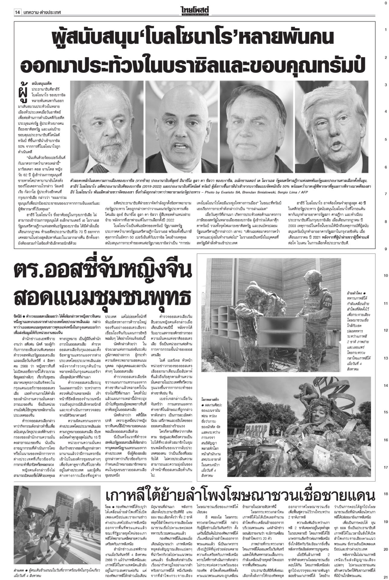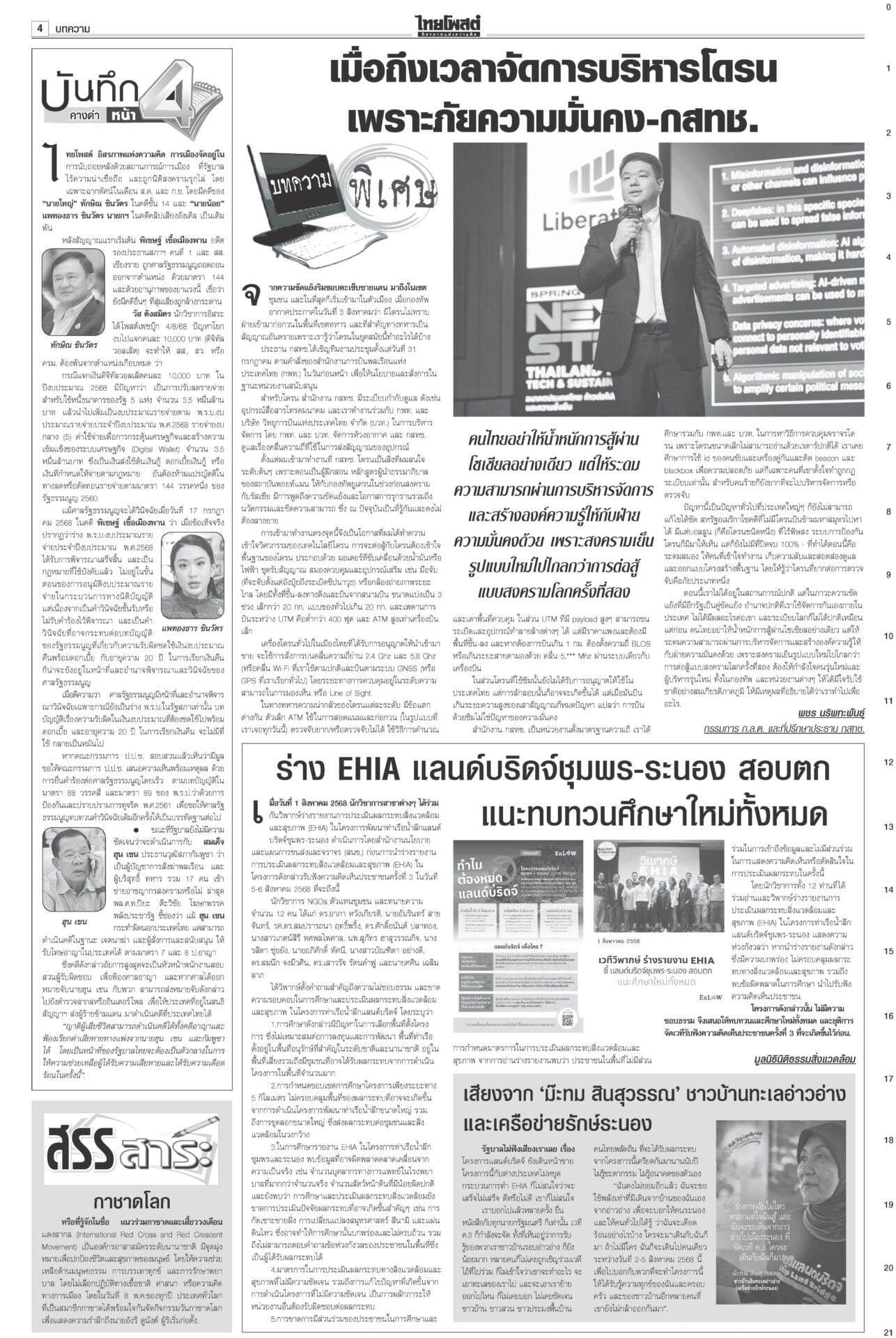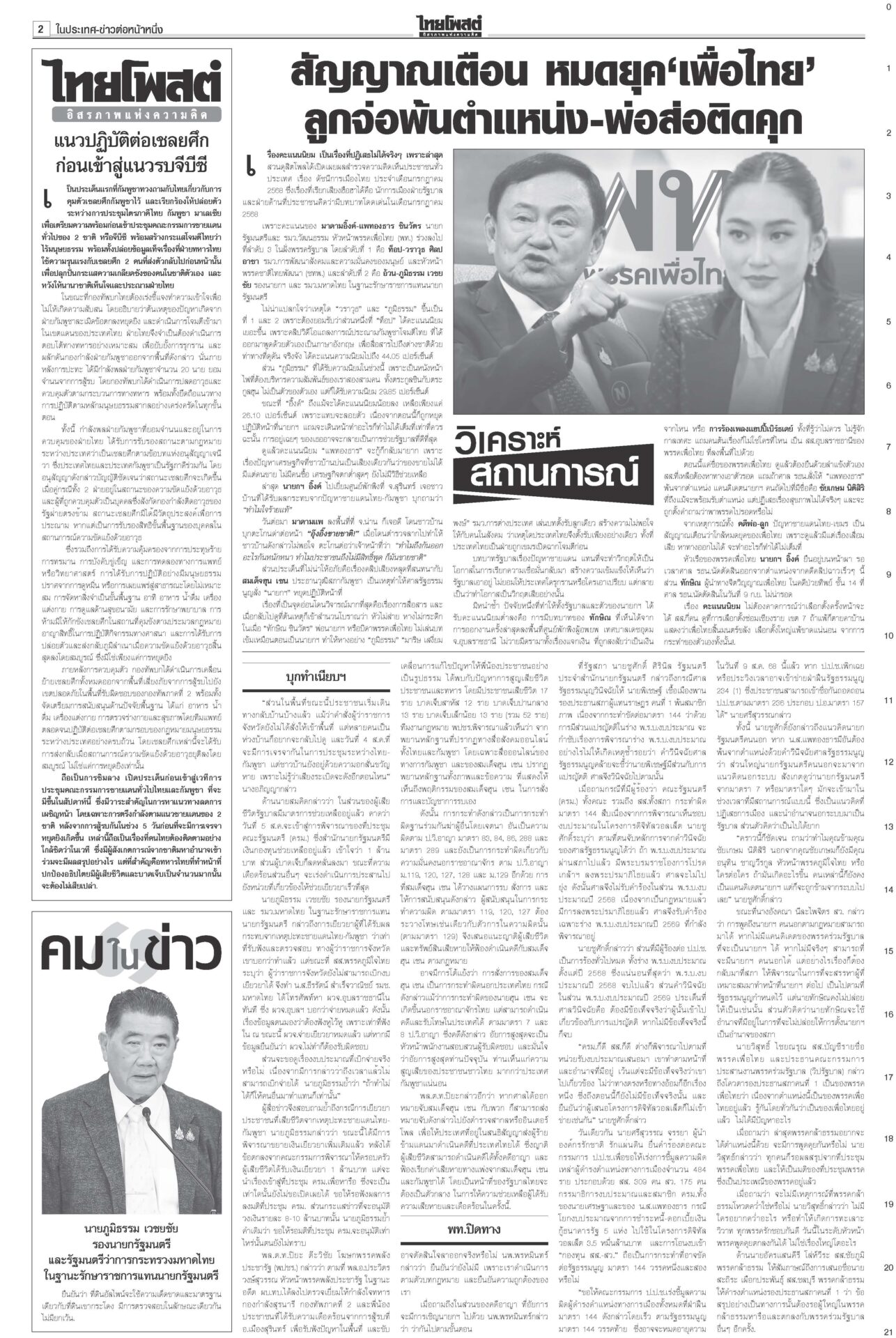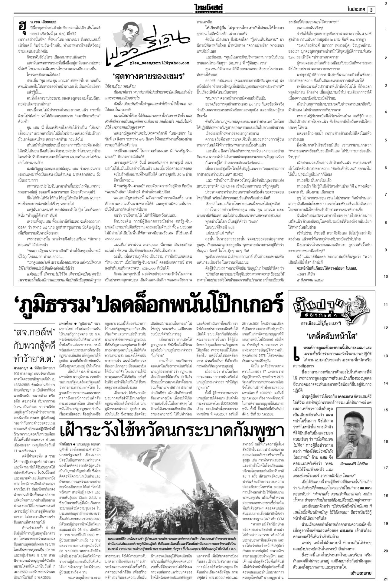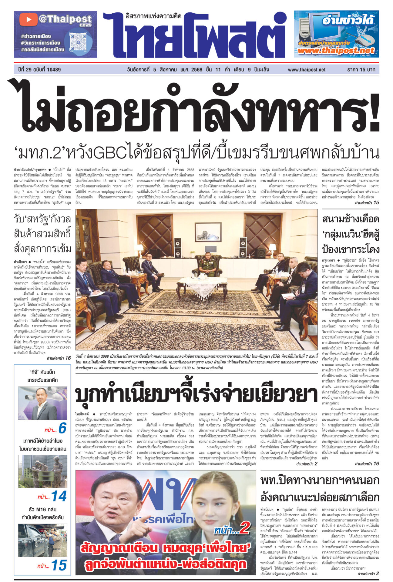 หนังสือพิมพ์ ฉบับวันที่ 5 สิงหาคม 2568ข่าวหน้าหนึ่งไม่ถอยกำลังทหาร! ‘มทภ.2’หวังGBCได้ข้อสรุปที่ดี/บี้เขมรรีบขนศพกลับบ้าน“บิ๊กเล็ก” ลั่นประชุมจีบีซีไทยต้องไม่เสียประโยชน์ รับสถานการณ์ยังเปราะบาง บุกทำเนียบฯจี้เร่งจ่ายเยียวยาชาวบ้านศรีสะเกษบุกทำเนียบฯ จี้รัฐบาลเร่งเยียวยา ปชช. หลังต้องอพยพจากเหตุปะทะชายแดนไทย-กัมพูชา พท.ปิดทางนายกฯคนนอก อังคณาแนะปล่อยสภาเลือก“กุนซือ” อิ๊งค์เผย ส่งคำชี้แจงศาลคดีคลิปเสียงนายกฯ แล้ว ปัดข่าว “ลูกสาวทักษิณ” รับ‘สหรัฐ’กังวล สินค้าสวมสิทธิ์ สั่งศุลกากรเข้ม“หมอมิ้ง” เตรียมชงข้อตกลงภาษีทรัมป์เข้าสภาเห็นชอบ “จุลพันธ์” รับสหรัฐฯ สนามช้างเดือด ‘กลุ่มเนวิน’ฮึดสู้ ป้องเขากระโดง“ภูมิธรรม” ขึงขัง ใช้มาตรฐานเดียวกันสอบทั้งเขากระโดง-อัลไพน์ โต้ “เมียเนวิน” ไม่ใช่การกลั่นแกล้ง ยันเป็นการทำตาม กม