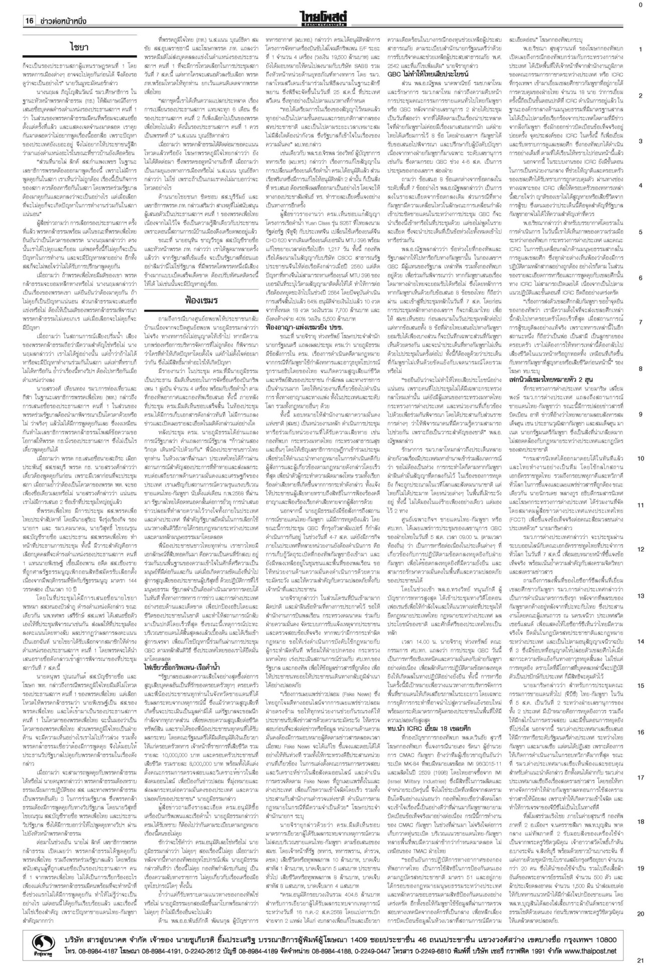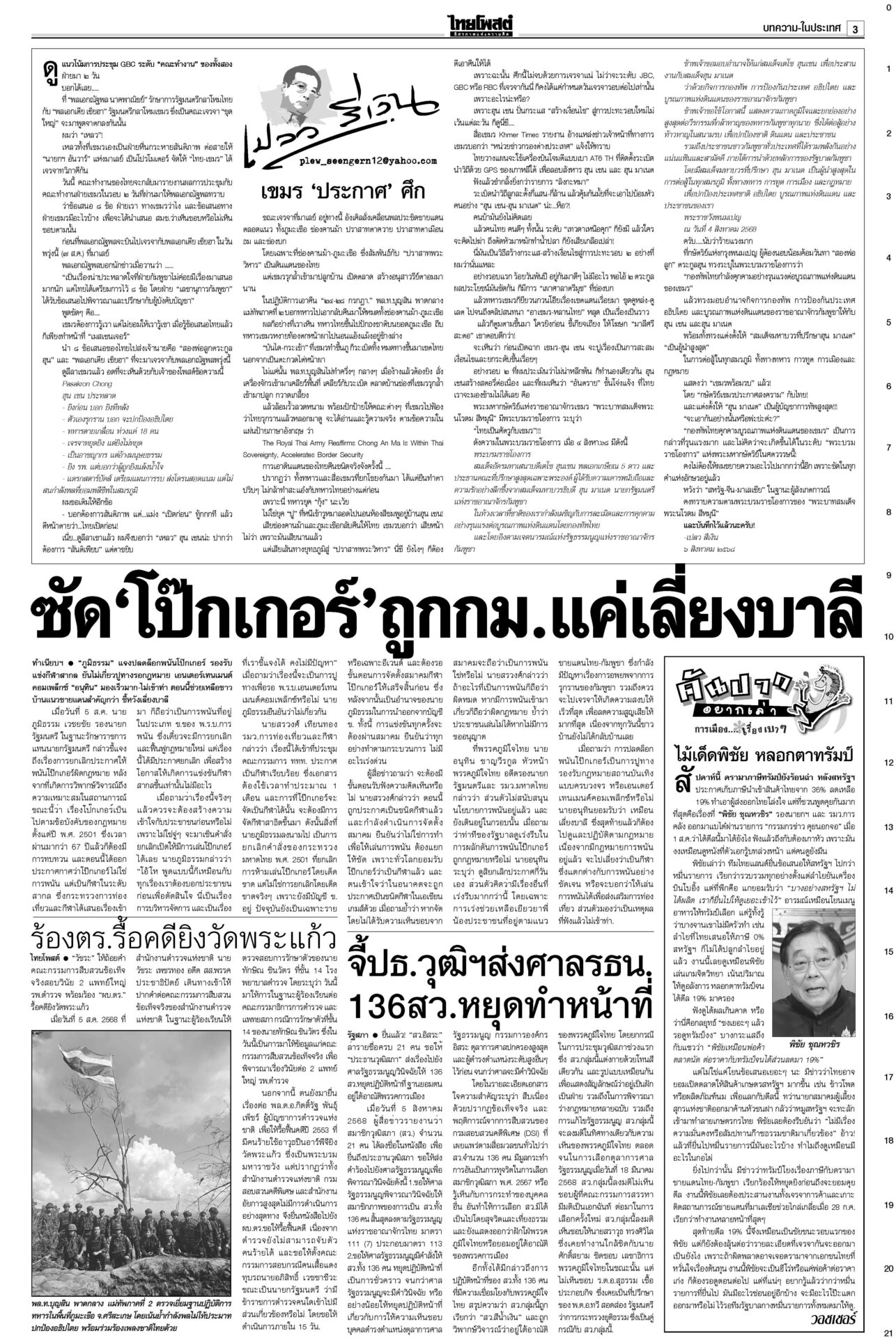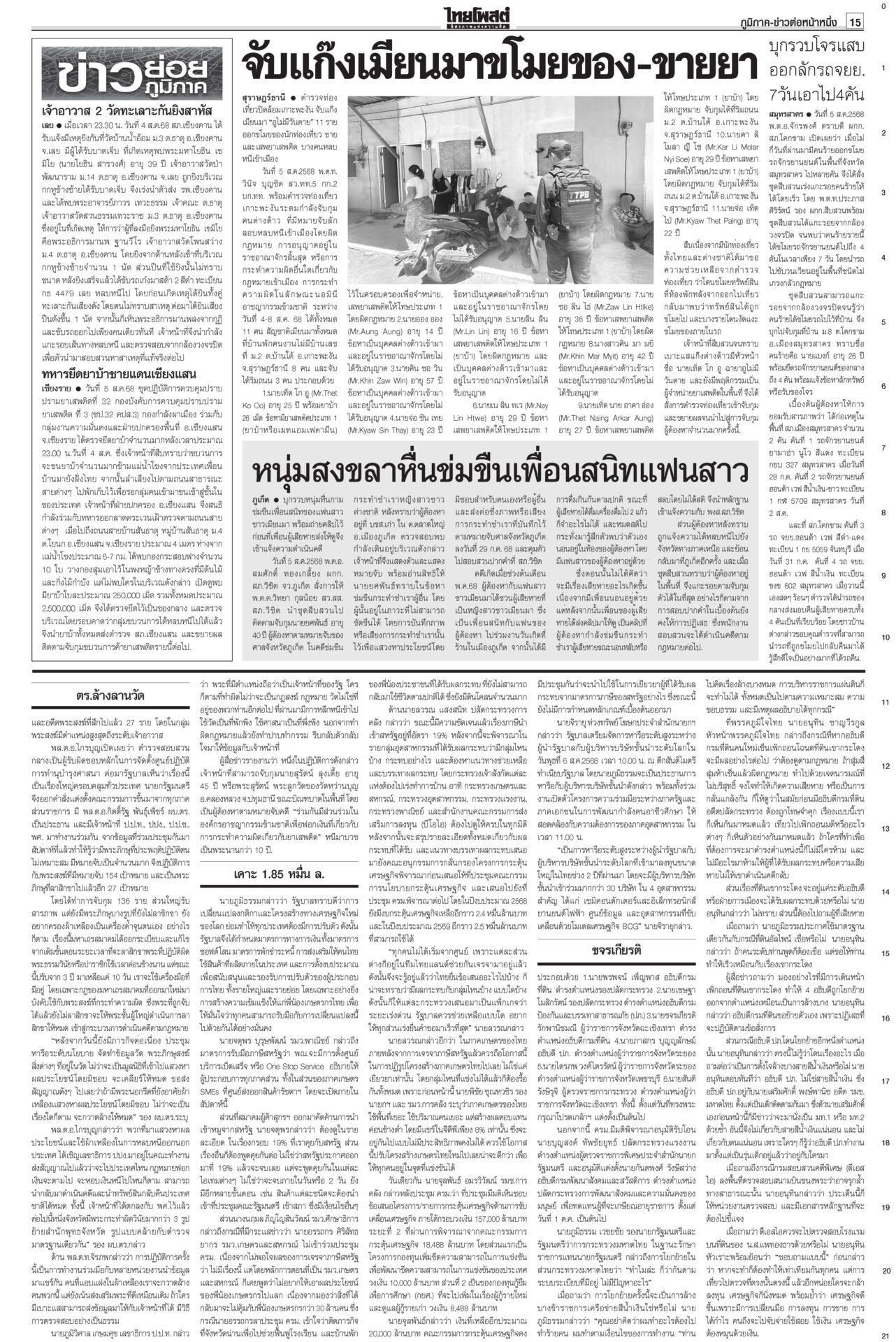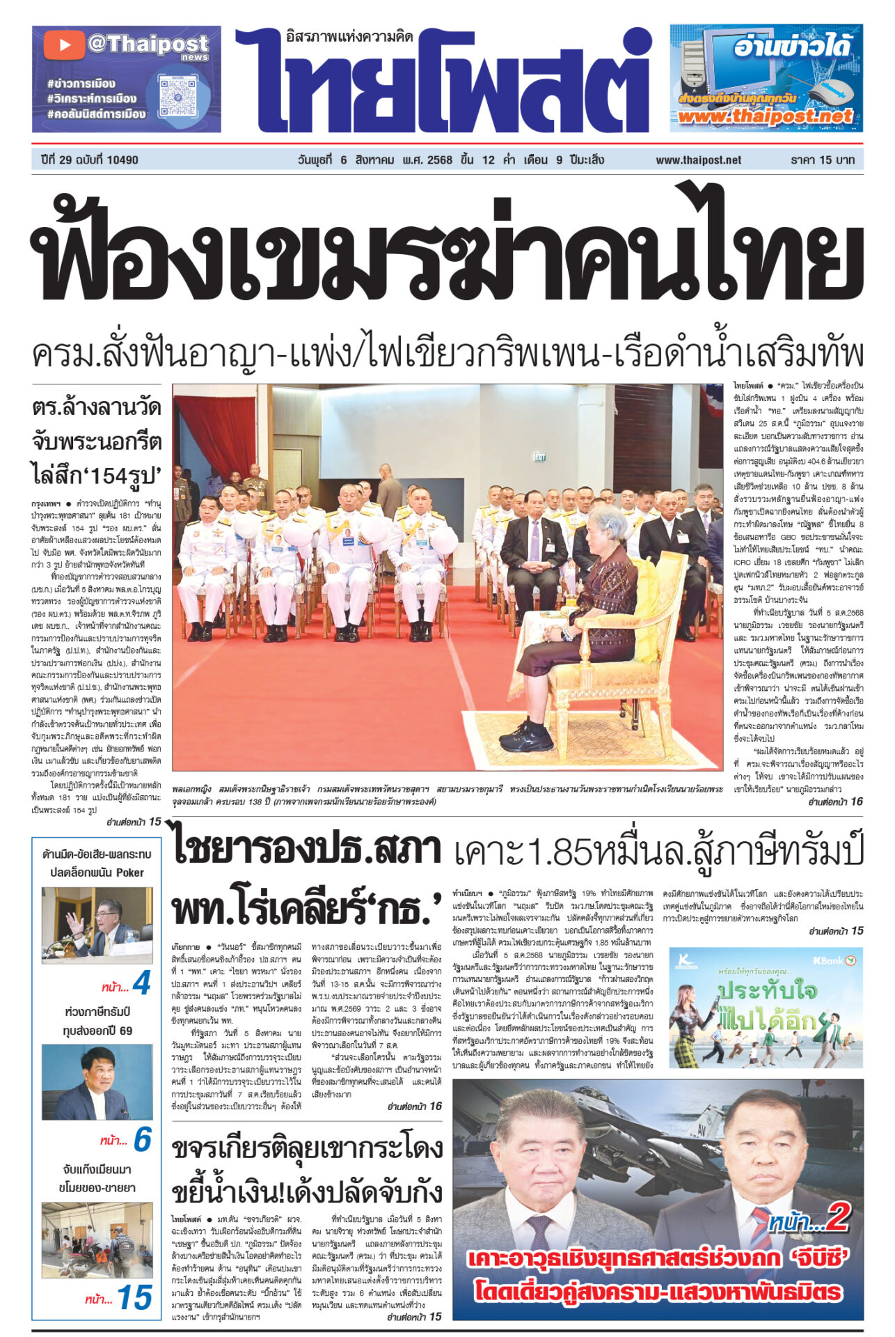 หนังสือพิมพ์ ฉบับวันที่ 6 สิงหาคม 2568ข่าวหน้าหนึ่งฟ้องเขมรฆ่าคนไทย ครม.สั่งฟันอาญา-แพ่ง/ไฟเขียวกริพเพน-เรือดำน้ำเสริมทัพ“ครม.” ไฟเขียวซื้อเครื่องบินขับไล่กริพเพน 1 ฝูงบิน 4 เครื่อง พร้อมเรือดำน้ำ ไชยารองปธ.สภา พท.โร่เคลียร์‘กธ.’“วันนอร์” ชี้สมาชิกทุกคนมีสิทธิ์เสนอชื่อคนชิงเก้าอี้รอง ปธ.สภาฯ คนที่ 1 ตร.ล้างลานวัด จับพระนอกรีต ไล่สึก‘154รูป’ตำรวจเปิดปฏิบัติการ “ทำนุบำรุงพระพุทธศาสนา” ลุยค้น 181 เป้าหมาย ขจรเกียรติลุยเขากระโดง ขยี้น้ำเงิน!เด้งปลัดจับกังมท.ดัน “ขจรเกียรติ” ผวจ.ฉะเชิงเทรา รับเผือกร้อนนั่งอธิบดีกรมที่ดิน เคาะ1.85หมื่นล.สู้ภาษีทรัมป์“ภูมิธรรม” ฟุ้งภาษีสหรัฐ 19% ทำไทยมีศักยภาพแข่งขันในเวทีโลก