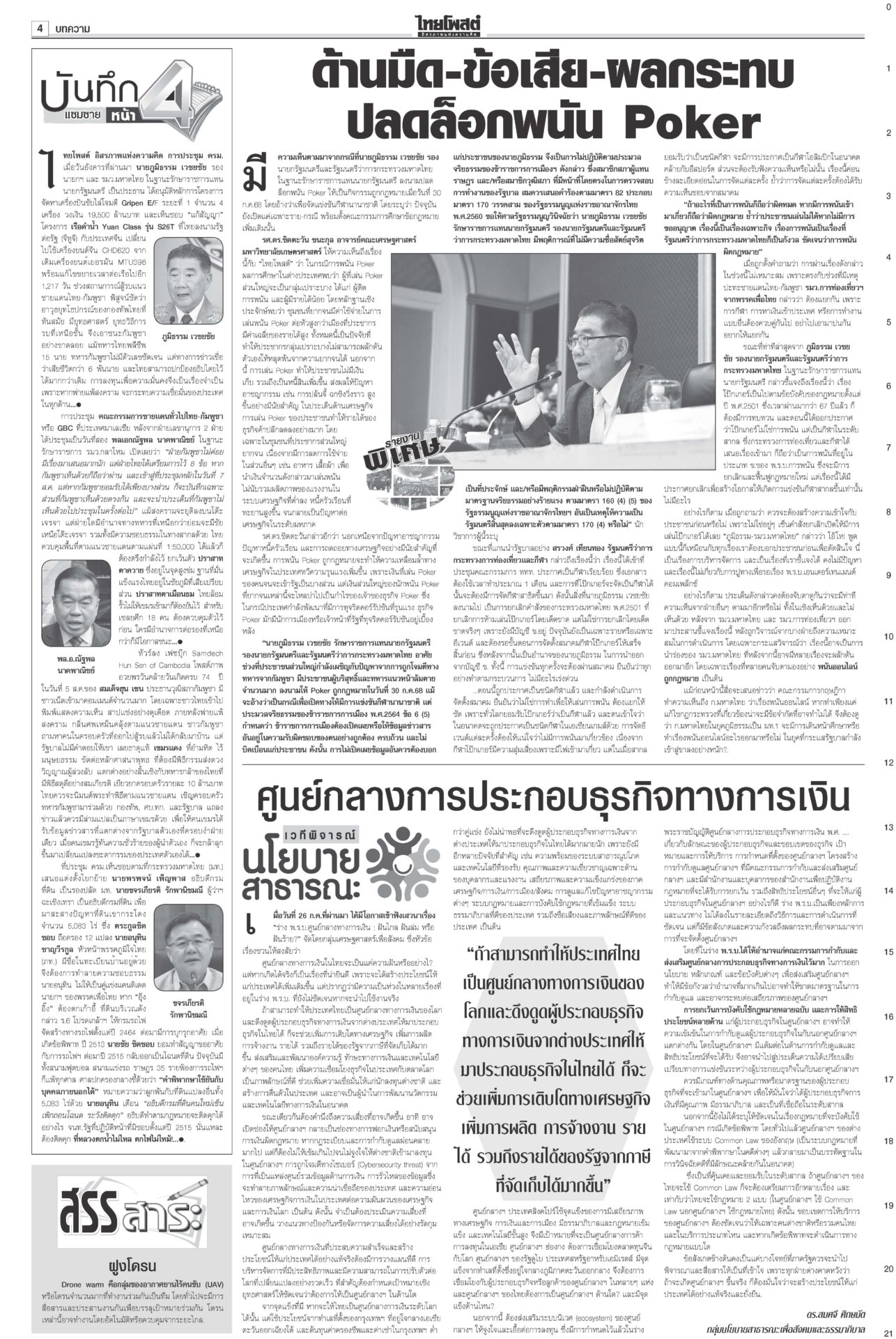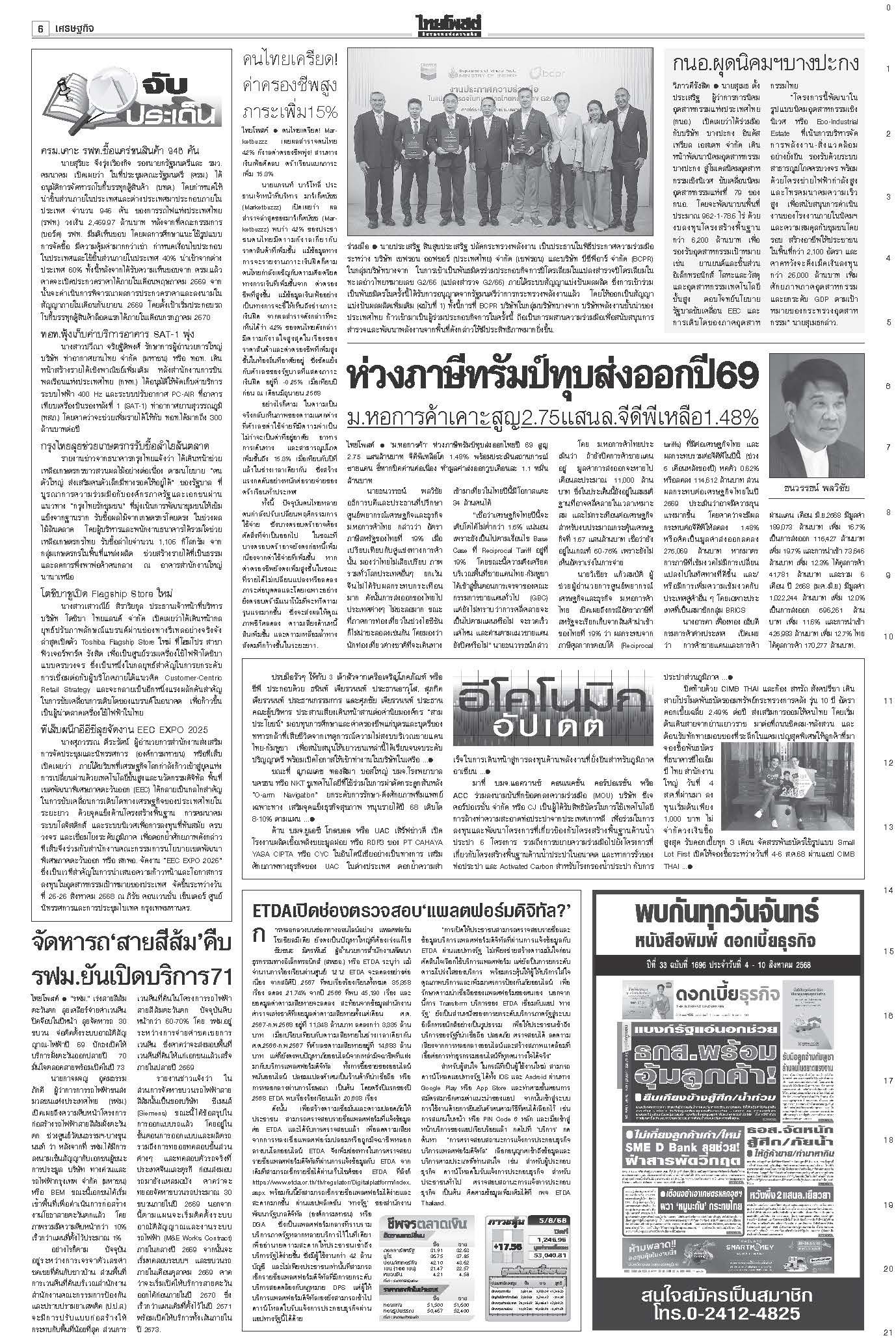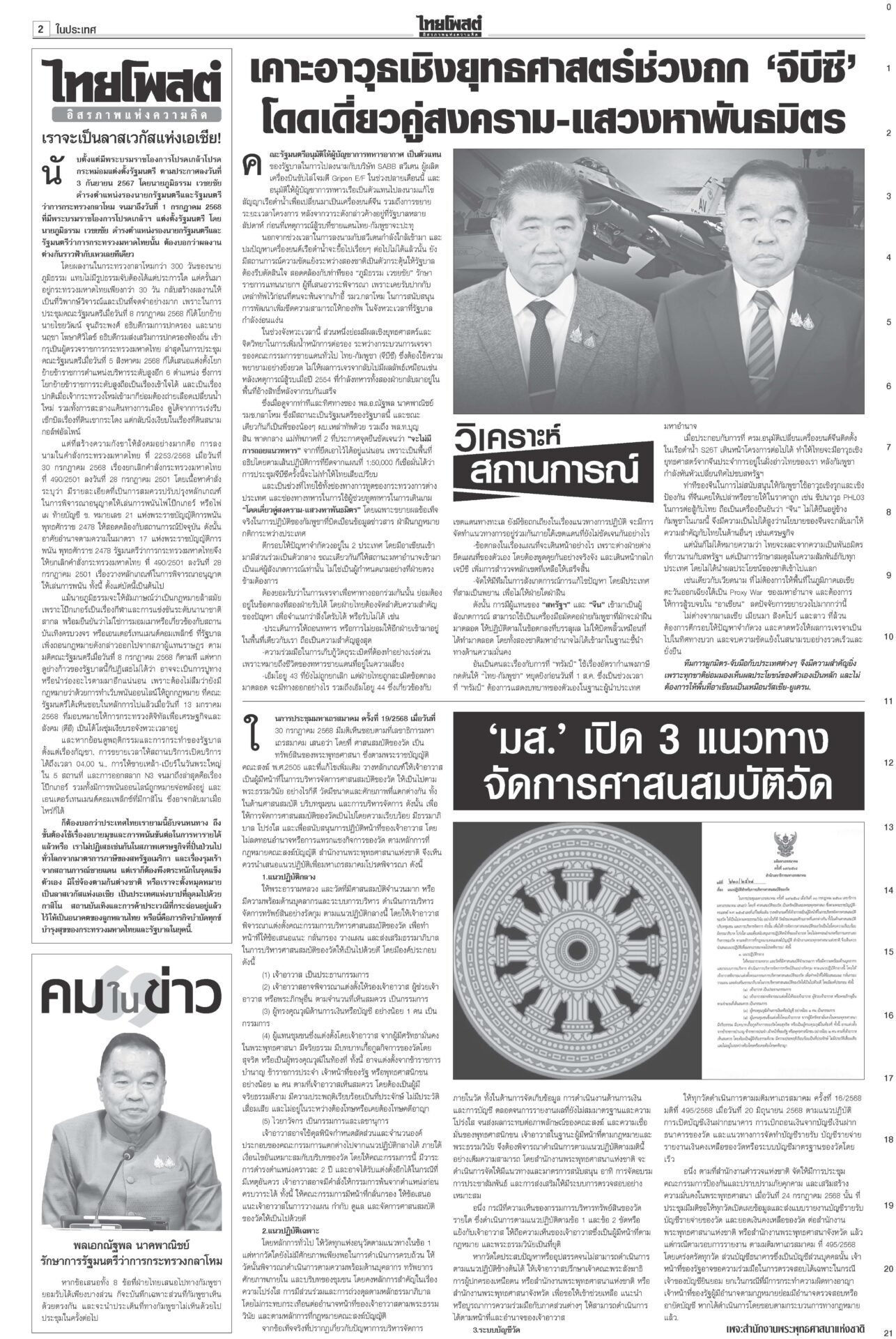 หนังสือพิมพ์ ฉบับวันที่ 6 สิงหาคม 2568ข่าวหน้าหนึ่งฟ้องเขมรฆ่าคนไทย ครม.สั่งฟันอาญา-แพ่ง/ไฟเขียวกริพเพน-เรือดำน้ำเสริมทัพ“ครม.” ไฟเขียวซื้อเครื่องบินขับไล่กริพเพน 1 ฝูงบิน 4 เครื่อง พร้อมเรือดำน้ำ ไชยารองปธ.สภา พท.โร่เคลียร์‘กธ.’“วันนอร์” ชี้สมาชิกทุกคนมีสิทธิ์เสนอชื่อคนชิงเก้าอี้รอง ปธ.สภาฯ คนที่ 1 ตร.ล้างลานวัด จับพระนอกรีต ไล่สึก‘154รูป’ตำรวจเปิดปฏิบัติการ “ทำนุบำรุงพระพุทธศาสนา” ลุยค้น 181 เป้าหมาย ขจรเกียรติลุยเขากระโดง ขยี้น้ำเงิน!เด้งปลัดจับกังมท.ดัน “ขจรเกียรติ” ผวจ.ฉะเชิงเทรา รับเผือกร้อนนั่งอธิบดีกรมที่ดิน เคาะ1.85หมื่นล.สู้ภาษีทรัมป์“ภูมิธรรม” ฟุ้งภาษีสหรัฐ 19% ทำไทยมีศักยภาพแข่งขันในเวทีโลก