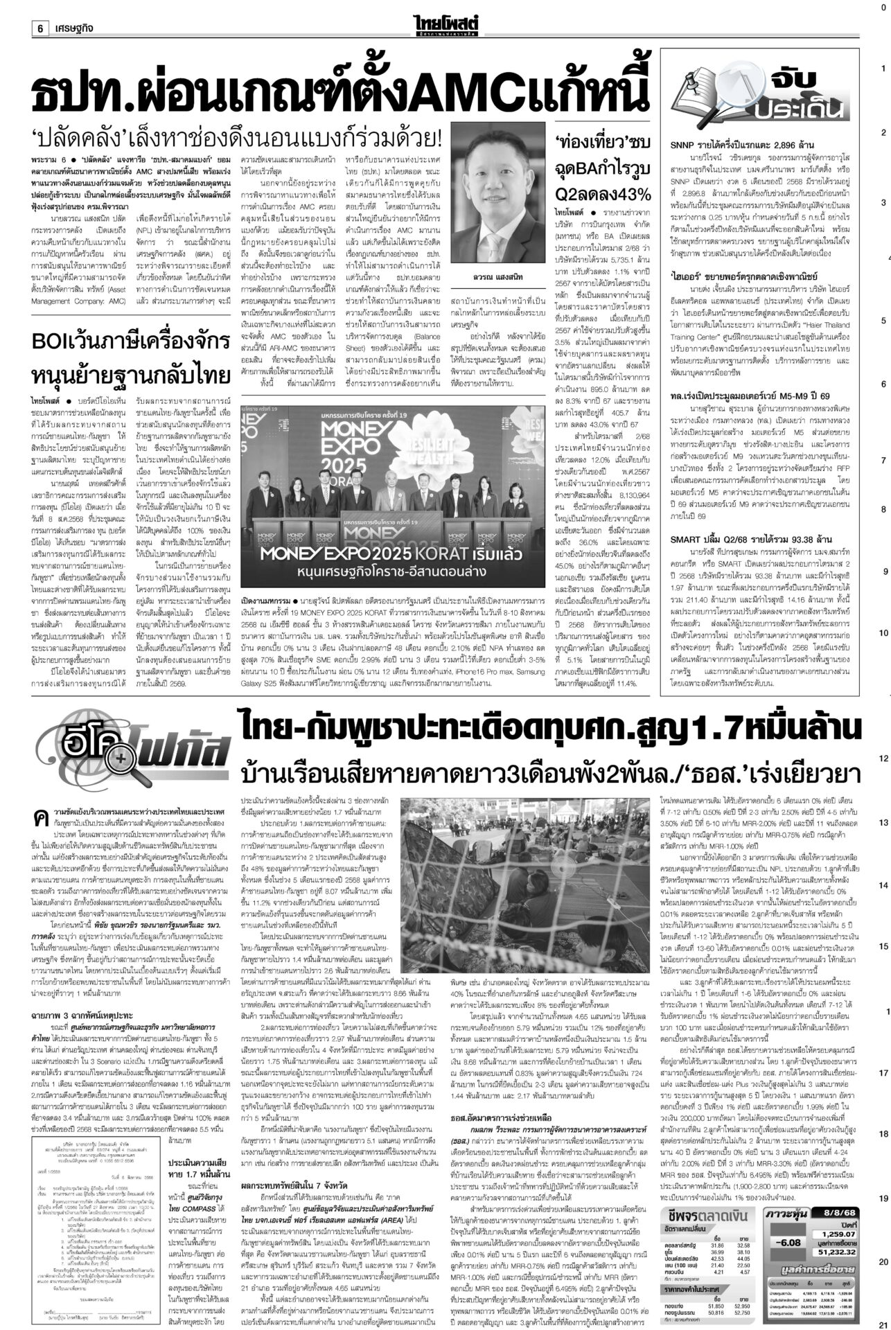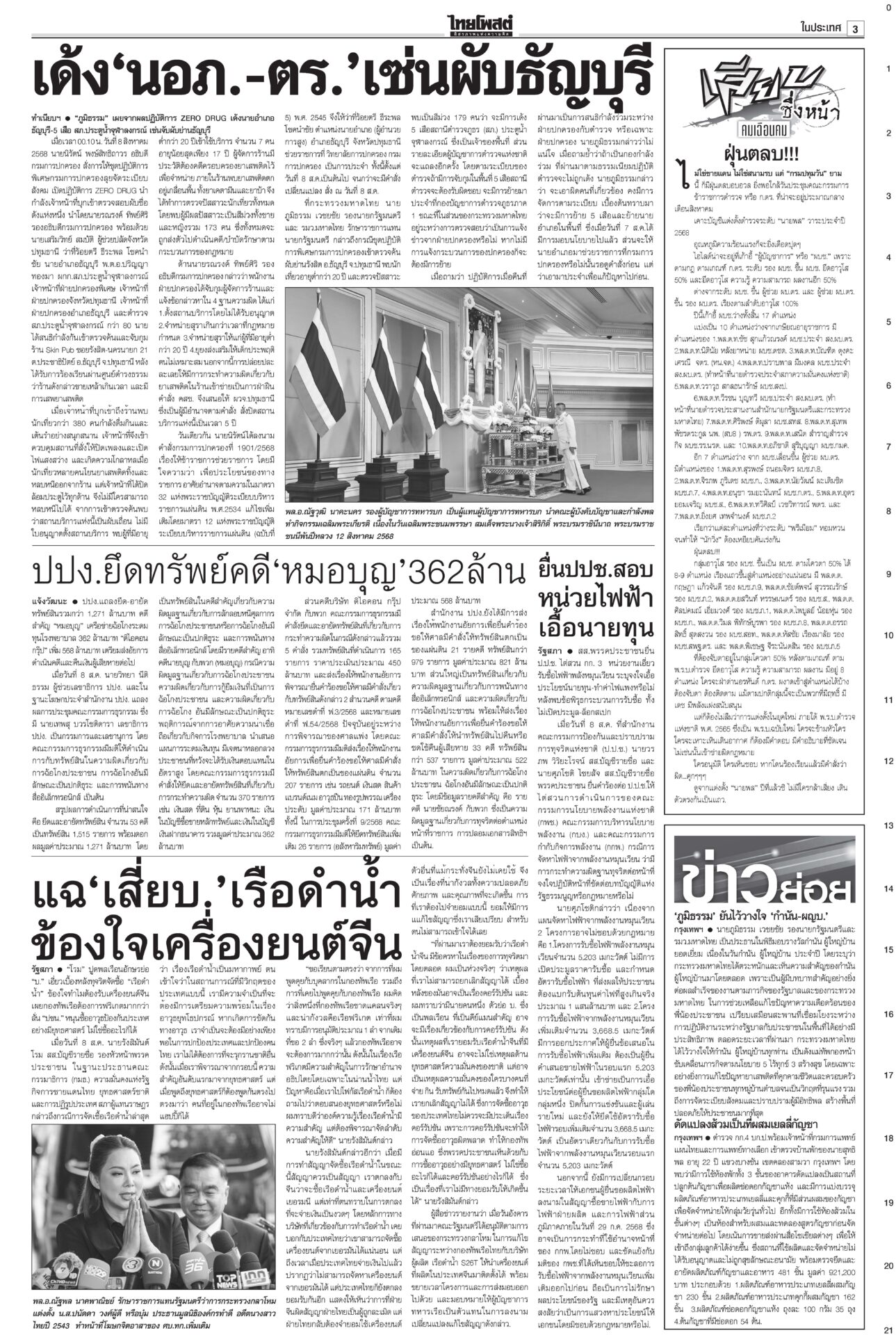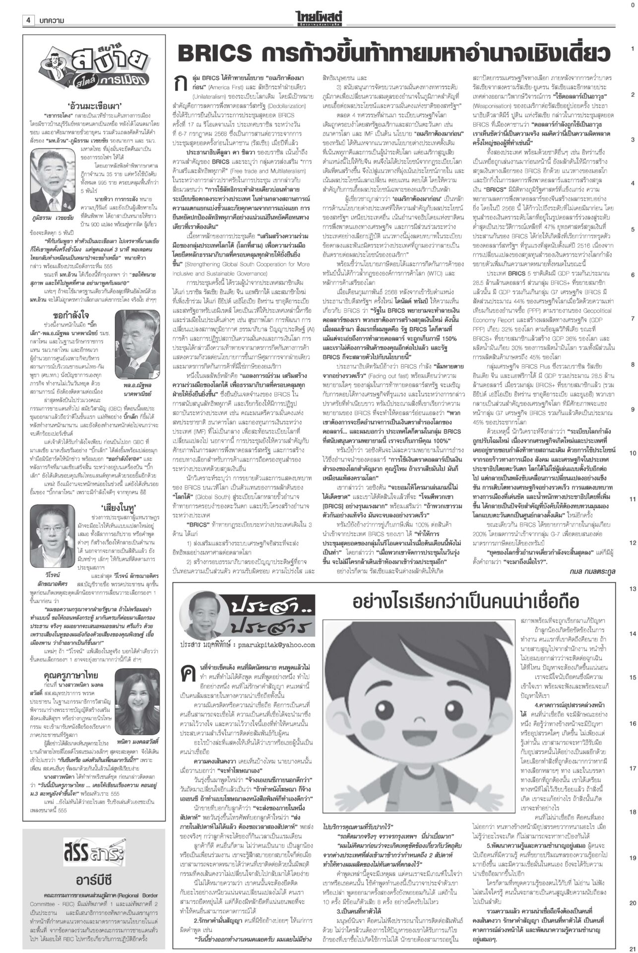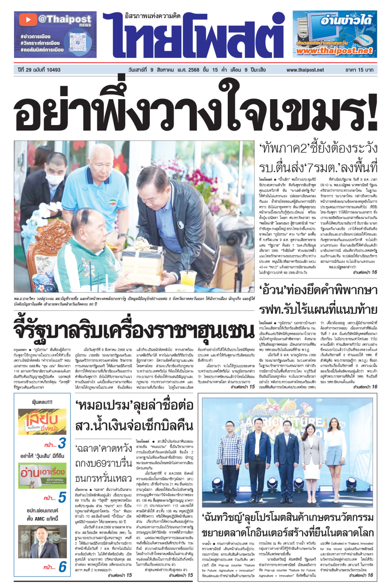 หนังสือพิมพ์ ฉบับวันที่ 9 สิงหาคม 2568ข่าวหน้าหนึ่งอย่าพึ่งวางใจเขมร! ‘ทัพภาค2’ชี้ยังต้องระวัง รบ.ตื่นส่ง‘7รมต.’ลงพื้น“บิ๊กเล็ก” พอใจวงประชุมจีบีซีประสบความสำเร็จ ดึงกัมพูชากลับเข้าพูดคุยแบบทวิภาคี จี้รัฐบาลริบเครื่องราชฯฮุนเซน“ภูมิธรรม” ลั่นฟ้องผู้สั่งการกัมพูชาใช้กฎหมายในประเทศให้หัวเชื้อ ‘หมอเปรม’ลุยล่าชื่อต่อ สว.นํ้าเงินจ่อเช็กบิลคืนสว.สีน้ำเงินจ่อเอาคืนปลอมลายเซ็น “หมอเปรม” ชี้เป็นวิชามารทางการเมืองบีบคำร้องตกอัตโนมัติ ข้องใจ 2 มาตรฐานไม่ท้อเตรียมล่าชื่ออีกรอบ ‘อ้วน’ท่องยึดคำพิพากษา รฟท.รับไร้แผนที่แนบท้าย“ภูมิธรรม” บอกชาวบ้านเขากระโดงเสียหายให้เรียกร้องสิทธิ์ได้ตาม กม. ‘ฉลาด’คาดหวัง ถกงบ69ราบรื่น ธนกรหวั่นเหลว“ฉลาด” ลั่นวางตัวเป็นกลาง ยันทำอะไรมีหลังพิงอยู่แล้ว เชื่อประชุมงบ 69 ราบรื่น ‘ฉันทวิชญ์’ลุยโปรโมตสินค้าเกษตรนวัตกรรม ขยายตลาดโกอินเตอร์สร้างที่ยืนในตลาดโลกกรมการค้าต่างประเทศ กระทรวงพาณิชย์ เดินหน้าส่งเสริมผู้ประกอบการไทย