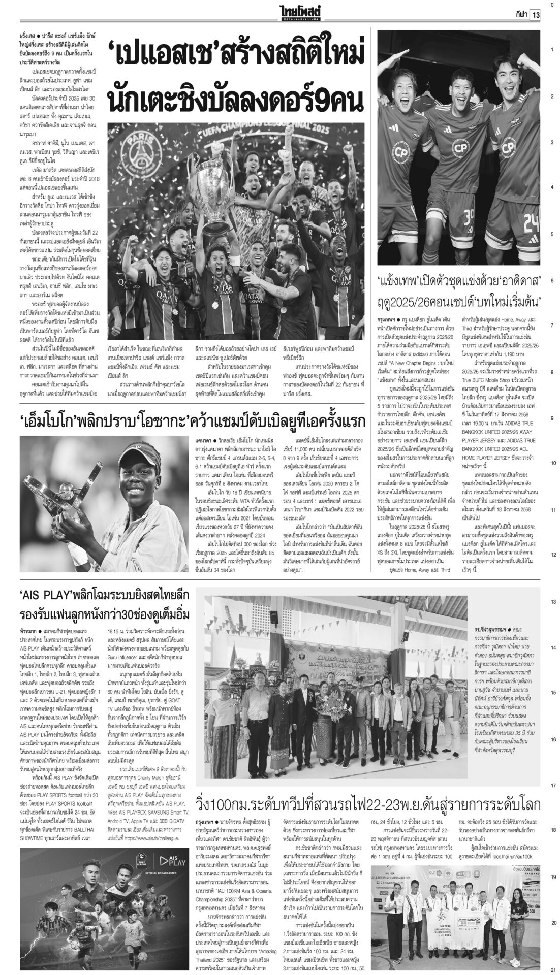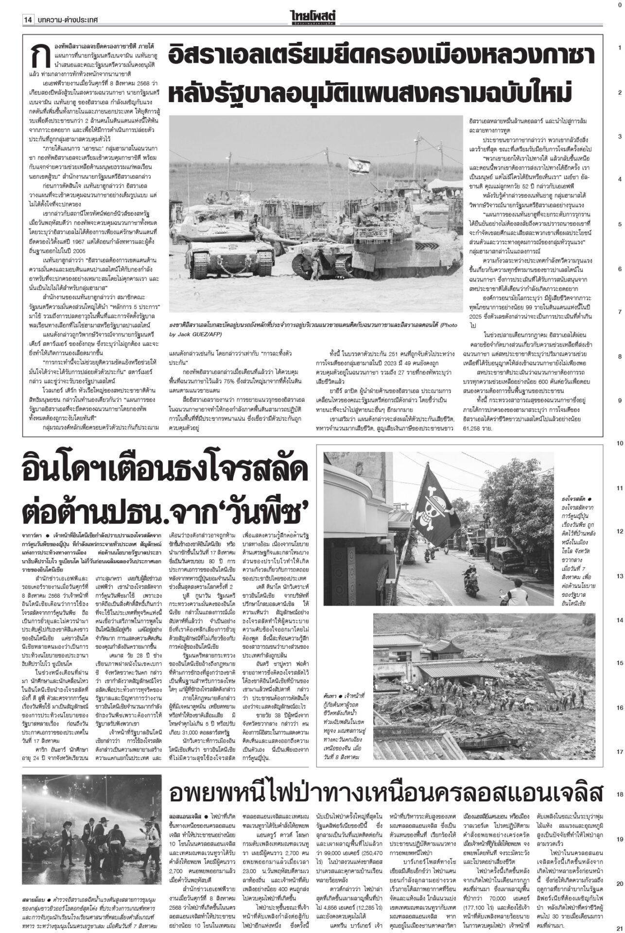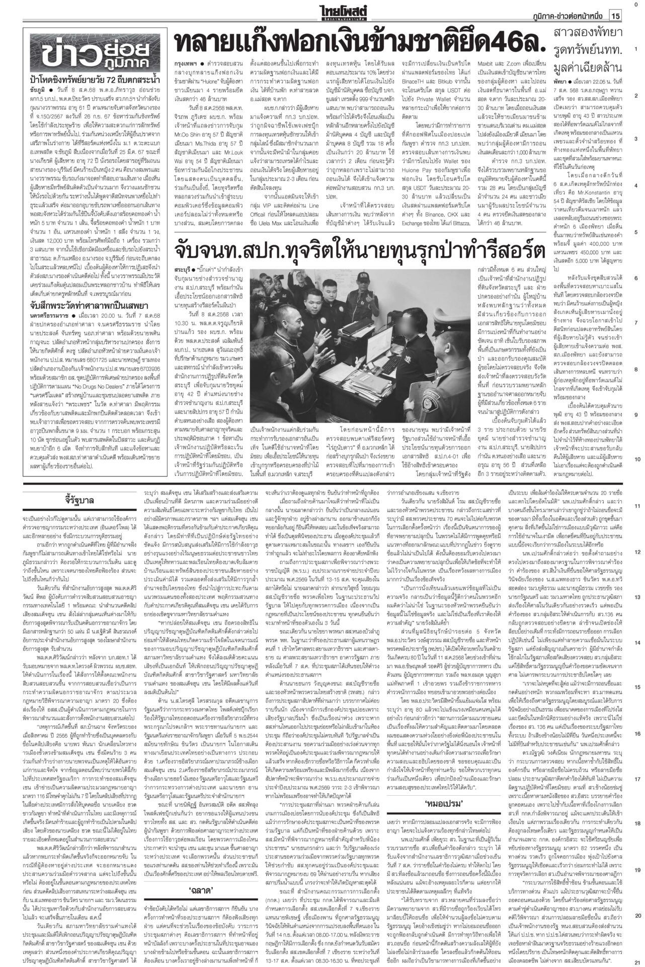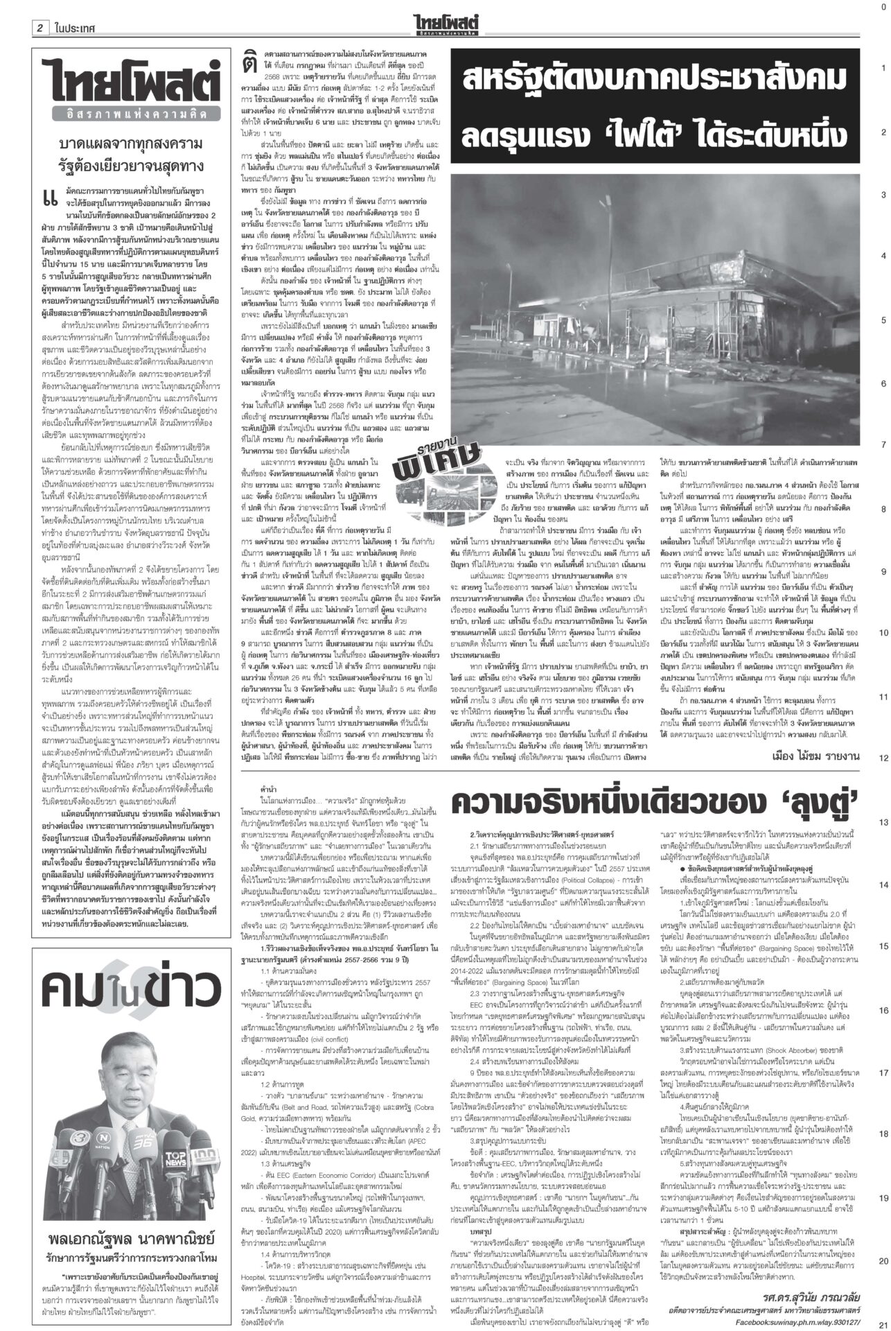 หนังสือพิมพ์ ฉบับวันที่ 9 สิงหาคม 2568ข่าวหน้าหนึ่งอย่าพึ่งวางใจเขมร! ‘ทัพภาค2’ชี้ยังต้องระวัง รบ.ตื่นส่ง‘7รมต.’ลงพื้น“บิ๊กเล็ก” พอใจวงประชุมจีบีซีประสบความสำเร็จ ดึงกัมพูชากลับเข้าพูดคุยแบบทวิภาคี จี้รัฐบาลริบเครื่องราชฯฮุนเซน“ภูมิธรรม” ลั่นฟ้องผู้สั่งการกัมพูชาใช้กฎหมายในประเทศให้หัวเชื้อ ‘หมอเปรม’ลุยล่าชื่อต่อ สว.นํ้าเงินจ่อเช็กบิลคืนสว.สีน้ำเงินจ่อเอาคืนปลอมลายเซ็น “หมอเปรม” ชี้เป็นวิชามารทางการเมืองบีบคำร้องตกอัตโนมัติ ข้องใจ 2 มาตรฐานไม่ท้อเตรียมล่าชื่ออีกรอบ ‘อ้วน’ท่องยึดคำพิพากษา รฟท.รับไร้แผนที่แนบท้าย“ภูมิธรรม” บอกชาวบ้านเขากระโดงเสียหายให้เรียกร้องสิทธิ์ได้ตาม กม. ‘ฉลาด’คาดหวัง ถกงบ69ราบรื่น ธนกรหวั่นเหลว“ฉลาด” ลั่นวางตัวเป็นกลาง ยันทำอะไรมีหลังพิงอยู่แล้ว เชื่อประชุมงบ 69 ราบรื่น ‘ฉันทวิชญ์’ลุยโปรโมตสินค้าเกษตรนวัตกรรม ขยายตลาดโกอินเตอร์สร้างที่ยืนในตลาดโลกกรมการค้าต่างประเทศ กระทรวงพาณิชย์ เดินหน้าส่งเสริมผู้ประกอบการไทย