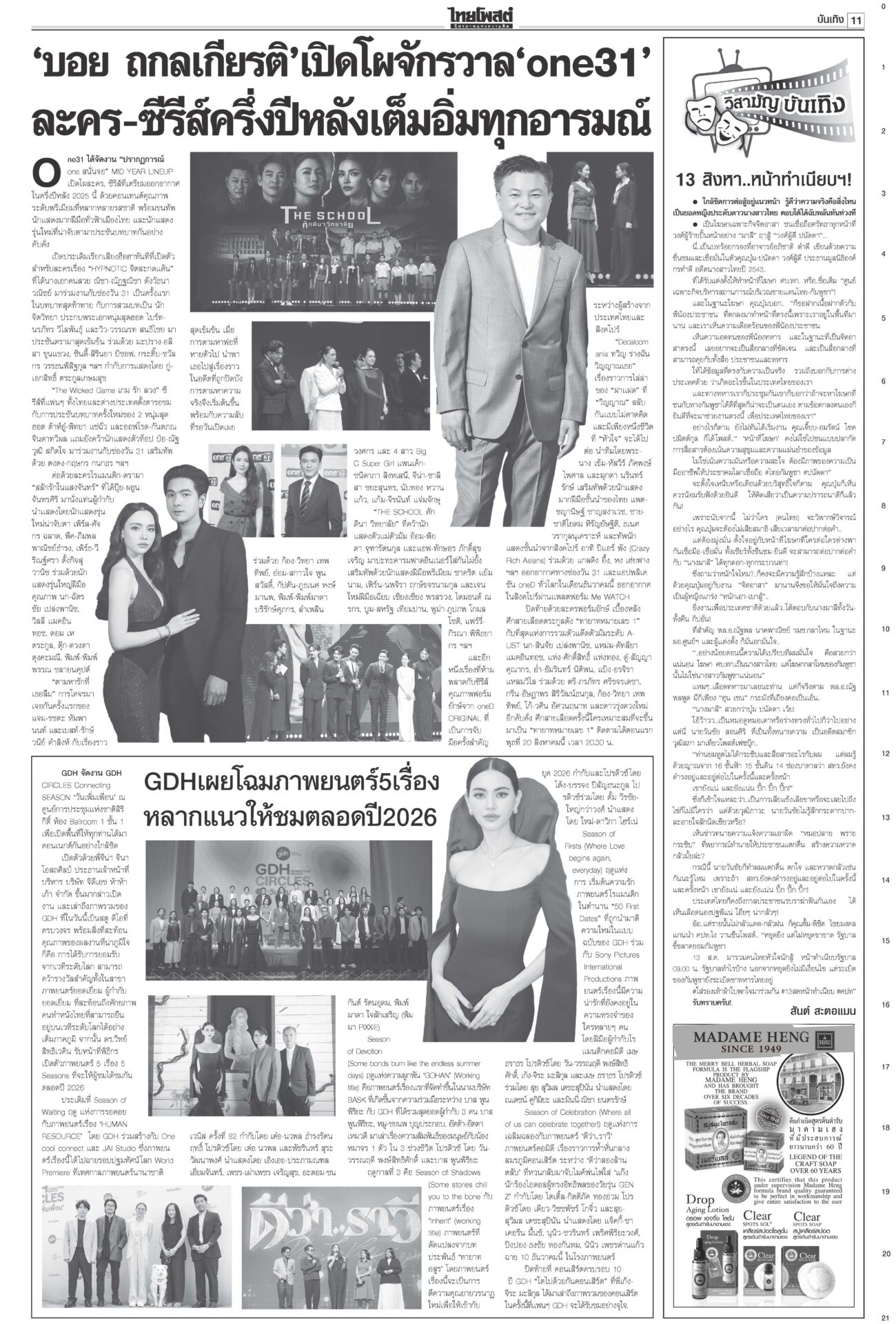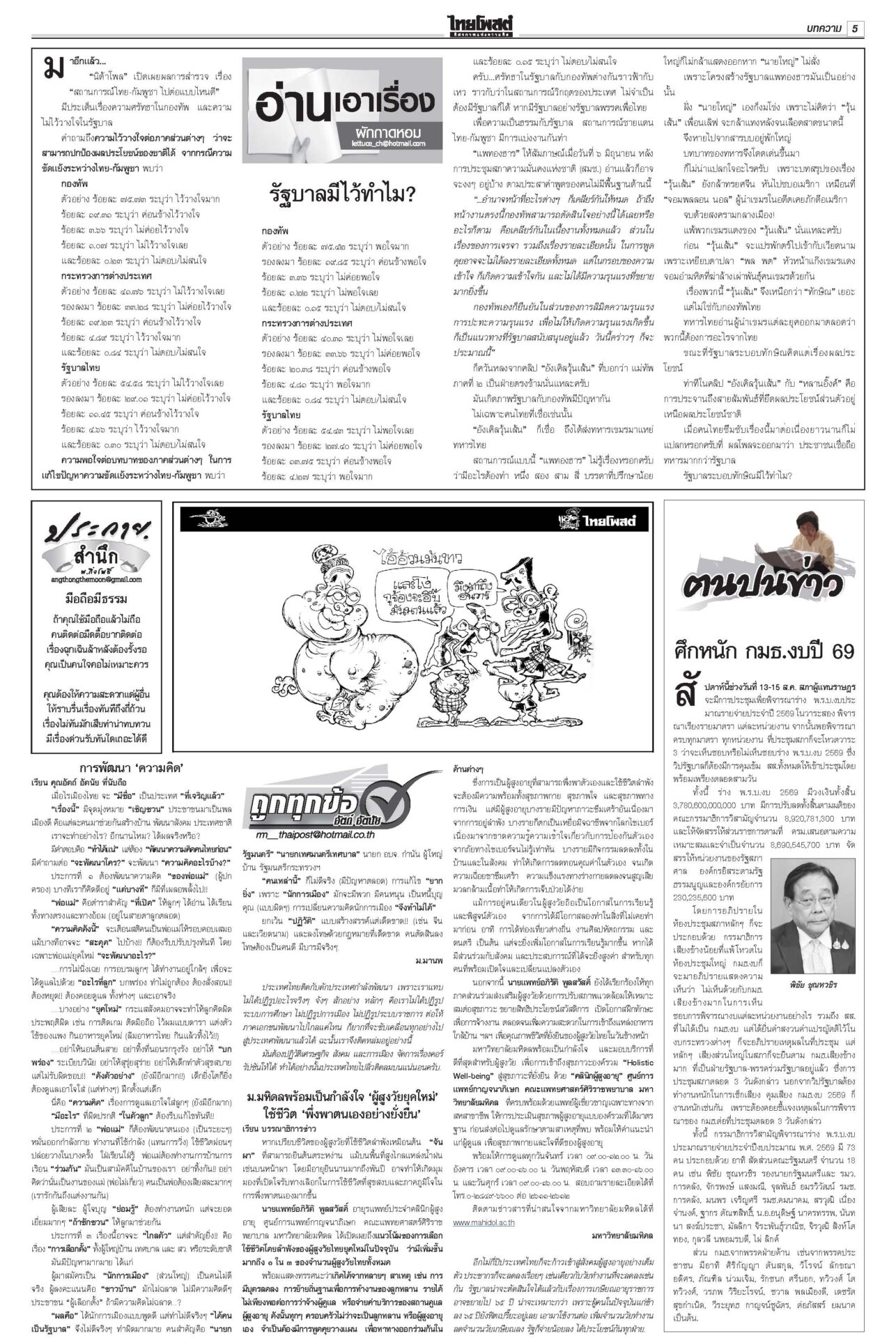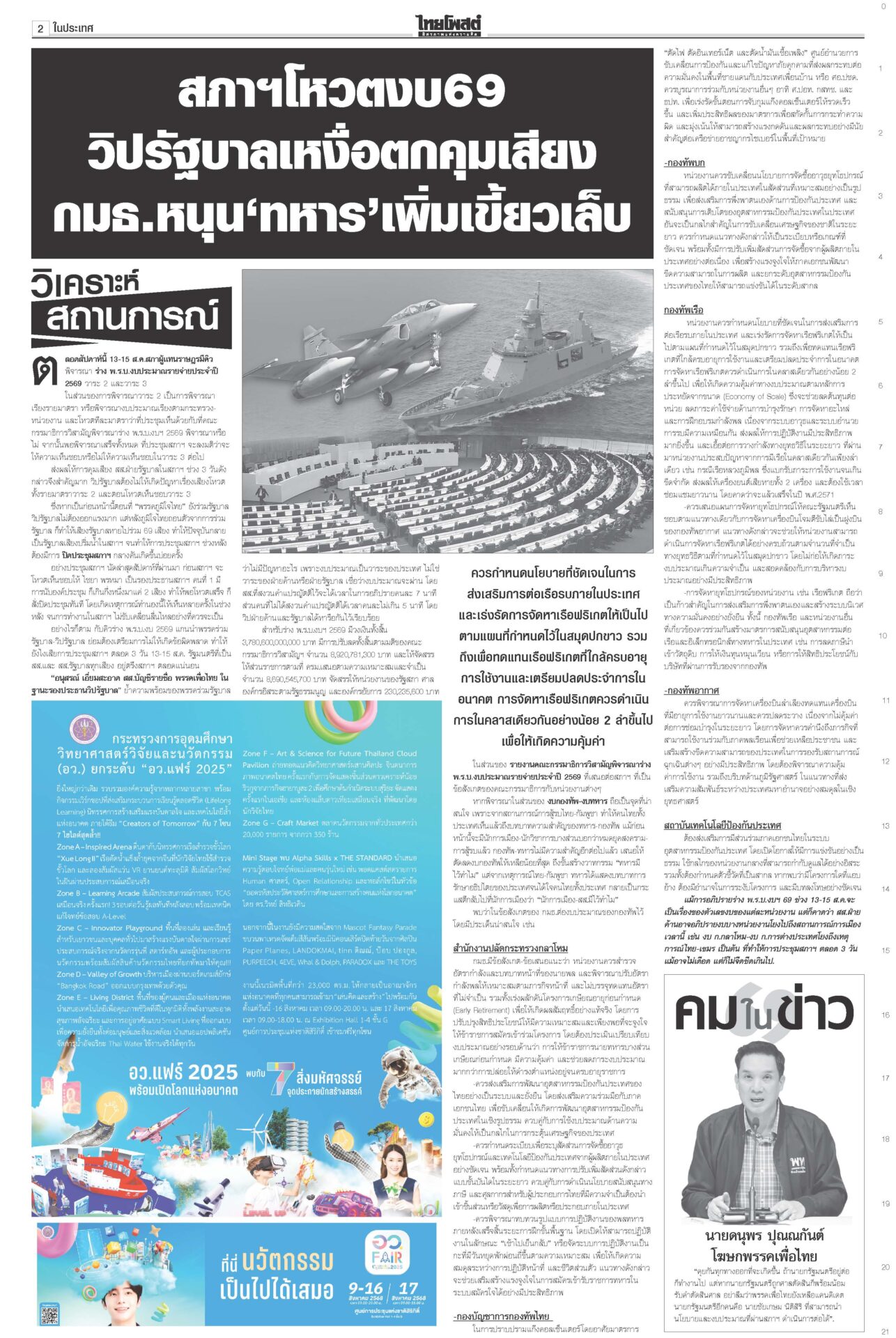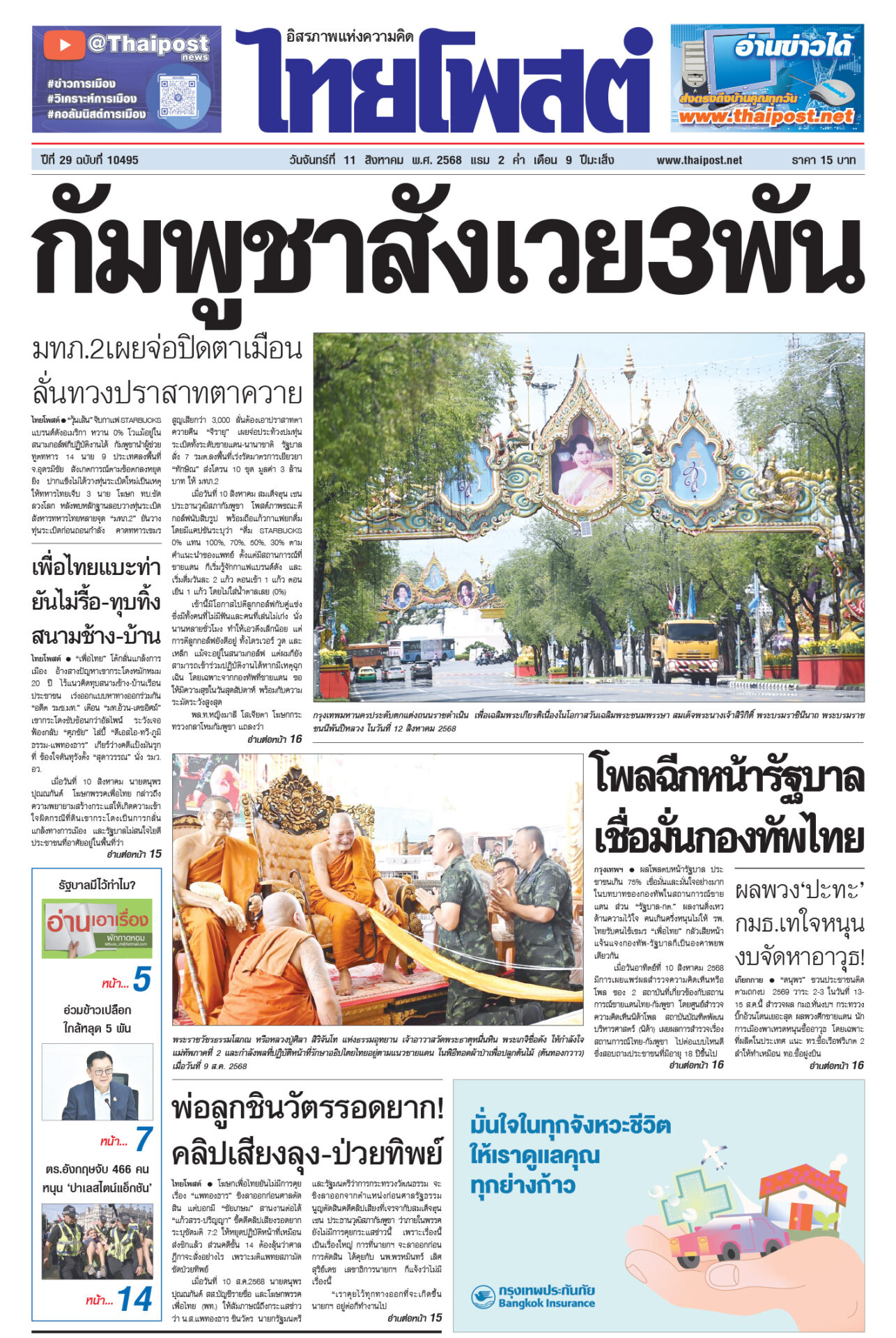 หนังสือพิมพ์ ฉบับวันที่ 11 สิงหาคม 2568ข่าวหน้าหนึ่งกัมพูชาสังเวย3พัน มทภ.2เผยจ่อปิดตาเมือน ลั่นทวงปราสาทตาควาย“วุ้นเส้น” จิบกาแฟ STARBUCKS แบรนด์ดังอเมริกา หวาน 0% เพื่อไทยแบะท่า ยันไม่รื้อ-ทุบทิ้ง สนามช้าง-บ้าน“เพื่อไทย” โต้กลั่นแกล้งการเมือง อ้างสางปัญหาเขากระโดงหมักหมม 20 ปี ผลพวง‘ปะทะ’ กมธ.เทใจหนุน งบจัดหาอาวุธ!“ดนุพร” ชวนประชาชนติดตามถกงบ 2569 วาระ 2-3 ในวันที่ 13-15 ส.ค.นี้ พ่อลูกชินวัตรรอดยาก! คลิปเสียงลุง-ป่วยทิพย์โฆษกเพื่อไทยยันไม่มีการคุยเรื่อง “แพทองธาร” ชิงลาออกก่อนศาลตัดสิน