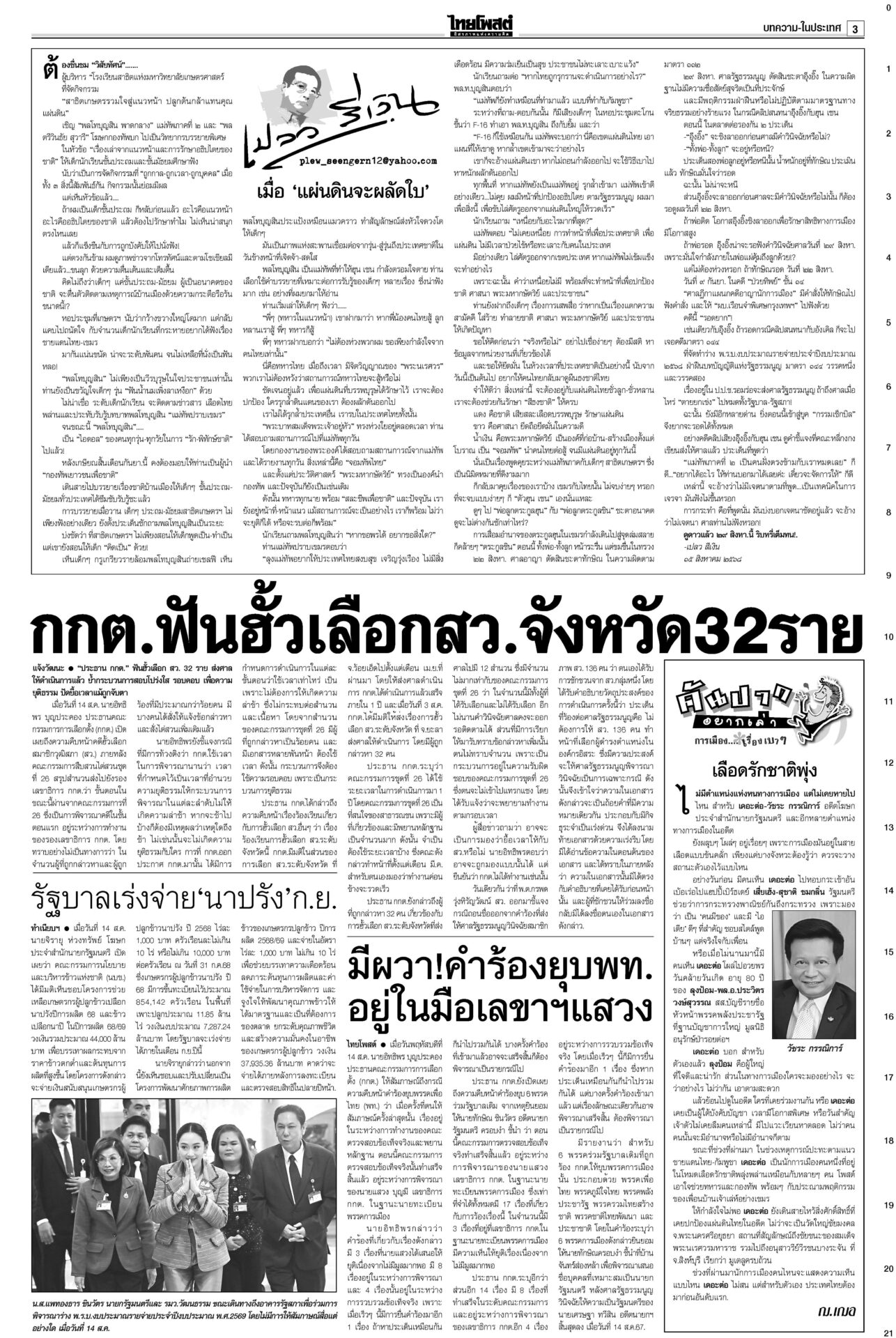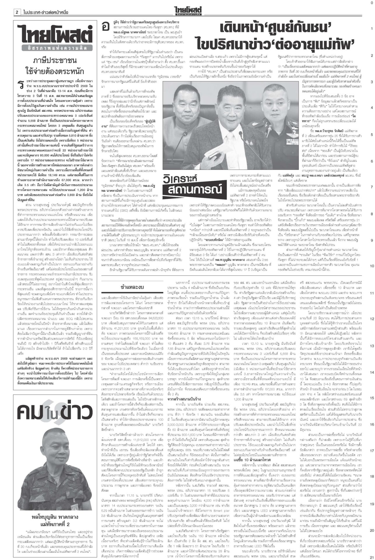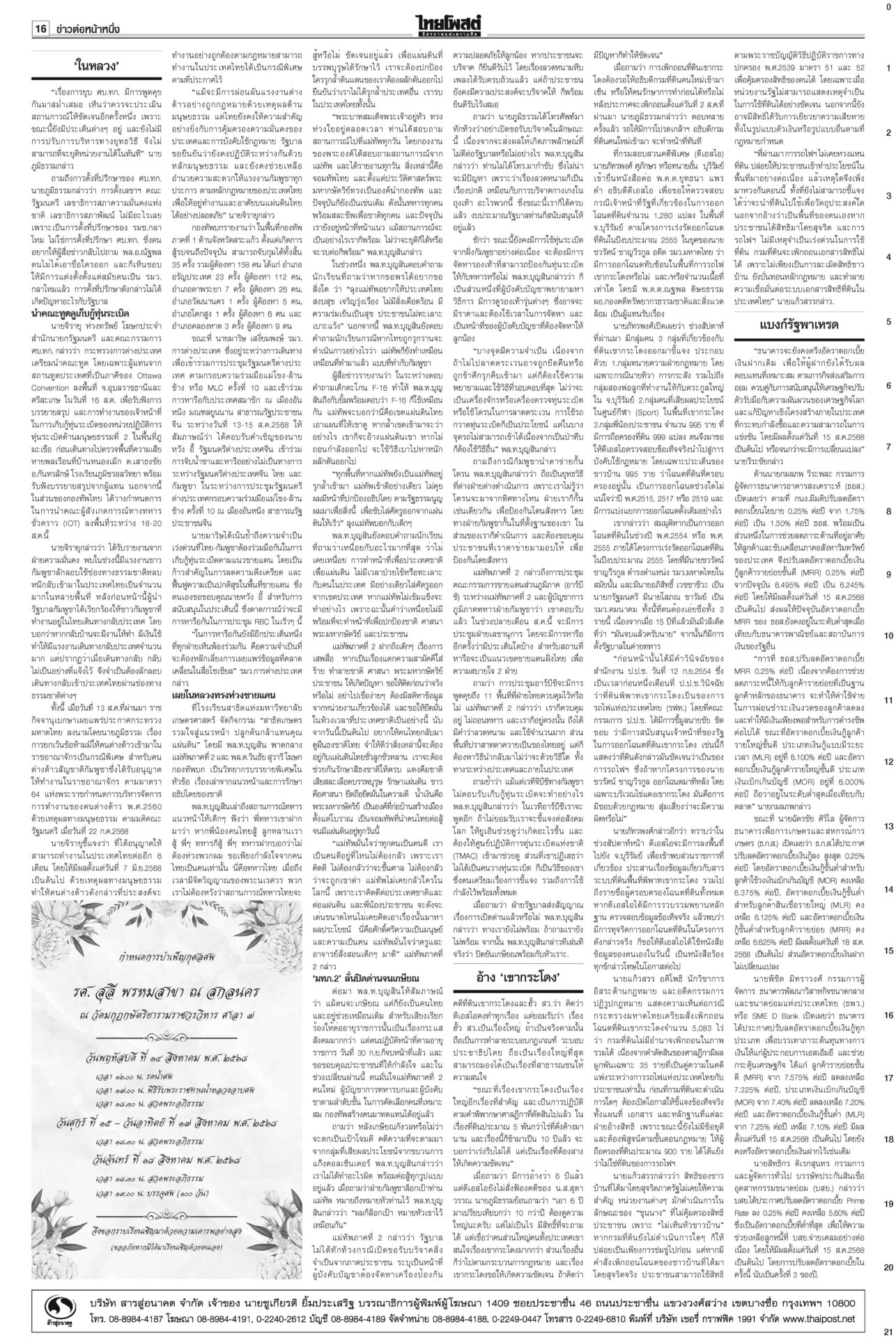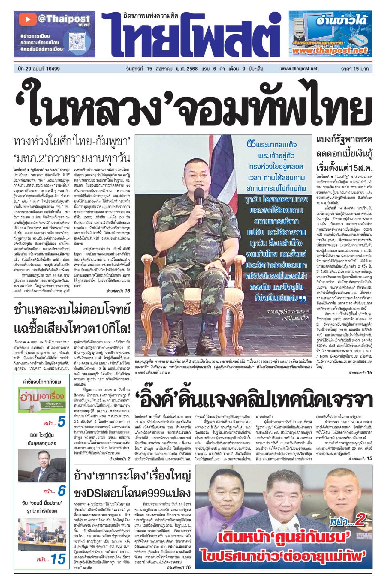 หนังสือพิมพ์ ฉบับวันที่ 15 สิงหาคม 2568ข่าวหน้าหนึ่ง‘ในหลวง’จอมทัพไทย ทรงห่วงใยศึก‘ไทย-กัมพูชา’ ‘มทภ.2’ถวายรายงานทุกวัน“ภูมิธรรม” รอ “สมช.” ประชุมประเมินยุบ “ศบ.ทก.” สัปดาห์หน้า ยันไร้ปัญหากับกองทัพ ชำแหละงบไม่ตอบโจทย์ แฉซื้อเสียงโหวต10กิโล!ถกงบ 69 วันที่ 2 “สส.ปชน.” ชำแหละงบ ก.เกษตรฯ ทำโครงการตลาดกลางที่ จ.พะเยาส่อผูกขาด ฉะ “ล้งแห่งชาติ” ‘อิ๊งค์’ดิ้นแจงคลิปเทคนิคเจรจา“อิ๊งค์” ยิ้มแย้มเข้าสภา บอก 21 ส.ค. นัดไต่สวนคดีคลิปเสียงตรงวันเกิดพอดี อ้าง‘เขากระโดง’เรื่องใหญ่ ชงDSIสอบโฉนด999แปลง“ภูมิธรรม” โต้ “ภูมิใจไทย” ยัน “ดีเอสไอ” เดินหน้าคดีบริษัท “รมว.อว.” แบงก์รัฐพาเหรด ลดดอกเบี้ยเงินกู้ เริ่มตั้งแต่15ส.ค.“แบงก์รัฐ” พาเหรดประกาศลดอัตราดอกเบี้ยเงินกู้ลง 0.25% ต่อปี
