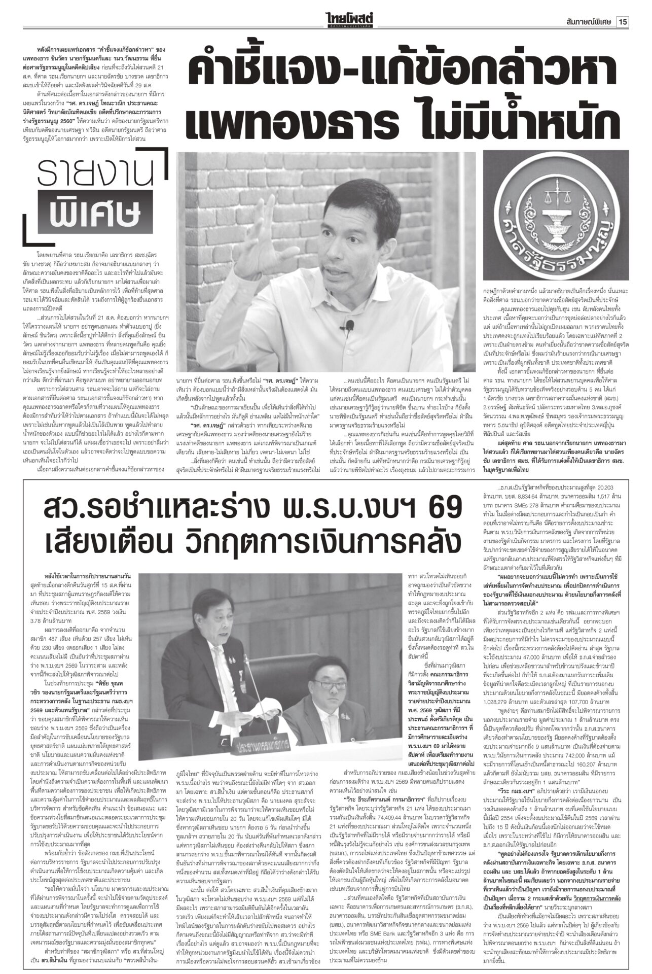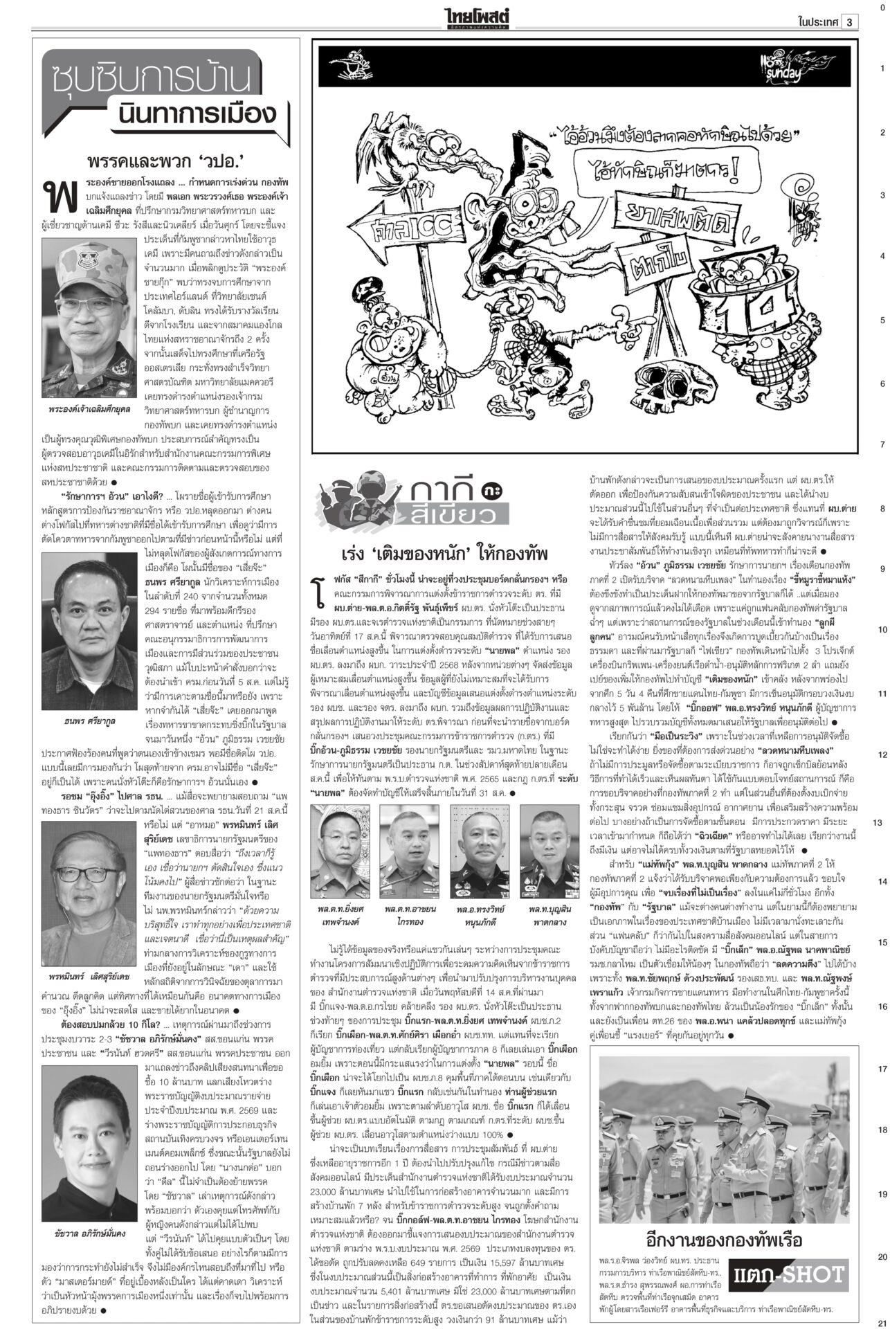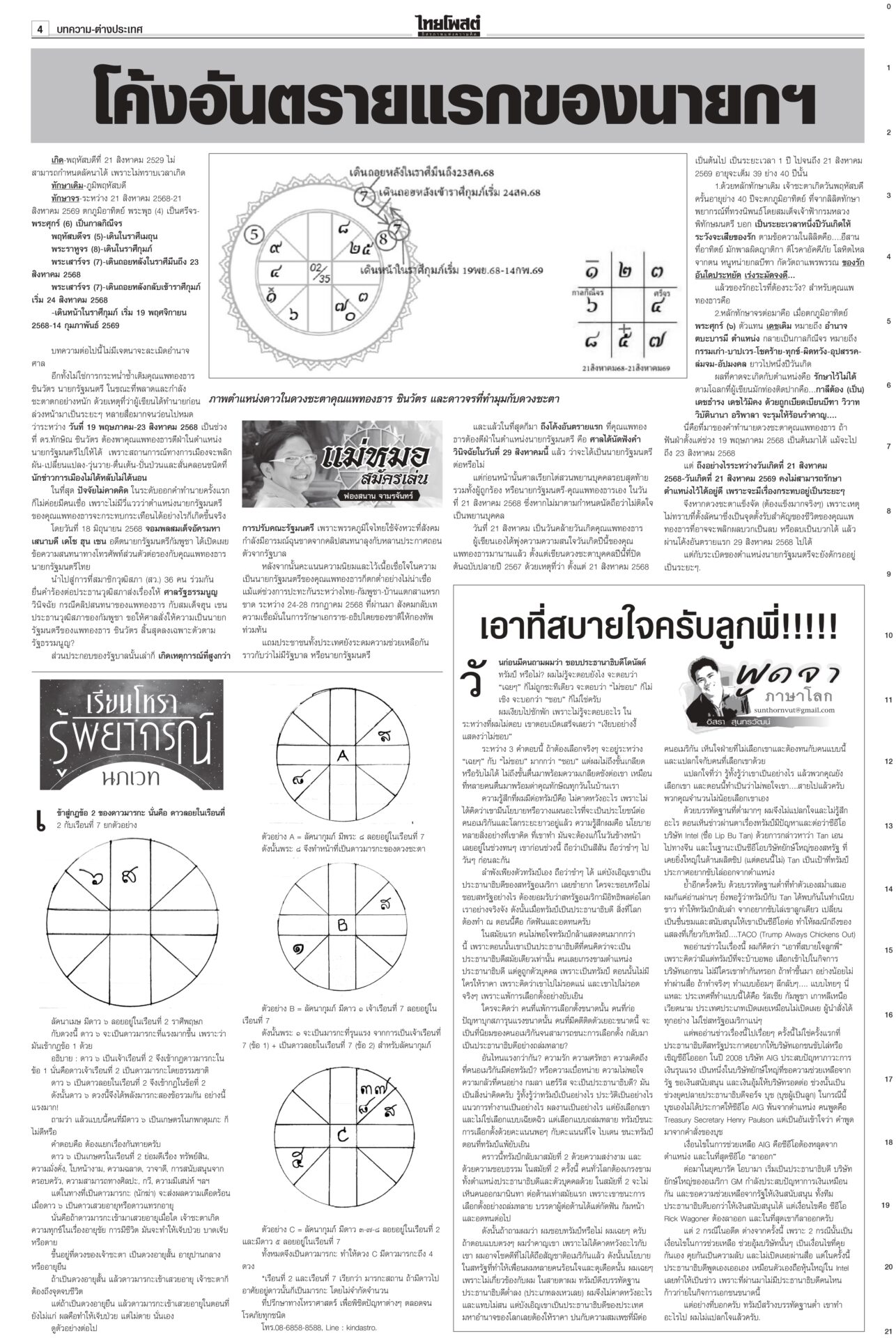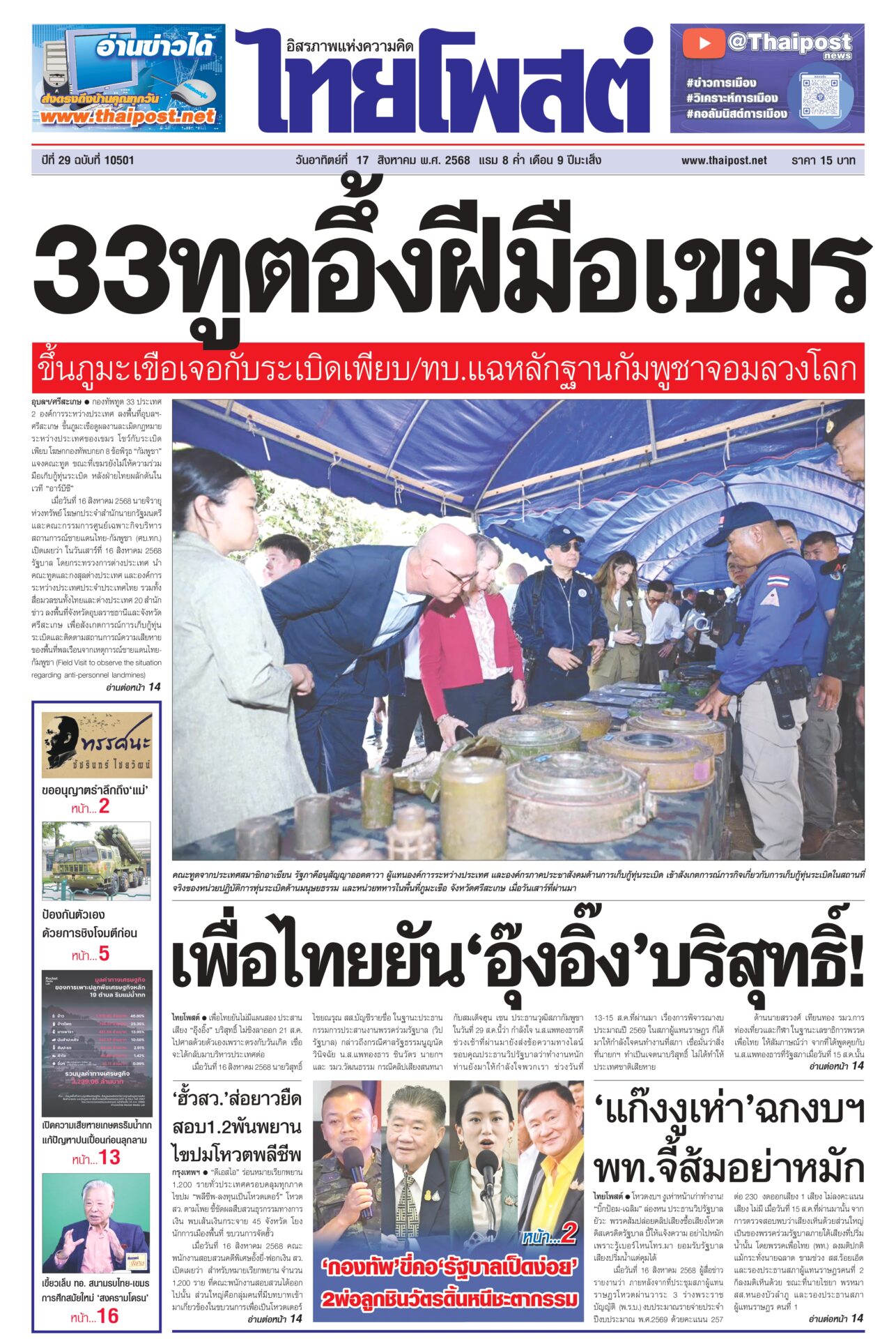 หนังสือพิมพ์ฉบับวันที่ 17 สิงหาคม 2568 ข่าวหน้าหนึ่ง33ทูตอึ้งฝีมือเขมร ขึ้นภูมะเขือเจอกับระเบิดเพียบ/ทบ.แฉหลักฐานกัมพูชาจอมลวงโลกกองทัพทูต 33 ประเทศ 2 องค์การระหว่างประเทศ ลงพื้นที่อุบลฯ-ศรีสะเกษ ขึ้นภูมะเขือดูผลงานละเมิดกฎหมายระหว่างประเทศของเขมร โชว์กับระเบิดเพียบ โฆษกกองทัพบกยก ‘แก๊งงูเห่า’ฉกงบฯ พท.จี้ส้มอย่าหมักโหวตงบฯ งูเห่าหน้าเก่าทำงาน! “บิ๊กป้อม-เฉลิม” ล่องหน ประธานวิปรัฐบาลยัวะ พรรคส้มปล่อยคลิปเสียงซื้อเสียงโหวต ดิสเครดิตรัฐบาล บี้ให้แจ้งความ อย่าไปหมัก ‘ฮั้วสว.’ ส่อยาวยืด สอบ1.2พันพยาน ไขปมโหวตพลีชีพ“ดีเอสไอ” ร่อนหมายเรียกพยาน 1,200 รายทั่วประเทศครอบคลุมทุกภาค ไขปม “พลีชีพ-ลงทุนเป็นโหวตเตอร์” โหวต สว.ตามโพย ชี้ชัดผลสืบสวนธุรกรรมทางการเงิน เพื่อไทยยัน‘อุ๊งอิ๊ง’บริสุทธิ์!เพื่อไทยยันไม่มีแผนสอง ประสานเสียง “อุ๊งอิ๊ง” บริสุทธิ์ ไม่ชิงลาออก 21 ส.ค.ไปศาลด้วยตัวเองเพราะตรงกับวันเกิด เชื่อจะได้กลับมาบริหารประเทศต่อ