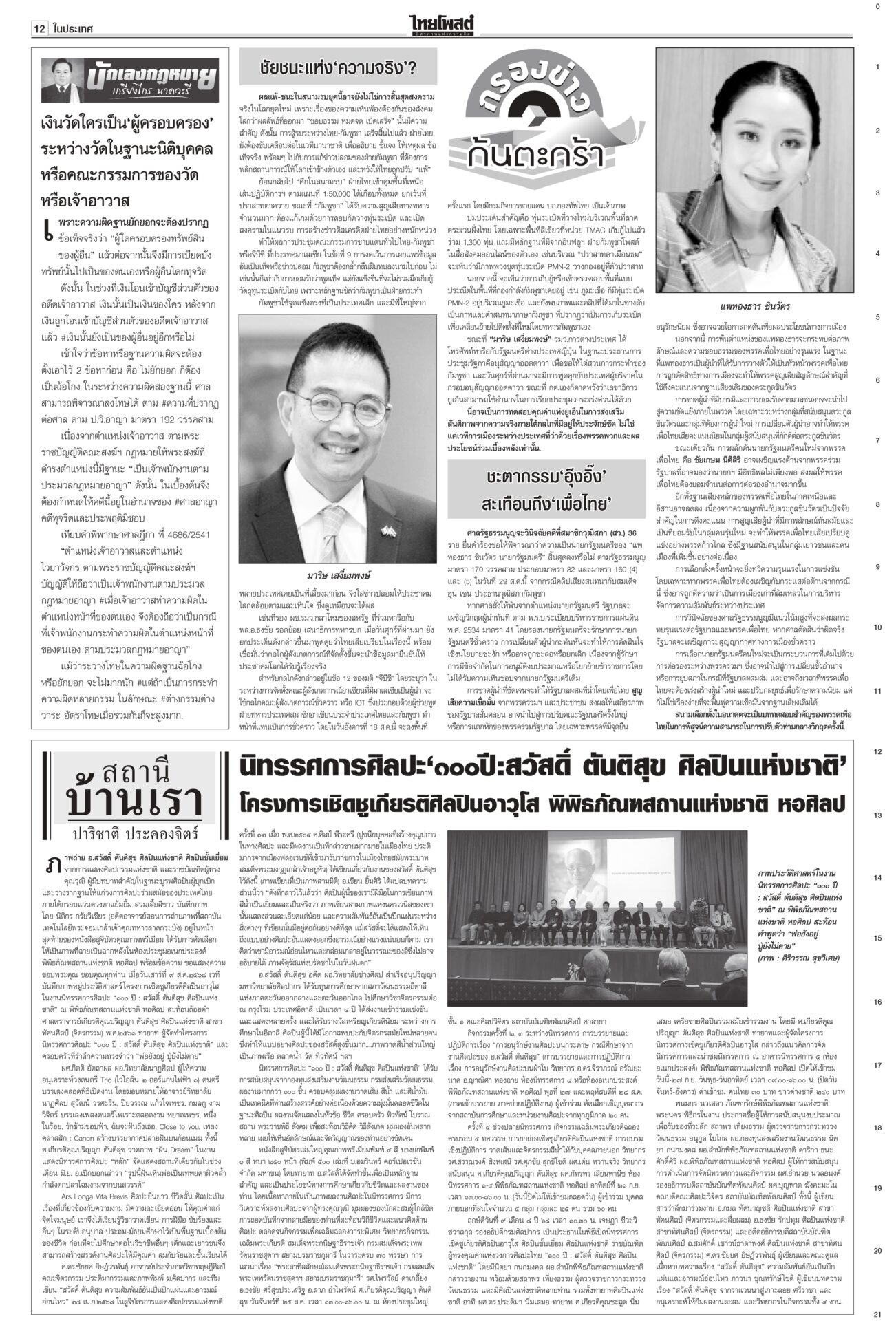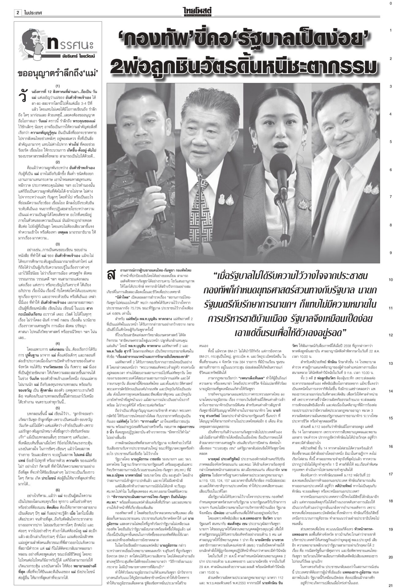 ฉบับวันที่ 17 สิงหาคม 2568 17 สิงหาคม 2568 เวลา 0:01 น. หนังสือพิมพ์ฉบับวันที่ 17 สิงหาคม 2568 ข่าวหน้าหนึ่ง33ทูตอึ้งฝีมือเขมร ขึ้นภูมะเขือเจอกับระเบิดเพียบ/ทบ.แฉหลักฐานกัมพูชาจอมลวงโลกกองทัพทูต 33 ประเทศ 2 องค์การระหว่างประเทศ ลงพื้นที่อุบลฯ-ศรีสะเกษ ขึ้นภูมะเขือดูผลงานละเมิดกฎหมายระหว่างประเทศของเขมร โชว์กับระเบิดเพียบ โฆษกกองทัพบกยก ‘แก๊งงูเห่า’ฉกงบฯ พท.จี้ส้มอย่าหมักโหวตงบฯ งูเห่าหน้าเก่าทำงาน! “บิ๊กป้อม-เฉลิม” ล่องหน ประธานวิปรัฐบาลยัวะ พรรคส้มปล่อยคลิปเสียงซื้อเสียงโหวต ดิสเครดิตรัฐบาล บี้ให้แจ้งความ อย่าไปหมัก ‘ฮั้วสว.’ ส่อยาวยืด สอบ1.2พันพยาน ไขปมโหวตพลีชีพ“ดีเอสไอ” ร่อนหมายเรียกพยาน 1,200 รายทั่วประเทศครอบคลุมทุกภาค ไขปม “พลีชีพ-ลงทุนเป็นโหวตเตอร์” โหวต สว.ตามโพย ชี้ชัดผลสืบสวนธุรกรรมทางการเงิน เพื่อไทยยัน‘อุ๊งอิ๊ง’บริสุทธิ์!เพื่อไทยยันไม่มีแผนสอง ประสานเสียง “อุ๊งอิ๊ง” บริสุทธิ์ ไม่ชิงลาออก 21 ส.ค.ไปศาลด้วยตัวเองเพราะตรงกับวันเกิด เชื่อจะได้กลับมาบริหารประเทศต่อ Tagsรายวันหนังสือพิมพ์ ข่าวที่เกี่ยวข้อง ฉบับวันที่ 6 ธันวาคม 2568 ฉบับวันที่ 5 ธันวาคม 2568 ฉบับวันที่ 4 ธันวาคม 2568 ฉบับวันที่ 3 ธันวาคม 2568 ฉบับวันที่ 2 ธันวาคม 2568 ฉบับวันที่ 1 ธันวาคม 2568 NEWS UPDATE 0:42 น. 'DUMB.RONG' ค่าย 'tiny' ส่งซิงเกิล 'SUNRISE' พร้อม MV สุดปั่น 0:37 น. 'เบนท์ กิตติธัช' จาก 'Kicks Records' ปล่อย 'กาฬสินธุ์ บลูส์' แนวดนตรีใหม่ที่โตขึ้น 18:43 น. ในหลวง พระราชินี ทรงบำเพ็ญพระราชกุศลทักษิณานุปทาน เนื่องในวันคล้ายวันพระบรมราชสมภพ รัชกาลที่ 9 18:12 น. เริ่มแล้ว Cat Expo Thailand 2025 วันแรก 'ทาสแมว' แห่ร่วมงานคึกคักคาดเม็ดเงินสะพัด 120 ล้านบาท 18:06 น. กรมอุตุฯ เผยพายุลูกใหม่กำลังก่อตัวบริเวณทะเลจีนใต้ตอนกลาง