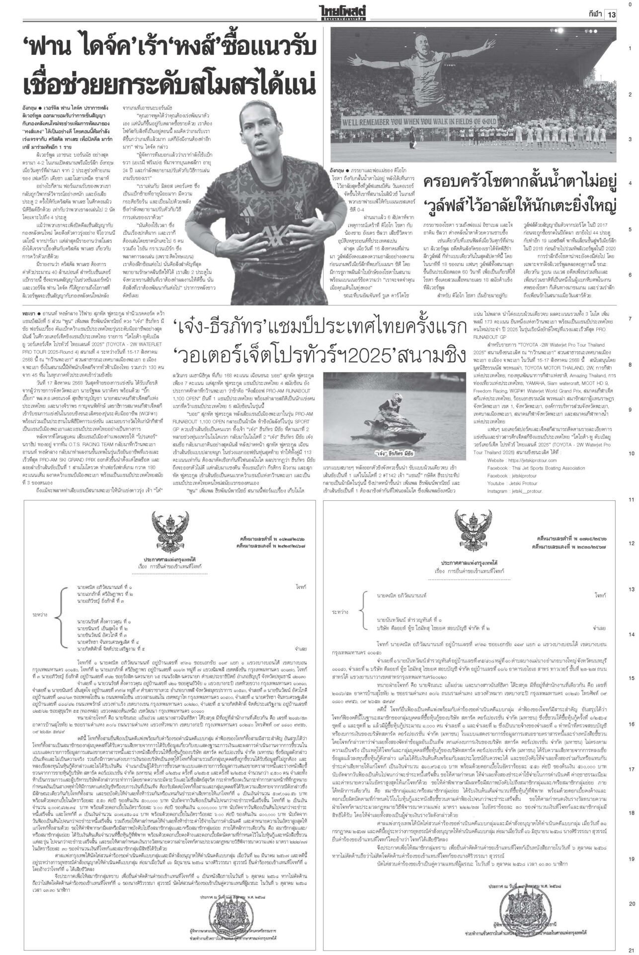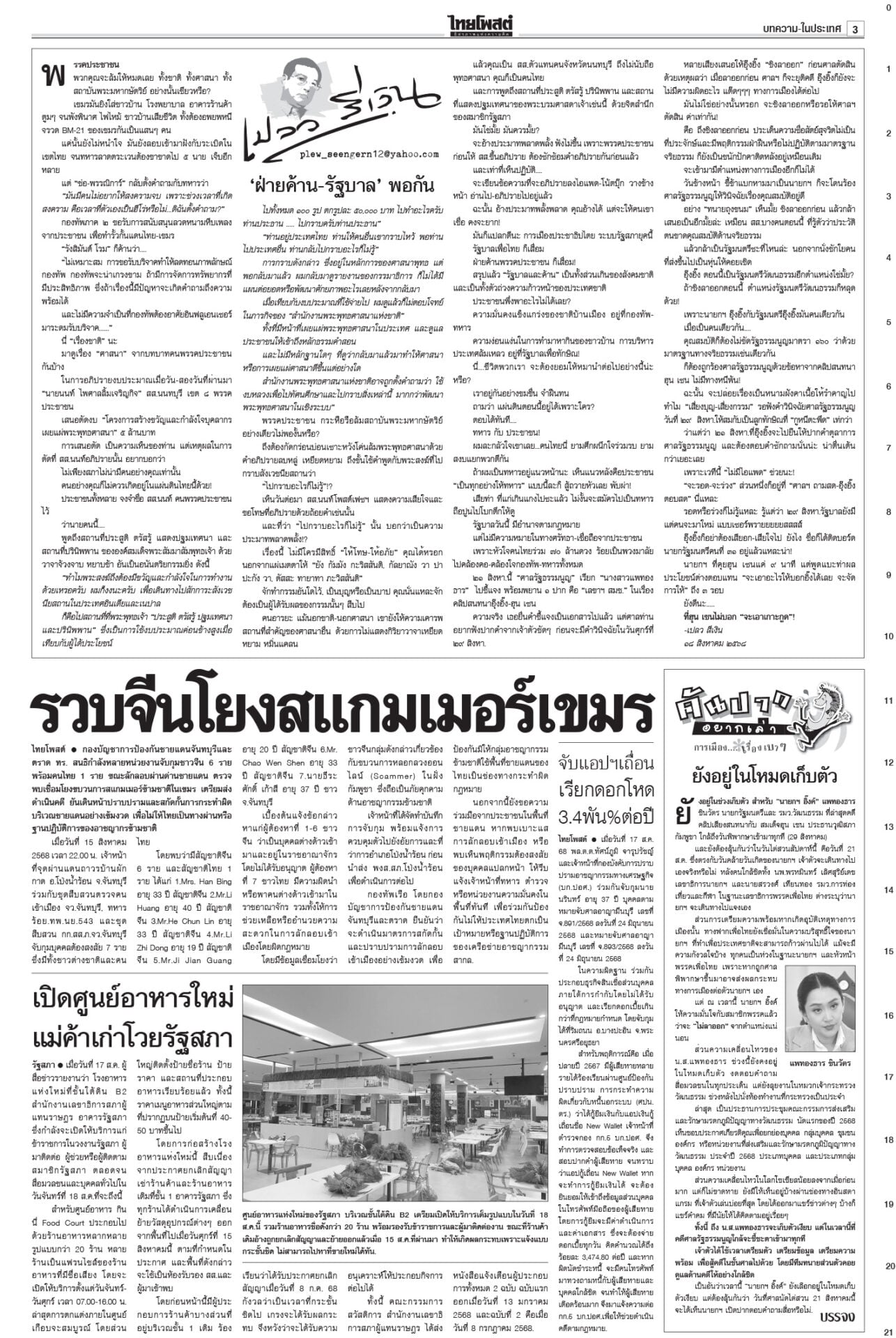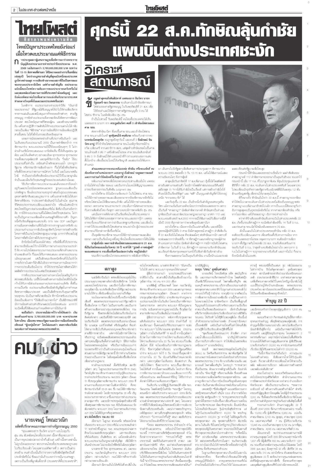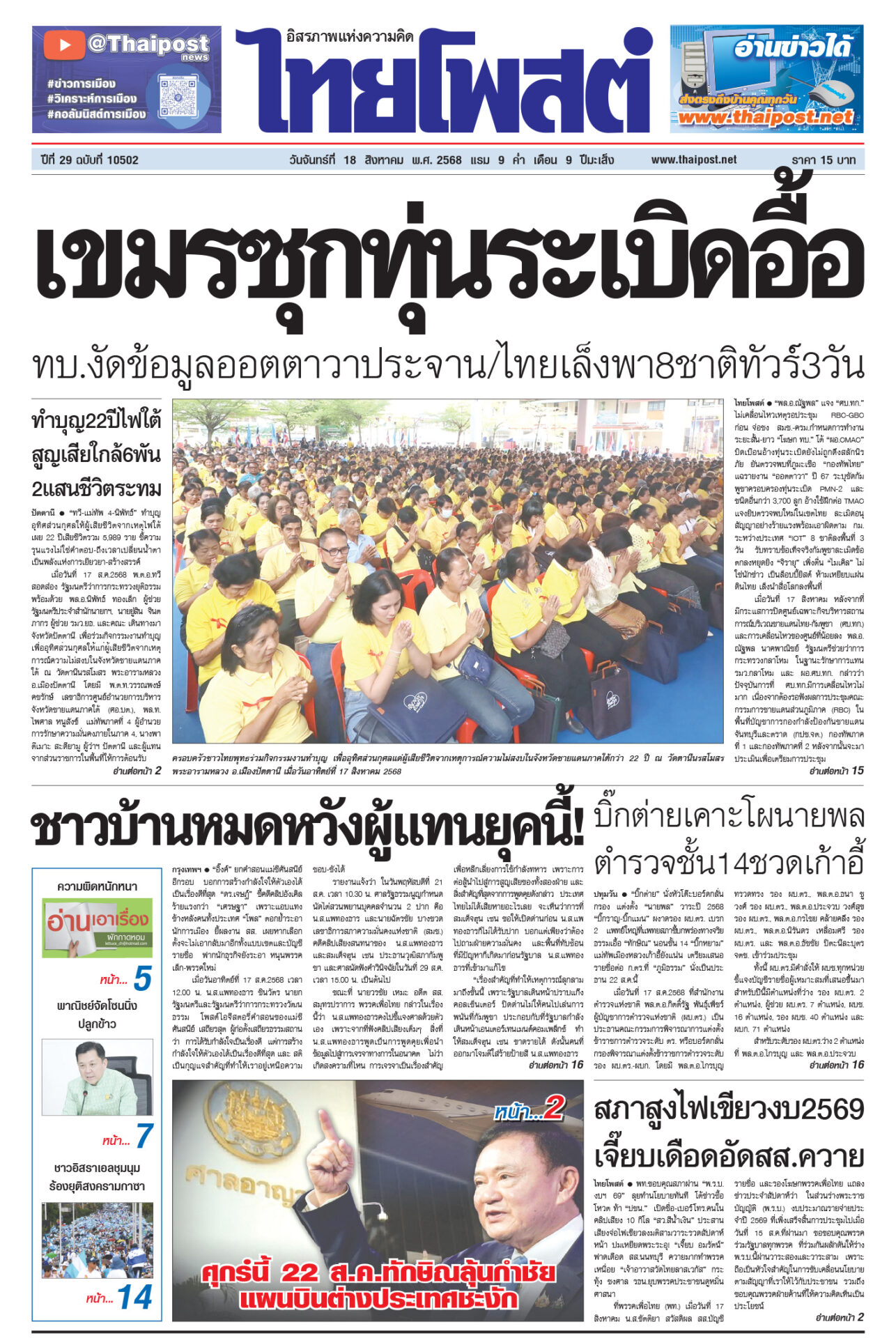 หนังสือพิมพ์ ฉบับวันที่ 18 สิงหาคม 2568ข่าวหน้าหนึ่งเขมรซุกทุ่นระเบิดอื้อ ทบ.งัดข้อมูลออตตาวาประจาน/ไทยเล็งพา8ชาติทัวร์3วัน“พล.อ.ณัฐพล” แจง “ศบ.ทก.” ไม่เคลื่อนไหวเหตุรอประชุม RBC-GBC ก่อนจ่อชง สมช.-ครม.กำหนดการทำงานระยะสั้น-ยาว ชาวบ้านหมดหวังผู้แทนยุคนี้!“อิ๊งค์” ยกคำสอนแม่ชีศันสนีย์อีกรอบ บอกการสร้างกำลังใจให้ตัวเองได้เป็นเรื่องดีที่สุด สภาสูงไฟเขียวงบ2569 เจี๊ยบเดือดอัดสส.ควายพท.ขอบคุณสภาผ่าน “พ.ร.บ.งบฯ 69” ลุยทำนโยบายทันที โต้ข่าวซื้อโหวต ผบ.ตร.เคาะโผนายพล ตำรวจชั้น14ชวดเก้าอี้“บิ๊กต่าย” นั่งหัวโต๊ะบอร์ดกลั่นกรอง แต่งตั้ง “นายพล” วาระปี 2568 ทำบุญ22ปีไฟใต้ สูญเสียใกล้6พัน 2แสนชีวิตระทม“ทวี-แม่ทัพ 4-นิพัทธ์” ทำบุญอุทิศส่วนกุศลให้ผู้เสียชีวิตจากเหตุไฟใต้ เผย 22 ปีเสียชีวิตรวม 5,989 ราย