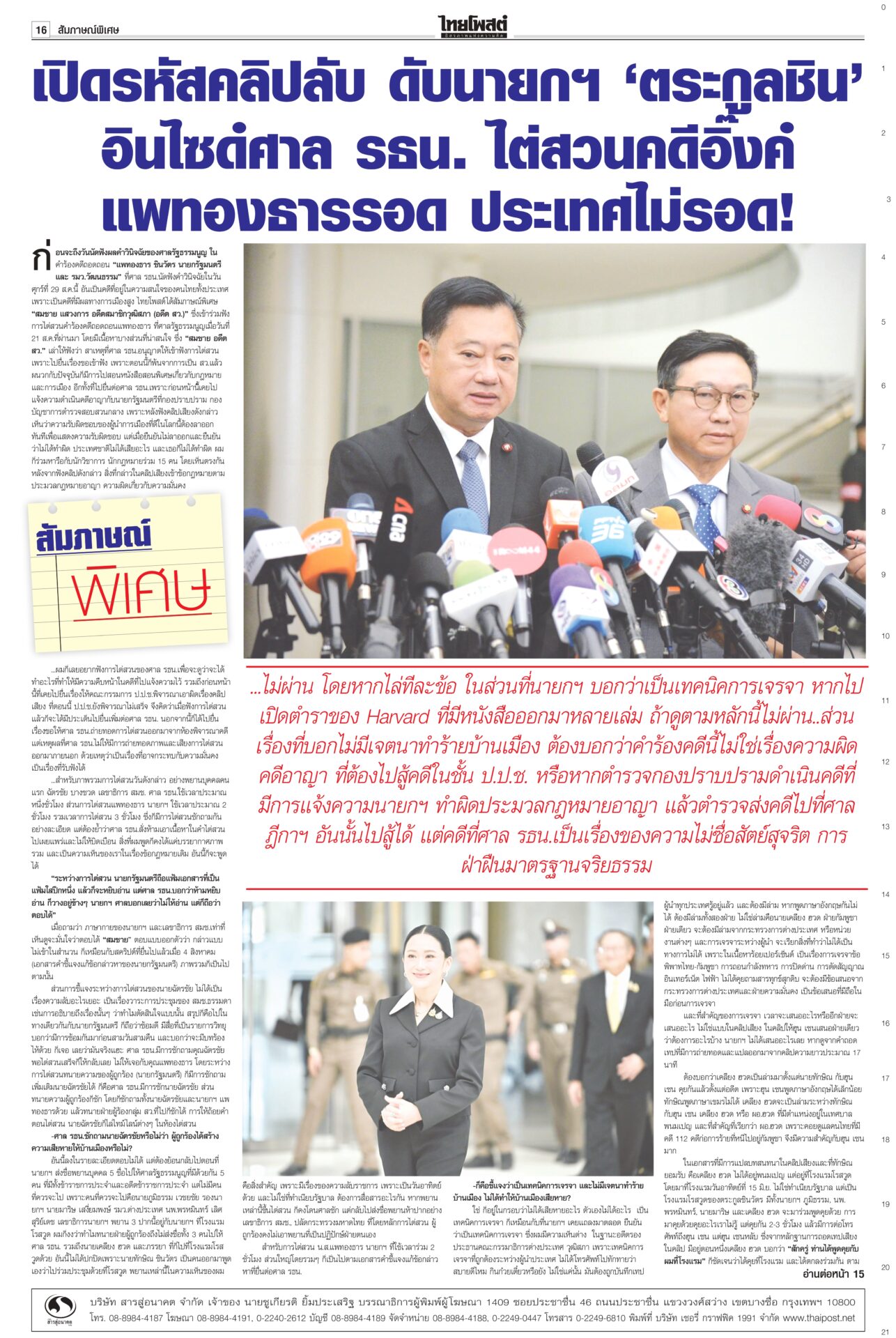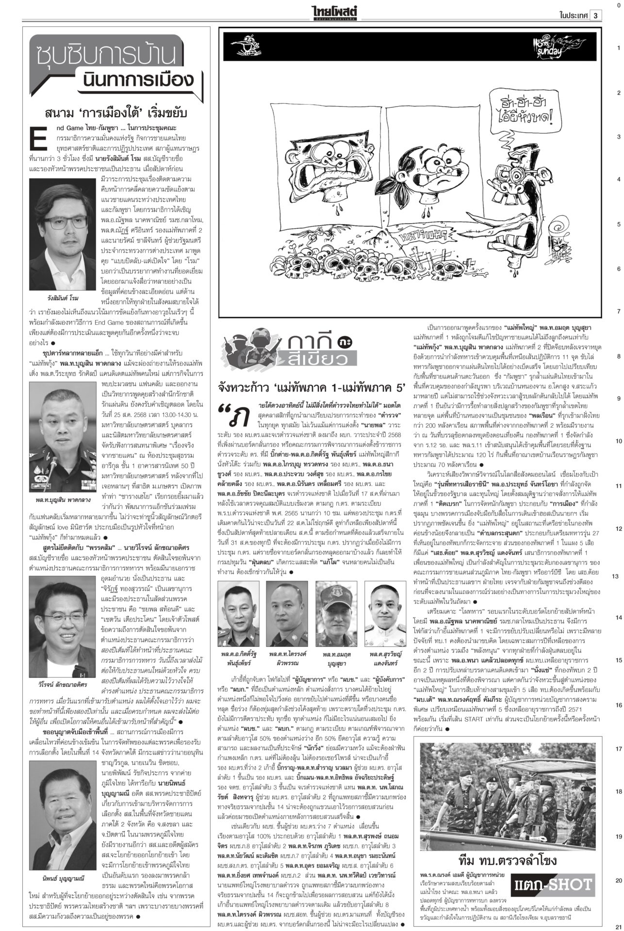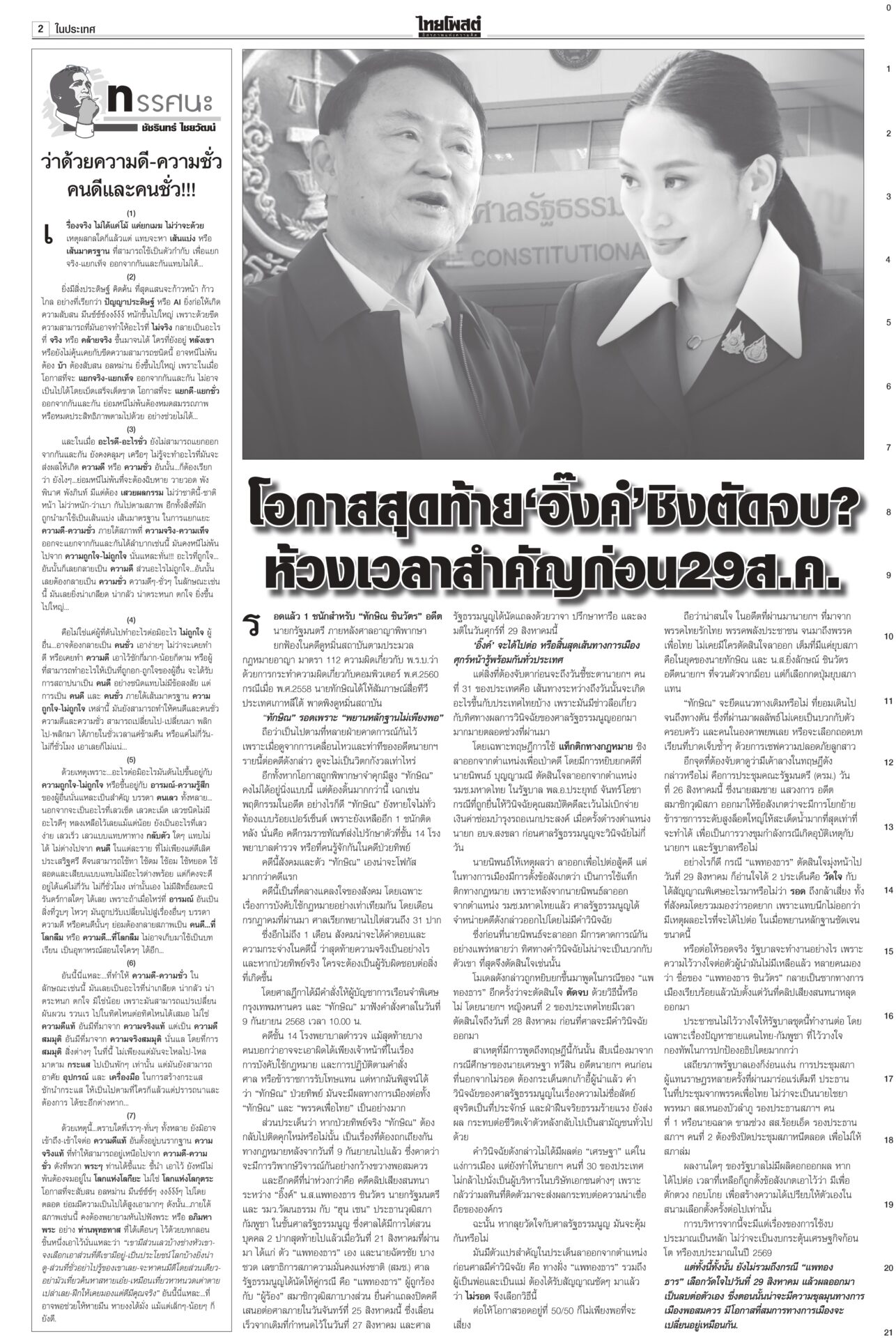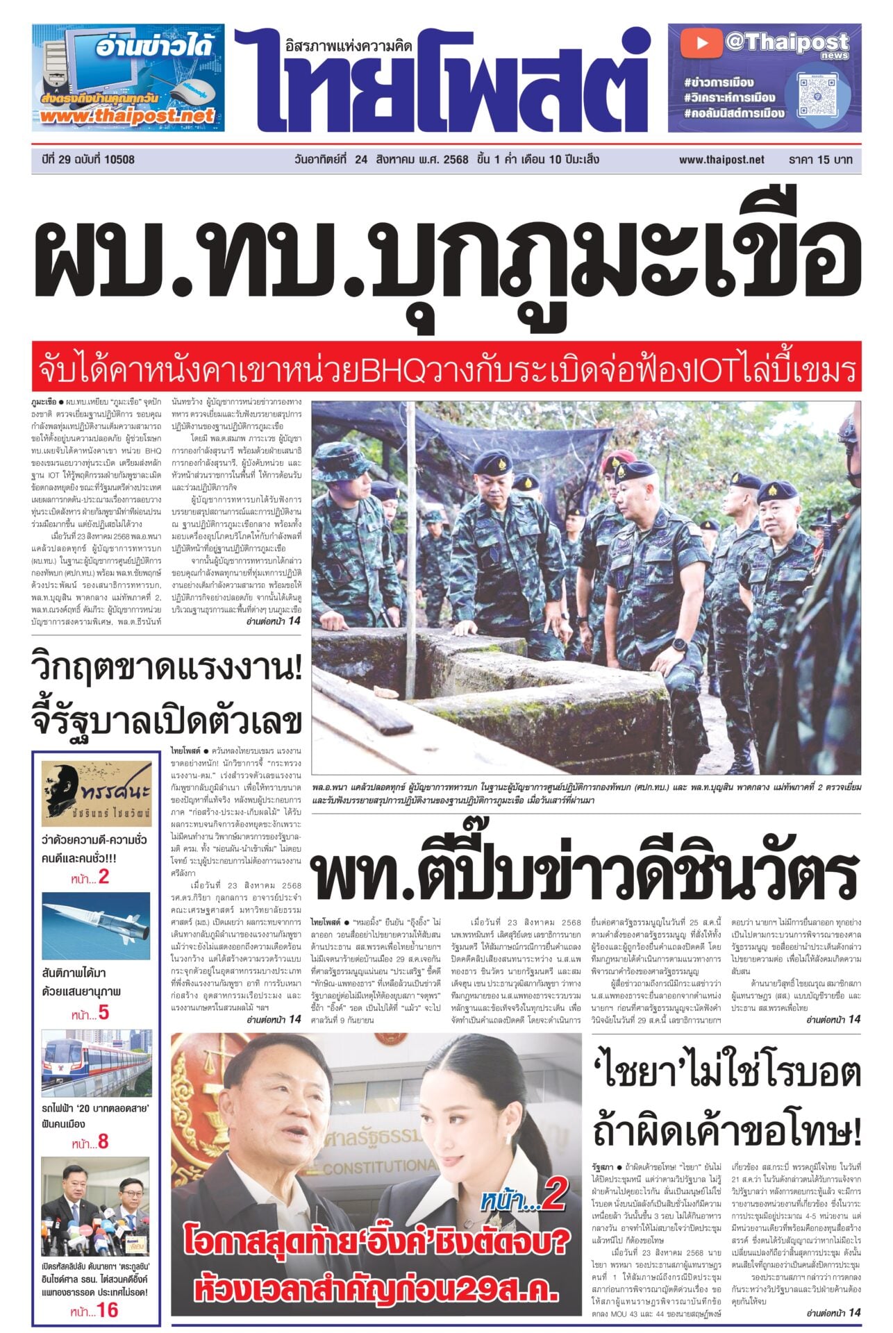 หนังสือพิมพ์ฉบับวันที่ 24 สิงหาคม 2568 ข่าวหน้าหนึ่งผบ.ทบ.บุกภูมะเขือ จับได้คาหนังคาเขาหน่วยBHQวางกับระเบิดจ่อฟ้องIOTไล่บี้เขมรผบ.ทบ.เหยียบ “ภูมะเขือ” จุดปักธงชาติ ตรวจเยี่ยมฐานปฏิบัติการ ขอบคุณกำลังพลทุ่มเทปฏิบัติงานเต็มความสามารถ ขอให้ตั้งอยู่บนความปลอดภัย ผู้ช่วยโฆษก ทบ.เผยจับได้คาหนังคาเขา พท.ตีปี๊บข่าวดีชินวัตร“หมอมิ้ง” ยืนยัน “อุ๊งอิ๊ง” ไม่ลาออก วอนสื่ออย่าไปขยายความให้สับสน ด้านประธาน สส.พรรคเพื่อไทยย้ำนายกฯ ไม่มีเจตนาร้ายต่อบ้านเมือง 29 ส.ค.เจอกันที่ศาลรัฐธรรมนูญแน่นอน ‘ไชยา’ไม่ใช่โรบอต ถ้าผิดเค้าขอโทษ!ถ้าผิดเค้าขอโทษ! “ไชยา” ยันไม่ได้ปิดประชุมหนี แต่ว่าตามวิปรัฐบาล ไม่รู้ฝ่ายค้านไปคุยอะไรกัน ลั่นเป็นมนุษย์ไม่ใช่โรบอต นั่งบนบัลลังก์เป็นสิบชั่วโมงก็มีความเหนื่อยล้า วิกฤตขาดแรงงาน! จี้รัฐบาลเปิดตัวเลขควันหลงไทยรบเขมร แรงงานขาดอย่างหนัก! นักวิชาการจี้ “กระทรวงแรงงาน-ตม.” เร่งสำรวจตัวเลขแรงงานกัมพูชากลับภูมิลำเนา เพื่อให้ทราบขนาดของปัญหาที่แท้จริง