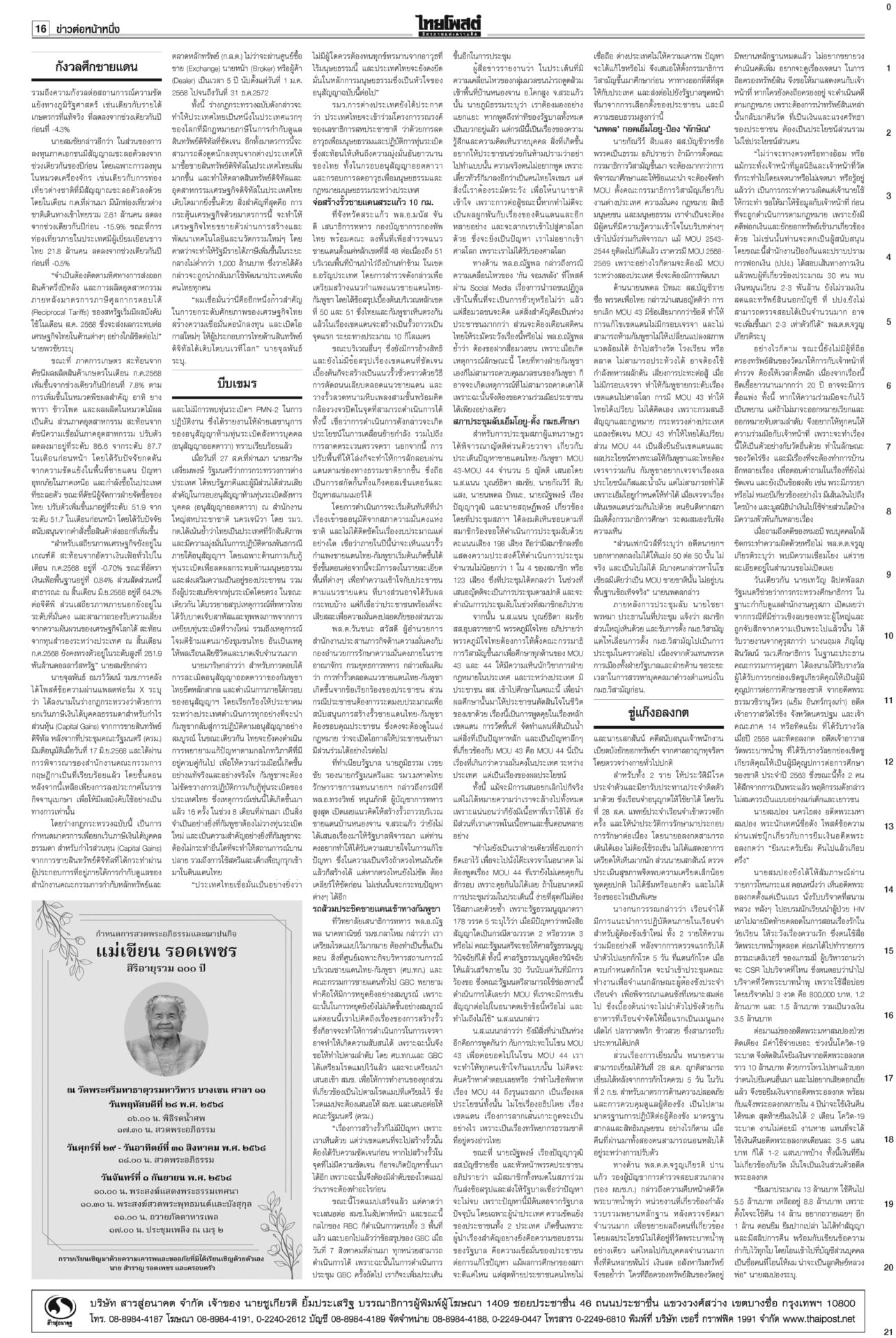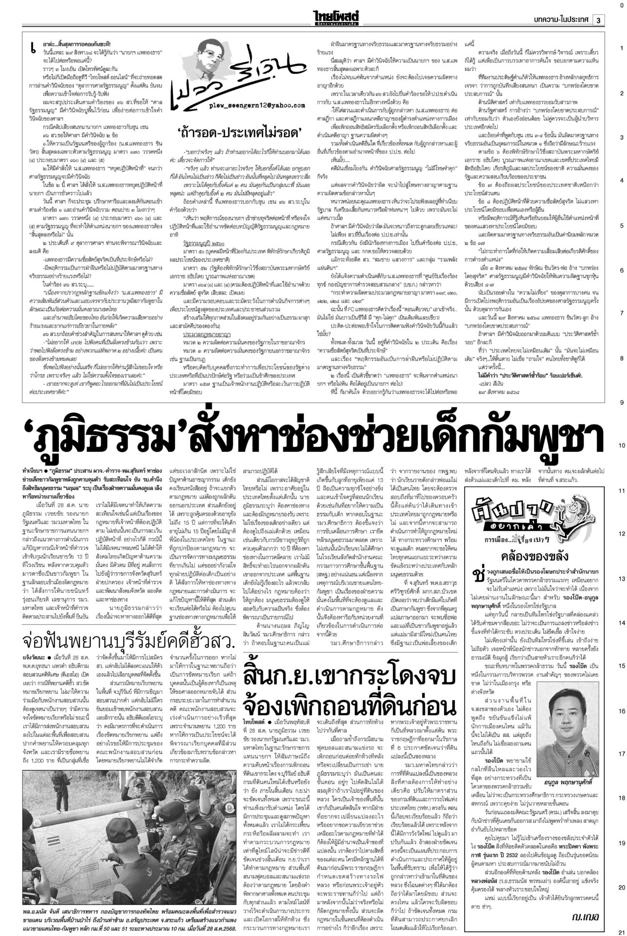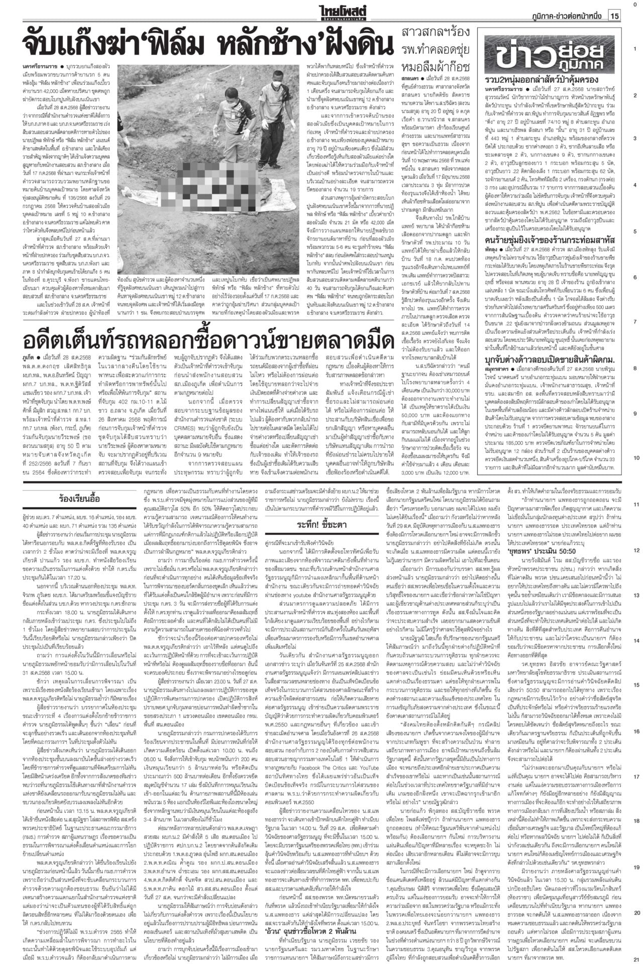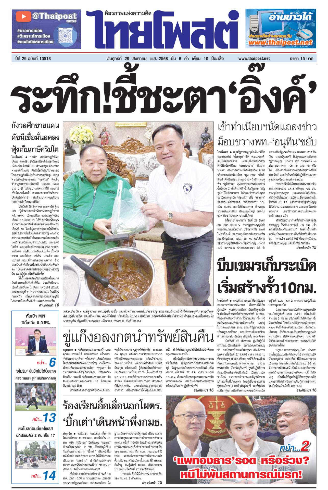 หนังสือพิมพ์ ฉบับวันที่ 29 สิงหาคม 2568ข่าวหน้าหนึ่งระทึก!ชี้ชะตา‘อิ๊งค์’ เข้าทำเนียบฯนัดแถลงข่าว ม็อบขวางพท.-‘อนุทิน’ขยับศาลรัฐธรรมนูญดำเนินคดีสื่อเผยแพร่คลิป “นั่งลงลูก” ผิด พ.ร.บ.คอมพ์-ละเมิดอำนาจศาล เตรียมนั่งบัลลังก์อ่านคำวินิจฉัยคดีร้อง บีบเขมรเก็บระเบิด เริ่มสร้างรั้ว10กม.กต.เดินสายคุยภาคีอนุสัญญาออตตาวาร่วมกดดันเขมร เปิดทางให้เก็บกู้ระเบิด ร้องเรียนอื้อเลื่อนถกโผตร. ‘บิ๊กเต่า’เดินหน้าพึ่งกมธ.วงประชุม ก.ตร.ล่ม! เลื่อนถกโผแต่งตั้งรอง ผบ.ตร.-ผบก. ออกไปเป็น 31 ส.ค. กังวลศึกชายแดน ดัชนีเชื่อมั่นลดลง ฟุ้งเก็บภาษีคริปโต“คลัง” เผยเศรษฐกิจไทยเดือน ก.ค.68 ยังรับอานิสงส์ส่งออกโตต่อเนื่องเป็นเดือนที่ 13 ส่วนลงทุน-ท่องเที่ยวต่างชาติเริ่มแผ่ว ขู่แก๊งอลงกตนำทรัพย์สินคืน“อดีตพระอลงกต-หมอบี” นอนคุกคืนแรกหลับได้ กำลังปรับตัว มีโรคประจำตัวพกยามาด้วย