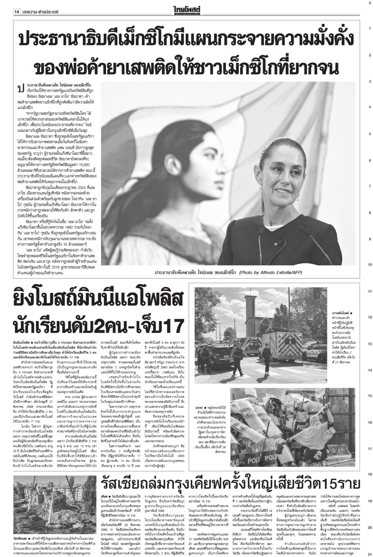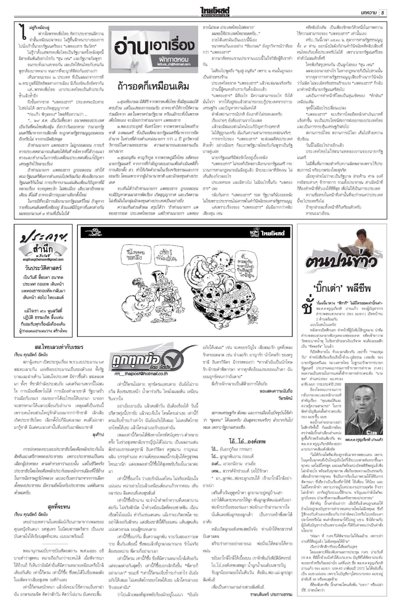 ฉบับวันที่ 29 สิงหาคม 2568 29 สิงหาคม 2568 เวลา 0:01 น. หนังสือพิมพ์ ฉบับวันที่ 29 สิงหาคม 2568ข่าวหน้าหนึ่งระทึก!ชี้ชะตา‘อิ๊งค์’ เข้าทำเนียบฯนัดแถลงข่าว ม็อบขวางพท.-‘อนุทิน’ขยับศาลรัฐธรรมนูญดำเนินคดีสื่อเผยแพร่คลิป “นั่งลงลูก” ผิด พ.ร.บ.คอมพ์-ละเมิดอำนาจศาล เตรียมนั่งบัลลังก์อ่านคำวินิจฉัยคดีร้อง บีบเขมรเก็บระเบิด เริ่มสร้างรั้ว10กม.กต.เดินสายคุยภาคีอนุสัญญาออตตาวาร่วมกดดันเขมร เปิดทางให้เก็บกู้ระเบิด ร้องเรียนอื้อเลื่อนถกโผตร. ‘บิ๊กเต่า’เดินหน้าพึ่งกมธ.วงประชุม ก.ตร.ล่ม! เลื่อนถกโผแต่งตั้งรอง ผบ.ตร.-ผบก. ออกไปเป็น 31 ส.ค. กังวลศึกชายแดน ดัชนีเชื่อมั่นลดลง ฟุ้งเก็บภาษีคริปโต“คลัง” เผยเศรษฐกิจไทยเดือน ก.ค.68 ยังรับอานิสงส์ส่งออกโตต่อเนื่องเป็นเดือนที่ 13 ส่วนลงทุน-ท่องเที่ยวต่างชาติเริ่มแผ่ว ขู่แก๊งอลงกตนำทรัพย์สินคืน“อดีตพระอลงกต-หมอบี” นอนคุกคืนแรกหลับได้ กำลังปรับตัว มีโรคประจำตัวพกยามาด้วย Tagsรายวันหนังสือพิมพ์ ข่าวที่เกี่ยวข้อง ฉบับวันที่ 5 ธันวาคม 2568 ฉบับวันที่ 4 ธันวาคม 2568 ฉบับวันที่ 3 ธันวาคม 2568 ฉบับวันที่ 2 ธันวาคม 2568 ฉบับวันที่ 1 ธันวาคม 2568 ฉบับวันที่ 30 พฤศจิกายน 2568 NEWS UPDATE 16:24 น. ผบ.ตร. ยกย่องหัวใจตำรวจภาคใต้ เสียสละช่วยเหลือประชาชน แม้ตนเองเป็นผู้ประสบภัย 16:15 น. 'อิ๊งค์' โพสต์ภาพคู่ 'ทักษิณ' สุขสันต์วันพ่อ อดทนไว้ เราจะได้ไปเที่ยวรอบโลกด้วยกัน 15:18 น. ปชน. ค้านนัดโหวตแก้ รธน. วาระ 3 หลังปีใหม่ หวั่นกระทบไทม์ไลน์ทำประชามติ 15:04 น. 'แม่ทัพกุ้ง' ลงใต้ ให้กำลังใจชาวหาดใหญ่ เยี่ยมเจ้าหน้าที่จิตอาสาเร่งฟื้นฟูเมือง 14:47 น. ปิดด่าน 5 เดือน การค้าชายแดนคลองใหญ่เสียหาย 5 พันล้าน สินค้าเถื่อนทะลัก วอนรัฐบาลเยียวยา