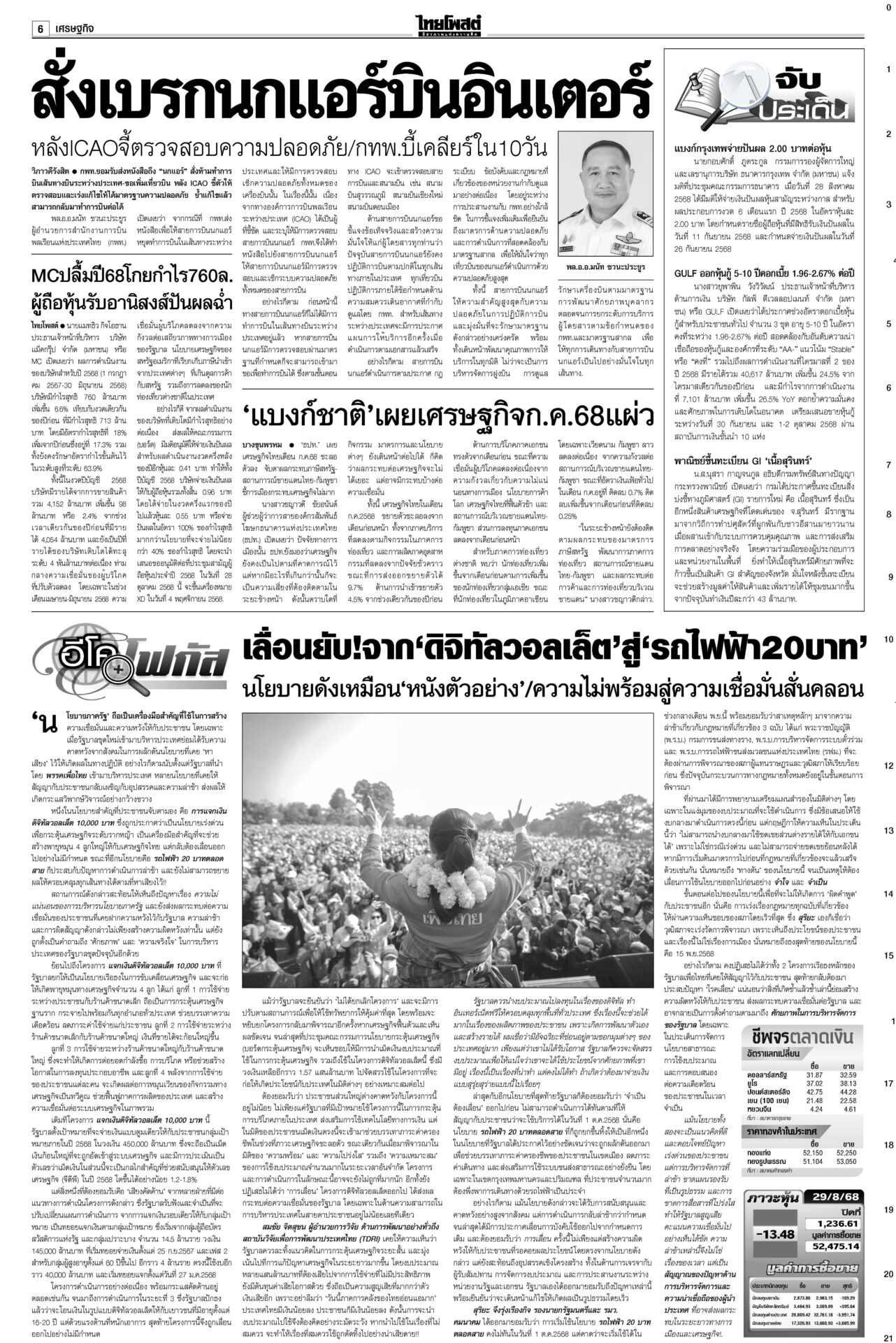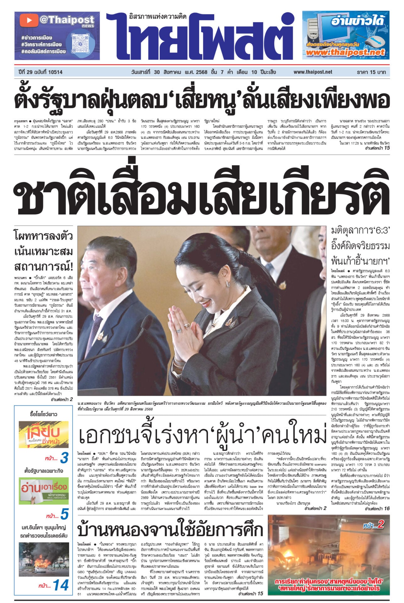 หนังสือพิมพ์ ฉบับวันที่ 30 สิงหาคม 2568ข่าวหน้าหนึ่งชาติเสื่อมเสียเกียรติ มติตุลาการ‘6:3’ อิ๊งค์ผิดจริยธรรม พ้นเก้าอี้‘นายกฯ’ศาลรัฐธรรมนูญลงมติ 6:3 ฟัน “แพทองธาร ชินวัตร” พ้นเก้าอี้นายกฯ ปมคลิปอังเคิล ตั้งรัฐบาลฝุ่นตลบ‘เสี่ยหนู’ลั่นเสียงเพียงพอฝุ่นตลบจัดตั้งรัฐบาล “ฉลาด” คาด 1-2 ก.ย.น่าจะได้นายกฯ ใหม่แล้ว โผทหารลงตัว เน้นเหมาะสม สถานการณ์!“บิ๊กเล็ก” เผยบอร์ด 6 เสือ กห. ลงนามโผทหาร ไฟเขียวตาม ผบ.เหล่าทัพเสนอ บ้านหนองจานใช้อัยการศึก“ในหลวง” ทรงพระกรุณาโปรดเกล้าฯ ให้องคมนตรีเชิญสิ่งของพระราชทานมอบ 6 ทหารชายแดนไทย-กัมพูชา เอกชนจี้เร่งหา‘ผู้นำ’คนใหม่“ธปท.” ชี้ศาล รธน.วินิจฉัย “นายกฯ อิ๊งค์” พ้นตำแหน่งไม่กระทบมุมมองเศรษฐกิจ