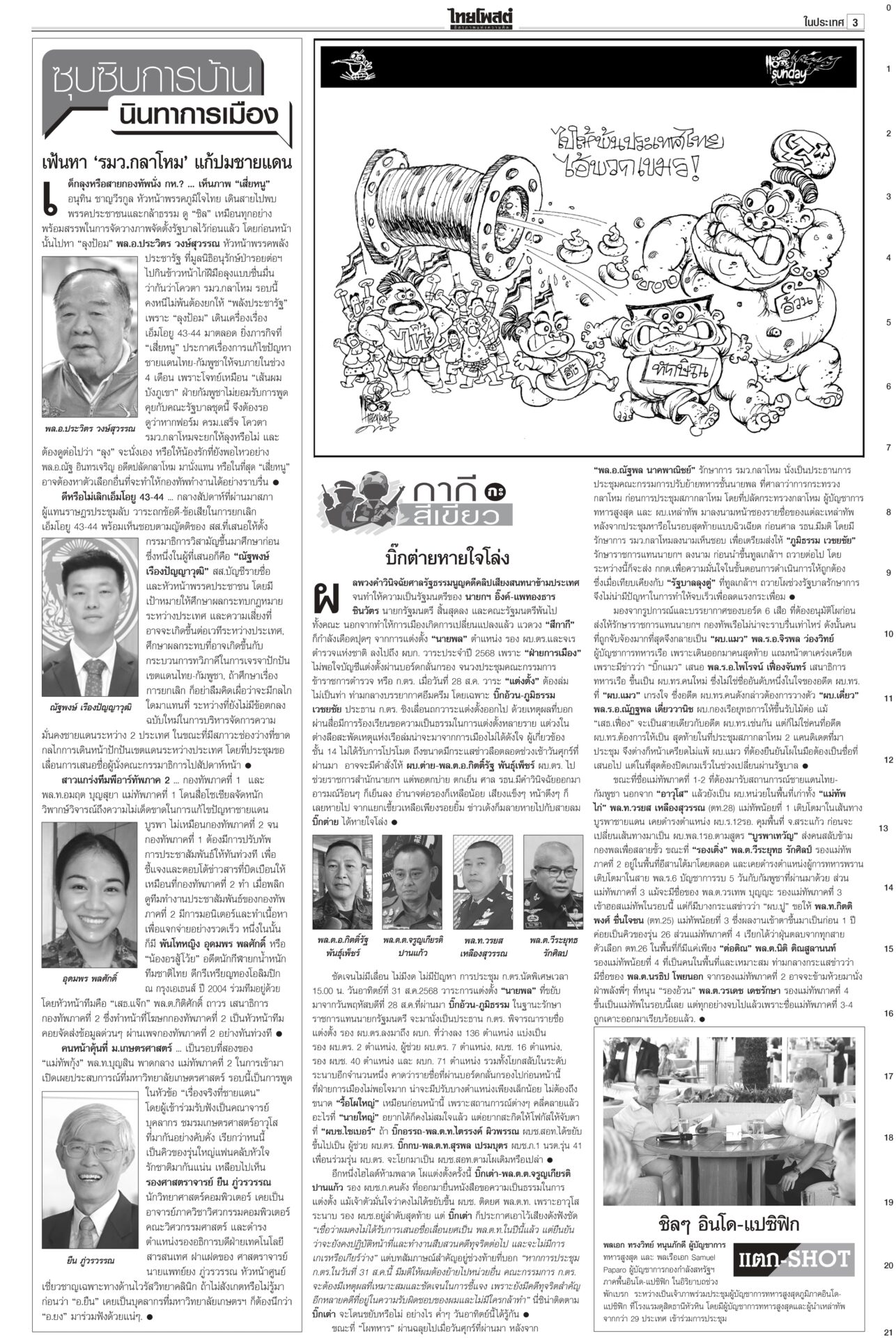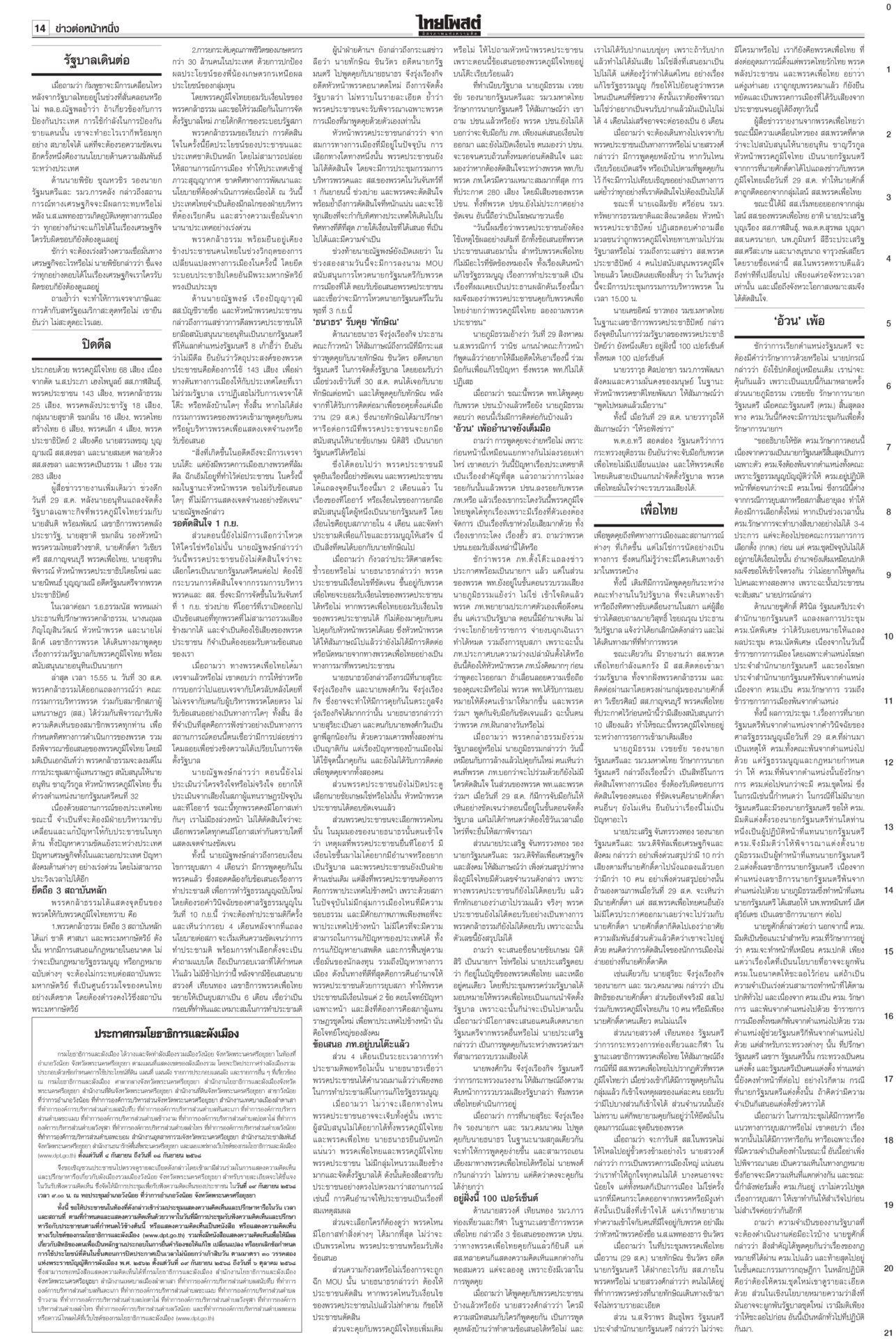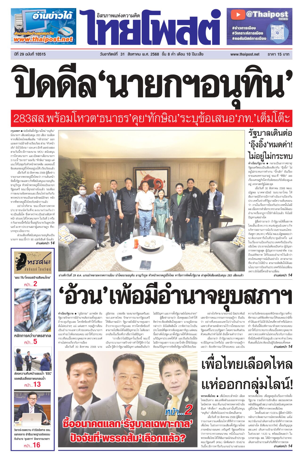 หนังสือพิมพ์ฉบับวันที่ 31 สิงหาคม 2568 ข่าวหน้าหนึ่งปิดดีล‘นายกฯอนุทิน’ 283สส.พร้อมโหวต‘ธนาธร’คุย‘ทักษิณ’ระบุข้อเสนอ‘ภท.’เต็มโต๊ะจ่อปิดดีลตั้งรัฐบาลใหม่ “อนุทิน” นั่งนายกฯ เสียงสนับสนุน 283 เสียง รอเลือดจากเพื่อไทยไหลเพิ่มเติม “กล้าธรรม” ออกแถลงการณ์ย้ายข้างเรียบร้อย ส่วน “หัวหน้าเท้ง” ยังไว้เชิงรอ 1 ก.ย.เคาะอีกที รัฐบาลเดินต่อ ‘อุ๊งอิ๊ง’ หมดค่า! ไม่อยู่ไม่กระทบกลายเป็นอากาศธาตุ! รัฐมนตรีตอบเป็นเสียงเดียวกัน “อุ๊งอิ๊ง” ไม่อยู่ไม่กระทบการทำงาน “บิ๊กเล็ก” ยันเรื่องชายแดนทหารเอาอยู่ ขณะที่ “พิชัย” เผยเรื่องเศรษฐกิจใครรับผิดชอบก็ยังต้องดูแลอยู่ เจรจาสหรัฐไม่สะดุด เพื่อไทยเลือดไหล แห่ออกกลุ่มไลน์!เพื่อไทยระส่ำหนัก เลือดไหลเป็นทาง สส.แห่ดีดตัวเองออกจากกลุ่มไลน์พรรค ขณะที่แกนนำพรรคดาหน้าเย้ยมีแค่ “ศักดิ์ดา” คนเดียวเท่านั้นที่ไปหนุน “อนุทิน” ‘อ้วน’เพ้อมีอำนาจยุบสภาฯ“ภูมิธรรม” เมาหมัด! ยันรัฐบาลรักษาการมีอำนาจเต็มรวมทั้งยุบสภา ถ้าจะยุบก็ยุบเลย ใครขัดข้องท้าให้ไปฟ้อง ลั่นไม่จบง่ายๆ แน่ แต่เลขาฯ กฤษฎีกาเตือน เป็นอำนาจเฉพาะตัวของคนเป็นนายกฯ