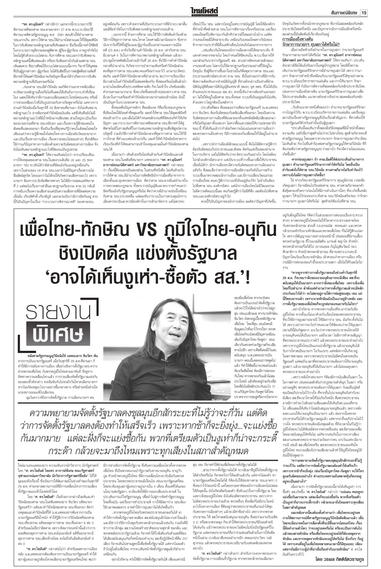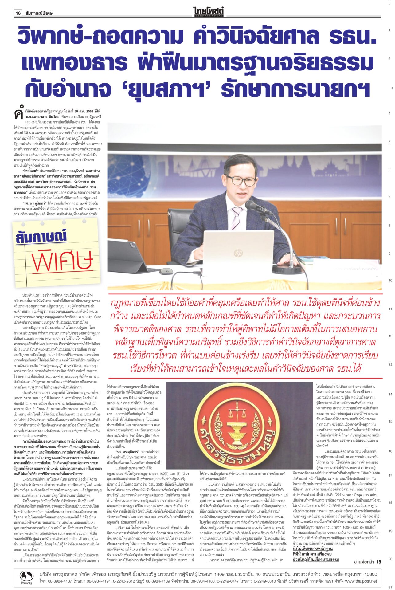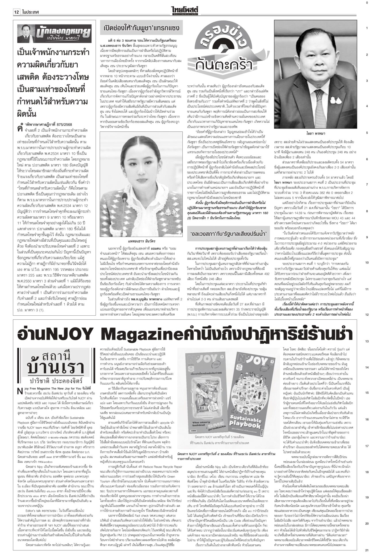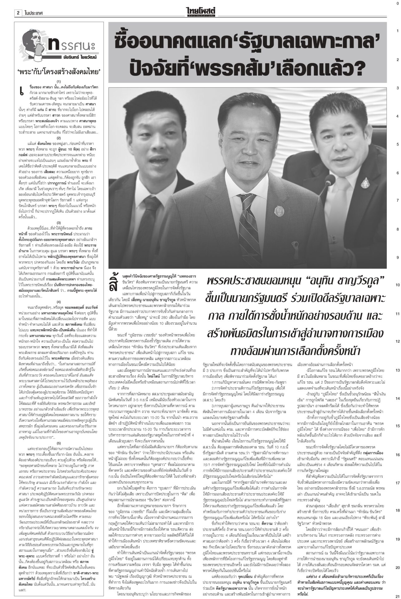 หนังสือพิมพ์ฉบับวันที่ 31 สิงหาคม 2568 ข่าวหน้าหนึ่งปิดดีล‘นายกฯอนุทิน’ 283สส.พร้อมโหวต‘ธนาธร’คุย‘ทักษิณ’ระบุข้อเสนอ‘ภท.’เต็มโต๊ะจ่อปิดดีลตั้งรัฐบาลใหม่ “อนุทิน” นั่งนายกฯ เสียงสนับสนุน 283 เสียง รอเลือดจากเพื่อไทยไหลเพิ่มเติม “กล้าธรรม” ออกแถลงการณ์ย้ายข้างเรียบร้อย ส่วน “หัวหน้าเท้ง” ยังไว้เชิงรอ 1 ก.ย.เคาะอีกที รัฐบาลเดินต่อ ‘อุ๊งอิ๊ง’ หมดค่า! ไม่อยู่ไม่กระทบกลายเป็นอากาศธาตุ! รัฐมนตรีตอบเป็นเสียงเดียวกัน “อุ๊งอิ๊ง” ไม่อยู่ไม่กระทบการทำงาน “บิ๊กเล็ก” ยันเรื่องชายแดนทหารเอาอยู่ ขณะที่ “พิชัย” เผยเรื่องเศรษฐกิจใครรับผิดชอบก็ยังต้องดูแลอยู่ เจรจาสหรัฐไม่สะดุด เพื่อไทยเลือดไหล แห่ออกกลุ่มไลน์!เพื่อไทยระส่ำหนัก เลือดไหลเป็นทาง สส.แห่ดีดตัวเองออกจากกลุ่มไลน์พรรค ขณะที่แกนนำพรรคดาหน้าเย้ยมีแค่ “ศักดิ์ดา” คนเดียวเท่านั้นที่ไปหนุน “อนุทิน” ‘อ้วน’เพ้อมีอำนาจยุบสภาฯ“ภูมิธรรม” เมาหมัด! ยันรัฐบาลรักษาการมีอำนาจเต็มรวมทั้งยุบสภา ถ้าจะยุบก็ยุบเลย ใครขัดข้องท้าให้ไปฟ้อง ลั่นไม่จบง่ายๆ แน่ แต่เลขาฯ กฤษฎีกาเตือน เป็นอำนาจเฉพาะตัวของคนเป็นนายกฯ