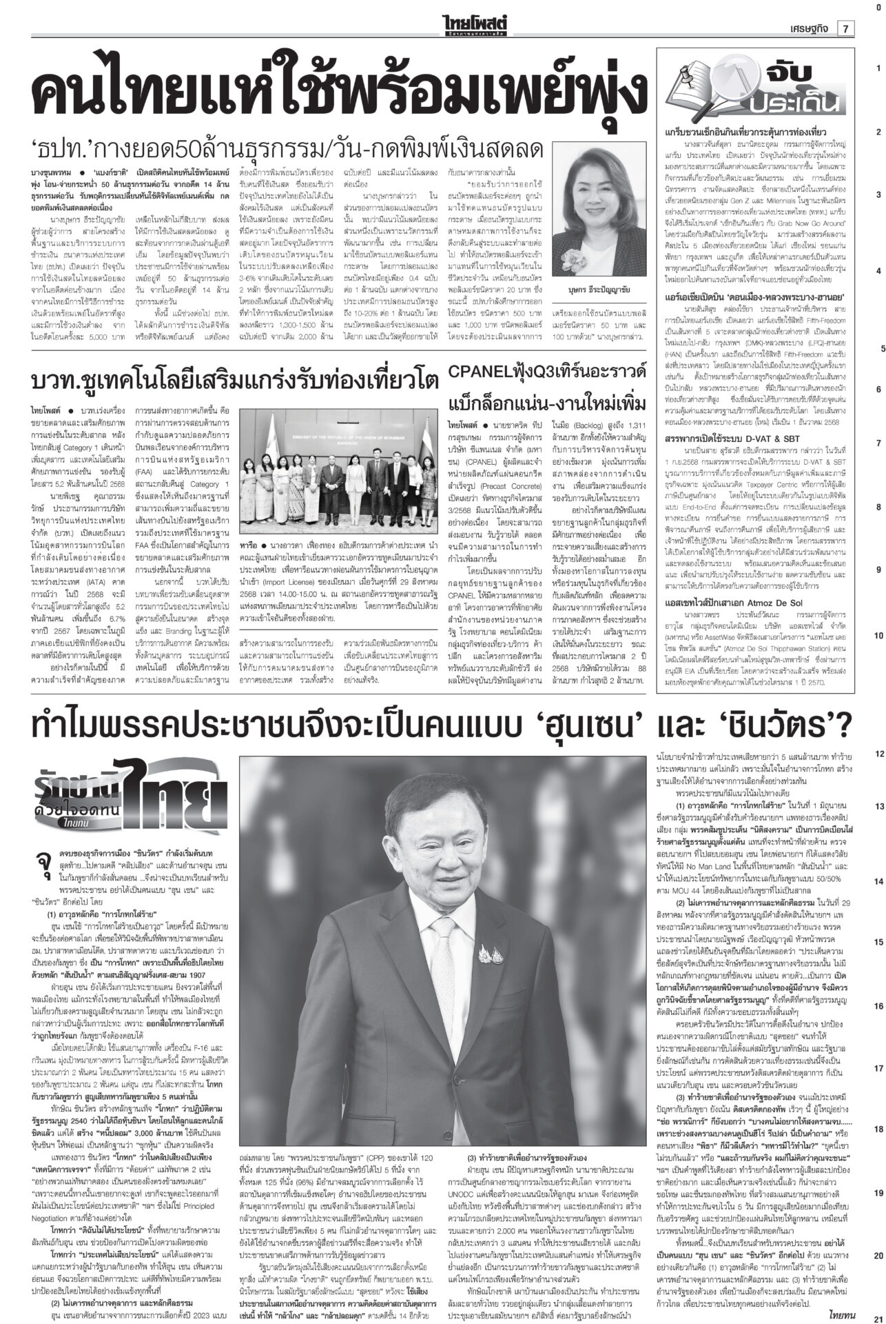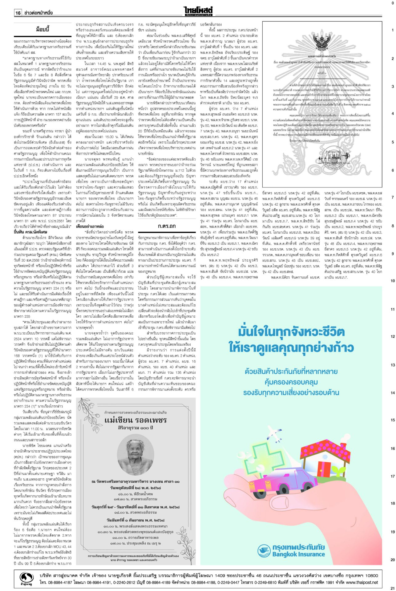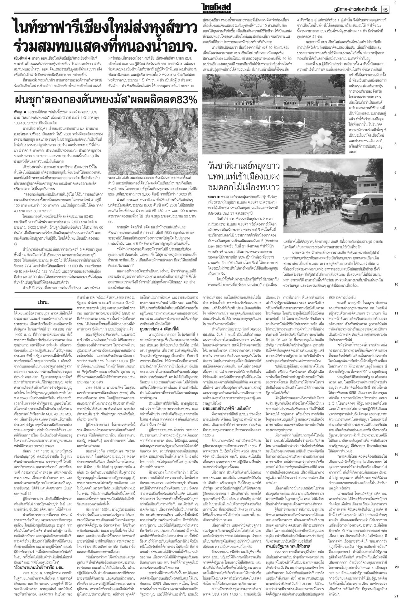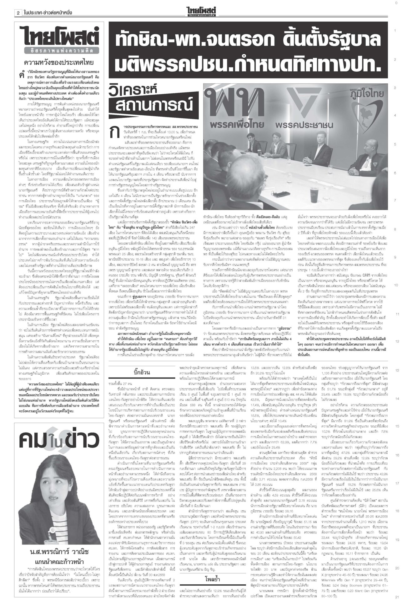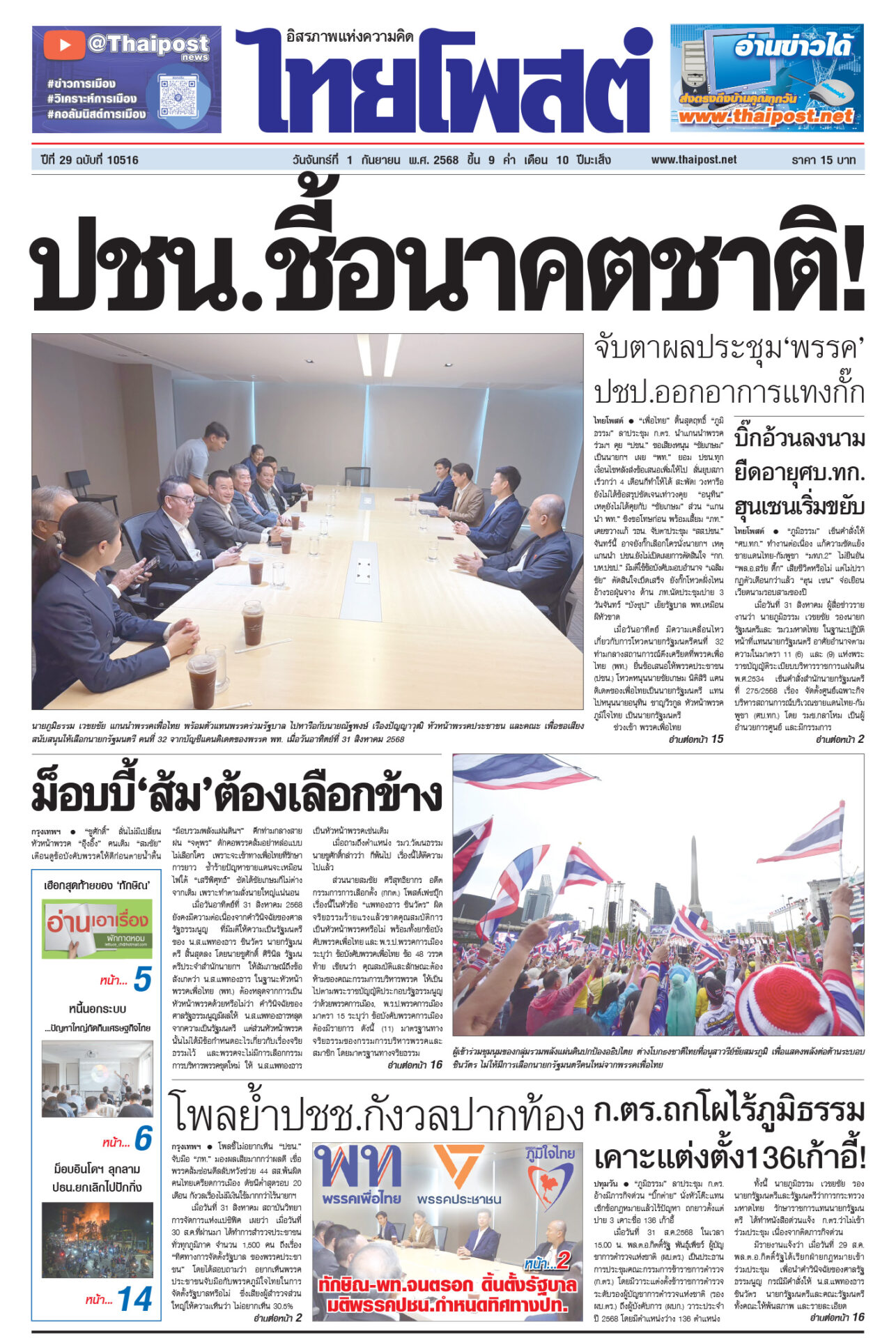 หนังสือพิมพ์ฉบับวันที่ 1 กันยายน 2568ข่าวหน้าหนึ่งปชน.ชี้อนาคตชาติ! จับตาผลประชุม‘พรรค’ ปชป.ออกอาการแทงกั๊ก“เพื่อไทย” ดิ้นสุดฤทธิ์ “ภูมิธรรม” ลาประชุม ก.ตร. นำแกนนำพรรคร่วมฯ ม็อบบี้‘ส้ม’ต้องเลือกข้าง“ชูศักดิ์” ลั่นไม่มีเปลี่ยนหัวหน้าพรรค “อุ๊งอิ๊ง” คนเดิม “สมชัย” เตือนดูข้อบังคับพรรคให้ดีก่อนตายน้ำตื้น “ม็อบรวมพลังแผ่นดินฯ” ก.ตร.ถกโผไร้ภูมิธรรม เคาะแต่งตั้ง136เก้าอี้!“ภูมิธรรม” ลาประชุม ก.ตร. อ้างมีภารกิจด่วน “บิ๊กต่าย” นั่งหัวโต๊ะแทน บิ๊กอ้วนลงนาม ยืดอายุศบ.ทก. ฮุนเซนเริ่มขยับ“ภูมิธรรม” เซ็นคำสั่งให้ “ศบ.ทก.” ทำงานต่อเนื่อง แก้ความขัดแย้งชายแดนไทย-กัมพูชา โพลยํ้าปชช.กังวลปากท้องโพลชี้ไม่อยากเห็น “ปชน.” จับมือ “ภท.” มองผลเสียมากกว่าผลดี