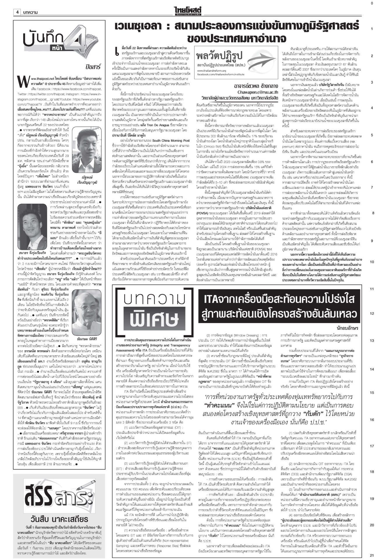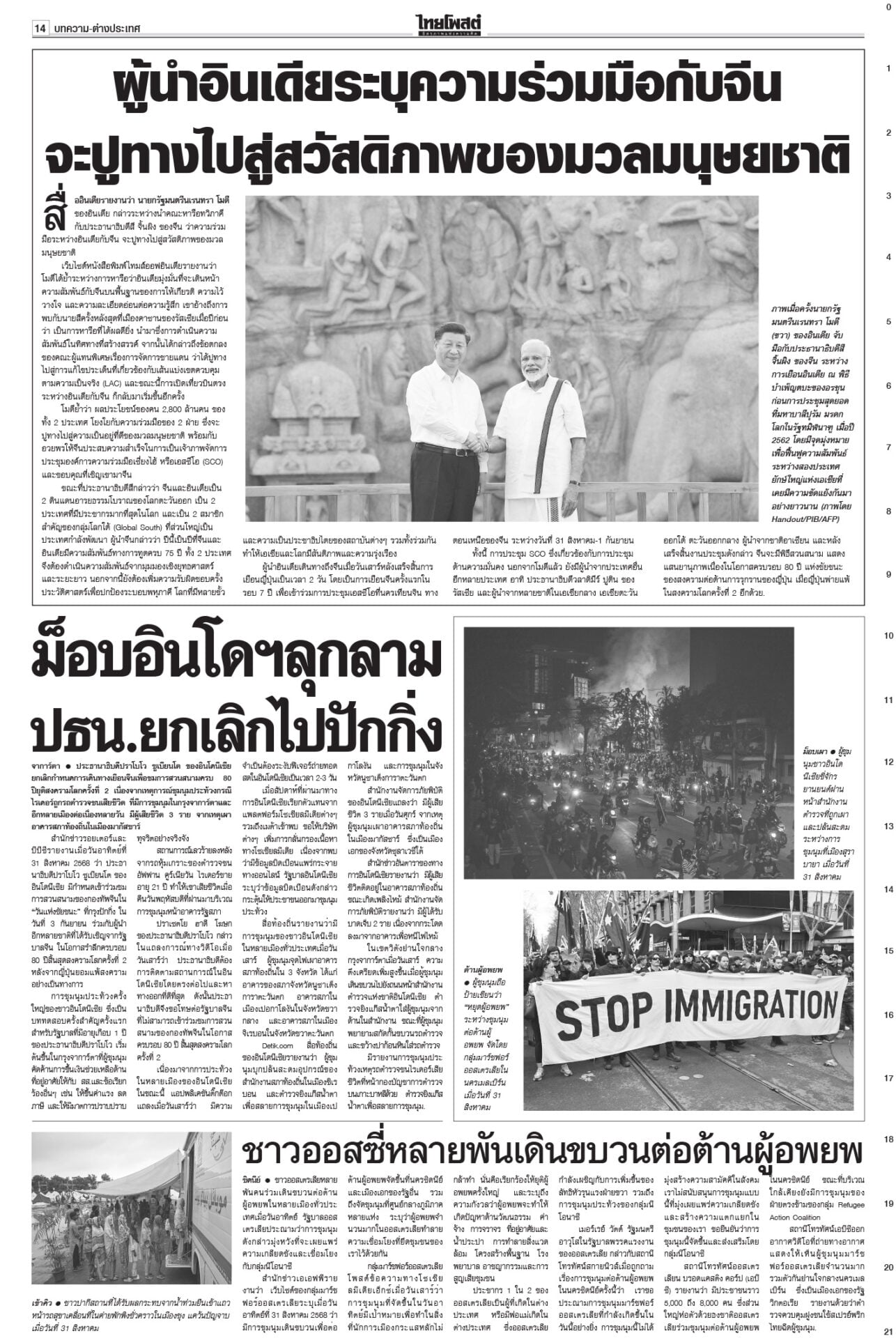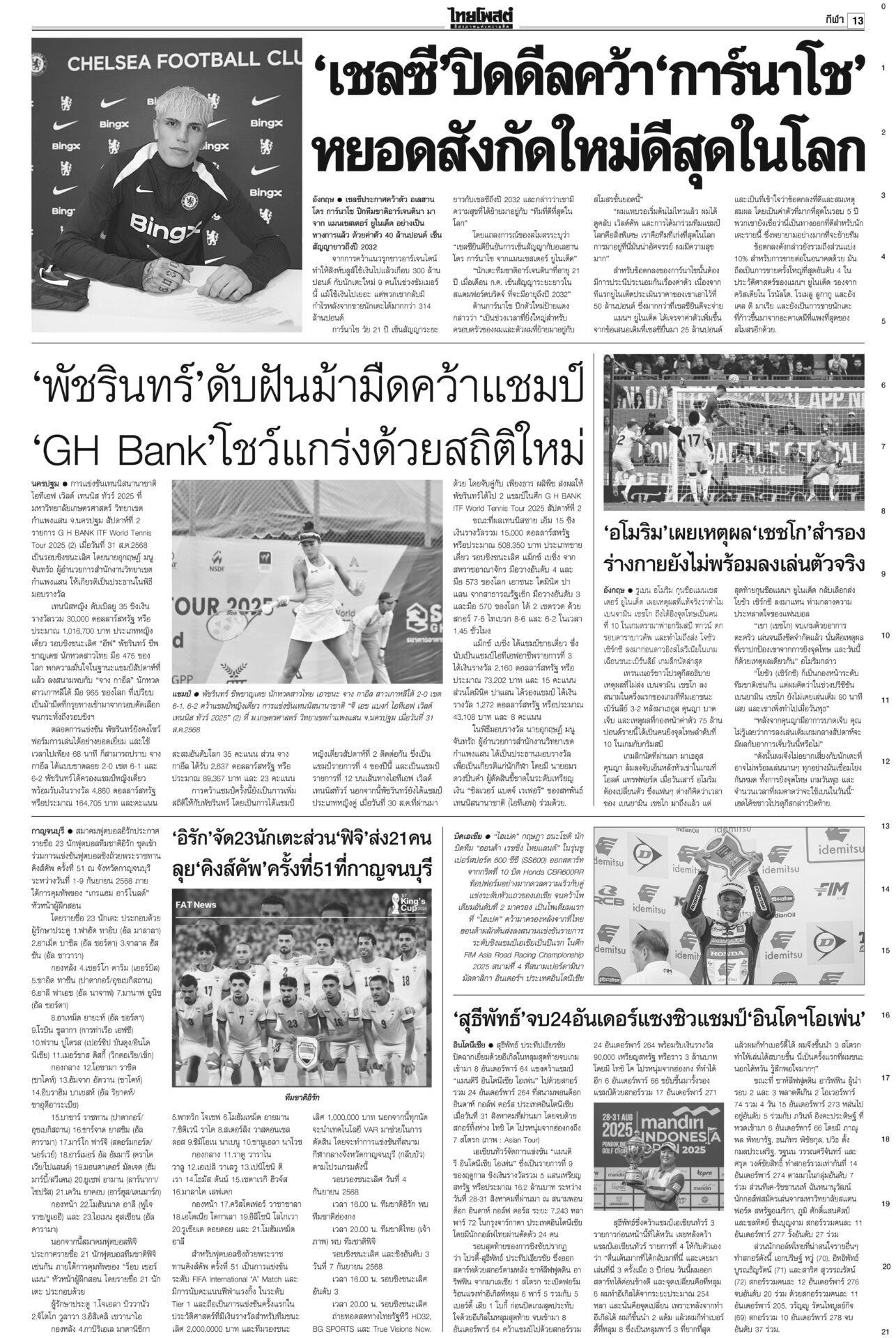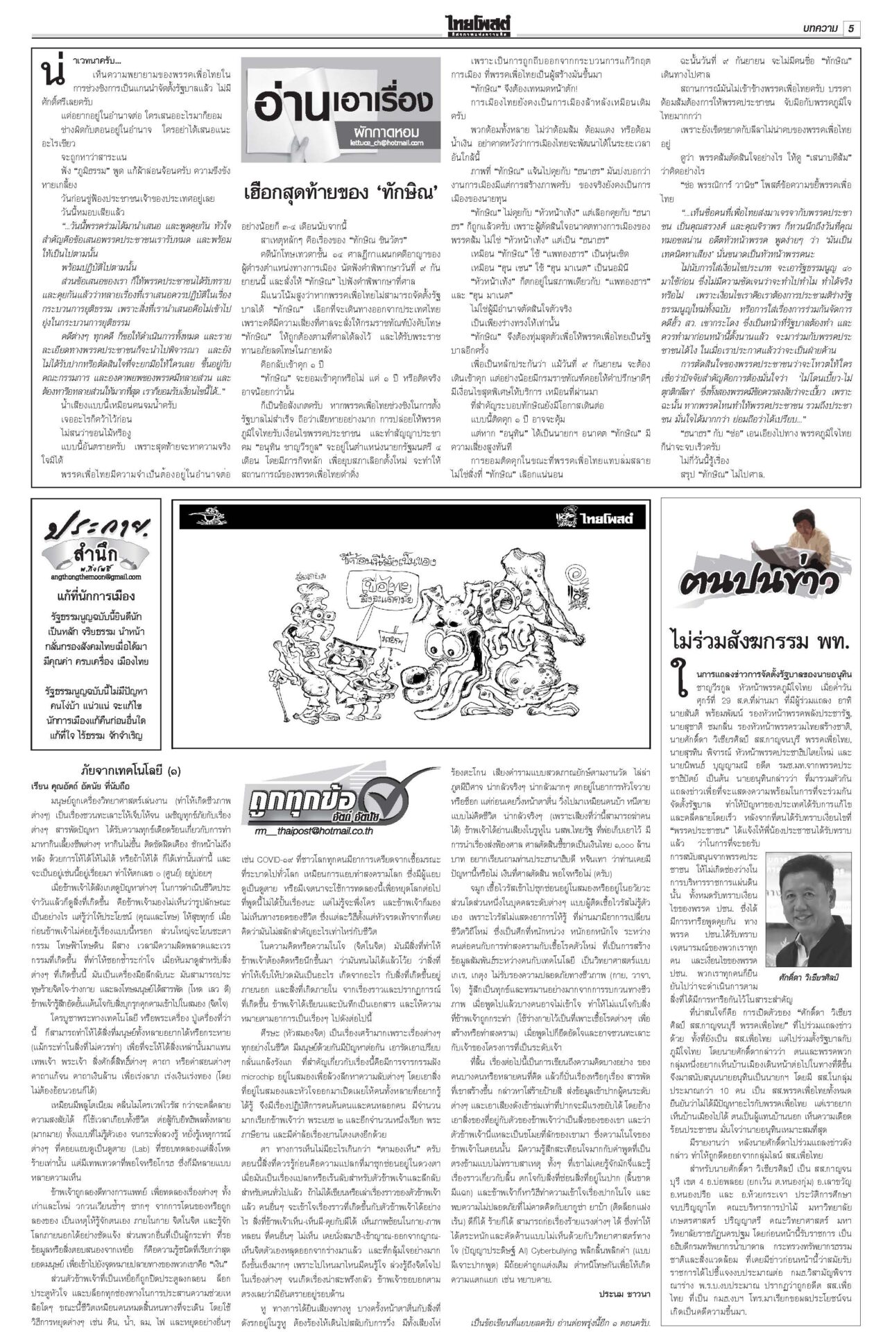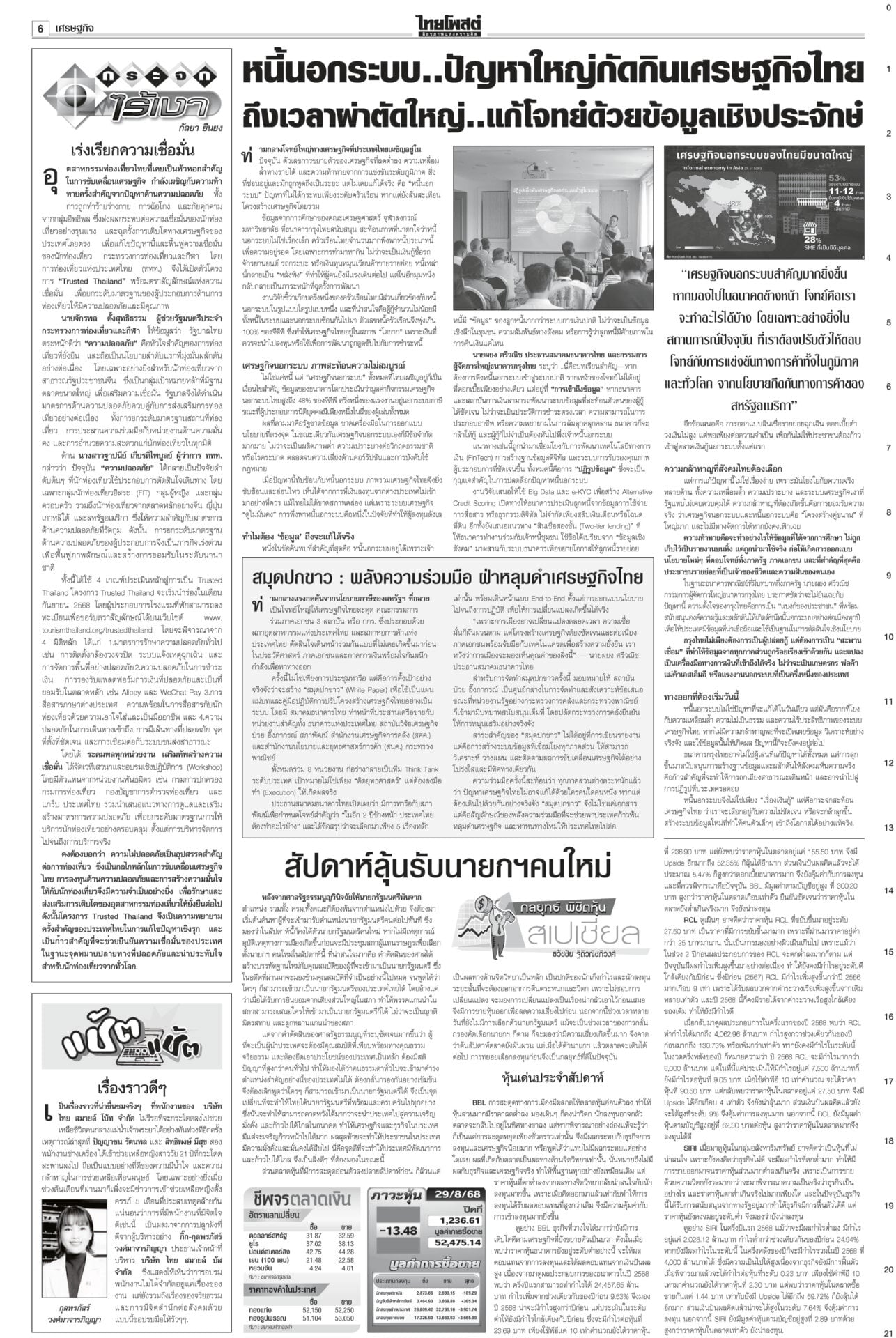 หนังสือพิมพ์ฉบับวันที่ 1 กันยายน 2568ข่าวหน้าหนึ่งปชน.ชี้อนาคตชาติ! จับตาผลประชุม‘พรรค’ ปชป.ออกอาการแทงกั๊ก“เพื่อไทย” ดิ้นสุดฤทธิ์ “ภูมิธรรม” ลาประชุม ก.ตร. นำแกนนำพรรคร่วมฯ ม็อบบี้‘ส้ม’ต้องเลือกข้าง“ชูศักดิ์” ลั่นไม่มีเปลี่ยนหัวหน้าพรรค “อุ๊งอิ๊ง” คนเดิม “สมชัย” เตือนดูข้อบังคับพรรคให้ดีก่อนตายน้ำตื้น “ม็อบรวมพลังแผ่นดินฯ” ก.ตร.ถกโผไร้ภูมิธรรม เคาะแต่งตั้ง136เก้าอี้!“ภูมิธรรม” ลาประชุม ก.ตร. อ้างมีภารกิจด่วน “บิ๊กต่าย” นั่งหัวโต๊ะแทน บิ๊กอ้วนลงนาม ยืดอายุศบ.ทก. ฮุนเซนเริ่มขยับ“ภูมิธรรม” เซ็นคำสั่งให้ “ศบ.ทก.” ทำงานต่อเนื่อง แก้ความขัดแย้งชายแดนไทย-กัมพูชา โพลยํ้าปชช.กังวลปากท้องโพลชี้ไม่อยากเห็น “ปชน.” จับมือ “ภท.” มองผลเสียมากกว่าผลดี