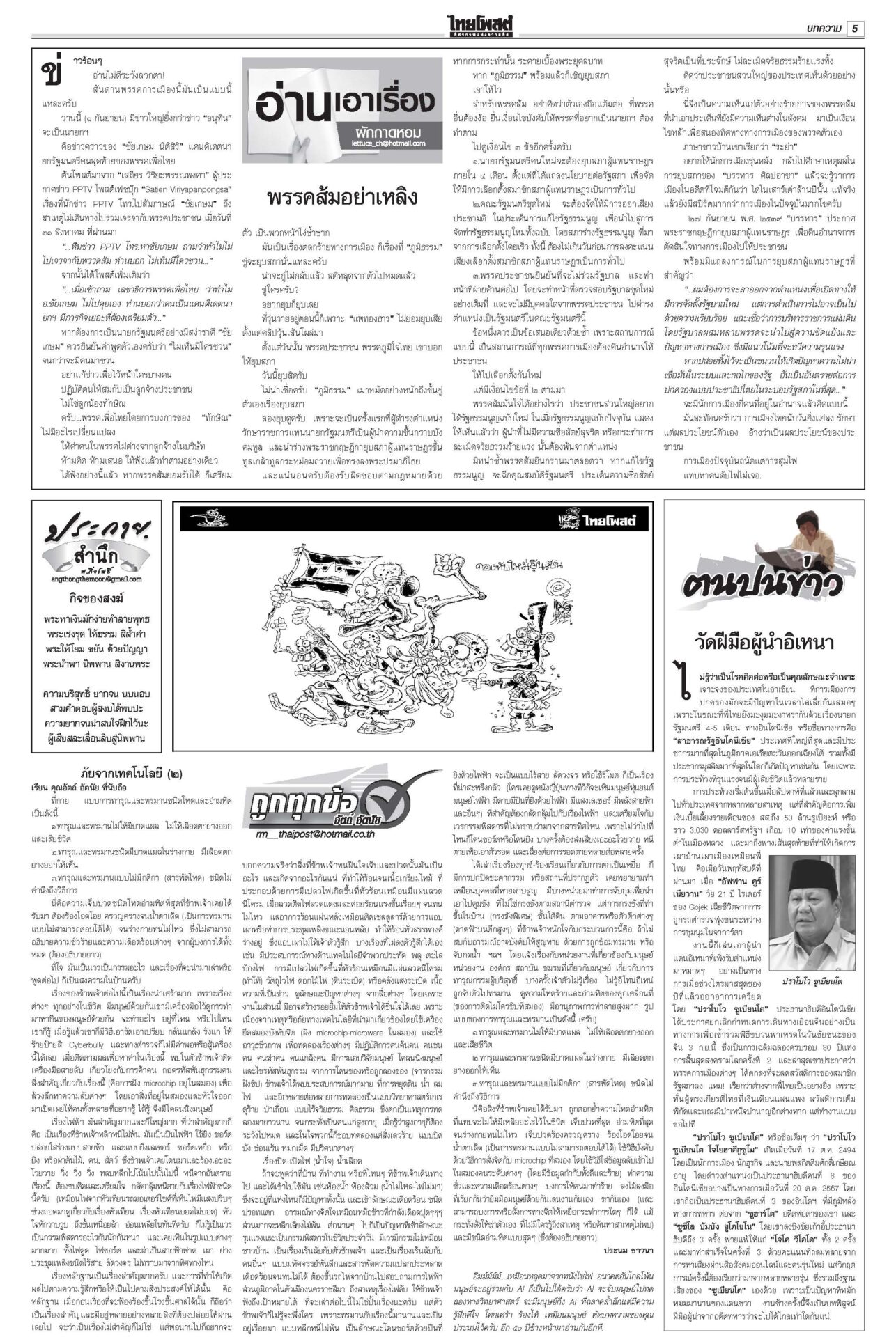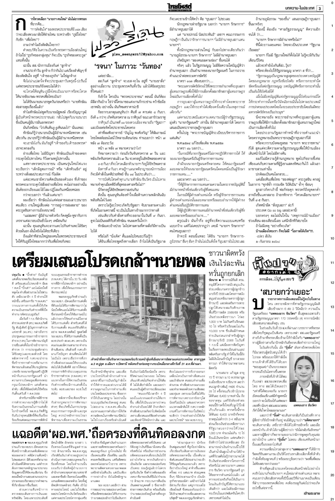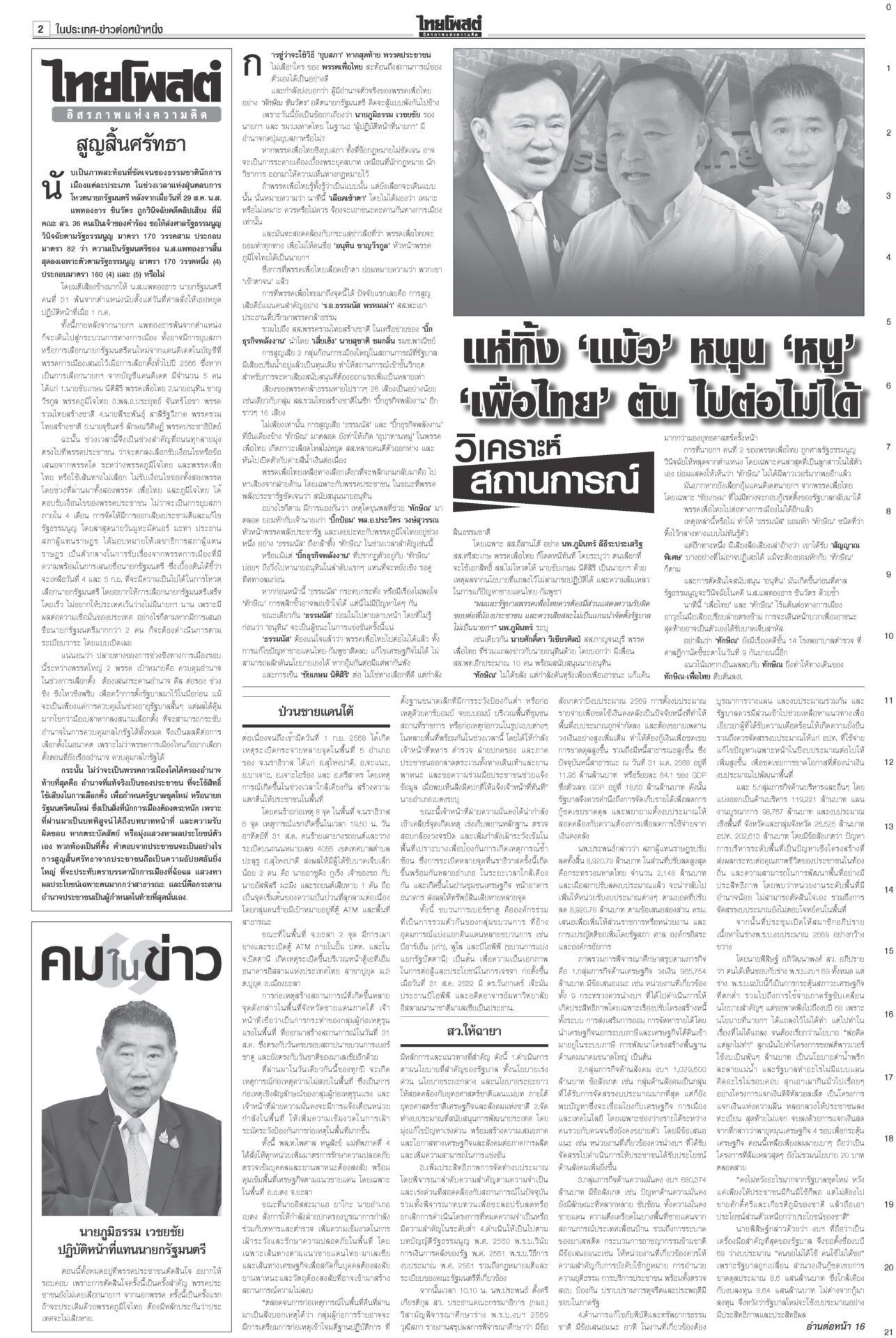 หนังสือพิมพ์ ฉบับวันที่ 2 กันยายน 2568ข่าวหน้าหนึ่งดึงเกมเคาะชื่อนายก ปชน.เชื่อสะเด็ดนํ้าหากงดออกเสียง2พรรครวมกันอยู่ยาวรอเก้อ! “พรรคประชาชน” ถกแต่ไร้ข้อสรุปหนุนใคร ประชุมต่อ 2 ก.ย. สว.ให้ฉายางบ69พ่อคิดลูกไม่ทำ“ขุนคลัง” มั่นใจไม่เกิน 2 วัน งบฯ 69 ผ่านสว.ฉลุย เชื่อนักลงทุนต่างชาติเข้าใจสถานการณ์การเมือง เพราะเกิดบ่อยไม่กระทบความเชื่อมั่น บี้กกต.ฟัน‘แม้ว-ทอน’ครอบงำ“ศรีสุวรรณ” ชง กกต.สอบ “พรรคเพื่อไทย-ประชาชน” แฉ‘ฮุน เซน’แค้น‘ทักษิณ’ หลอกซื้อหุ้นบางจาก24%“สม รังสี” อ้างสื่อนอกรายงานข้อพิพาทระหว่าง “ฮุน เซน” กับ “ทักษิณ” ป่วนชายแดนใต้ วันตั้ง‘เบอร์ซาตู’ จับตาคาร์บอมบ์ปูพรมป่วนหนัก 3 จังหวัดชายแดนใต้ ทั้งลอบบึ้ม-วางเพลิง ครบรอบ “วันก่อตั้งเบอร์ซาตู” ยะลาสแกนยิบพื้นที่ชุมชนและศูนย์ราชการ