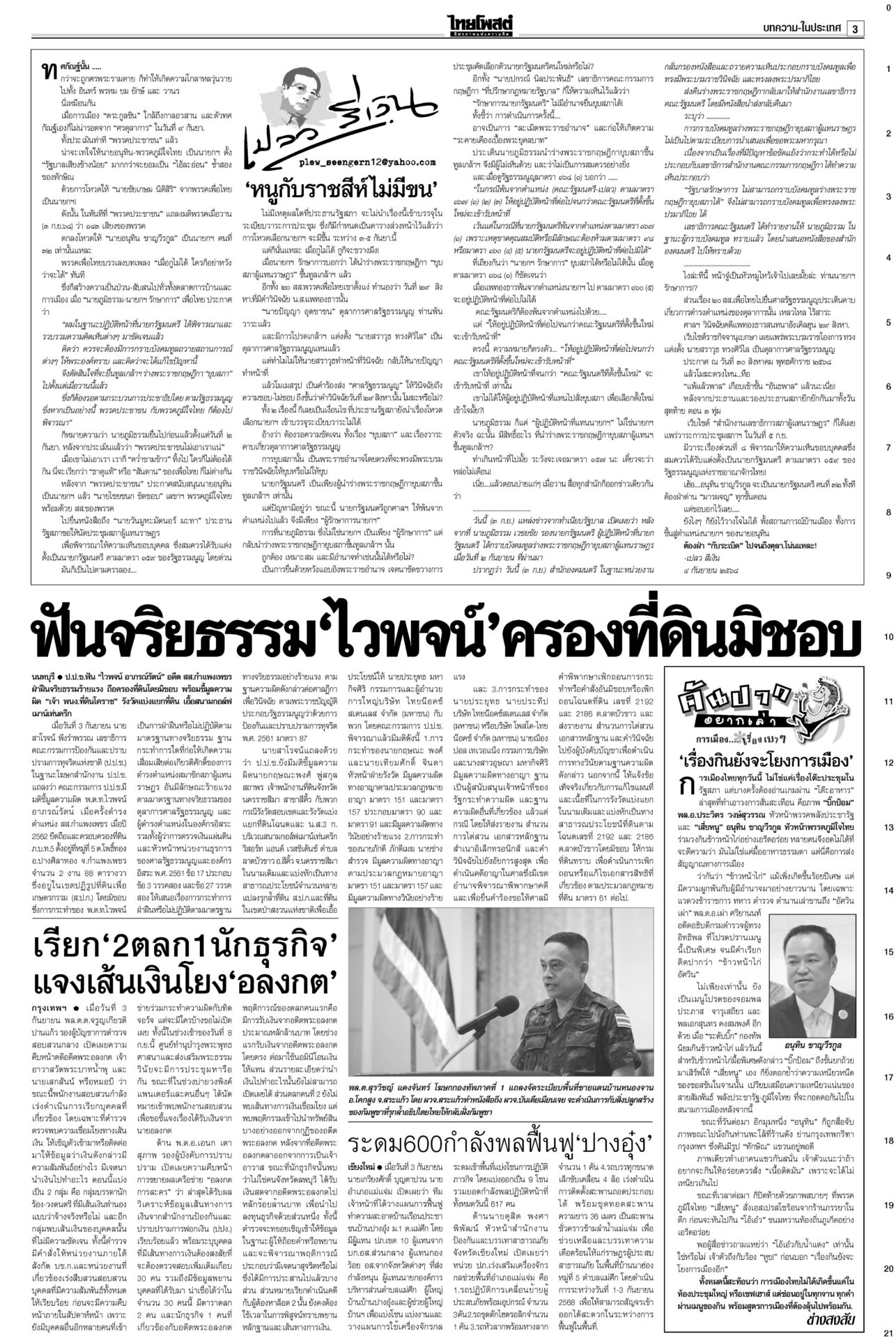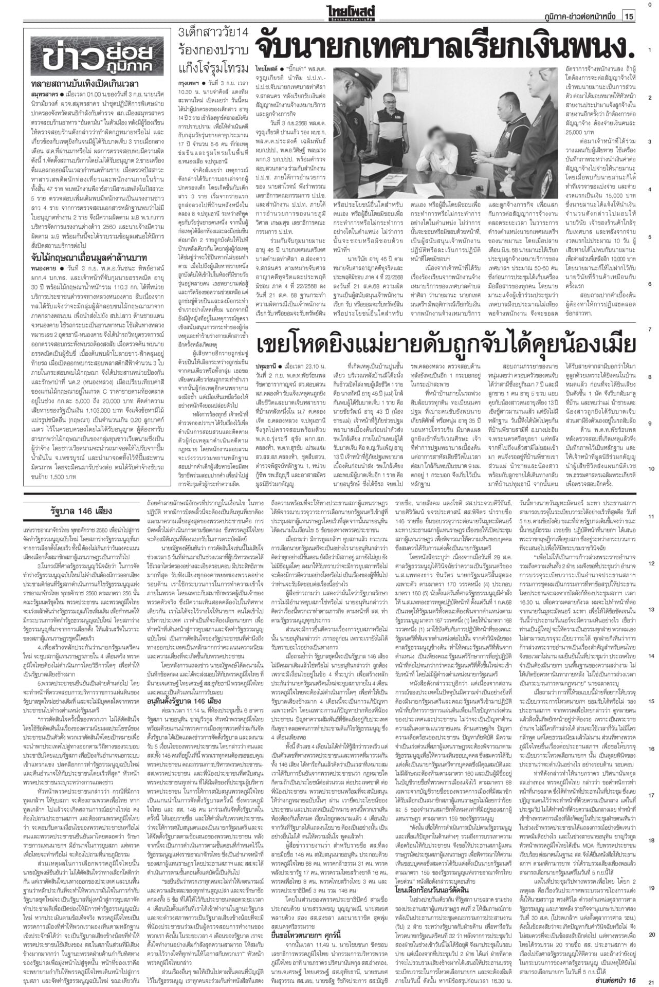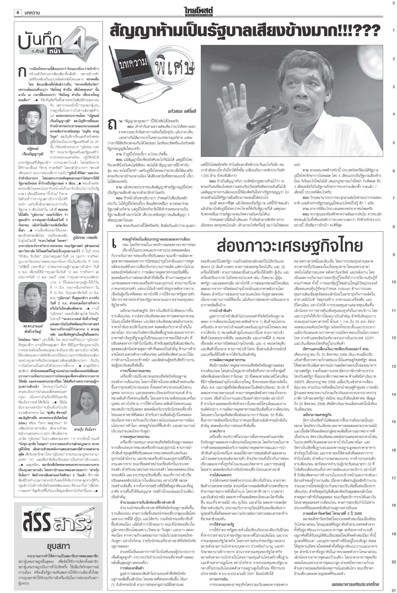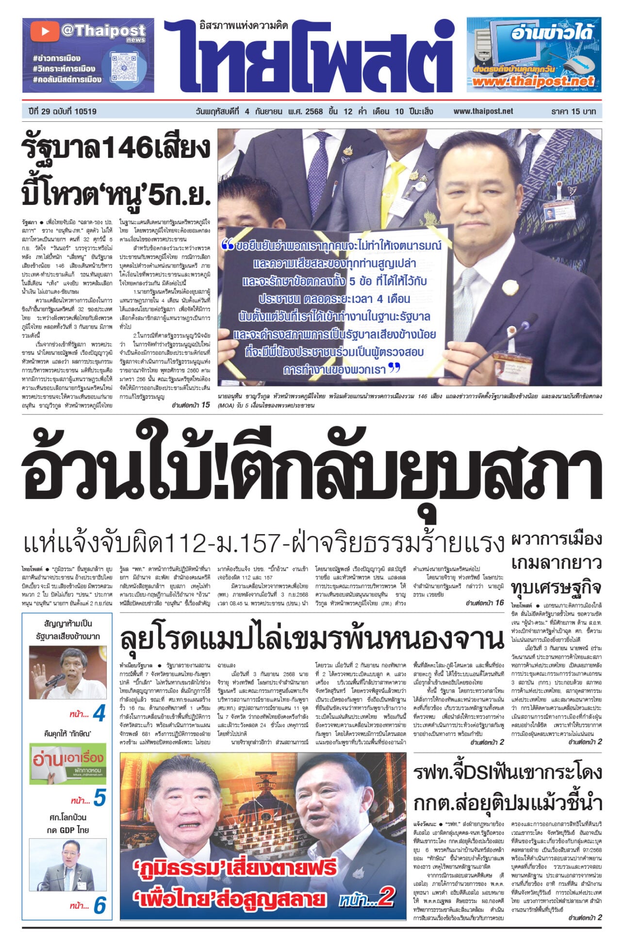 หนังสือพิมพ์ ฉบับวันที่ 4 กันยายน 2568ข่าวหน้าหนึ่งอ้วนใบ้!ตีกลับยุบสภา แห่แจ้งจับผิด112-ม.157-ฝ่าจริยธรรมร้ายแรง“ภูมิธรรม” ยื่นทูลเกล้าฯ ยุบสภาคืนอำนาจประชาชน อ้างประชาธิปไตยบิดเบี้ยว รัฐบาล146เสียง บี้โหวต‘หนู’5ก.ย.เพื่อไทยจับมือ “ฉลาด-รอง ปธ.สภาฯ” ขวาง “อนุทิน-ภท.” สุดตัว ไม่ให้สภาโหวตเป็นนายกฯ คนที่ 32 ศุกร์นี้ 5 ก.ย. รฟท.จี้DSIฟันเขากระโดง กกต.ส่อยุติปมแม้วชี้นำ“รฟท.” ส่งฝ่ายกฎหมายร้องดีเอสไอ เอาผิดกลุ่มบุคคล-จนท.รัฐถือครองที่ดินเขากระโดง ลุยโรดแมปไล่เขมรพ้นหนองจานรัฐบาลรายงานสถานการณ์พื้นที่ 7 จังหวัดชายแดนไทย-กัมพูชาปกติ “บิ๊กเล็ก” ไม่หวั่นหากเขมรลักไก่ช่วงไทยเกิดสุญญากาศการเมือง ผวาการเมือง เกมลากยาว ทุบเศรษฐกิจเอกชนเกาะติดการเมืองใกล้ชิด ลั่นไม่ยึดติดรัฐบาลขั้วไหน ขอความชัดเจน