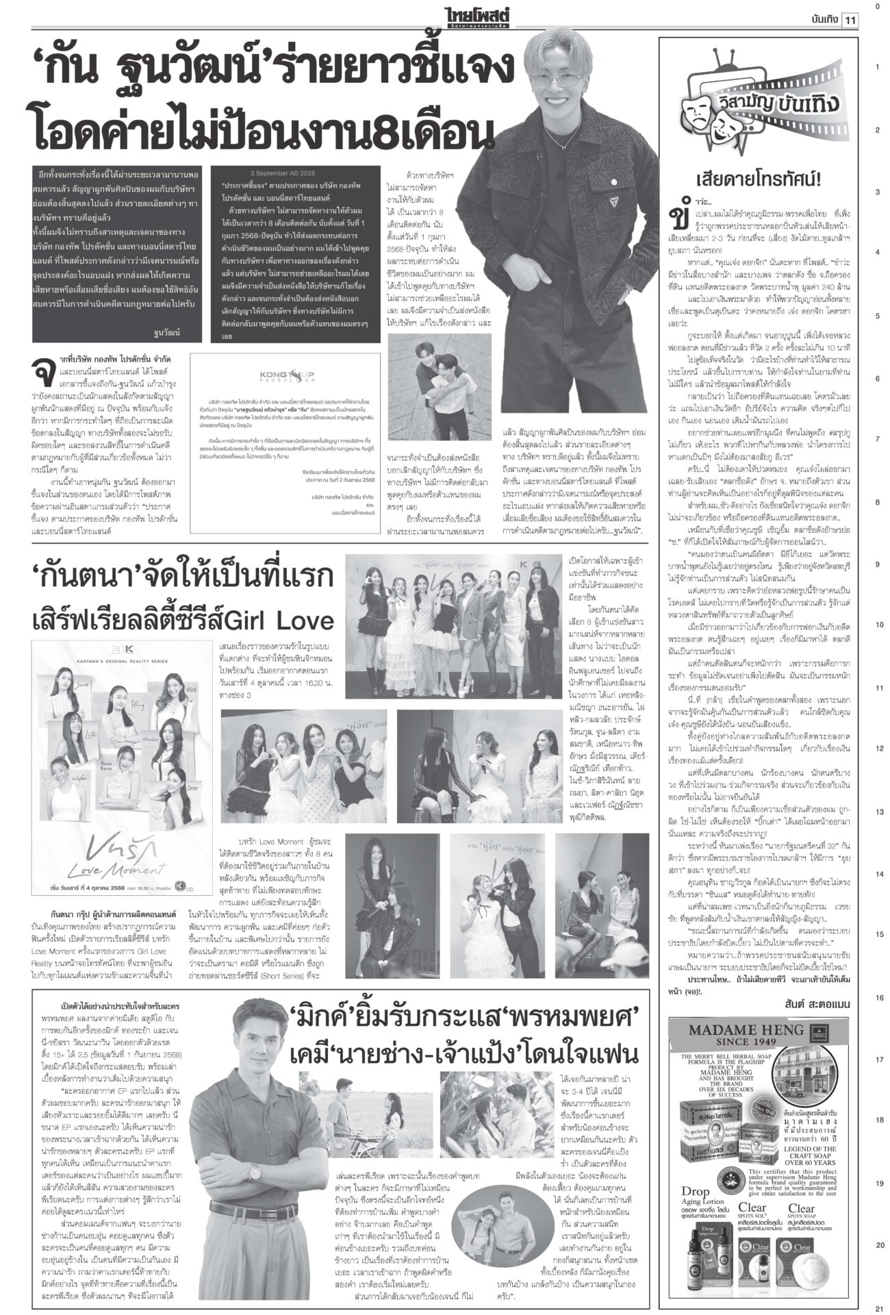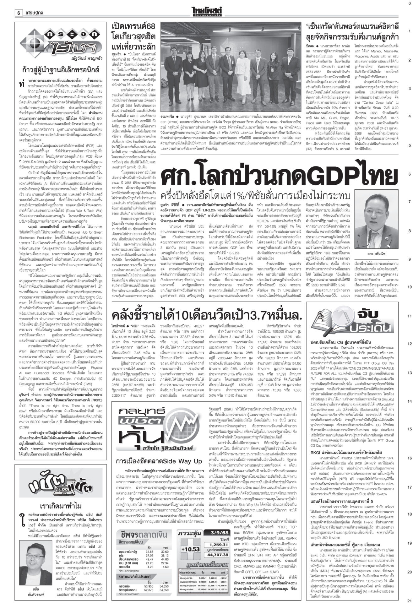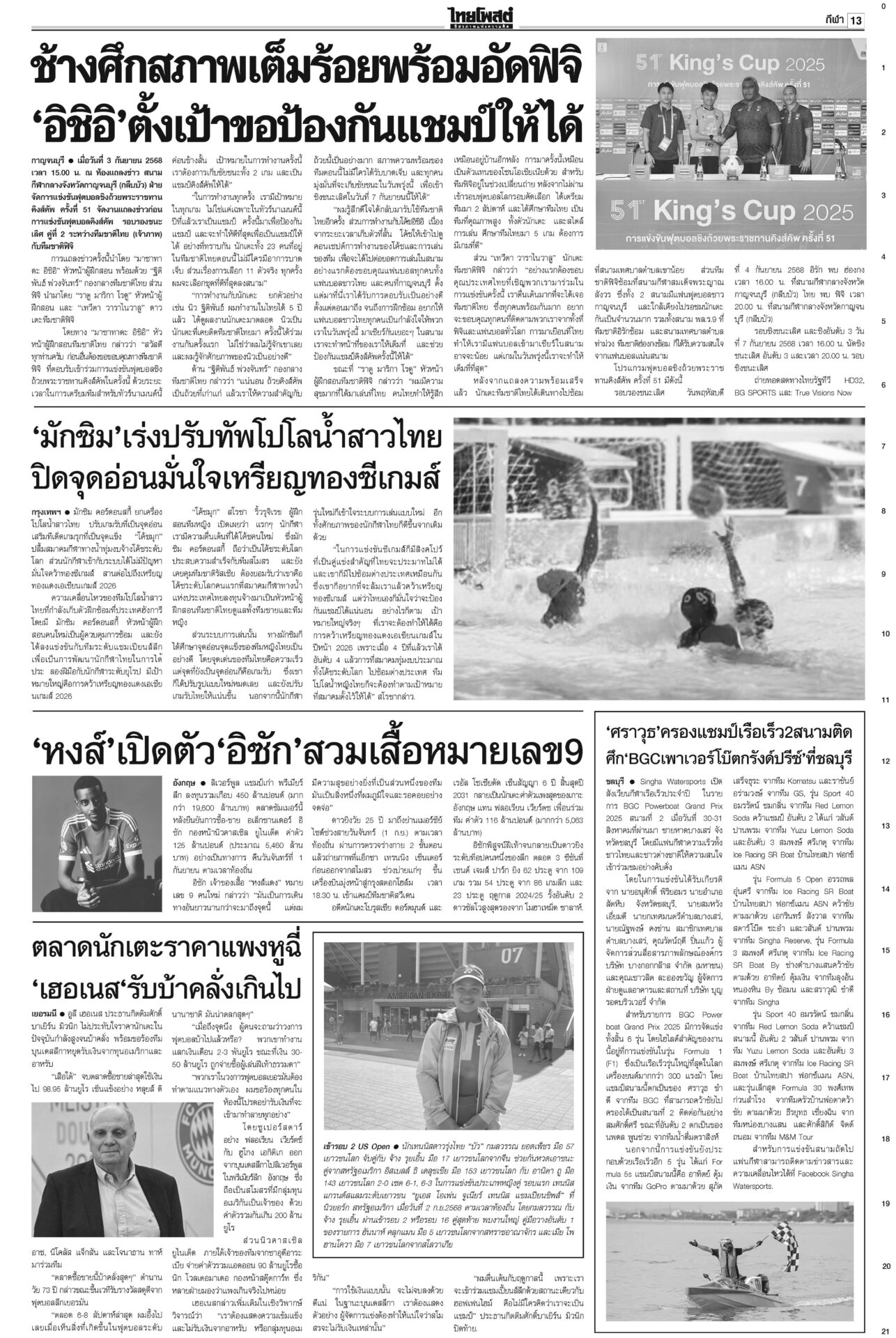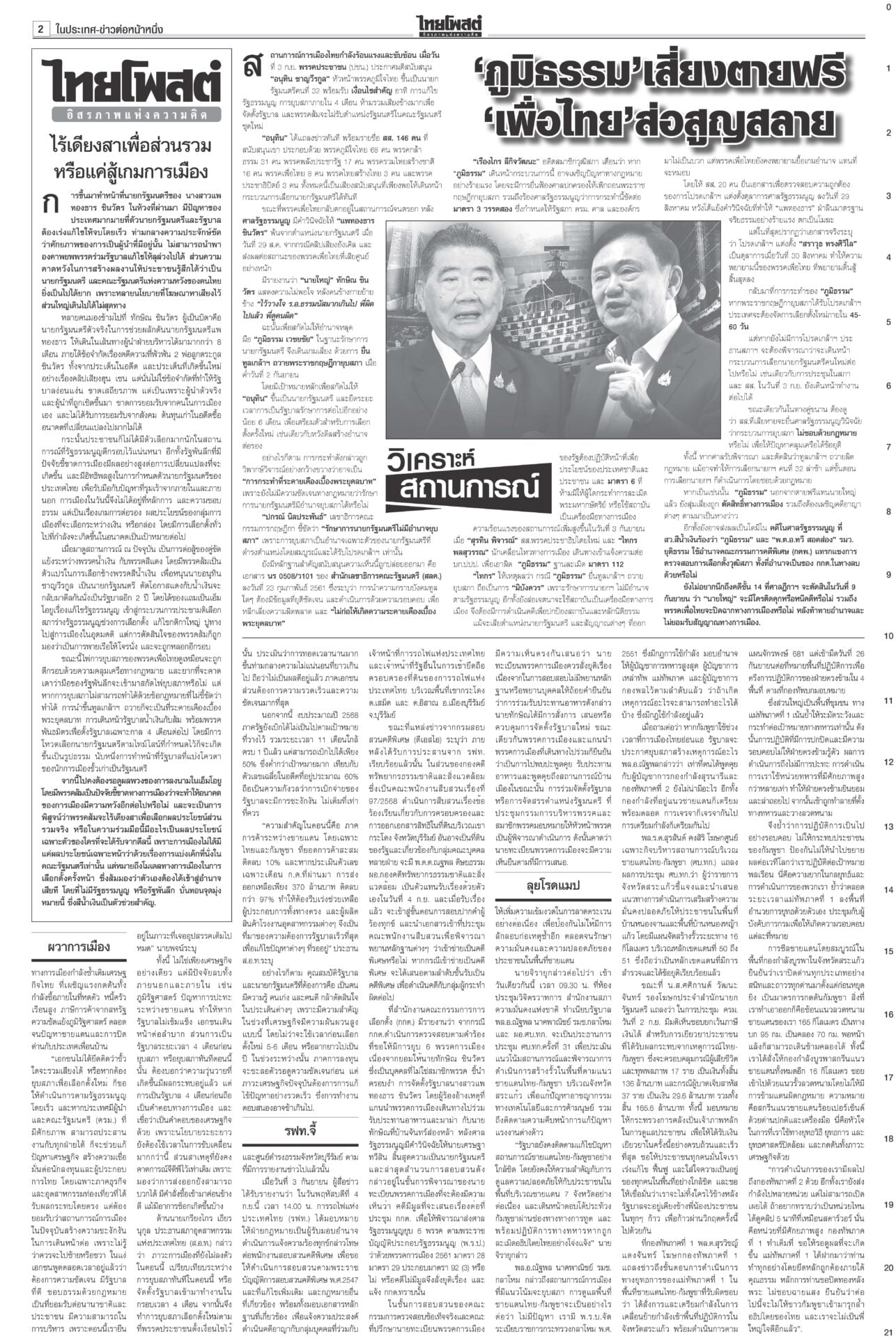 หนังสือพิมพ์ ฉบับวันที่ 4 กันยายน 2568ข่าวหน้าหนึ่งอ้วนใบ้!ตีกลับยุบสภา แห่แจ้งจับผิด112-ม.157-ฝ่าจริยธรรมร้ายแรง“ภูมิธรรม” ยื่นทูลเกล้าฯ ยุบสภาคืนอำนาจประชาชน อ้างประชาธิปไตยบิดเบี้ยว รัฐบาล146เสียง บี้โหวต‘หนู’5ก.ย.เพื่อไทยจับมือ “ฉลาด-รอง ปธ.สภาฯ” ขวาง “อนุทิน-ภท.” สุดตัว ไม่ให้สภาโหวตเป็นนายกฯ คนที่ 32 ศุกร์นี้ 5 ก.ย. รฟท.จี้DSIฟันเขากระโดง กกต.ส่อยุติปมแม้วชี้นำ“รฟท.” ส่งฝ่ายกฎหมายร้องดีเอสไอ เอาผิดกลุ่มบุคคล-จนท.รัฐถือครองที่ดินเขากระโดง ลุยโรดแมปไล่เขมรพ้นหนองจานรัฐบาลรายงานสถานการณ์พื้นที่ 7 จังหวัดชายแดนไทย-กัมพูชาปกติ “บิ๊กเล็ก” ไม่หวั่นหากเขมรลักไก่ช่วงไทยเกิดสุญญากาศการเมือง ผวาการเมือง เกมลากยาว ทุบเศรษฐกิจเอกชนเกาะติดการเมืองใกล้ชิด ลั่นไม่ยึดติดรัฐบาลขั้วไหน ขอความชัดเจน