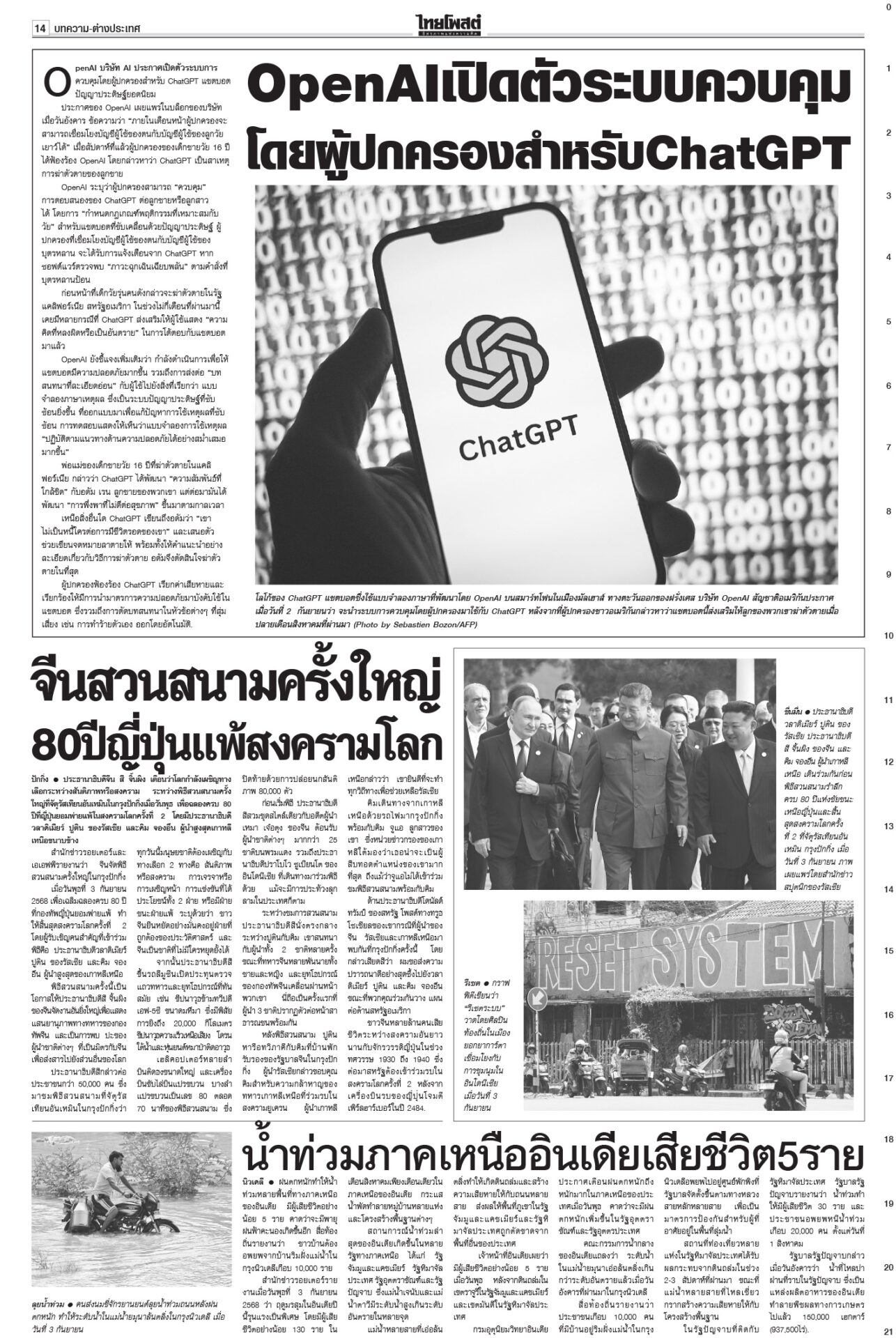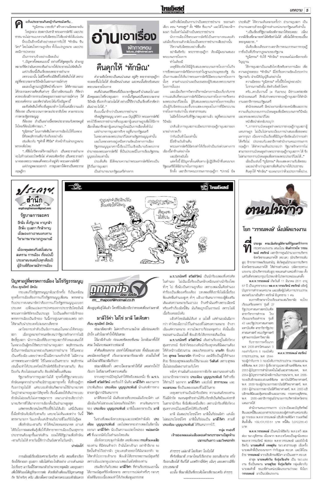 ฉบับวันที่ 4 กันยายน 2568 4 กันยายน 2568 เวลา 0:01 น. หนังสือพิมพ์ ฉบับวันที่ 4 กันยายน 2568ข่าวหน้าหนึ่งอ้วนใบ้!ตีกลับยุบสภา แห่แจ้งจับผิด112-ม.157-ฝ่าจริยธรรมร้ายแรง“ภูมิธรรม” ยื่นทูลเกล้าฯ ยุบสภาคืนอำนาจประชาชน อ้างประชาธิปไตยบิดเบี้ยว รัฐบาล146เสียง บี้โหวต‘หนู’5ก.ย.เพื่อไทยจับมือ “ฉลาด-รอง ปธ.สภาฯ” ขวาง “อนุทิน-ภท.” สุดตัว ไม่ให้สภาโหวตเป็นนายกฯ คนที่ 32 ศุกร์นี้ 5 ก.ย. รฟท.จี้DSIฟันเขากระโดง กกต.ส่อยุติปมแม้วชี้นำ“รฟท.” ส่งฝ่ายกฎหมายร้องดีเอสไอ เอาผิดกลุ่มบุคคล-จนท.รัฐถือครองที่ดินเขากระโดง ลุยโรดแมปไล่เขมรพ้นหนองจานรัฐบาลรายงานสถานการณ์พื้นที่ 7 จังหวัดชายแดนไทย-กัมพูชาปกติ “บิ๊กเล็ก” ไม่หวั่นหากเขมรลักไก่ช่วงไทยเกิดสุญญากาศการเมือง ผวาการเมือง เกมลากยาว ทุบเศรษฐกิจเอกชนเกาะติดการเมืองใกล้ชิด ลั่นไม่ยึดติดรัฐบาลขั้วไหน ขอความชัดเจน Tagsรายวันหนังสือพิมพ์ ข่าวที่เกี่ยวข้อง ฉบับวันที่ 5 ธันวาคม 2568 ฉบับวันที่ 4 ธันวาคม 2568 ฉบับวันที่ 3 ธันวาคม 2568 ฉบับวันที่ 2 ธันวาคม 2568 ฉบับวันที่ 1 ธันวาคม 2568 ฉบับวันที่ 30 พฤศจิกายน 2568 NEWS UPDATE 15:18 น. ปชน. ค้านนัดโหวตแก้ รธน. วาระ 3 หลังปีใหม่ หวั่นกระทบไทม์ไลน์ทำประชามติ 15:04 น. 'แม่ทัพกุ้ง' ลงใต้ ให้กำลังใจชาวหาดใหญ่ เยี่ยมเจ้าหน้าที่จิตอาสาเร่งฟื้นฟูเมือง 14:47 น. ปิดด่าน 5 เดือน การค้าชายแดนคลองใหญ่เสียหาย 5 พันล้าน สินค้าเถื่อนทะลัก วอนรัฐบาลเยียวยา 14:44 น. ‘โรม’ เปิดคำฟ้องธรรมนัส ชี้ใช้กฎหมายปิดปากฝ่ายตรวจสอบ-ถามปกป้องชาติหรือทุนเทา 14:32 น. ดอกไม้นานาพรรณบานสะพรั่งทั่วสวนหลวง ร.๙ สัมผัสรับลมหนาวถึง 10 ธ.ค. นี้
