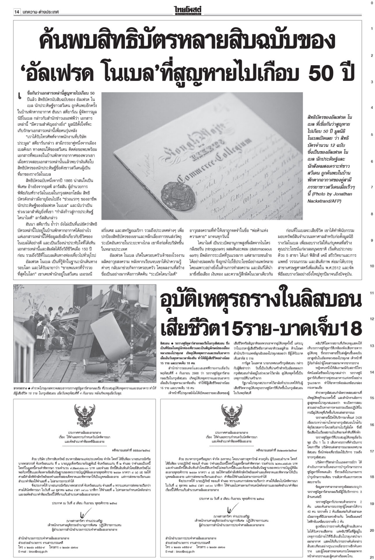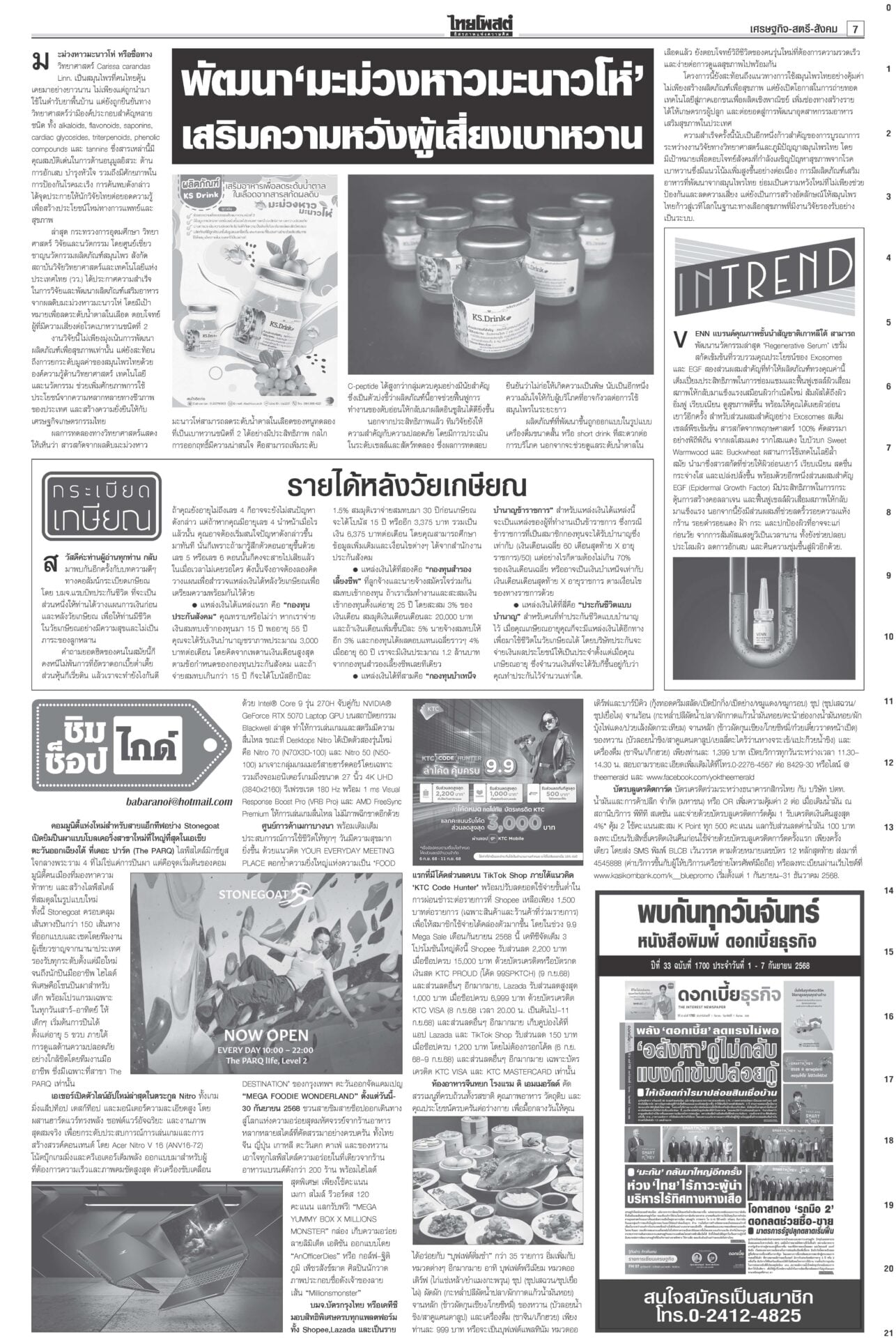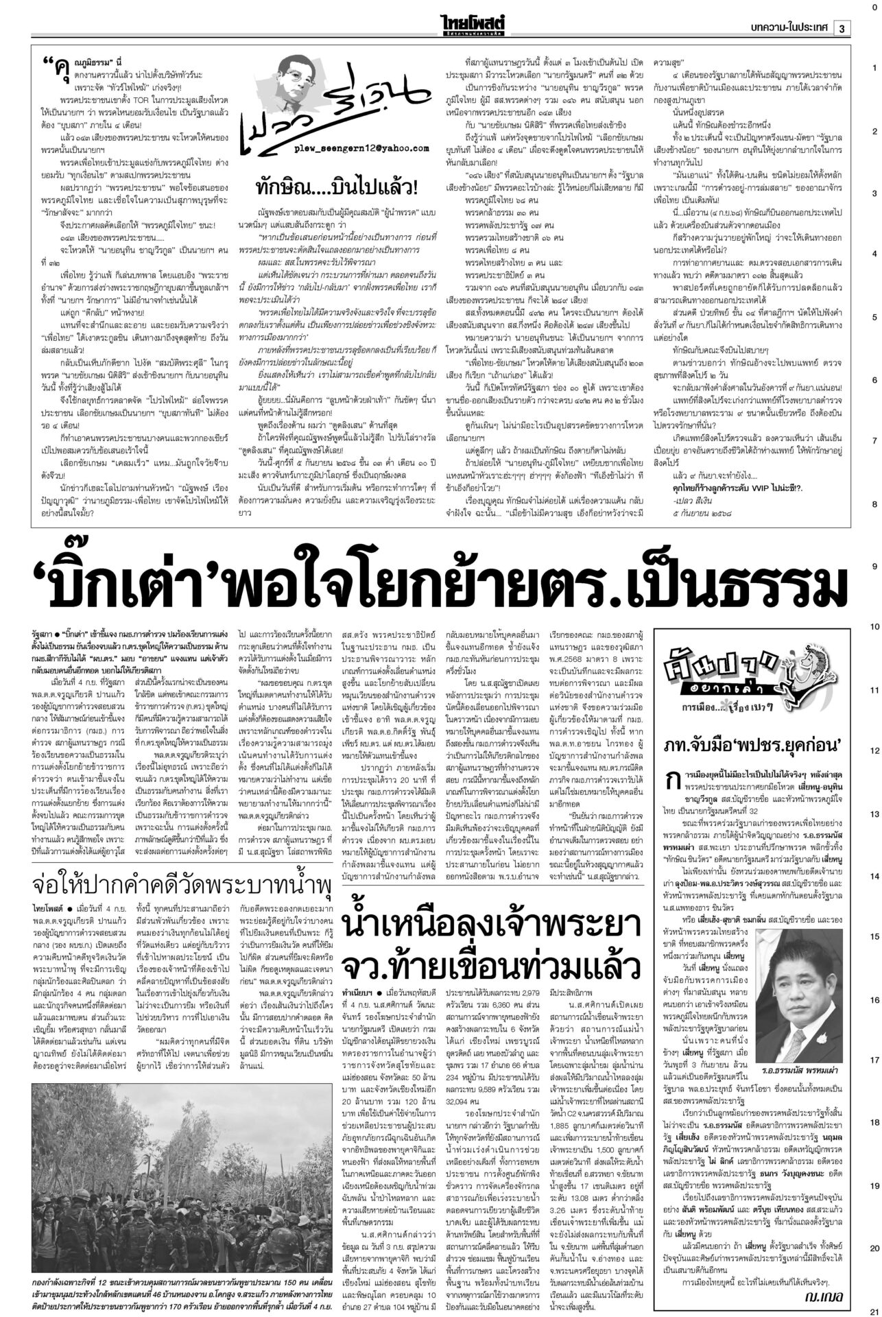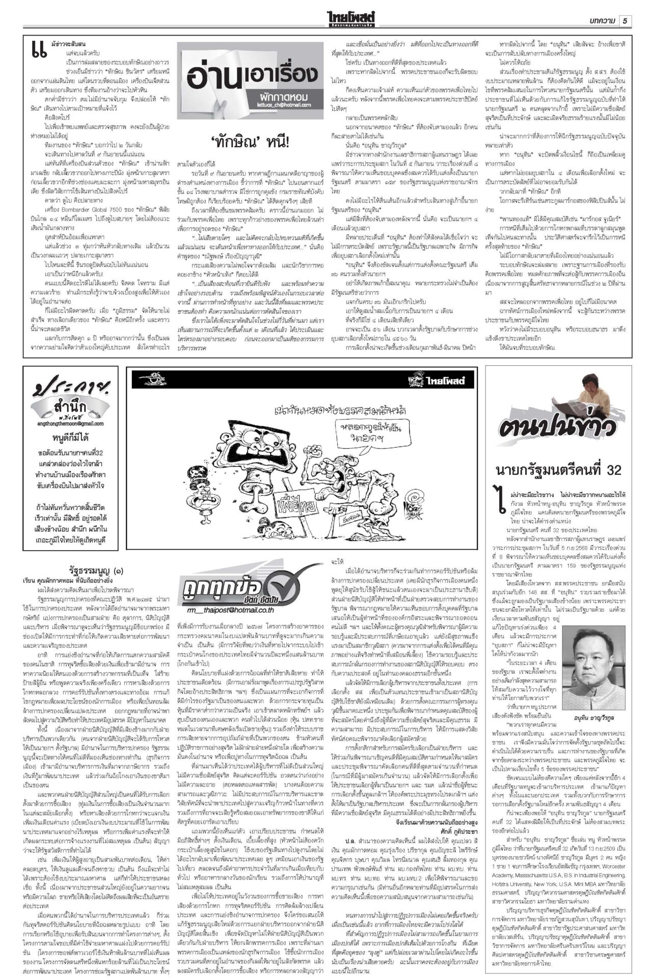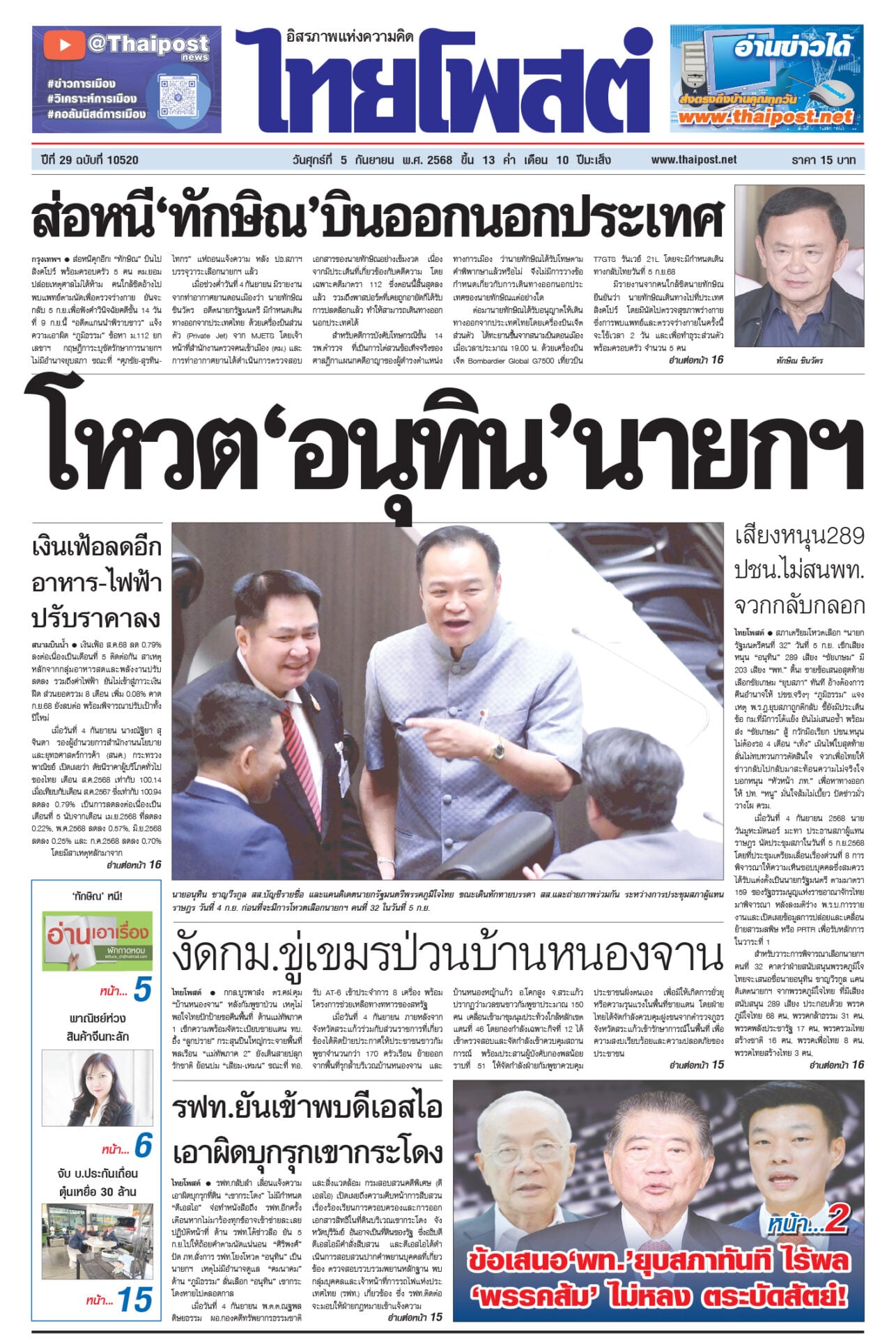หนังสือพิมพ์ ฉบับวันที่ 5 กันยายน 2568ข่าวหน้าหนึ่งโหวต‘อนุทิน’นายกฯ เสียงหนุน289 ปชน.ไม่สนพท. จวกกลับกลอกสภาเตรียมโหวตเลือก “นายกรัฐมนตรีคนที่ 32” วันที่ 5 ก.ย. เช็กเสียงหนุน “อนุทิน” 289 เสียง “ชัยเกษม” มี 203 เสียง รฟท.ยันเข้าพบดีเอสไอ เอาผิดบุกรุกเขากระโดงรฟท.กลับลำ เลื่อนแจ้งความเอาผิดบุกรุกที่ดิน “เขากระโดง” ไม่มีกำหนด “ดีเอสไอ” งัดกม.ขู่เขมรป่วนบ้านหนองจานกกล.บูรพาส่ง ตร.คฝ.คุม “บ้านหนองจาน” หลังกัมพูชาป่วน เหตุไม่พอใจไทยปักป้ายขอคืนพื้นที่ ด้านแม่ทัพภาค 1 เงินเฟ้อลดอีก อาหาร-ไฟฟ้า ปรับราคาลงเงินเฟ้อ ส.ค.68 ลด 0.79% ลงต่อเนื่องเป็นเดือนที่ 5 ติดต่อกัน