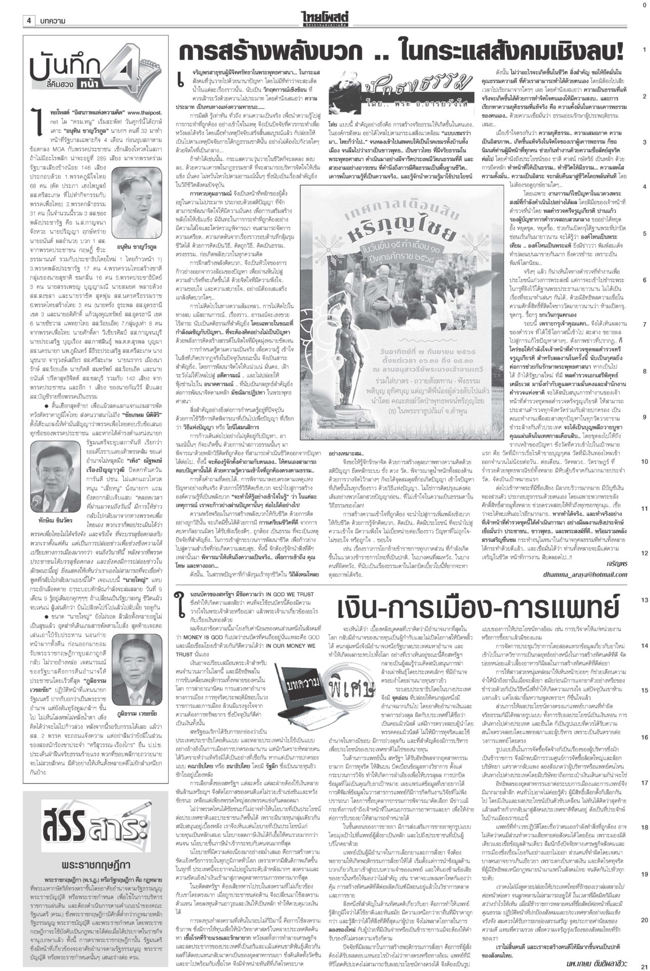 ฉบับวันที่ 5 กันยายน 2568 5 กันยายน 2568 เวลา 0:01 น. หนังสือพิมพ์ ฉบับวันที่ 5 กันยายน 2568ข่าวหน้าหนึ่งโหวต‘อนุทิน’นายกฯ เสียงหนุน289 ปชน.ไม่สนพท. จวกกลับกลอกสภาเตรียมโหวตเลือก “นายกรัฐมนตรีคนที่ 32” วันที่ 5 ก.ย. เช็กเสียงหนุน “อนุทิน” 289 เสียง “ชัยเกษม” มี 203 เสียง รฟท.ยันเข้าพบดีเอสไอ เอาผิดบุกรุกเขากระโดงรฟท.กลับลำ เลื่อนแจ้งความเอาผิดบุกรุกที่ดิน “เขากระโดง” ไม่มีกำหนด “ดีเอสไอ” งัดกม.ขู่เขมรป่วนบ้านหนองจานกกล.บูรพาส่ง ตร.คฝ.คุม “บ้านหนองจาน” หลังกัมพูชาป่วน เหตุไม่พอใจไทยปักป้ายขอคืนพื้นที่ ด้านแม่ทัพภาค 1 เงินเฟ้อลดอีก อาหาร-ไฟฟ้า ปรับราคาลงเงินเฟ้อ ส.ค.68 ลด 0.79% ลงต่อเนื่องเป็นเดือนที่ 5 ติดต่อกัน Tagsรายวันหนังสือพิมพ์ ข่าวที่เกี่ยวข้อง ฉบับวันที่ 5 ธันวาคม 2568 ฉบับวันที่ 4 ธันวาคม 2568 ฉบับวันที่ 3 ธันวาคม 2568 ฉบับวันที่ 2 ธันวาคม 2568 ฉบับวันที่ 1 ธันวาคม 2568 ฉบับวันที่ 30 พฤศจิกายน 2568 NEWS UPDATE 15:18 น. ปชน. ค้านนัดโหวตแก้ รธน. วาระ 3 หลังปีใหม่ หวั่นกระทบไทม์ไลน์ทำประชามติ 15:04 น. 'แม่ทัพกุ้ง' ลงใต้ ให้กำลังใจชาวหาดใหญ่ เยี่ยมเจ้าหน้าที่จิตอาสาเร่งฟื้นฟูเมือง 14:47 น. ปิดด่าน 5 เดือน การค้าชายแดนคลองใหญ่เสียหาย 5 พันล้าน สินค้าเถื่อนทะลัก วอนรัฐบาลเยียวยา 14:44 น. ‘โรม’ เปิดคำฟ้องธรรมนัส ชี้ใช้กฎหมายปิดปากฝ่ายตรวจสอบ-ถามปกป้องชาติหรือทุนเทา 14:32 น. ดอกไม้นานาพรรณบานสะพรั่งทั่วสวนหลวง ร.๙ สัมผัสรับลมหนาวถึง 10 ธ.ค. นี้