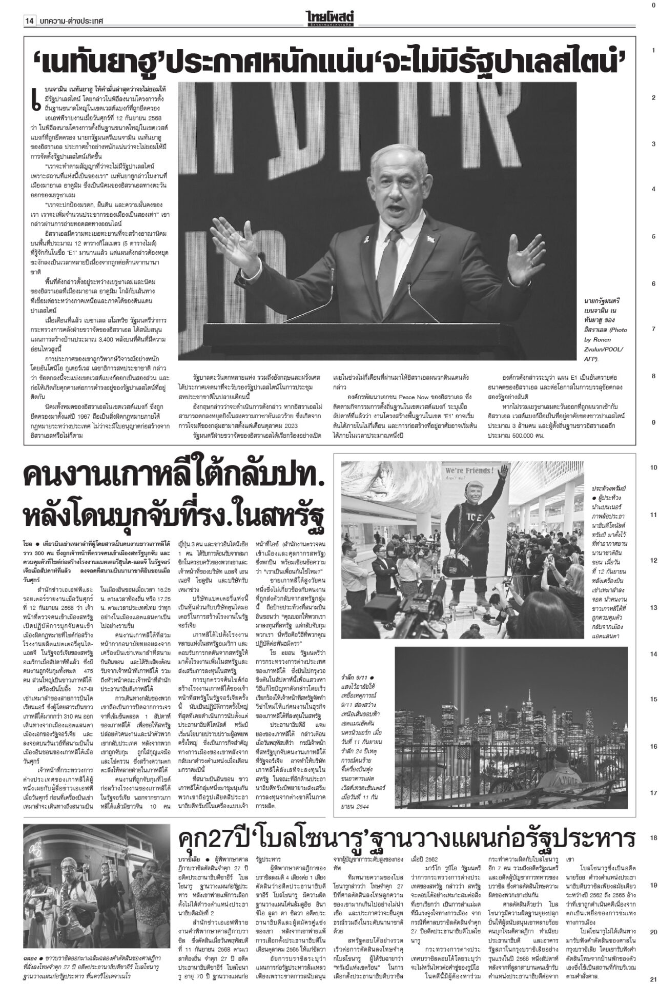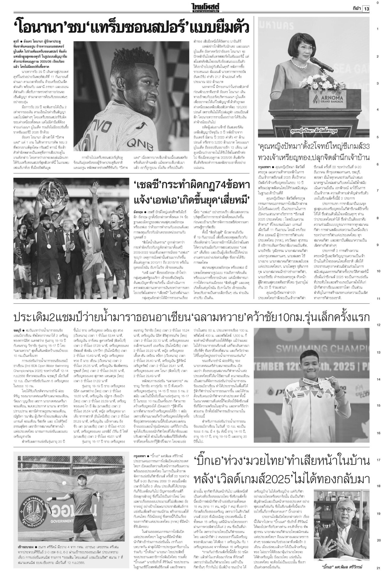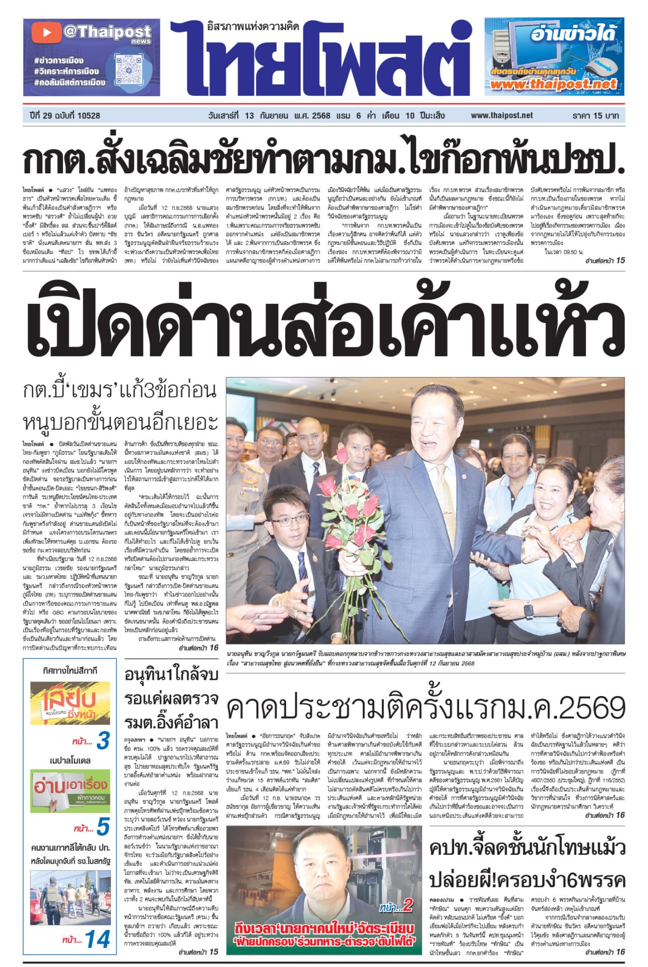 หนังสือพิมพ์ ฉบับวันที่ 13 กันยายน 2568ข่าวหน้าหนึ่งเปิดด่านส่อเค้าแห้ว กต.บี้‘เขมร’แก้3ข้อก่อน หนูบอกขั้นตอนอีกเยอะปัดพัลวันเปิดด่านชายแดนไทย-กัมพูชา “ภูมิธรรม” โยนรัฐบาลเดิมให้กองทัพตัดสินใจผ่าน กกต.สั่งเฉลิมชัยทำตามกม.ไขก๊อกพ้นปชป.“แสวง” โผล่ยัน “แพทองธาร” เป็นหัวหน้าพรรคเพื่อไทยตามเดิม คาดประชามติครั้งแรกม.ค.2569“อัยการธนกฤต” จับสังเกตศาลรัฐธรรมนูญมีอำนาจวินิจฉัยเกินคำขอหรือไม่ อนุทิน1ใกล้จบ รอแค่ผลตรวจ รมต.อิ๊งค์อำลา“นายกฯ อนุทิน” บอกรายชื่อ ครม. 100% แล้ว รอตรวจคุณสมบัติที่ควบคุมไม่ได้ คปท.จี้ลดชั้นนักโทษแม้ว ปล่อยผี!ครอบงำ6พรรคราชทัณฑ์เผย คืนที่สาม “ทักษิณ” นอนคุก พบความดันสูงแต่มียาติดตัว