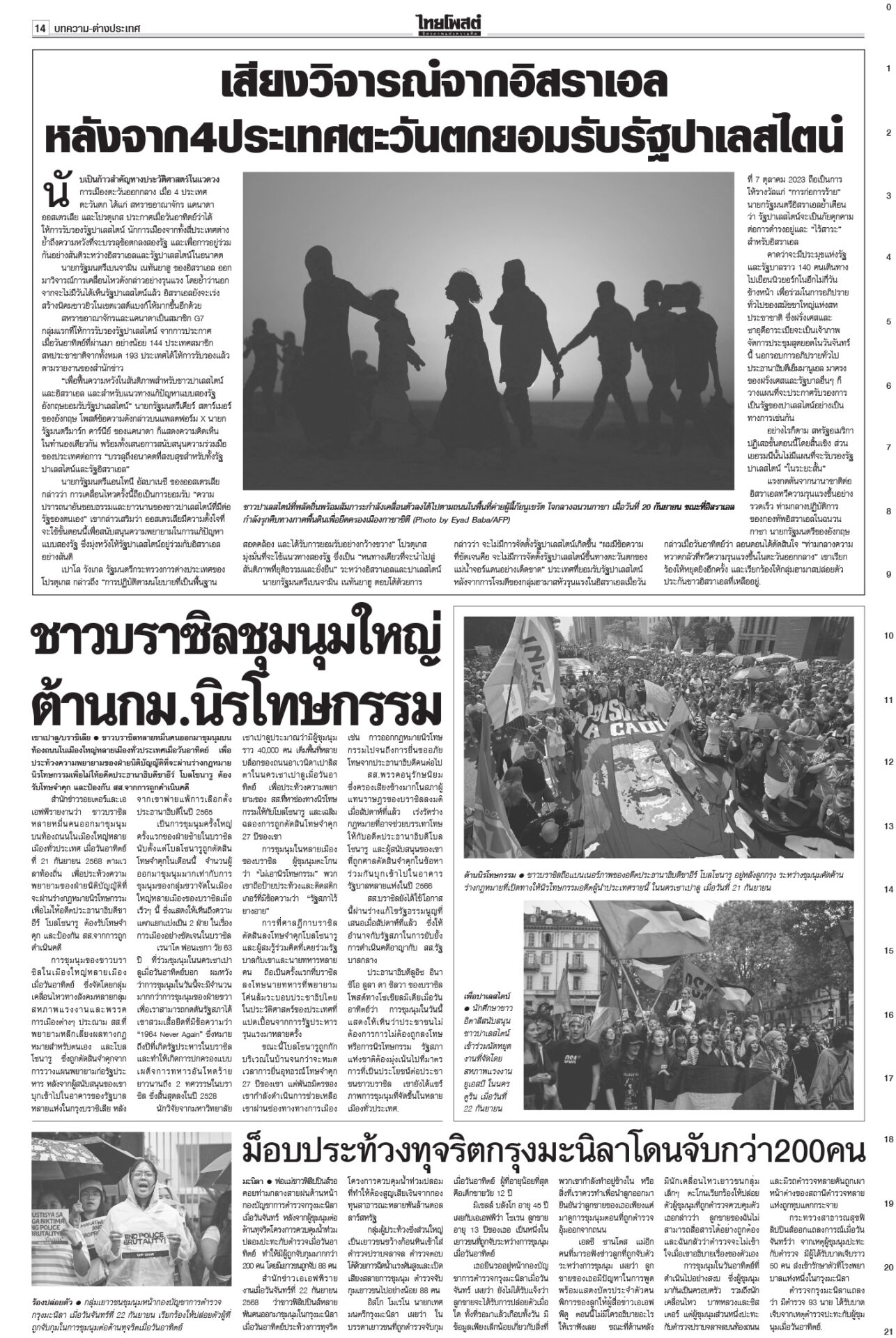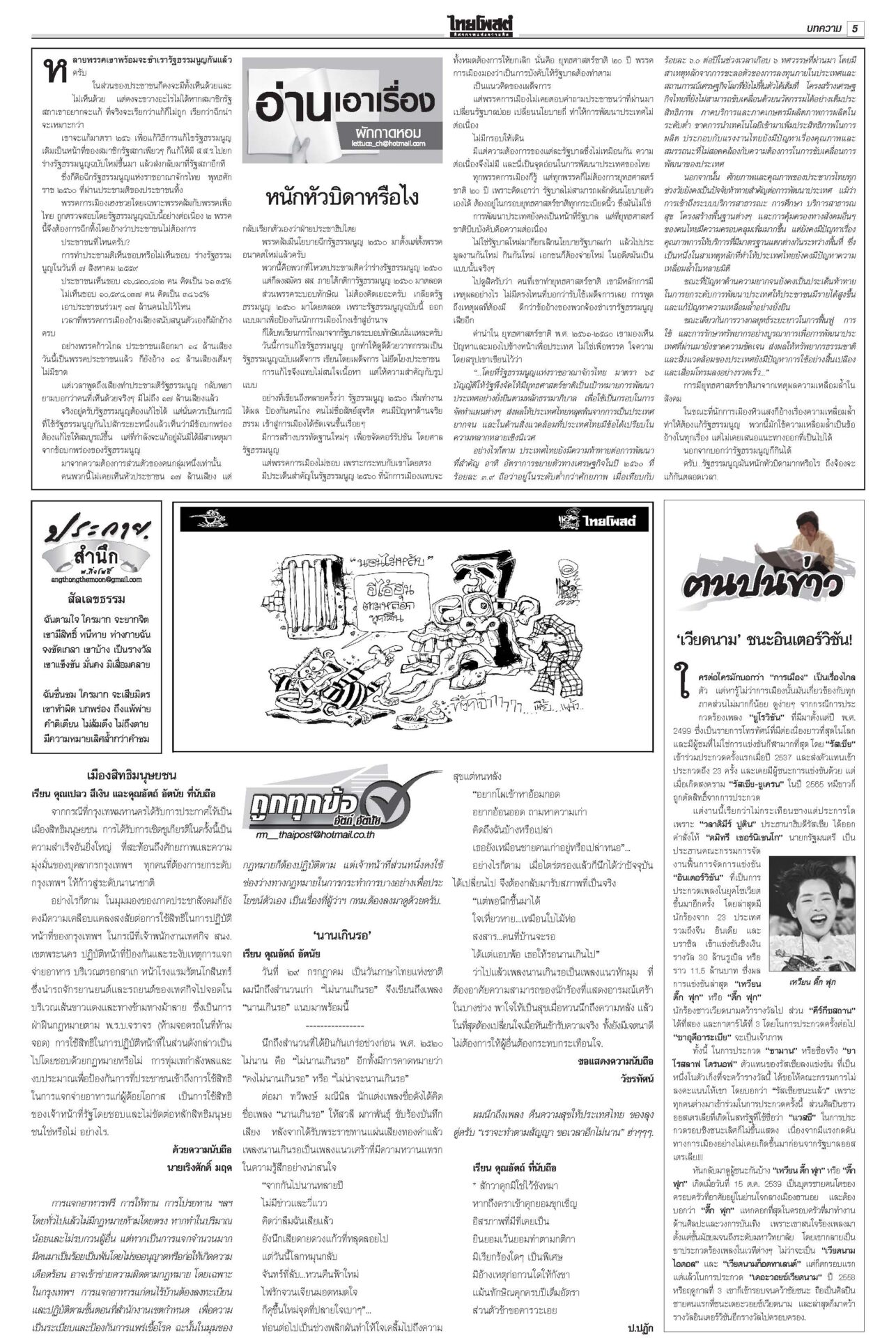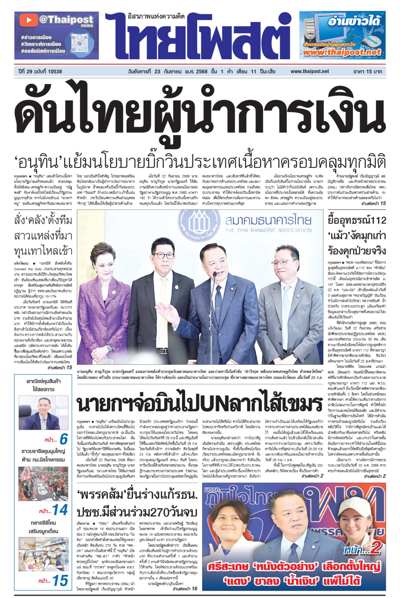 หนังสือพิมพ์ ฉบับวันที่ 23 กันยายน 2568ข่าวหน้าหนึ่งดันไทยผู้นำการเงิน ‘อนุทิน’แย้มนโยบายบิ๊กวินประเทศเนื้อหาครอบคลุมทุกมิติ“อนุทิน” เผยเค้าโครงเนื้อหานโยบายรัฐบาลเสร็จหมดแล้ว นายกฯจ่อบินไปUNลากไส้เขมร“อนุทิน” เตรียมบินไปประชุมยูเอ็น จะหายไปไม่ได้เพราะมีคนขี้ฟ้องไปบอกว่าไทยละเมิดกฎนานาชาติ ฉะนั้นเป็น ยื้ออุทธรณ์112 ‘แม้ว’งัดมุกเก่า ร้องคุกป่วยจริง“คปท.-กองทัพธรรม” จี้อัยการสูงสุดยื่นอุทธรณ์คดี ม.112 ของ “ทักษิณ” ลั่นจะติดตามเร่งรัดให้อัยการมีความรัดกุมกว่านี้ สั่ง‘คลัง’ตั้งทีม สาวแหล่งที่มา ทุนเทาไหลเข้า“เอกนิติ’ สั่งคลังตั้งทีม Connect the Dots เร่งประสานทุกหน่วยงาน ‘พรรคส้ม’ยื่นร่างแก้รธน. ปชช.มีส่วนร่วม270วันจบ“ปชน.” เดินเครื่องยื่่นร่างแก้ รธน.หมวด 15 ต่อประธานสภา เปิดช่อง 2 กล